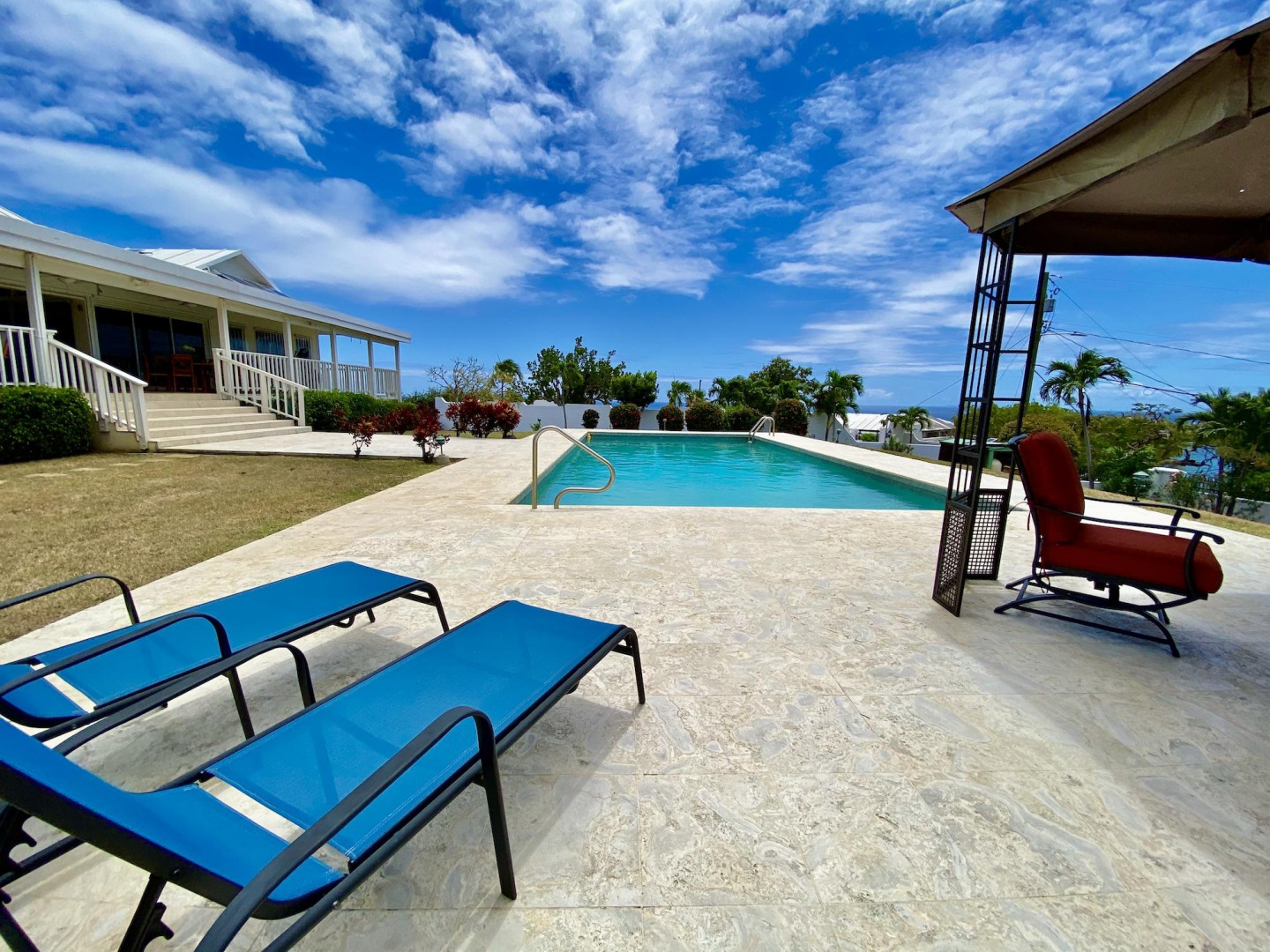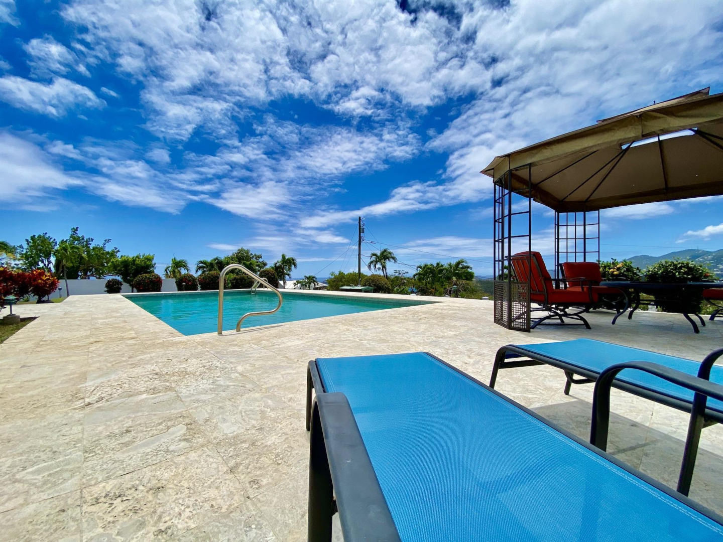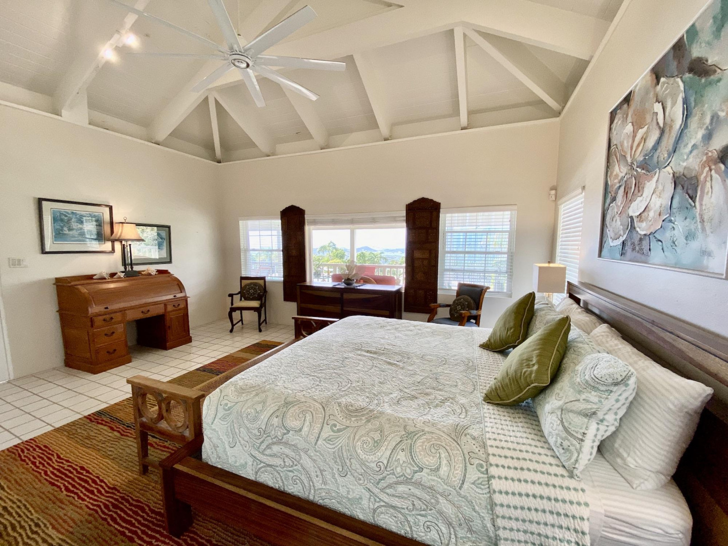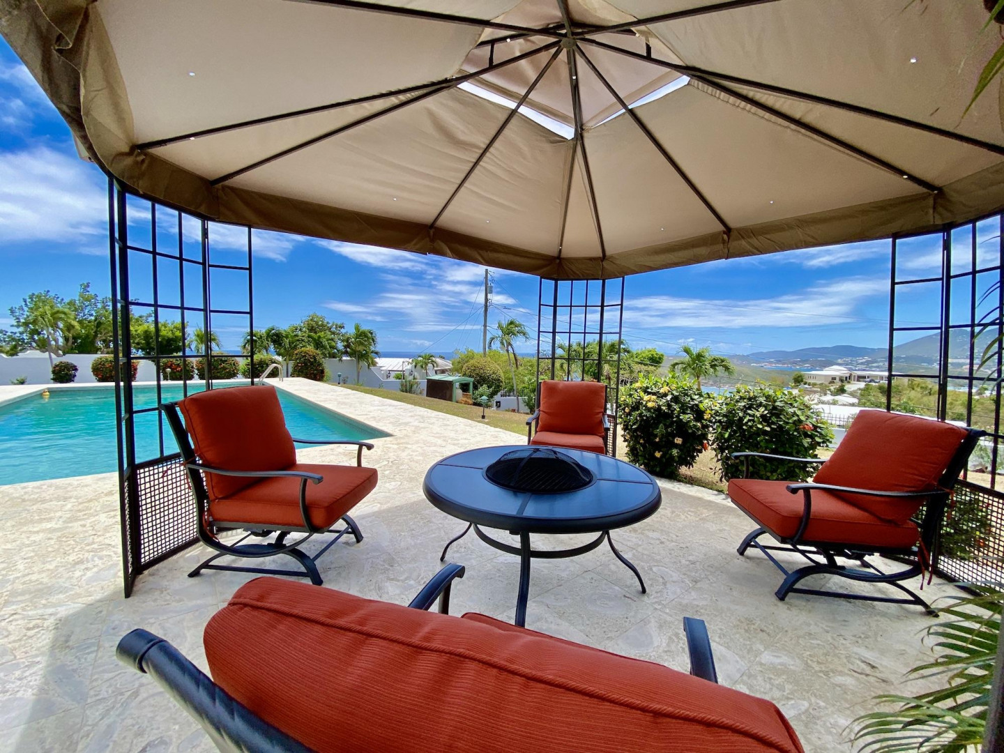 This home in prestigious Bakkero offers sophistication, charm and spectacular ocean views reaching across Charlotte Amalie to St. Croix, Culebra and Vieques. A poured concrete structure - fully shuttered - NO damage occurred during Irmaria or Dorian. Enjoy life without WAPA bills courtesy of solar, TESLA and a huge auto generator. Gated, fenced and situated on more than one acre of flat land, this home is ideal home for indoor/outdoor entertainment, with onsite parking for up to 15 vehicles. The elegant great room flows seamlessly onto an expansive, coral-tiled porch, down to a large pool - perfect for laps. There are 3 spacious en-suite bedrooms in the main residence; and a separate building features a renovated studio and a 2/1.5 apartment whose combined monthly income is $3,300.
