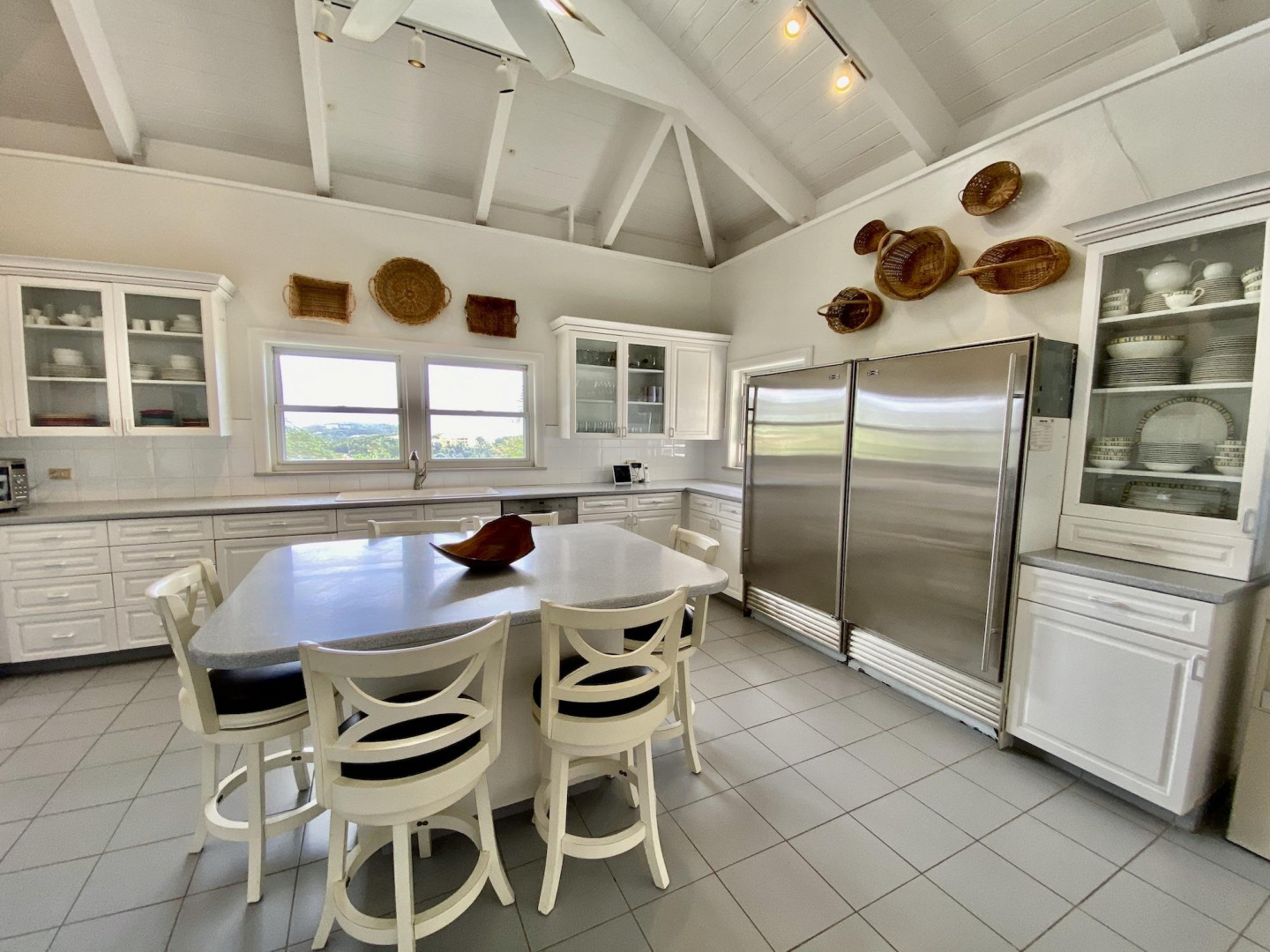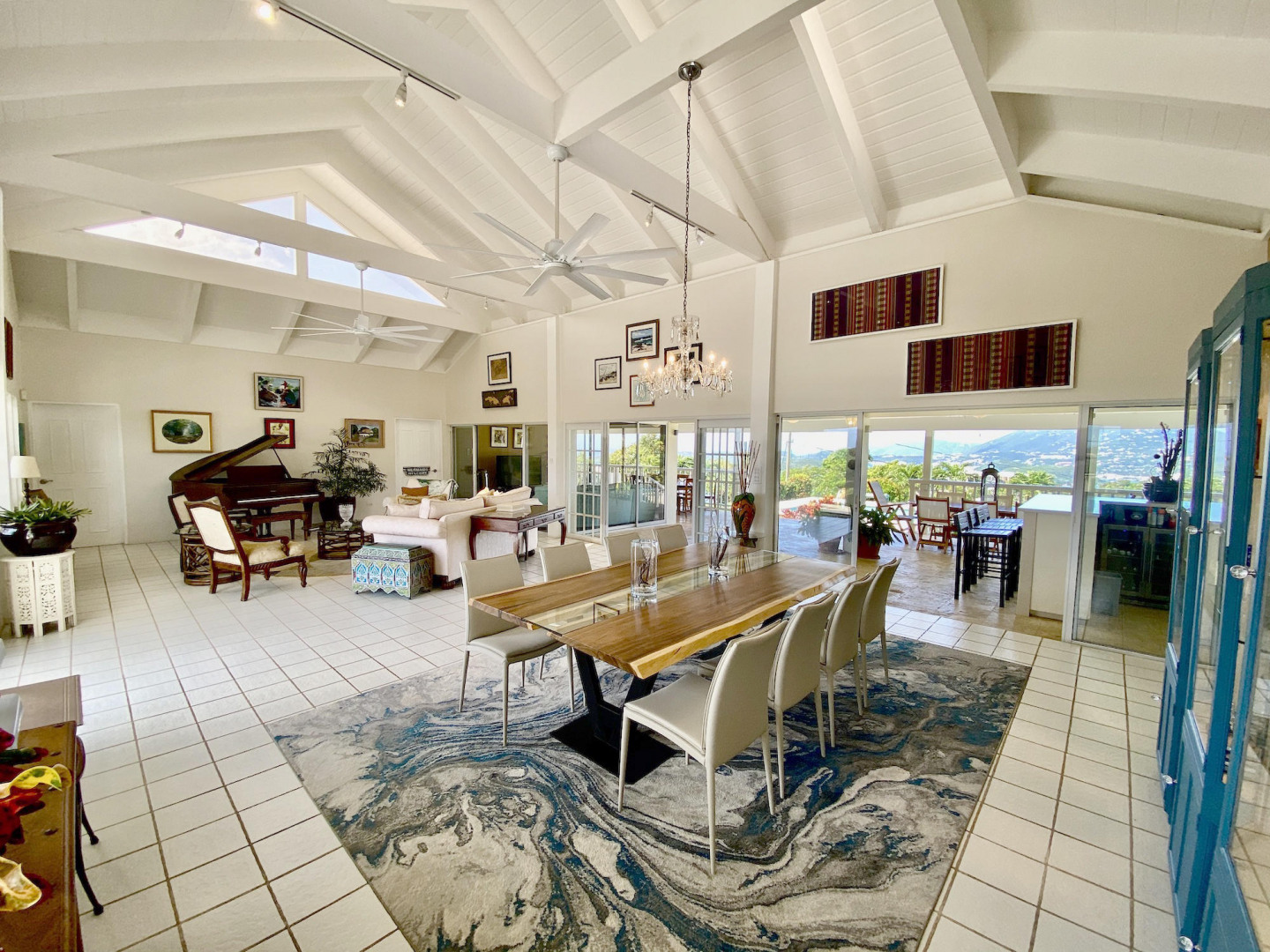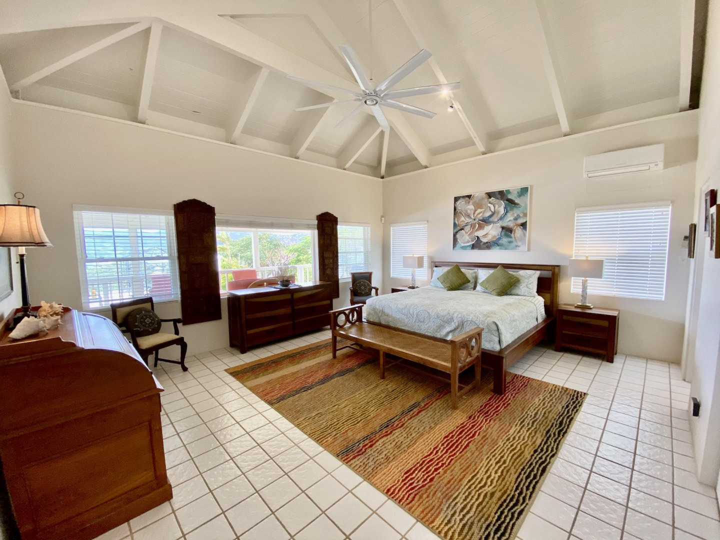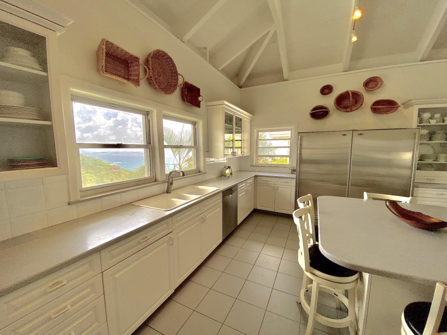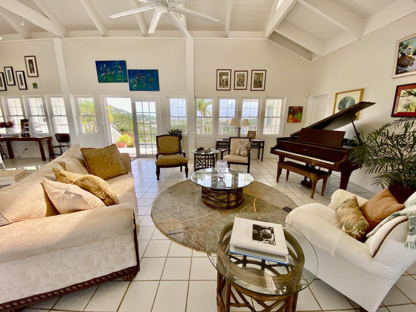 This home in prestigious Bakkero offers sophistication, charm and spectacular ocean views reaching across Charlotte Amalie to St. Croix, Culebra and Vieques. A poured concrete structure - fully shuttered - NO damage occurred during Irmaria or Dorian. Enjoy life without WAPA bills courtesy of solar, TESLA and a huge auto generator. Gated, fenced and situated on more than one acre of flat land, this home is ideal home for indoor/outdoor entertainment, with onsite parking for up to 15 vehicles. The elegant great room flows seamlessly onto an expansive, coral-tiled porch, down to a large pool - perfect for laps. There are 3 spacious en-suite bedrooms in the main residence; and a separate building features a renovated studio and a 2/1.5 apartment whose combined monthly income is $3,300.