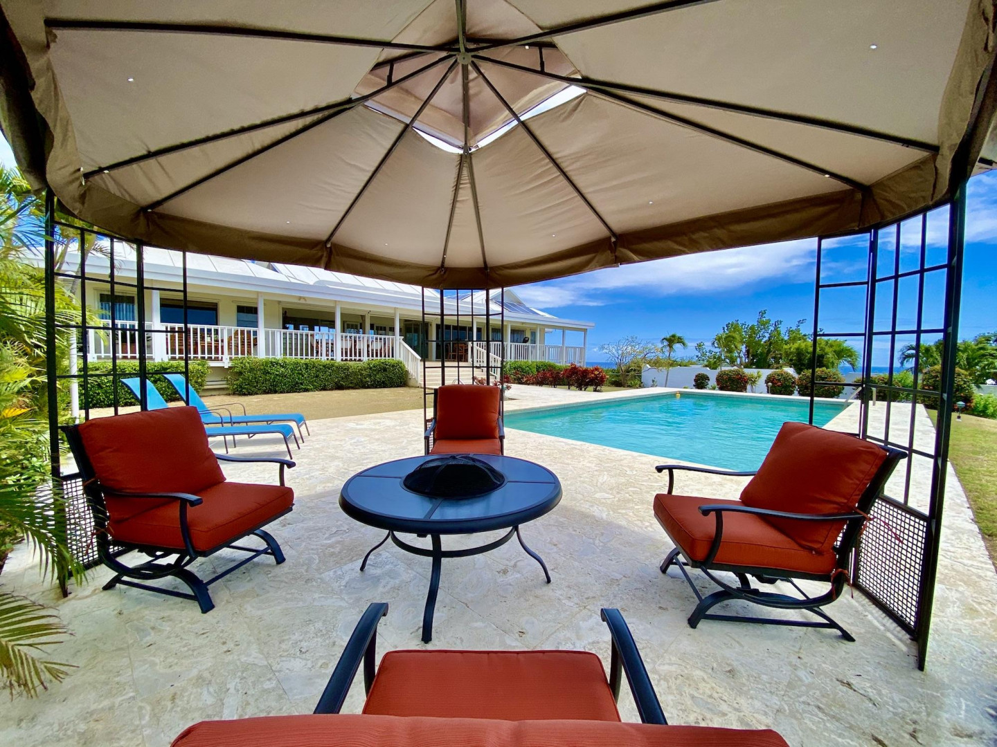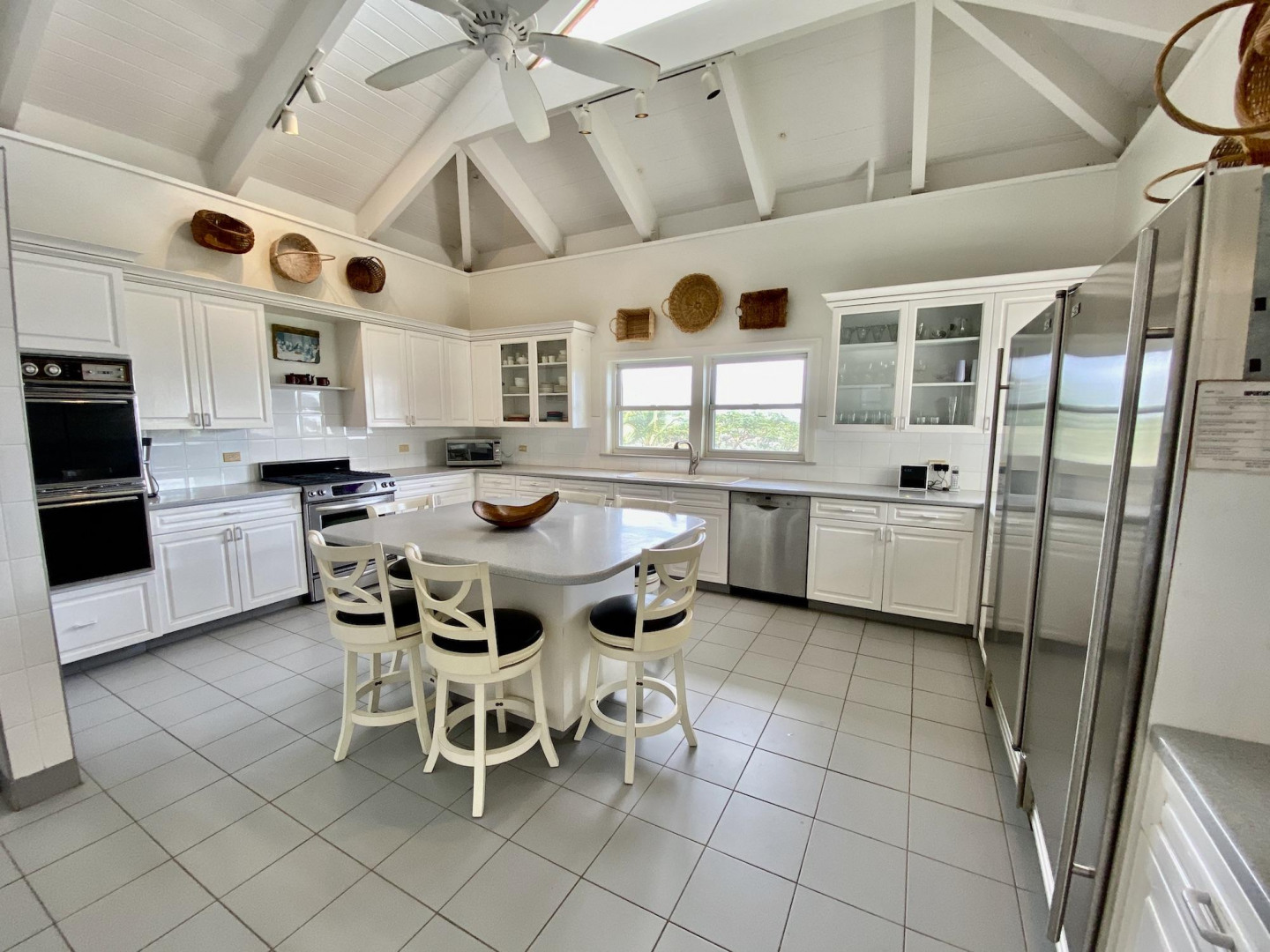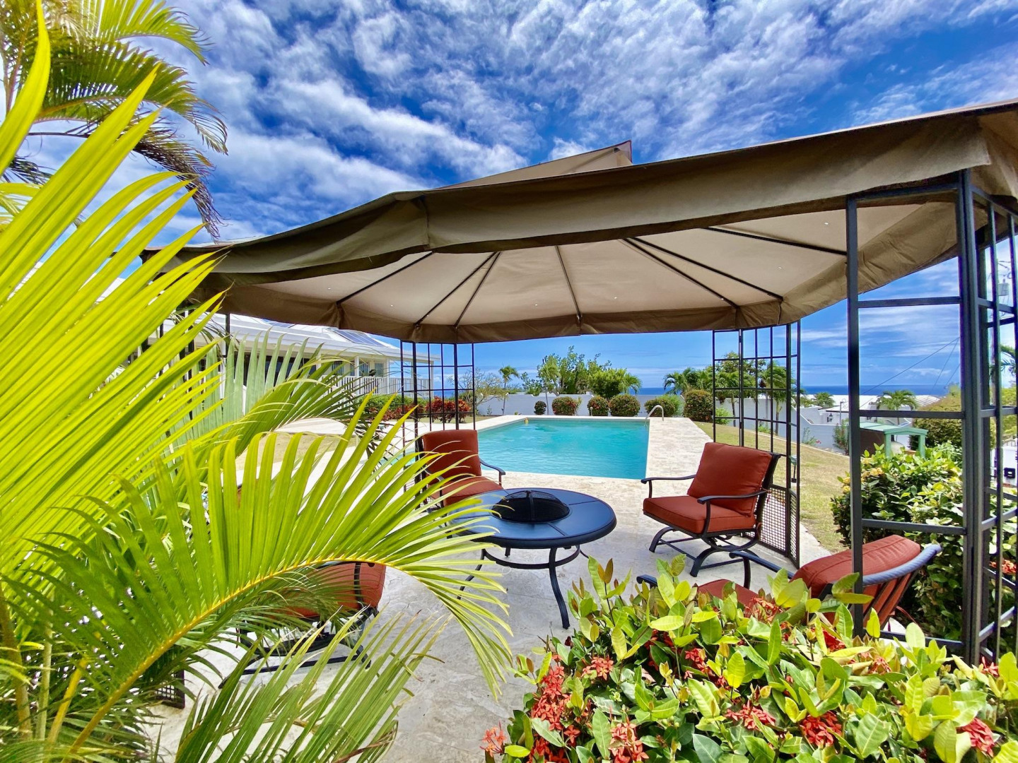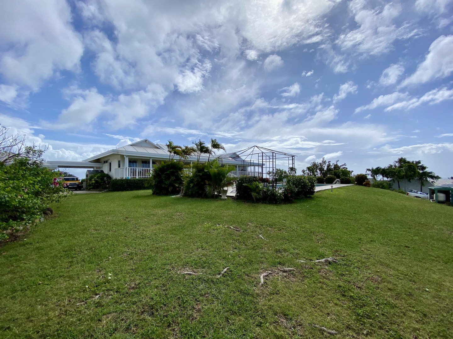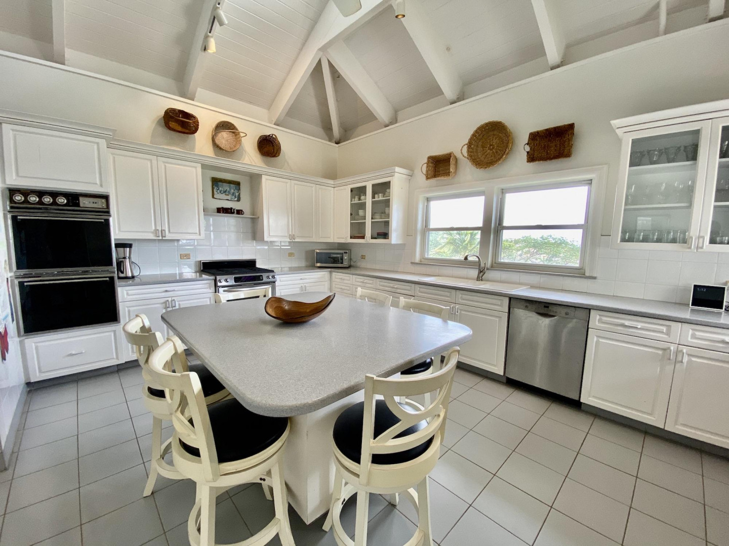 This home in prestigious Bakkero offers sophistication, charm and spectacular ocean views reaching across Charlotte Amalie to St. Croix, Culebra and Vieques. A poured concrete structure - fully shuttered - NO damage occurred during Irmaria or Dorian. Enjoy life without WAPA bills courtesy of solar, TESLA and a huge auto generator. Gated, fenced and situated on more than one acre of flat land, this home is ideal home for indoor/outdoor entertainment, with onsite parking for up to 15 vehicles. The elegant great room flows seamlessly onto an expansive, coral-tiled porch, down to a large pool - perfect for laps. There are 3 spacious en-suite bedrooms in the main residence; and a separate building features a renovated studio and a 2/1.5 apartment whose combined monthly income is $3,300.
