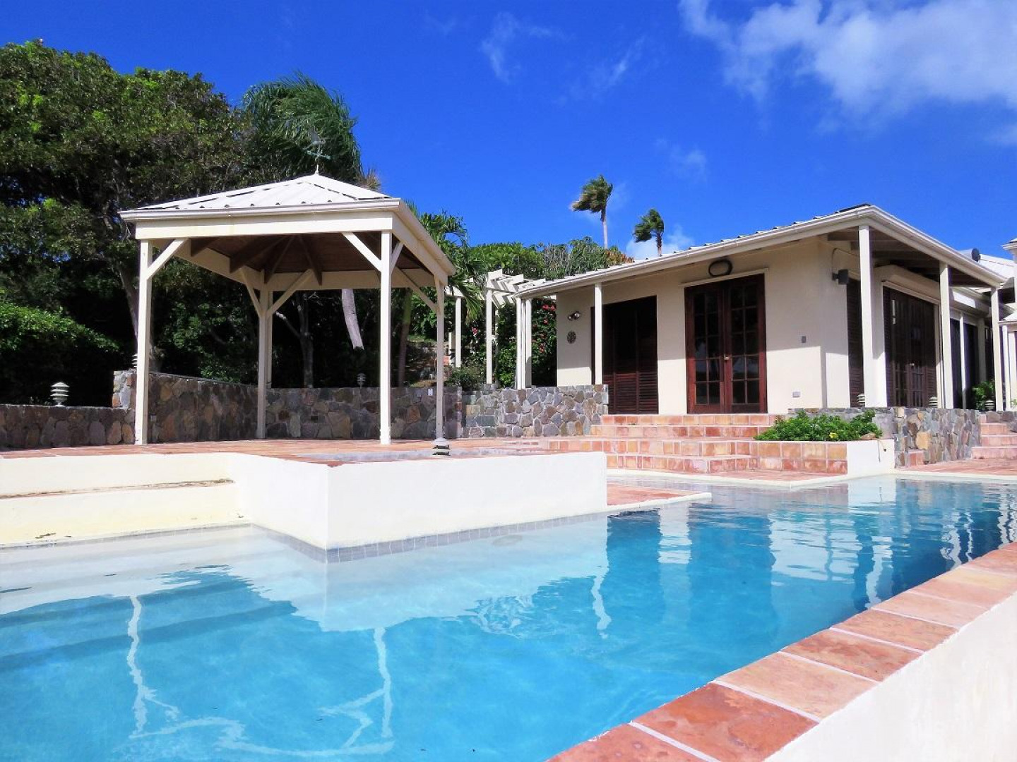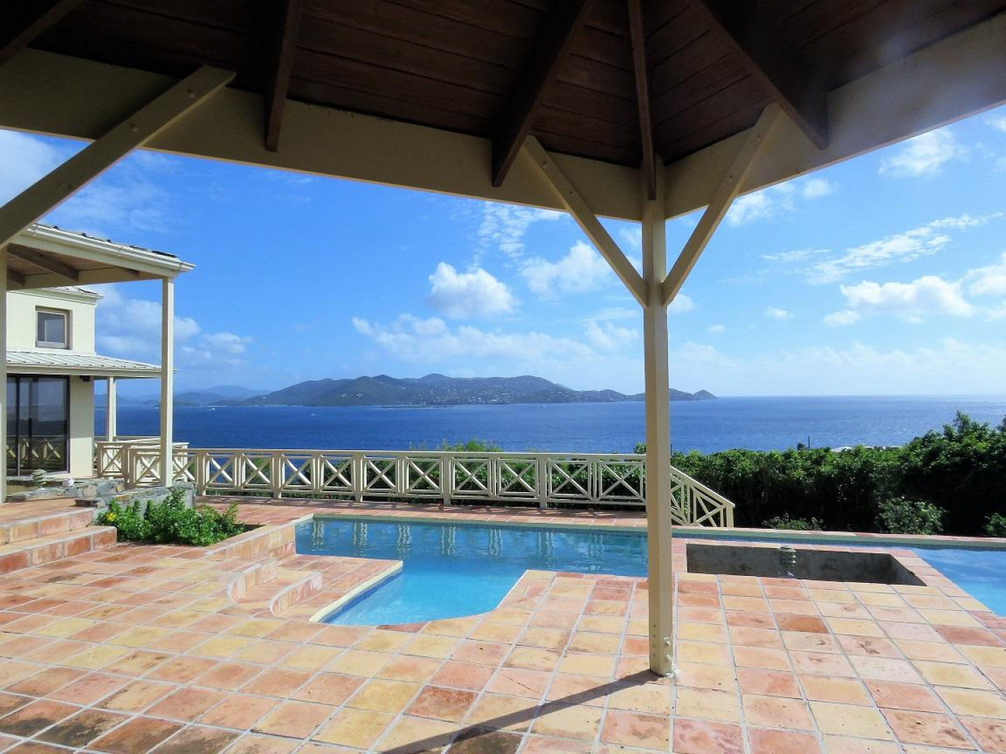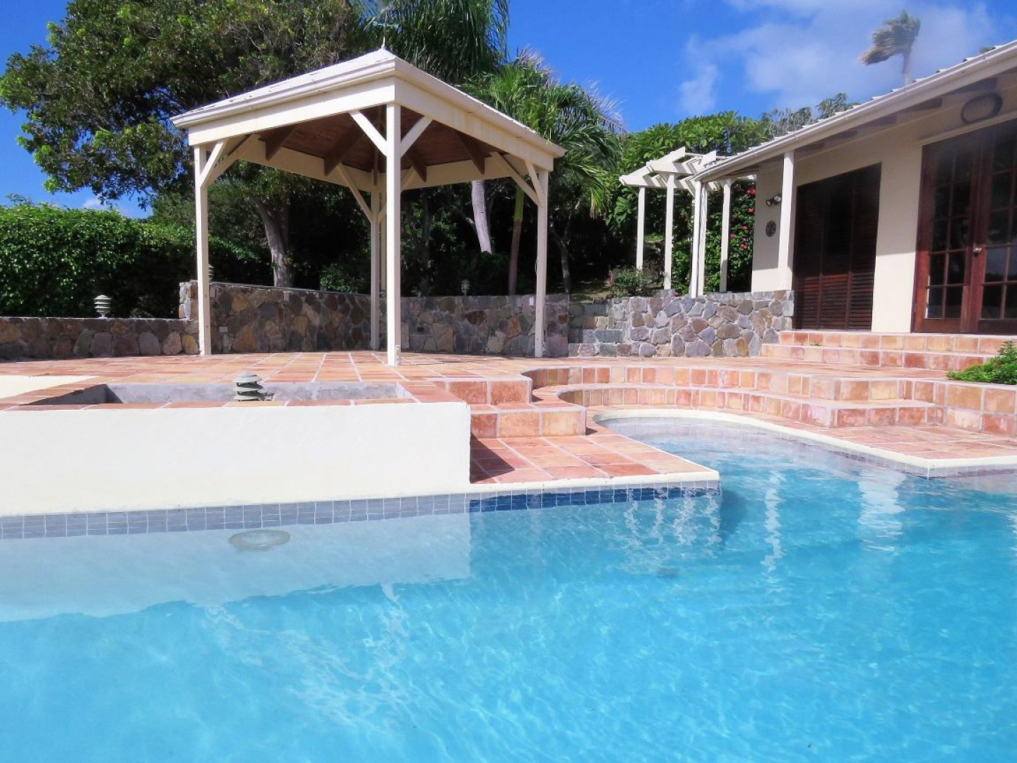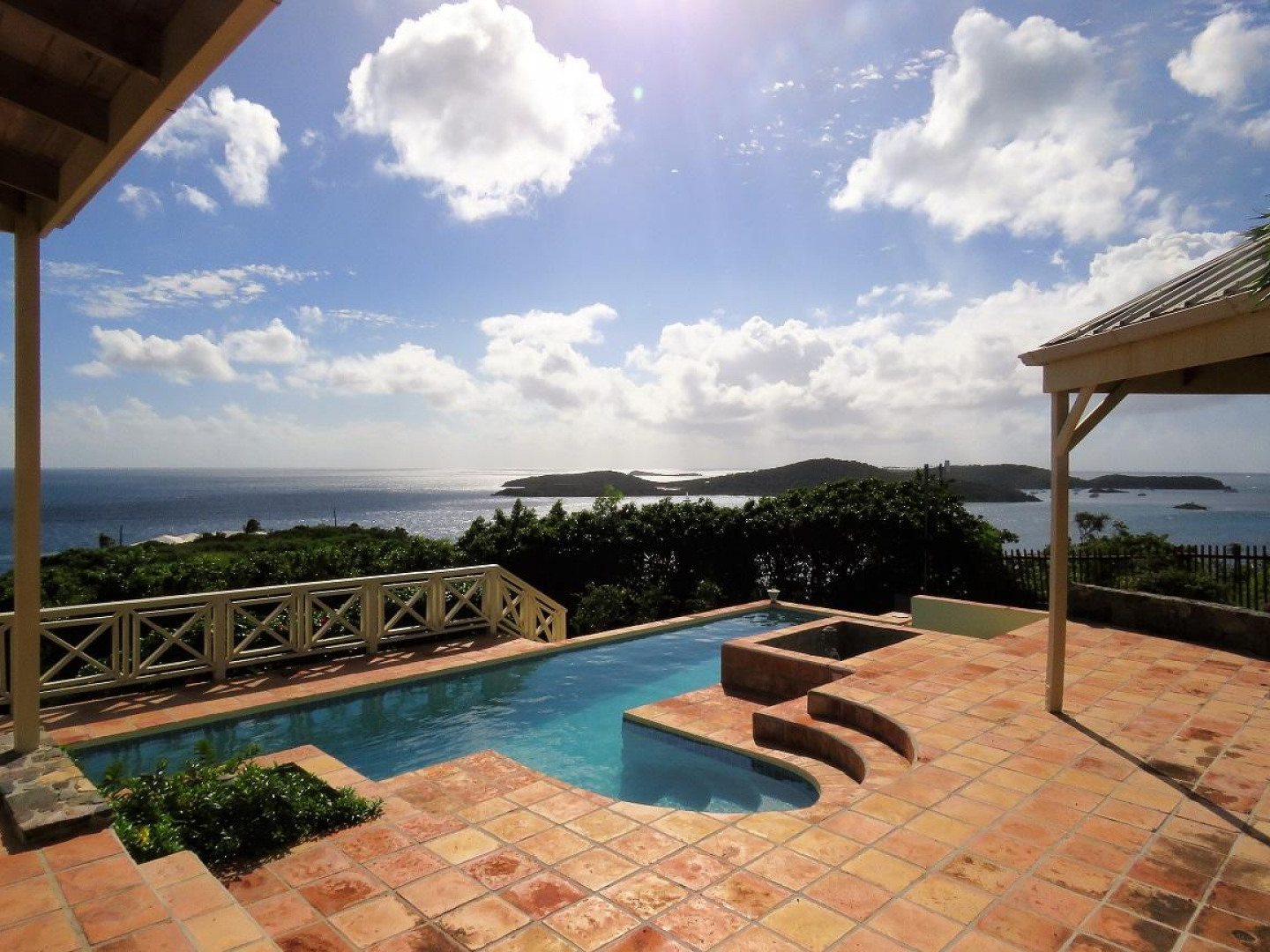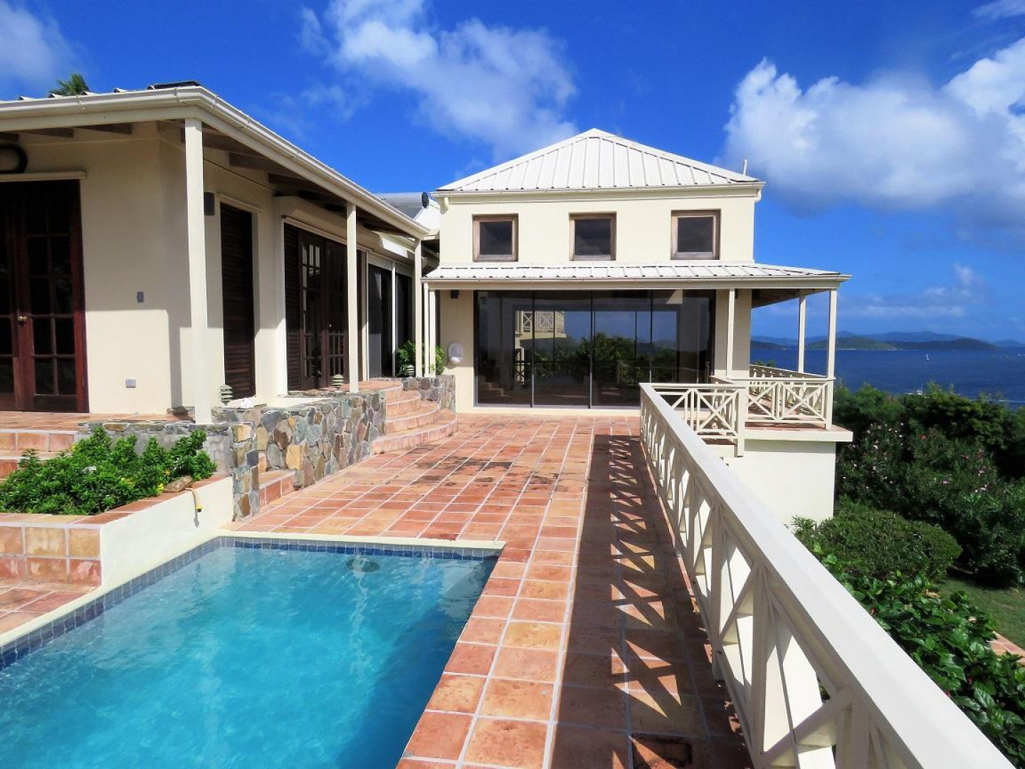 UNFORGETABLE CABRITA POINT LOCATION! This 5 bedroom, 4 bath home (with two half baths) has a 270 degree panoramic view of St. John, the BVI's and Pillsbury Sound and St. Croix, too. The main house has a spectacular all glass living room and a separate dining and family room. A detached cottage with full bath is perfect for visiting family or guests. The yard is fully fenced. The outdoor areawith swimming pool and covered gazebo makes this a wonderful place for entertaining under the stars at night. This is gracious living at it's best! The ceiling is tongue and groove cypress with cedar beams. The bifold doors, louvered windows and front door are Imbuia (Brazilian Walnut). A 6500kw gas generator is wired into the house with a manual transfer switch. There's also a Satellite dish, 12 ceiling fans, AND, there is CAT 8 WITH MICROWAVE DISH and HIGH SPEED INTERNET WIRED THROUGHOUT THE HOUSE.