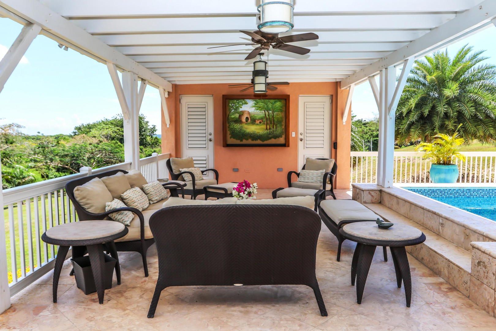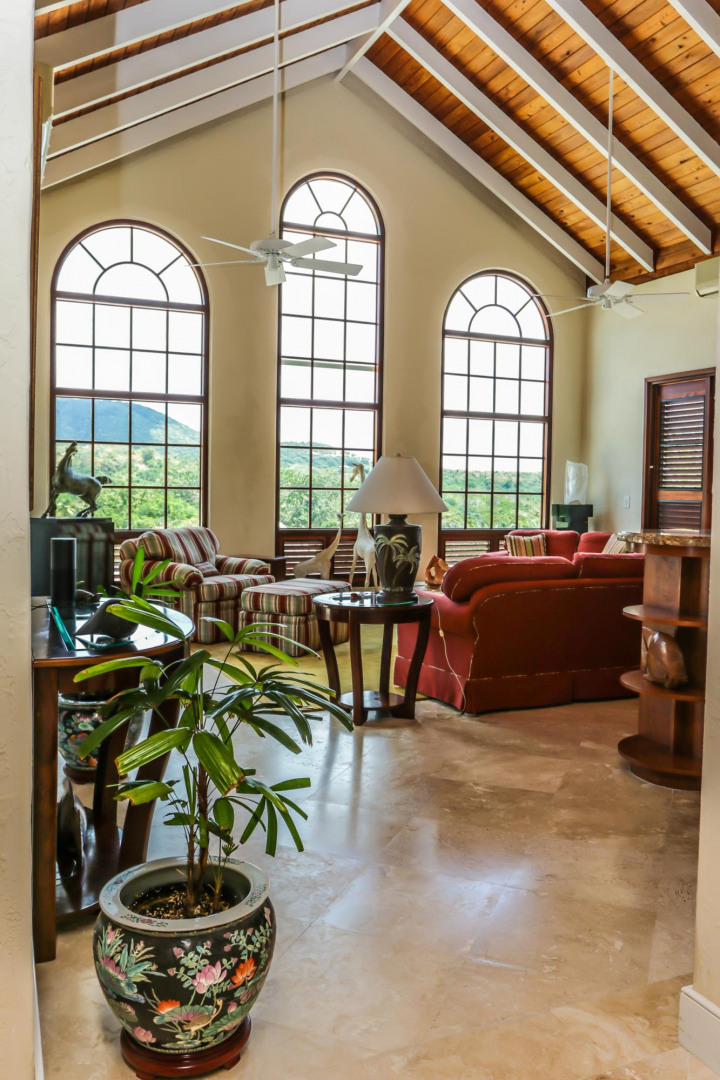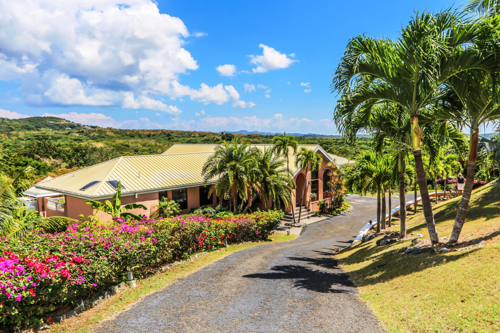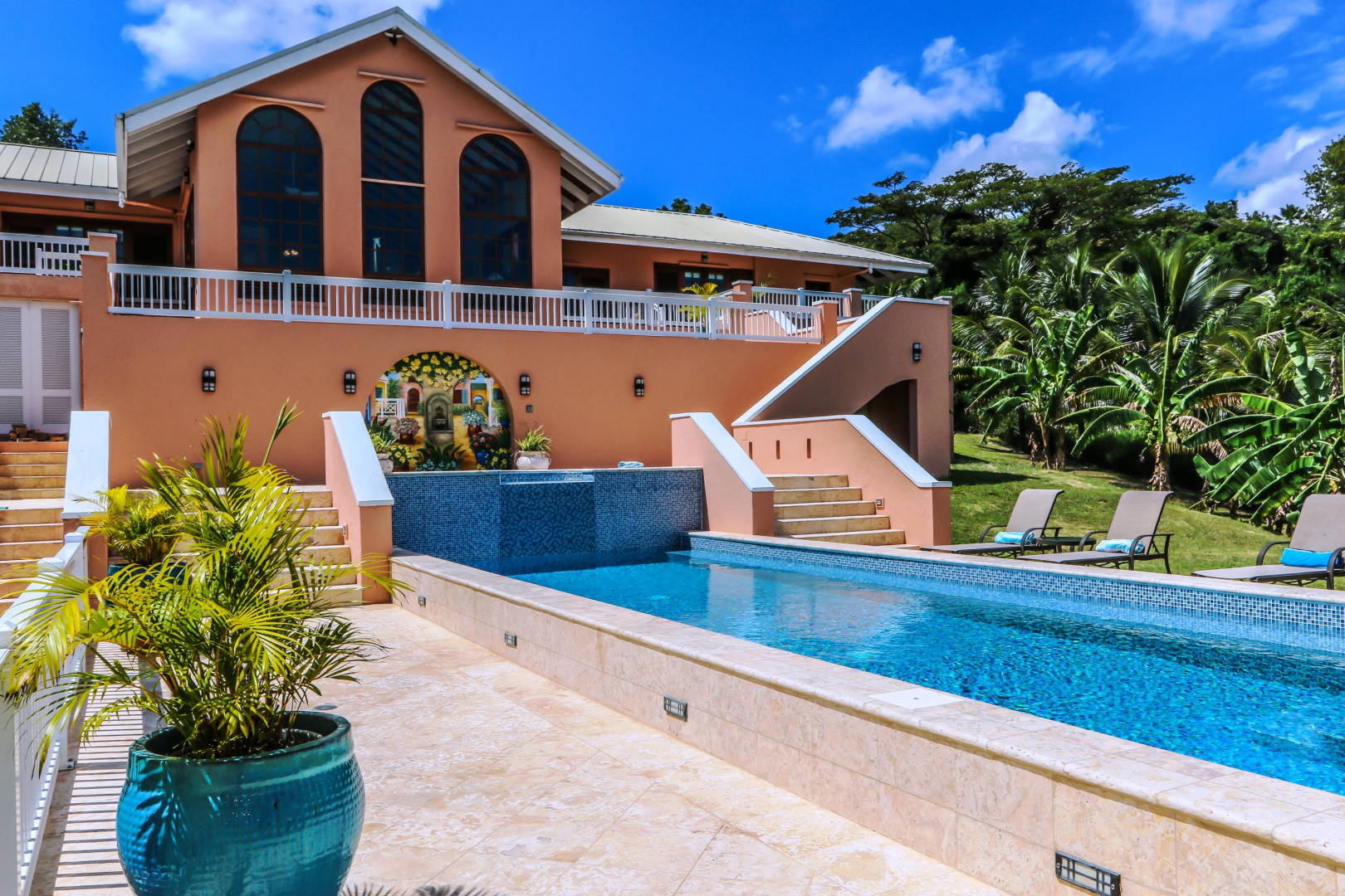 Las Palmas located in gated Carambola on 2.36 tropically landscaped acres is a pristine home encompassing 3 bedrooms ensuite, office, gym & large apartment. Travertine tiles throughout, beautiful outdoor summer kitchen & media area, 36ft pool and spa. Great room has 19 ft cathedral ceilings with gorgeous Mahogany windows, solar powered, well, generator, all next to Robert Trent Jones golf course!Las Palmas is an exquisite home; some of the highlights are: • 2011 installed all new custom mahogany window doors and louvers. The glass is 7/16" thick for hurricane resistance • All 3 bedrooms have custom closet built- ins made locally by Andre McBean of local Mahogany • 2013 travertine tile installed on the diagonal throughout the main house • Gourmet kitchen made by Quality Cabinets of Cherry with granite counter tops, sub-zero refrigerator and freezer and all stainless steel appliances • Outdoor area is as approximately 4,000 sq. feet, and done in coral stone tile; the deck, summer kitchen, media area, pool and apartment were completed in 2010 • At the pool deck there is a full summer kitchen with grill, sinks and cooler and a TV retractable screen painted by artist Marie Graci. • Full bath with shower at pool level • Apartment at lowest level is approximately 800 sq. ft. one bedroom apartment with open concept kitchen, 3 fans, A/C, washer/dryer and is also connected to Solar/backup system • 2010 Solar system phase I was completed • 2014 Solar Phase II was completed producing 15 KW approximately 2000 KW per month, a net metering system, it has battery backup with a generator to recharge the batteries if needed. • 2015 new septic system installed • The water system contains 2 cisterns. One cistern collects rain water and holds approximately 30,000 gallons. The smaller cistern holds 15,000 gallons. The water in the smaller cistern holds water that comes from a well on the property after it has gone through a reverse osmosis system. It is an automatic system that creates RO water on an as needed basis. • The house uses a recirculation system that avoids wasting water while waiting for hot water. • There is abundant spaces at the lower level of the home, providing a gym, storage, a workshop and a garage. • Standing seam metal roof • Alarm system • Lower level has a separate gated entry for apartment privacy and or service providers • Community pool, tennis courts and Robert Trent Jones Championship golf course all in close proximity • The property is beautifully landscaped with drip irrigation and there are numerous native fruit trees including bananas, lime, coconut, sour sop, pineapple, avocado and papaya