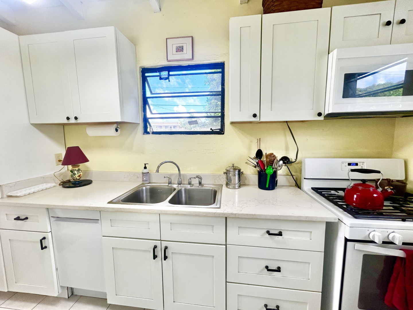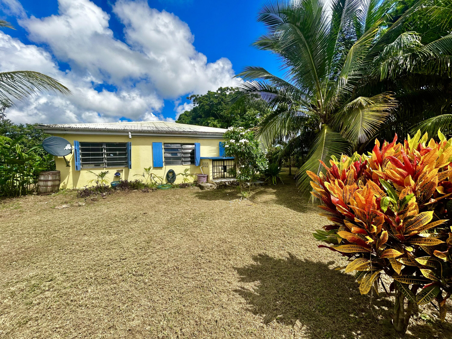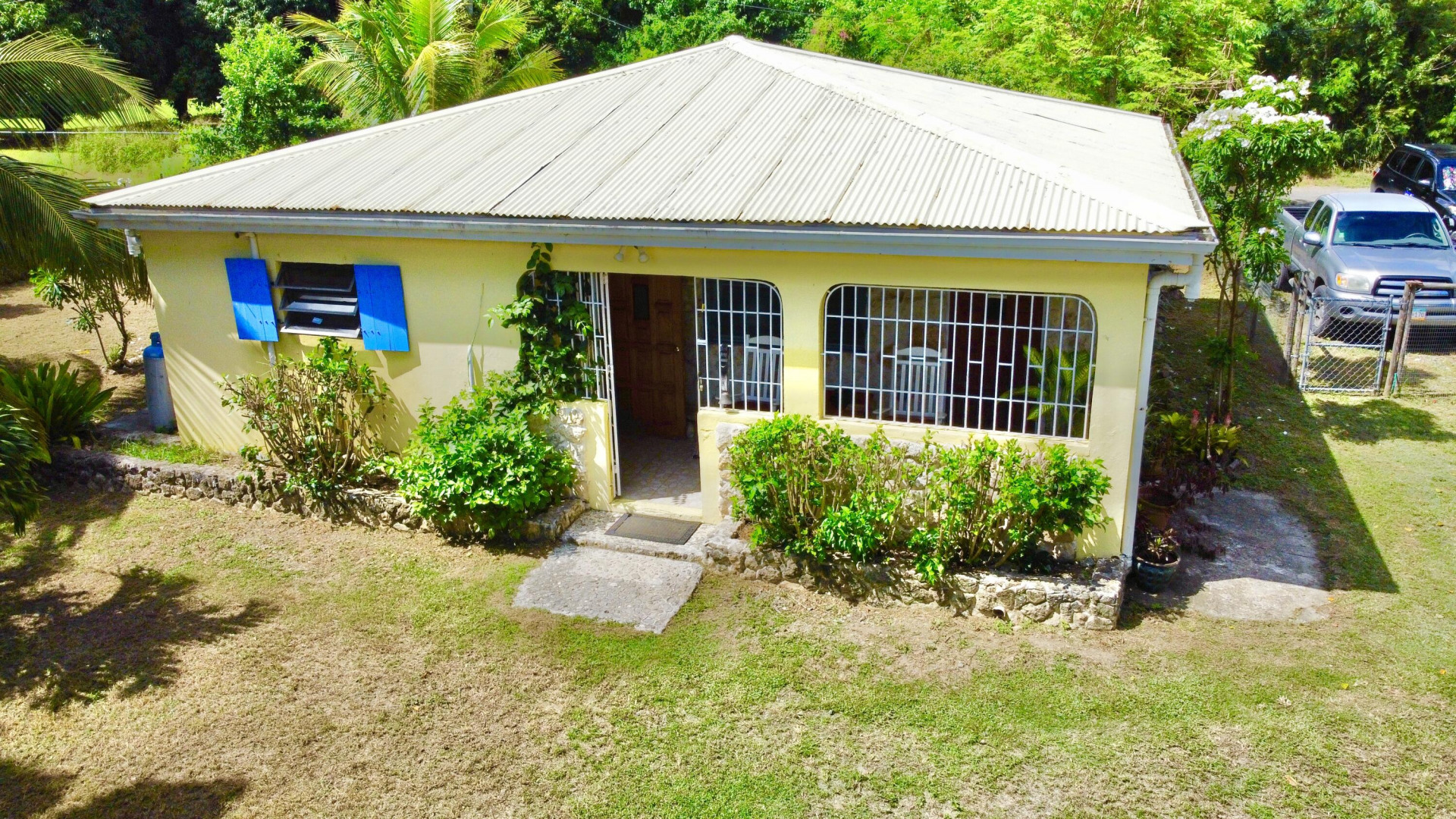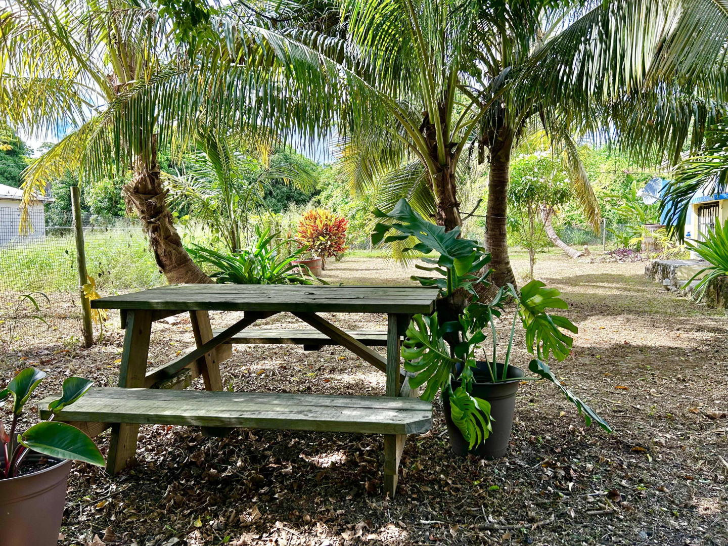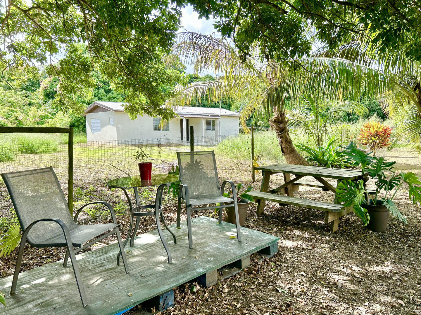 Mid Island Oasis. So sweet, so serene in this cozy and solid 2 bedroom/1 bath home with a new galley style kitchen. Quartz countertop, wood cabinets, gas stove, petite dishwasher, washer and dryer, 5.5 kw gas generator. Comfy, secure gallery with cooling tropical breezes. Fully fenced, perfect for pets. Delightful relaxation corner with shade and sitting area and included picnic table. Loads of tropical plantings and fruit trees. Detached workshop/storage.
