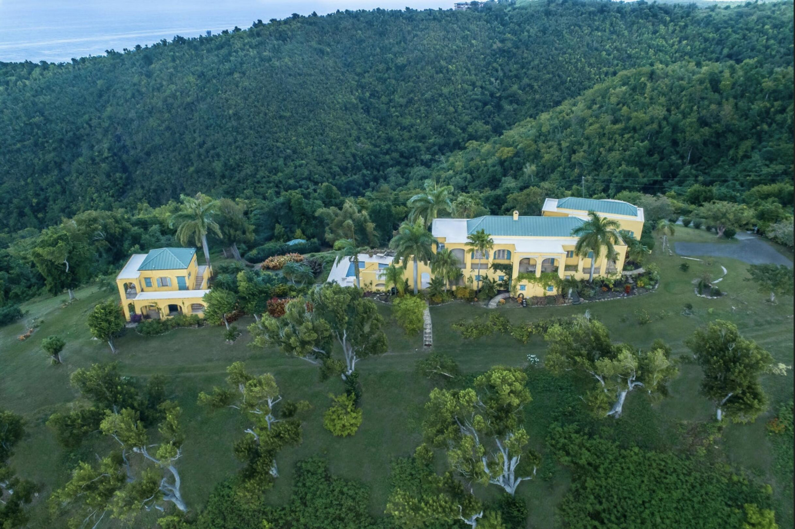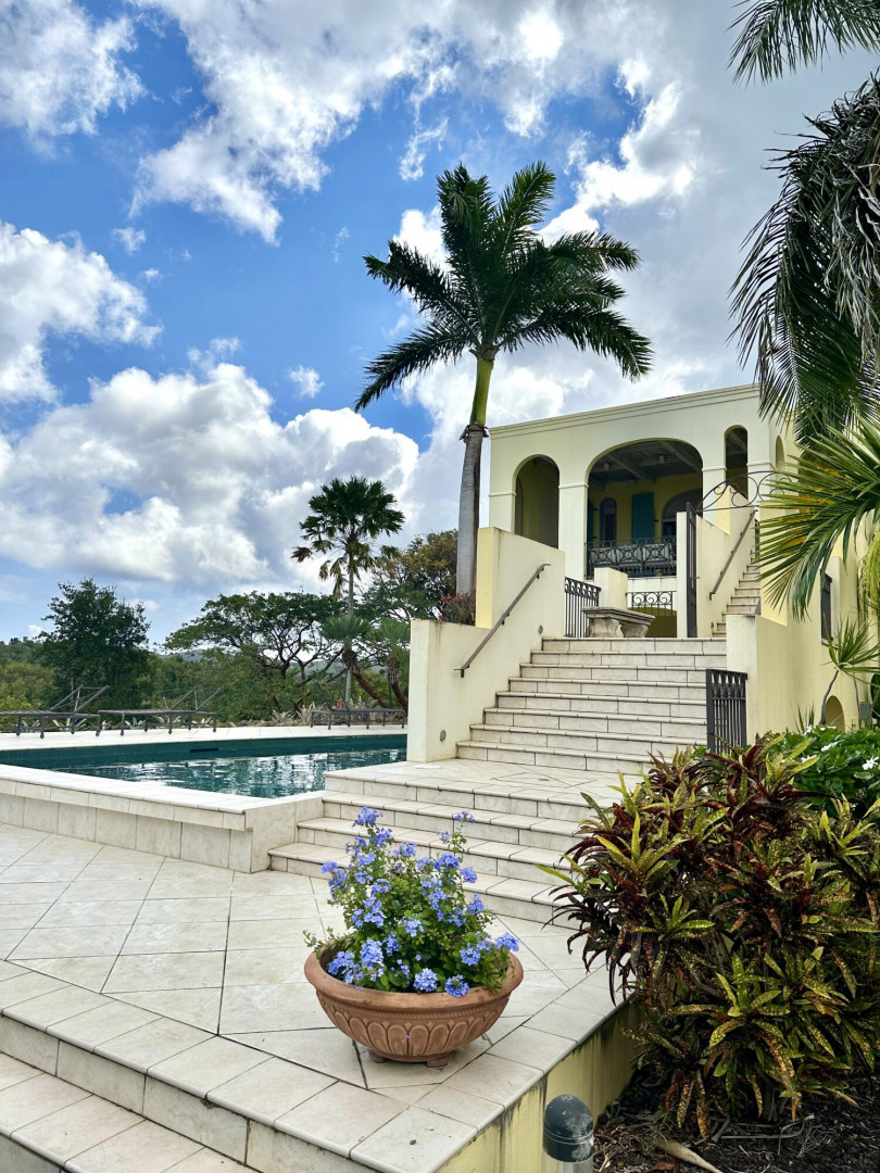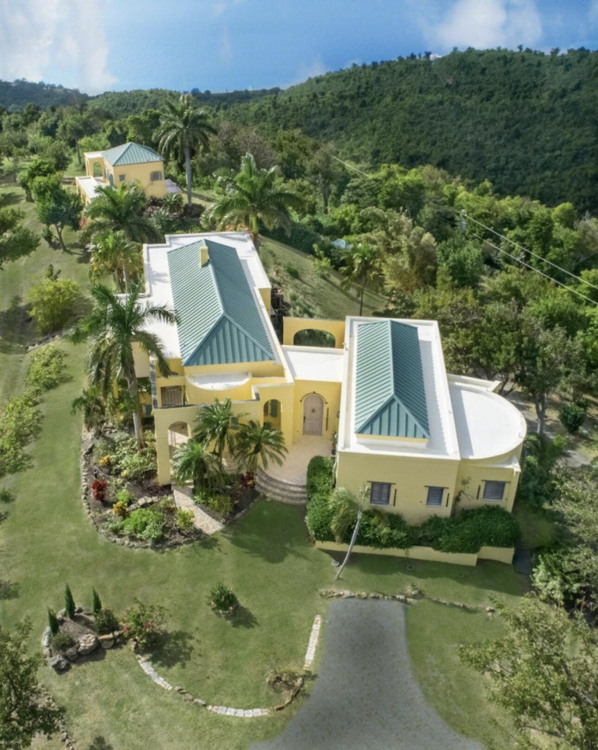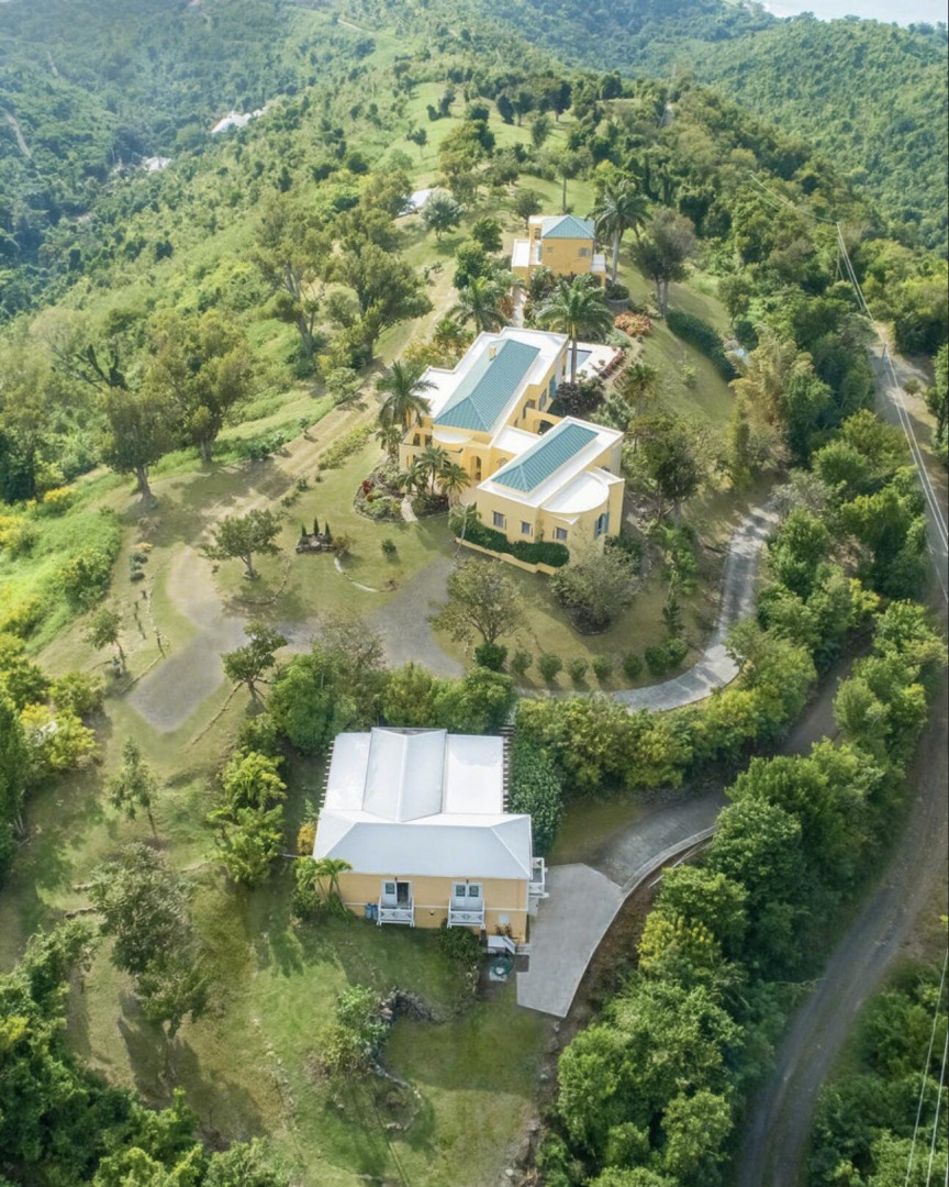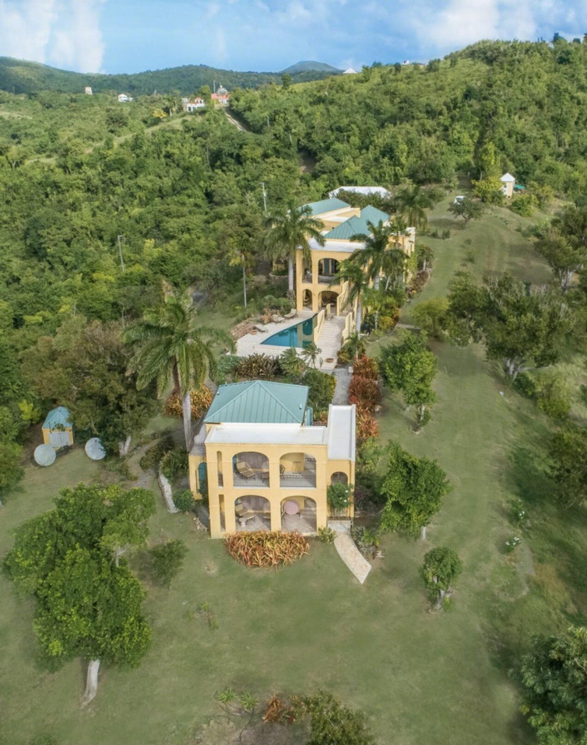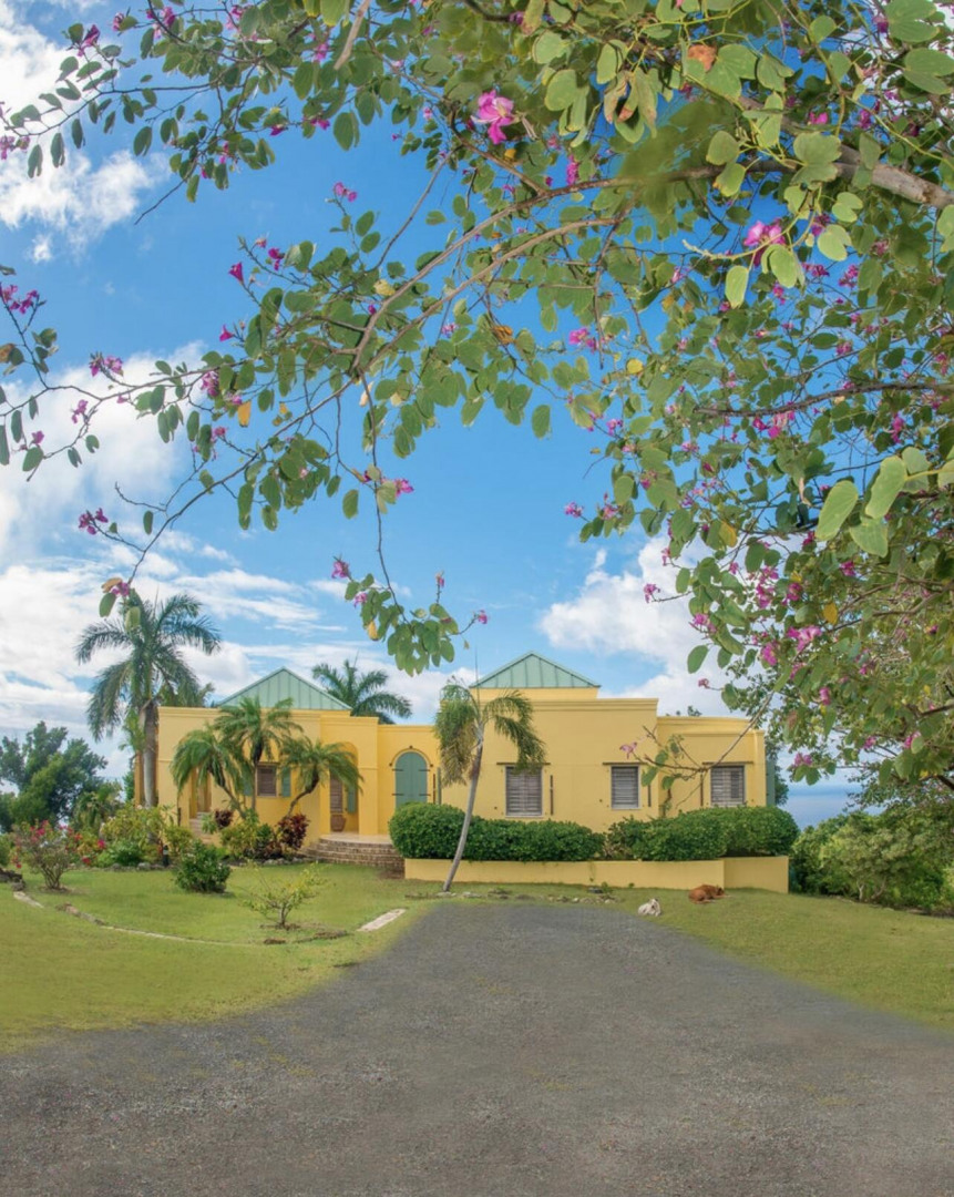 The Great Escape: Spectacular, Secluded and For Sale.. Home designed by George Hascup, Director of Design at the School of Architecture at Cornell University. 8 plus hill top acres, with massive views of the ocean, the Frederiksted pier, Puerto Rico, Vieques & Culebra. This property sits at approximately 660' elevation. Solar powered/ net metered; mahogany cathedral ceiling; (See Supplement)." Built in 1997-2000