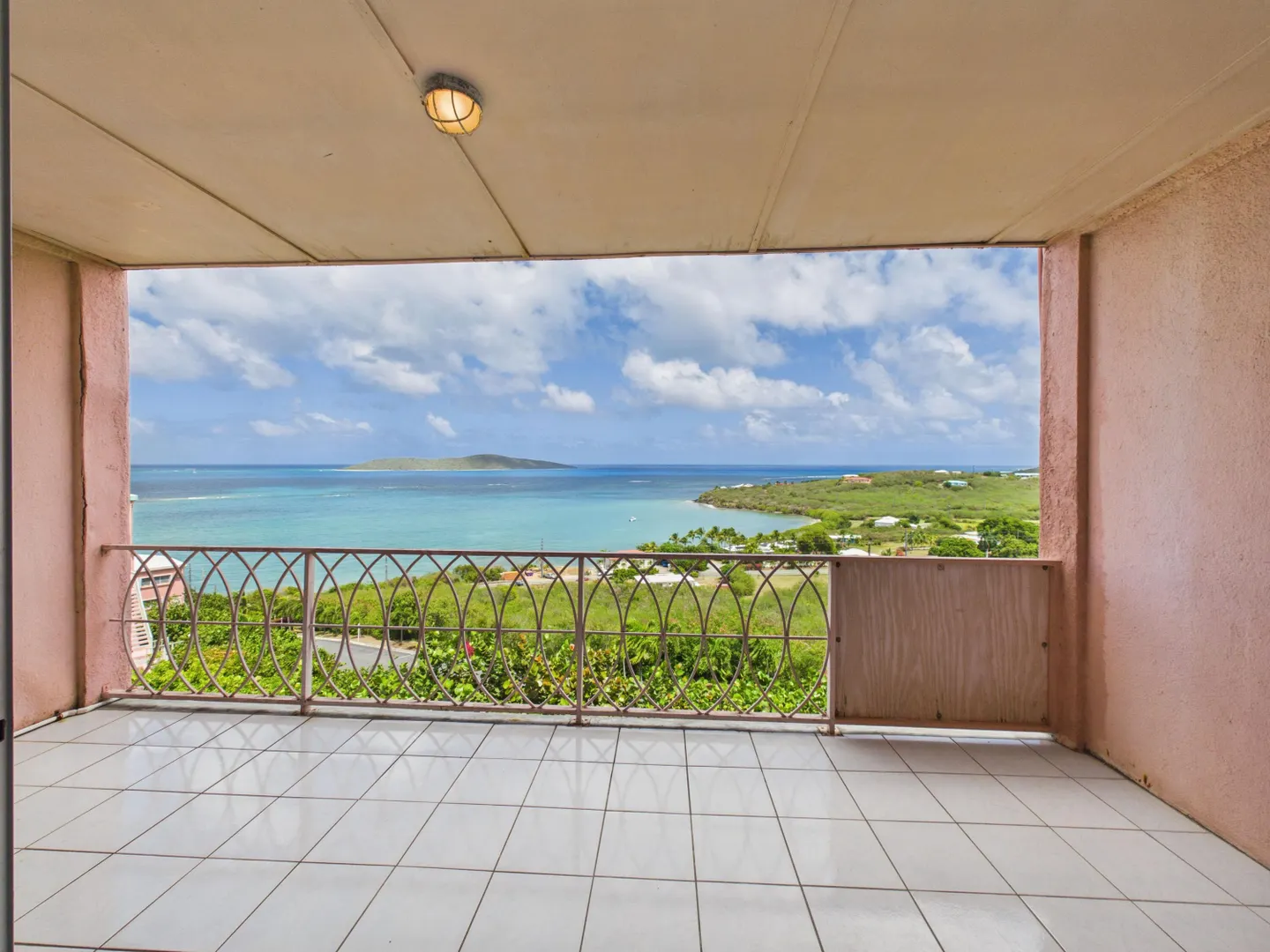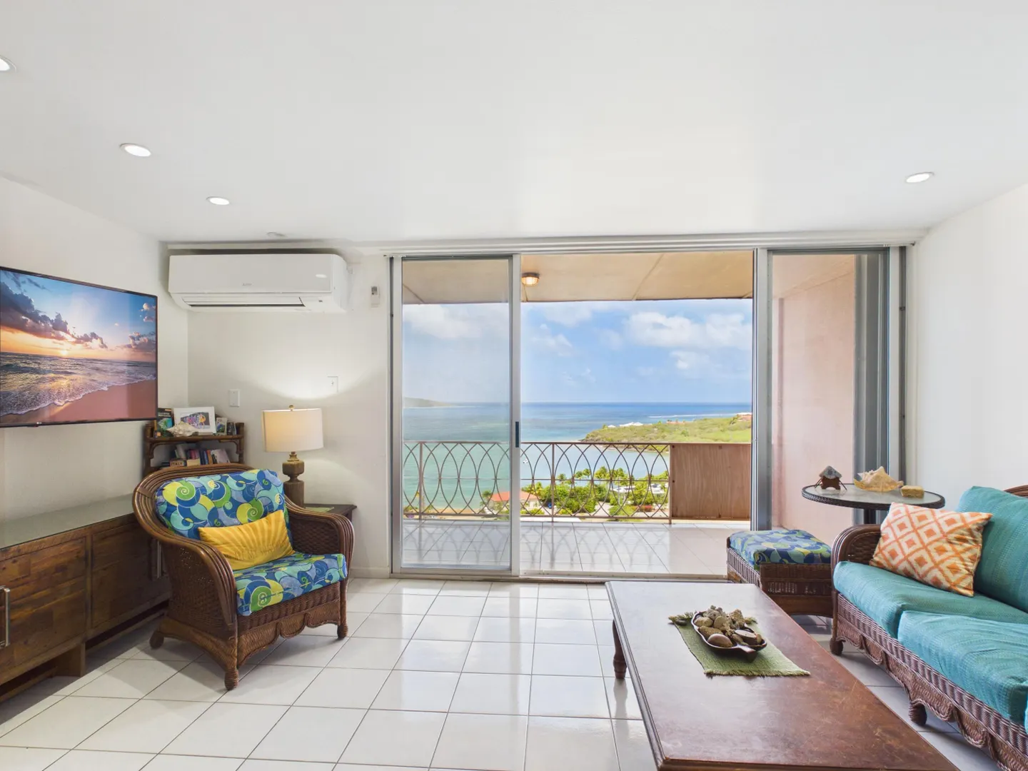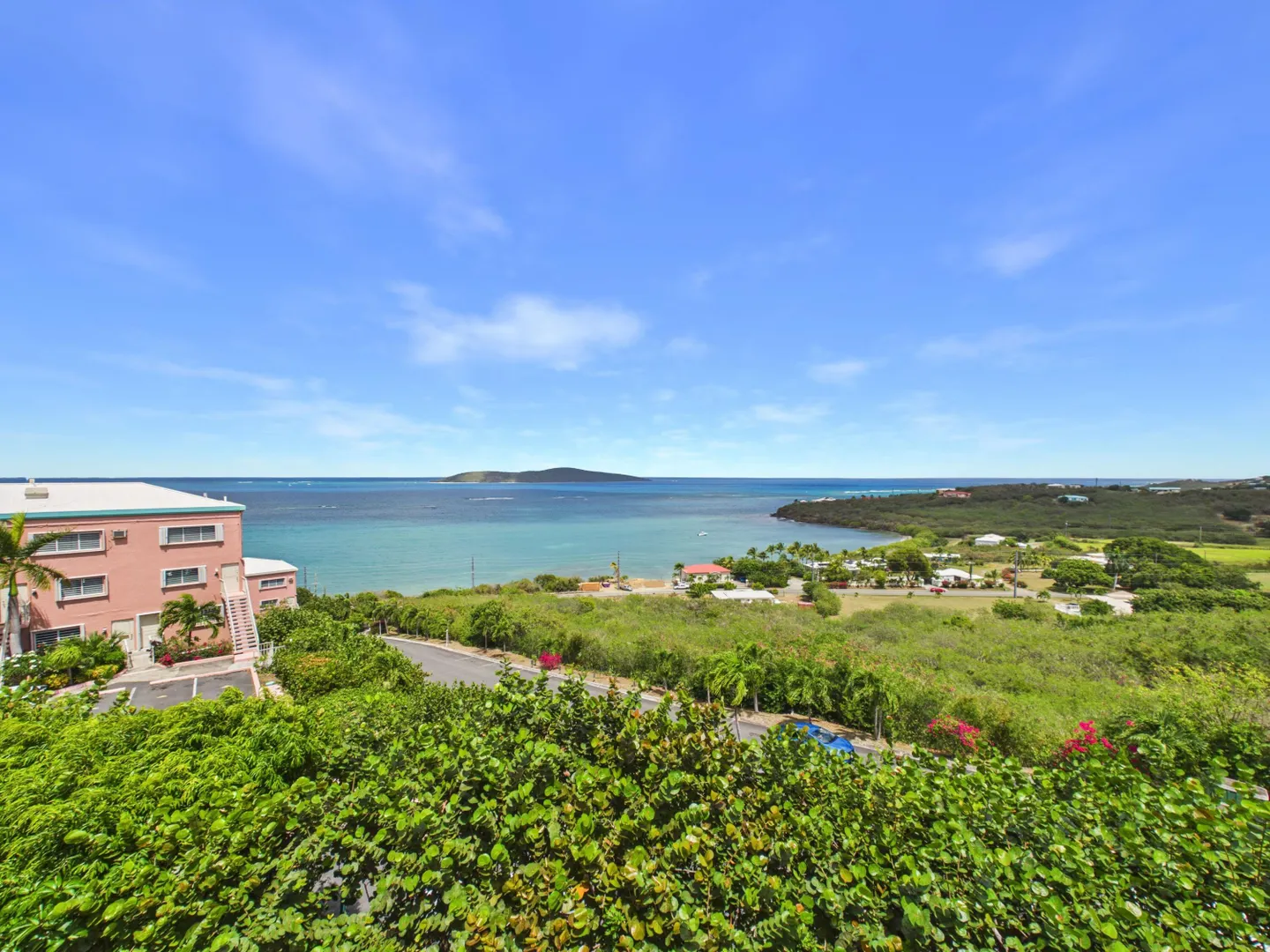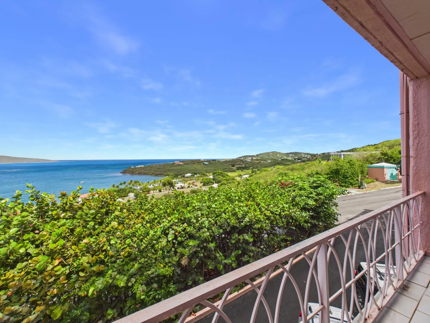 Enjoy elevated East End living in this hillside condominium with sweeping Caribbean views of Buck Island, St. Thomas, St. John, and the BVI. The main level features an open kitchen, dining, and living area that flows to a gallery perfect for taking in the scenery. Downstairs offers two bedrooms and two baths, including a primary suite with its own private gallery overlooking the sea. The complex provides a backup generator, pool, seasonal restaurant and comprehensive HOA fees covering pest control, landscaping, garbage, Wi-Fi, water, sewage treatment, and more making island living easy and convenient. Beaches nearby.