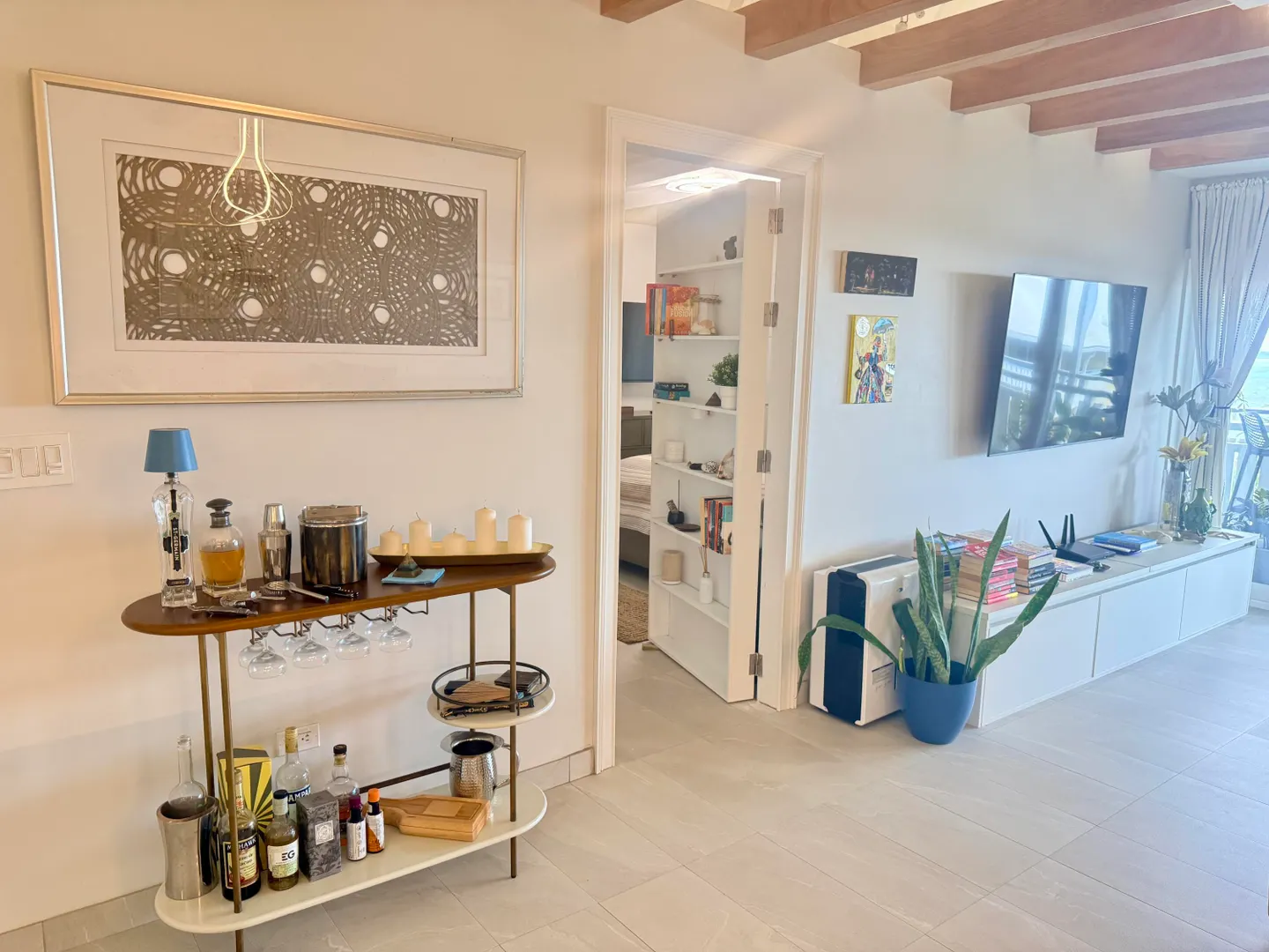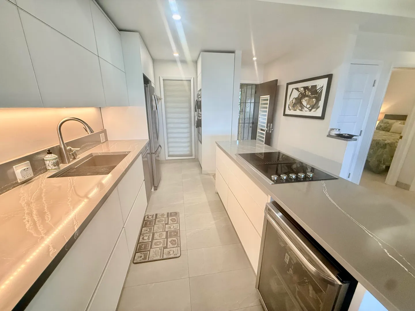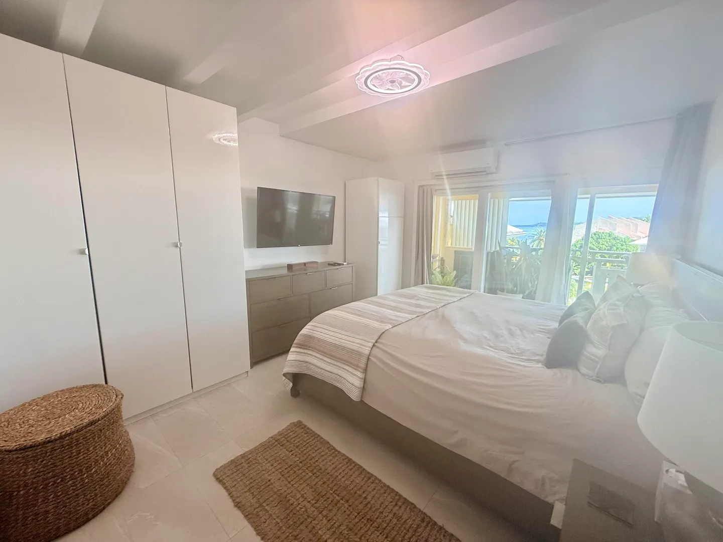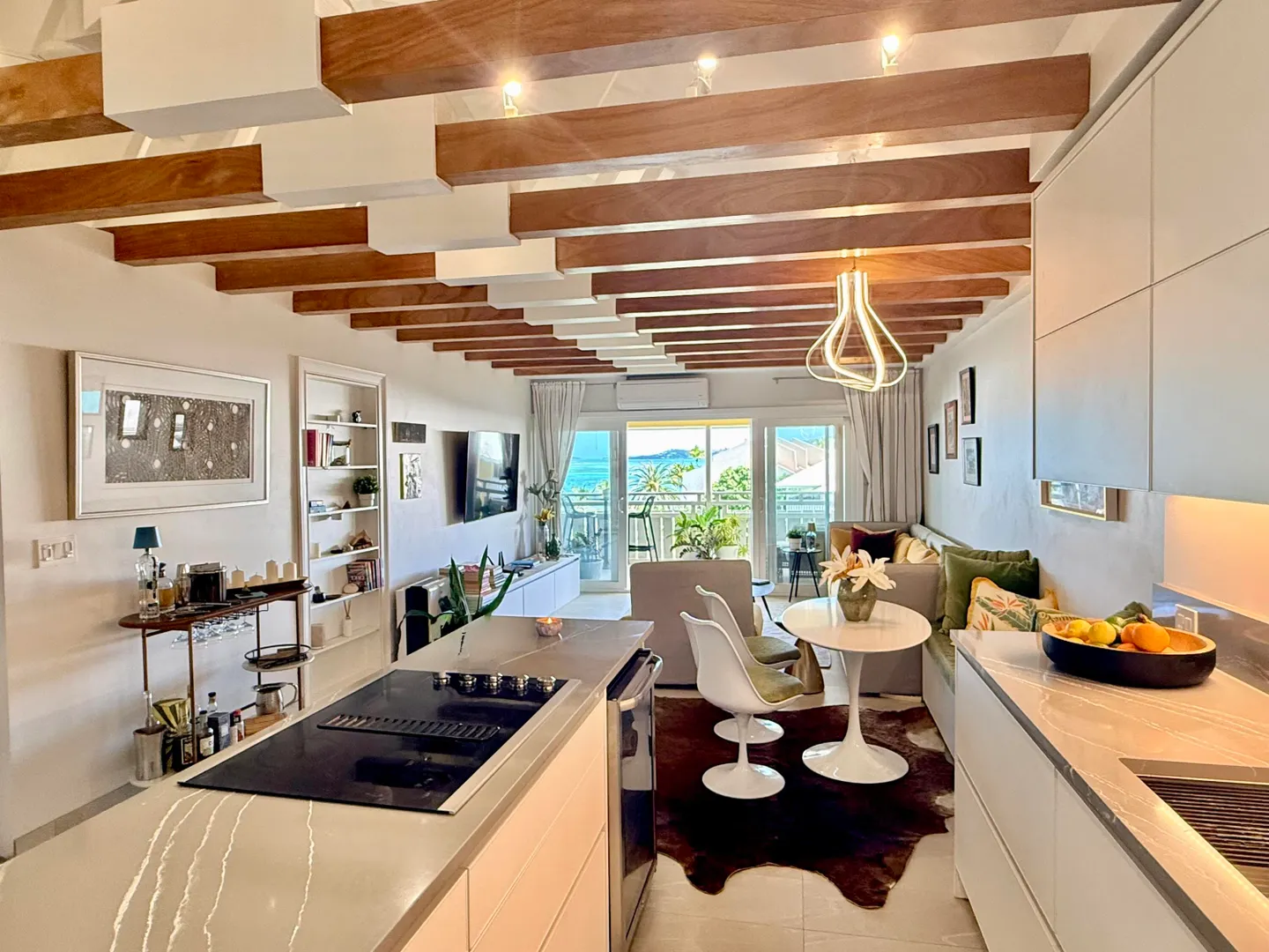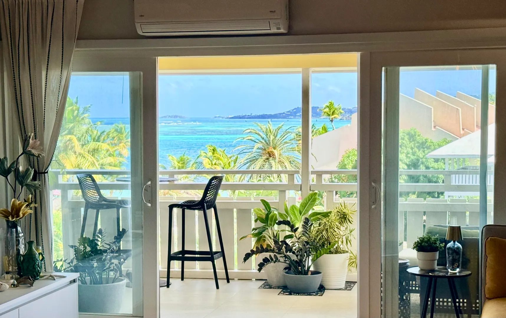Expertly renovated in 2020 using the finest green and sustainable materials, every element of this chic 2 bedroom, 2 bathroom condo in Colony Cove was thoughtfully considered to maximize function and style.As you step into this island oasis, take in the rich blues of the Caribbean Sea and an unobstructed view of Green Cay and Buck Island. Porcelain tile floors flow seamlessly throughout the interior and exterior spaces, anchoring the home with durability and understated elegance.The functional kitchen features granite countertops and custom, powder-coated, rust-proof IMD cabinets imported from Spain and moody, under-cabinet lighting. With no shortage of space, the upper vertical lift cabinets provide accessible storage, and drawers are all soft-close.New stainless steel appliances include a microwave/oven unit, large French-door style refrigerator and a beverage center for the entertaining you are sure to do often.