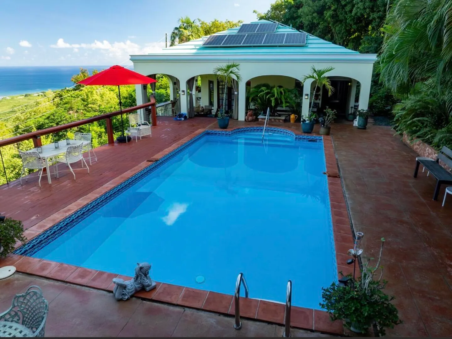 Experience island living at its finest in this poured-concrete 3-bedroom, 2-bathroom home featuring a spacious loft with striking cypress ceilings. The gourmet kitchen showcases Spanish Cedar custom cabinets by Mike Lustig, a mahogany bar, a new 36'' 5-burner gas range with convection, and a new dishwasher. Beautiful mahogany balusters add warmth and craftsmanship throughout. The main house is cooled by two large Mitsubishi split units, both under a 10-year warranty.The expansive 320 sq ft primary suite includes a walk-in closet, double vanity, double shower, skylight, custom tile work, and a luxurious 6-ft cast iron soaking tub. An outdoor shower adjacent to the main suite offers a secluded, spa-like experience.Enjoy seamless indoor-outdoor living with a wraparound deck and an observation deck overlooking the North Shore, offering panoramic views and cooling breezes. The 15x30 tiled saltwater pool features an auto chlorine generator, variable-speed pump, and a new Maytronics robot vacuum, surrounded by a stained concrete deck and an outdoor bar with sink and mini fridge, creating a private resort atmosphere.