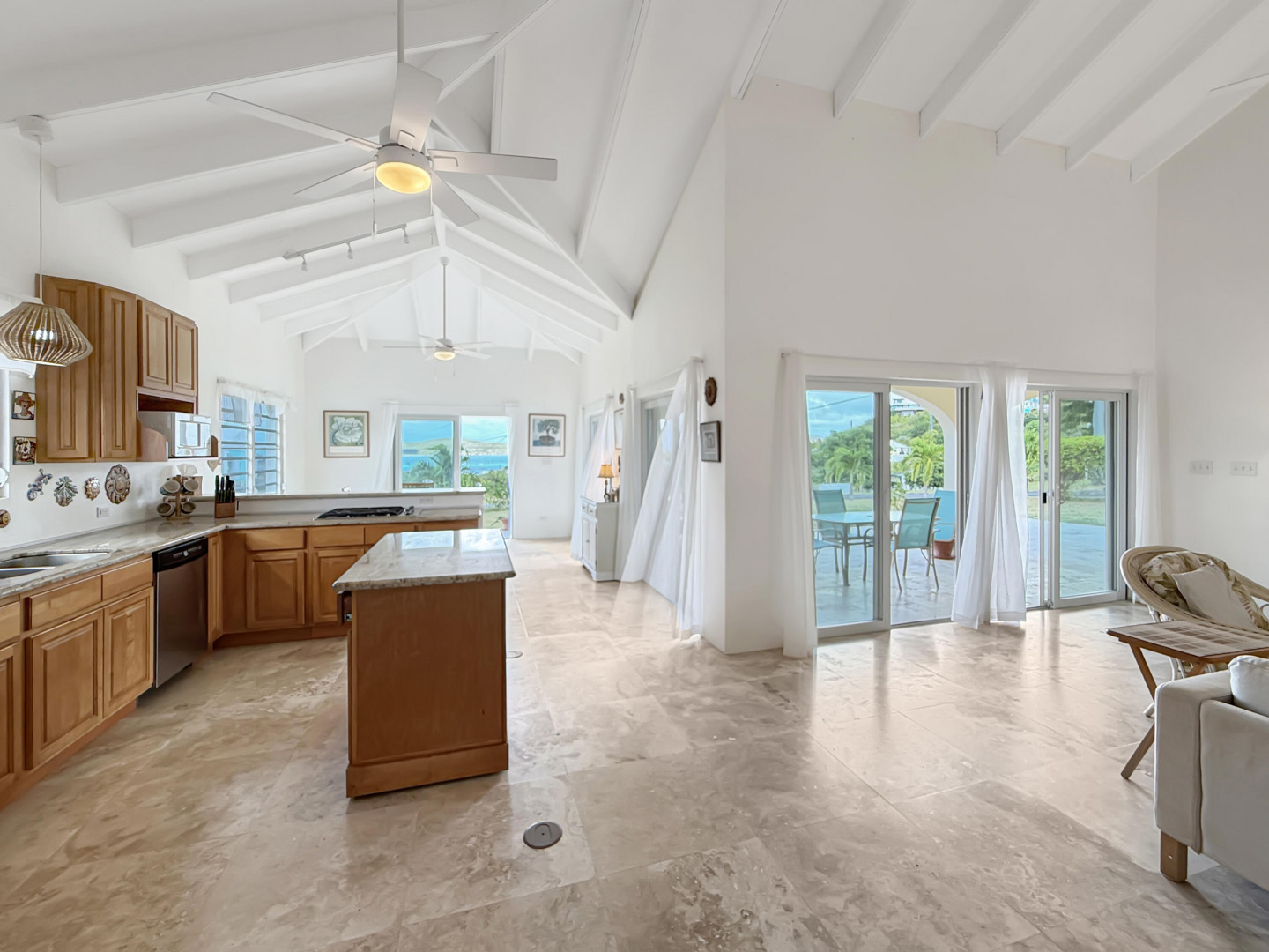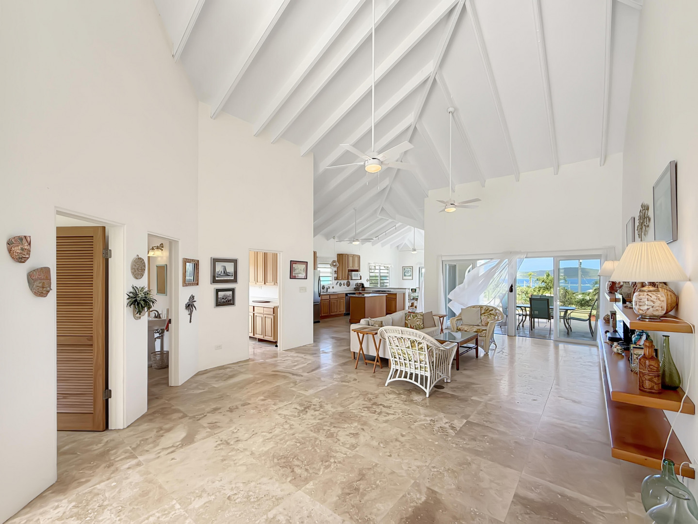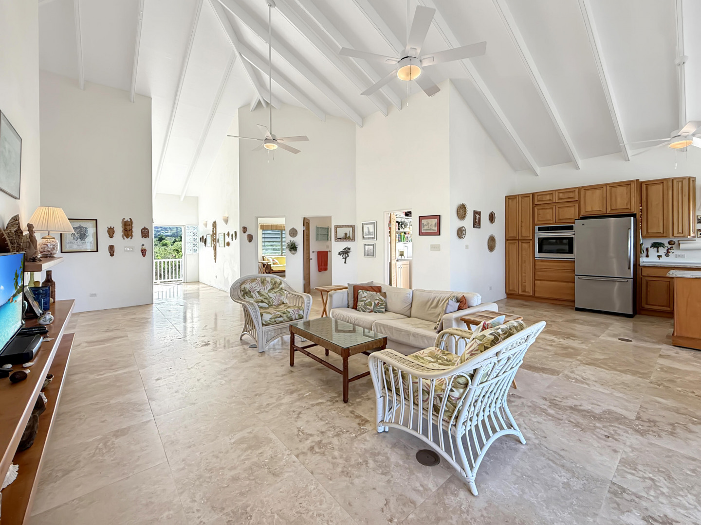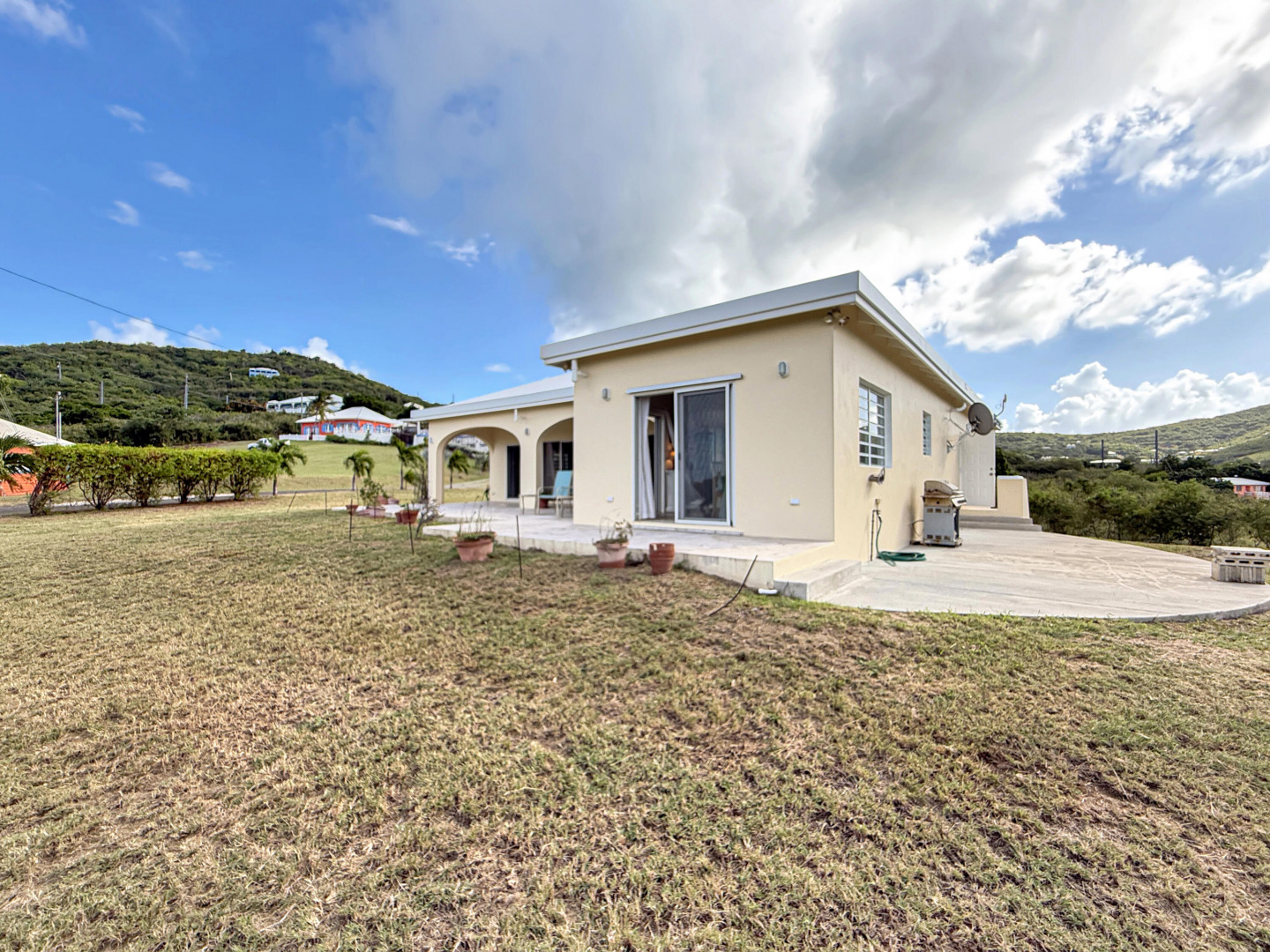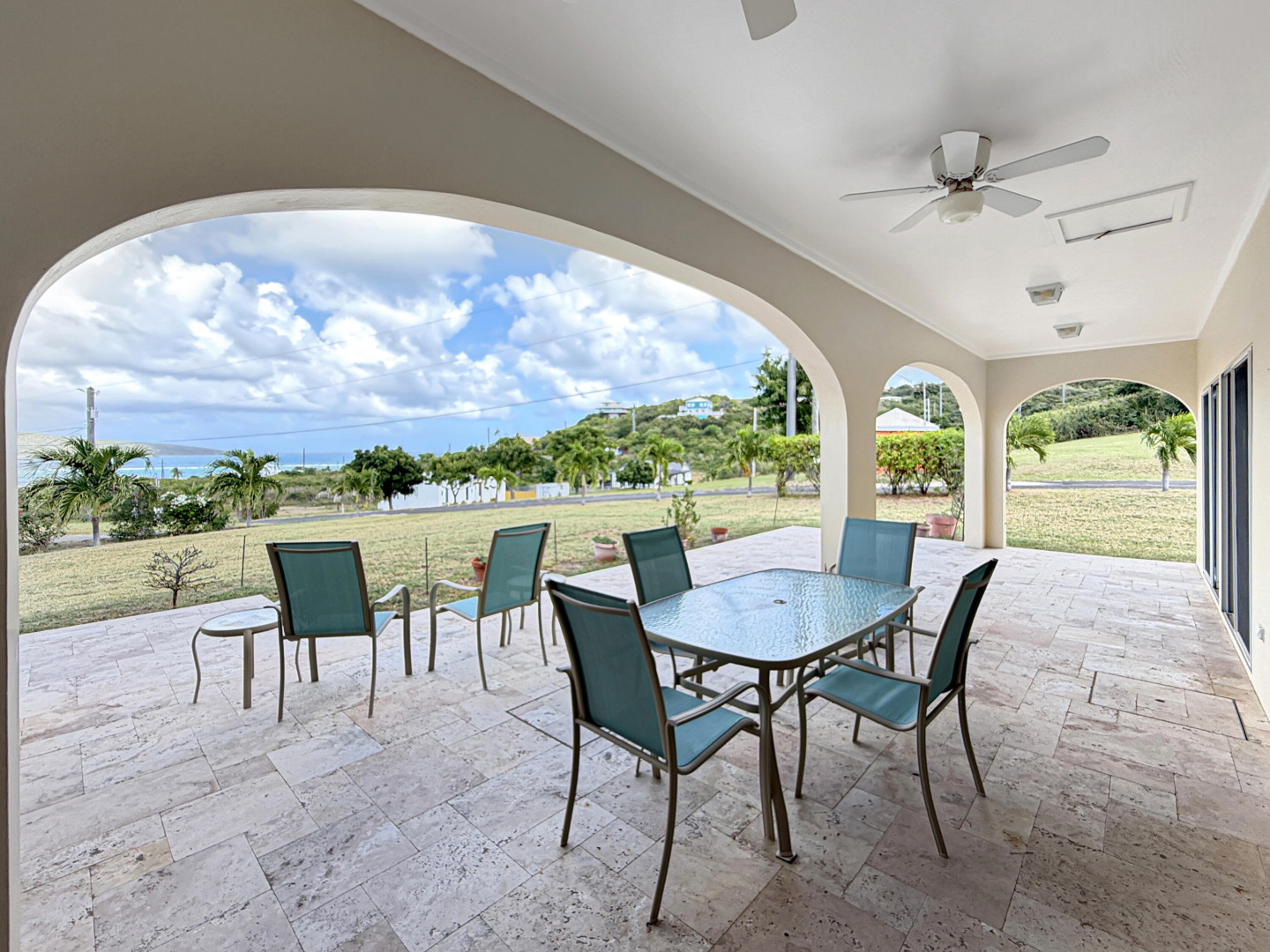 Situated to capture the breezes, this 3 bedroom 3 bathroom home with a fantastic view of Buck Island and the blue Caribbean Sea is located on the popular east end at the end of a road. This wonderful home on a double lot offers a peaceful setting for your island living. It has been meticulously maintained. There's Travertine tile throughout the house, even in the showers! The beautiful kitchen has granite countertops, stainless steel appliances, solid wood cabinets, lots of storage, and a moveable island to place where ever you'd like. With soaring vaulted ceilings, custom made floating shelves in the large great room, expansive shady gallery plus sunny patio, and storage everywhere (even a big storage room downstairs), this house is just waiting for you to make it your home! No HOA.