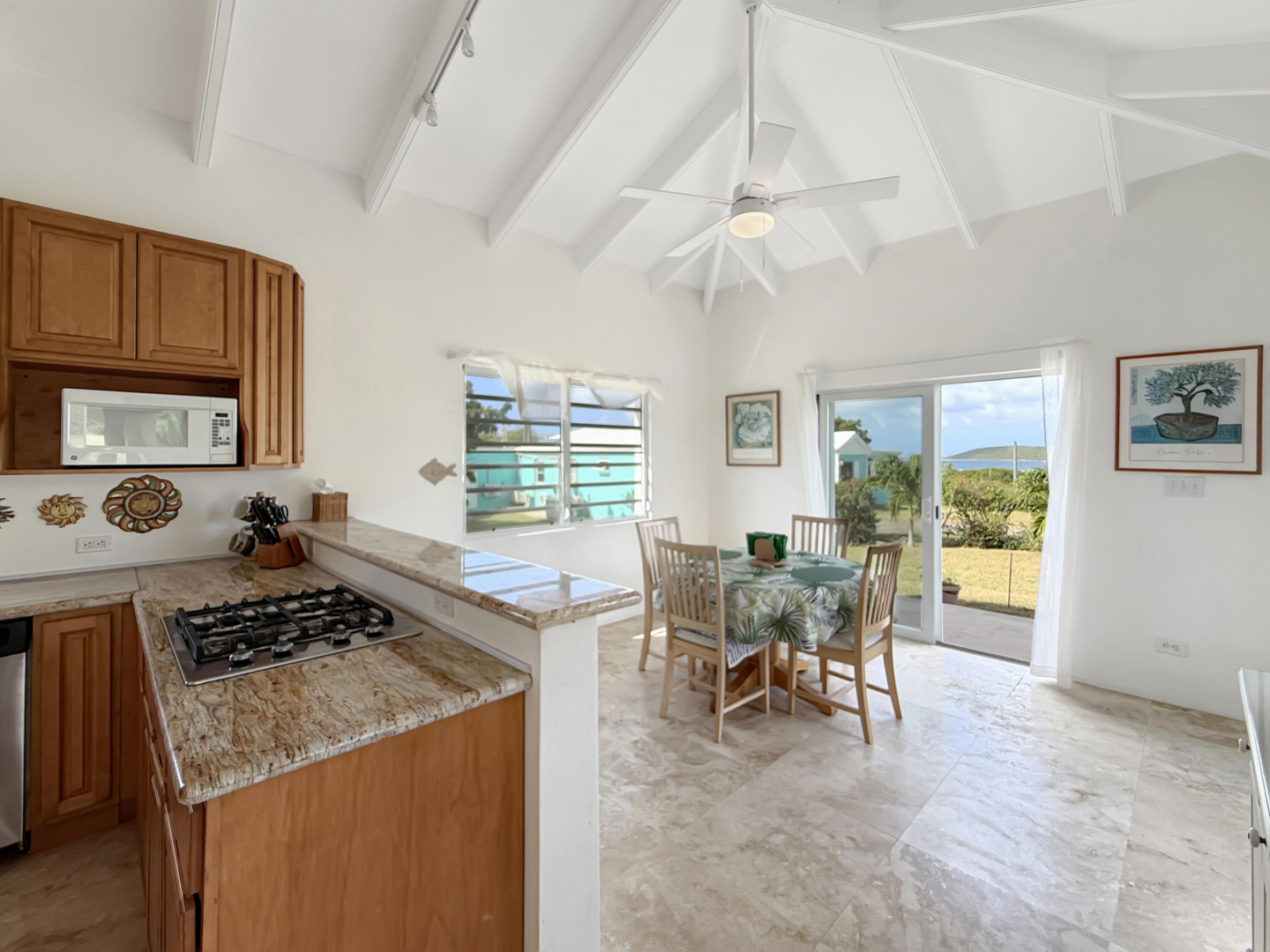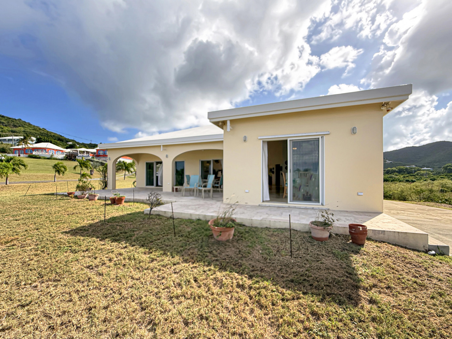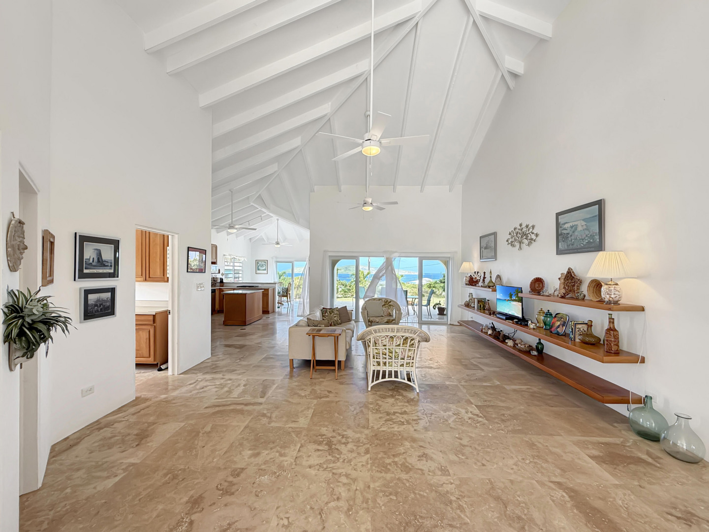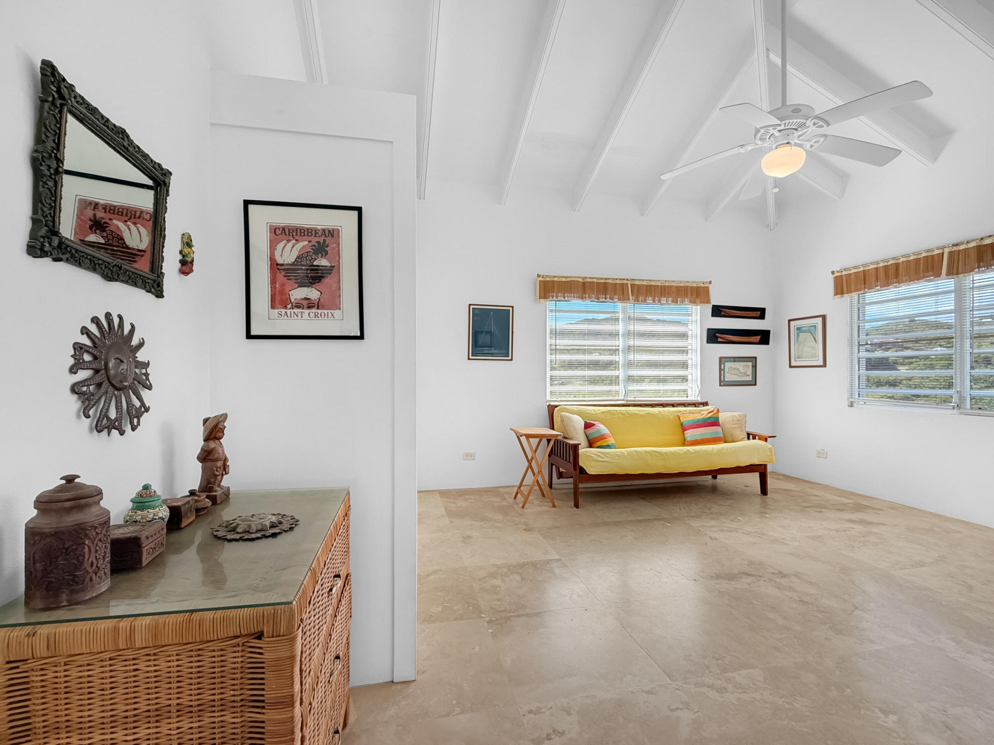 Situated to capture the breezes, this 3 bedroom 3 bathroom home with a fantastic view of Buck Island and the blue Caribbean Sea is located on the popular east end at the end of a road. This wonderful home on a double lot offers a peaceful setting for your island living. It has been meticulously maintained. There's Travertine tile throughout the house, even in the showers! The beautiful kitchen has granite countertops, stainless steel appliances, solid wood cabinets, lots of storage, and a moveable island to place where ever you'd like. With soaring vaulted ceilings, custom made floating shelves in the large great room, expansive shady gallery plus sunny patio, and storage everywhere (even a big storage room downstairs), this house is just waiting for you to make it your home! No HOA.