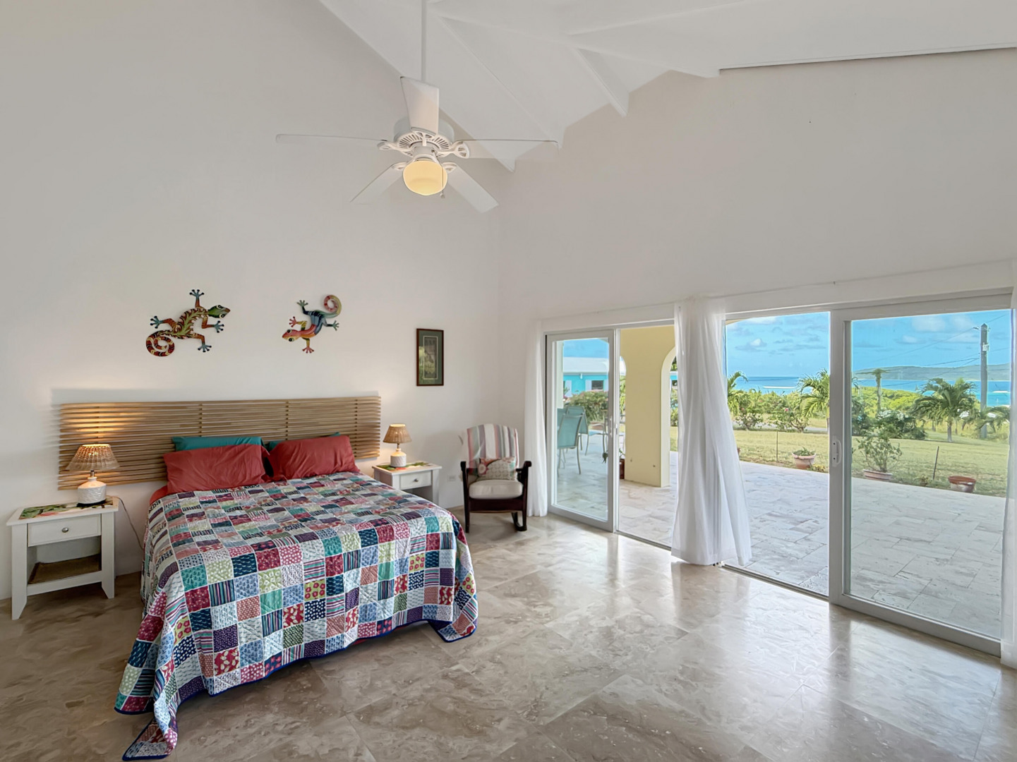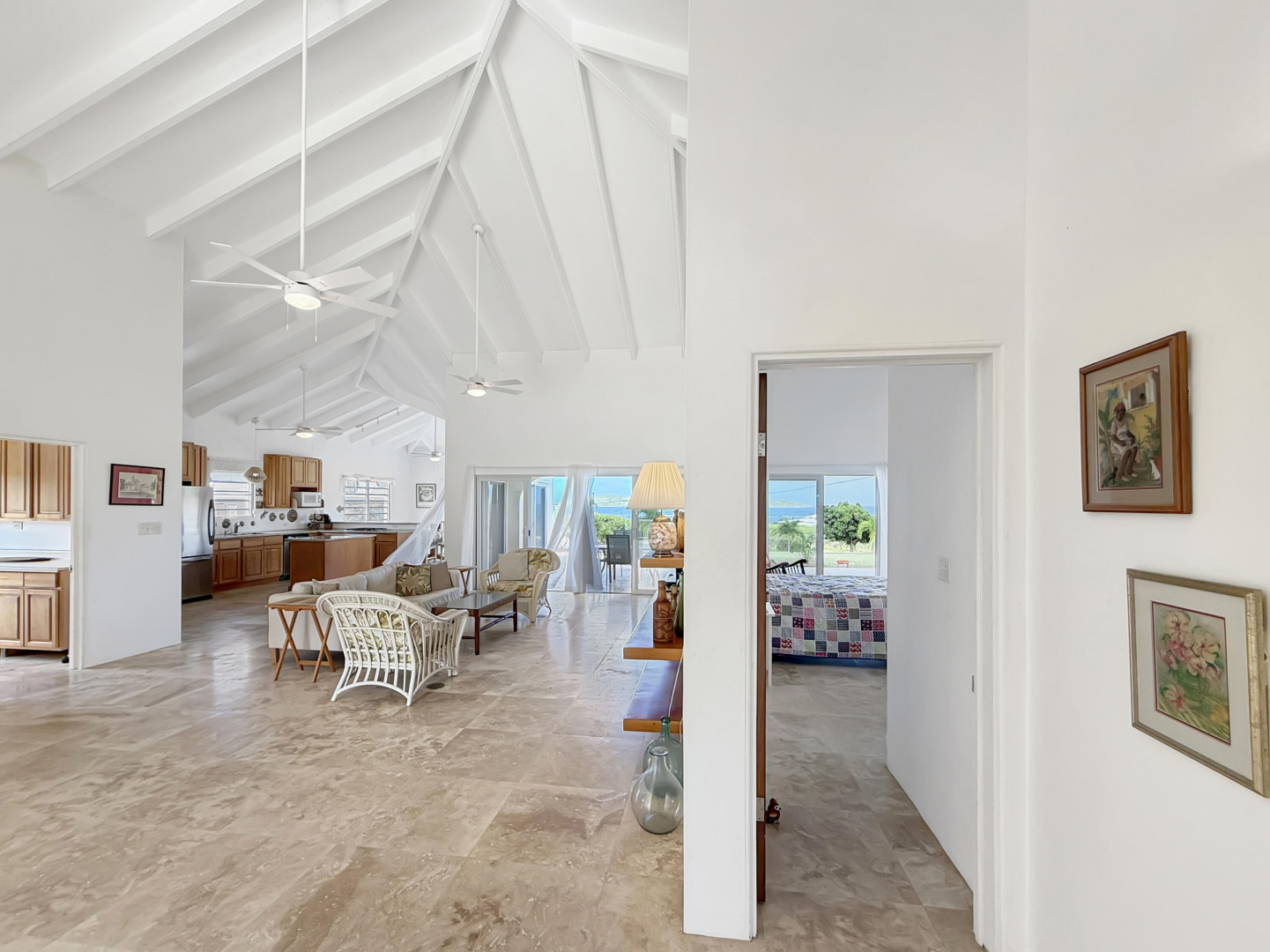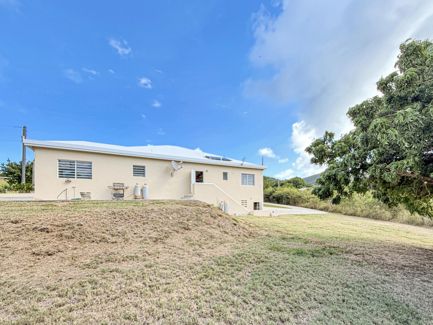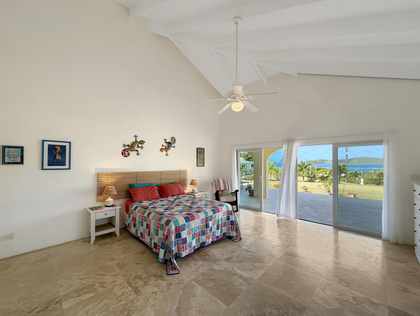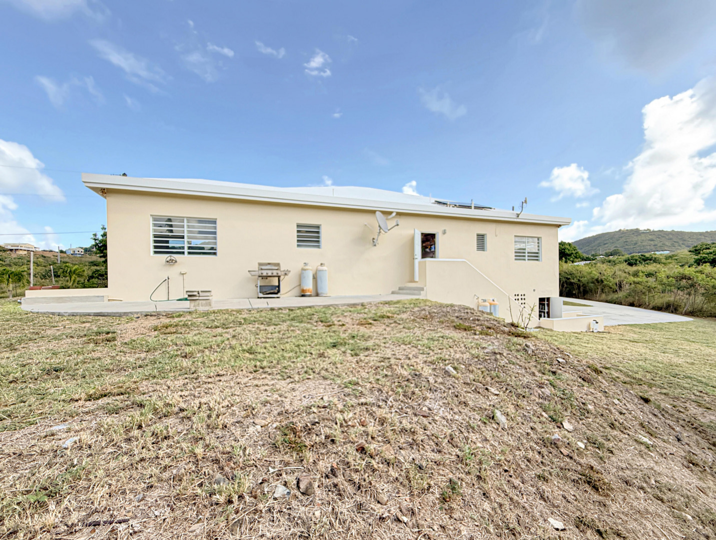 Situated to capture the breezes, this 3 bedroom 3 bathroom home with a fantastic view of Buck Island and the blue Caribbean Sea is located on the popular east end at the end of a road. This wonderful home on a double lot offers a peaceful setting for your island living. It has been meticulously maintained. There's Travertine tile throughout the house, even in the showers! The beautiful kitchen has granite countertops, stainless steel appliances, solid wood cabinets, lots of storage, and a moveable island to place where ever you'd like. With soaring vaulted ceilings, custom made floating shelves in the large great room, expansive shady gallery plus sunny patio, and storage everywhere (even a big storage room downstairs), this house is just waiting for you to make it your home! No HOA.