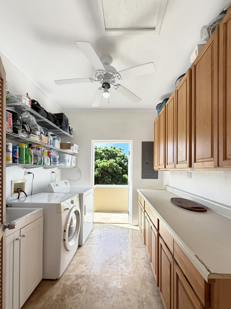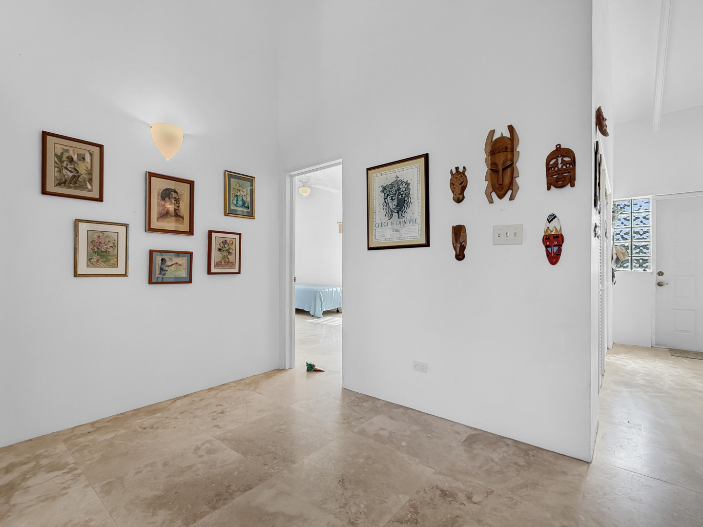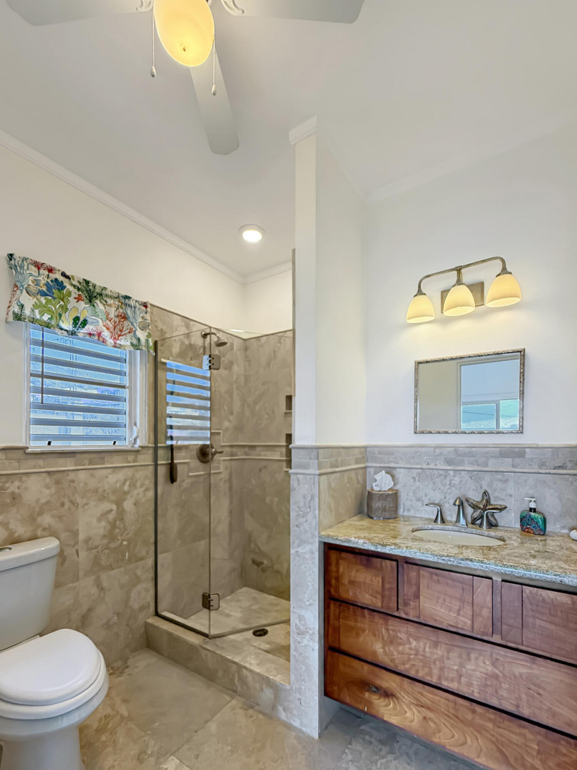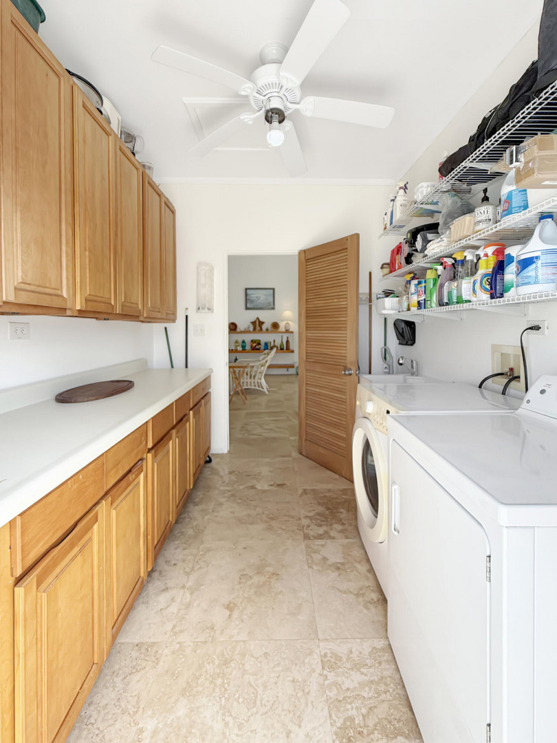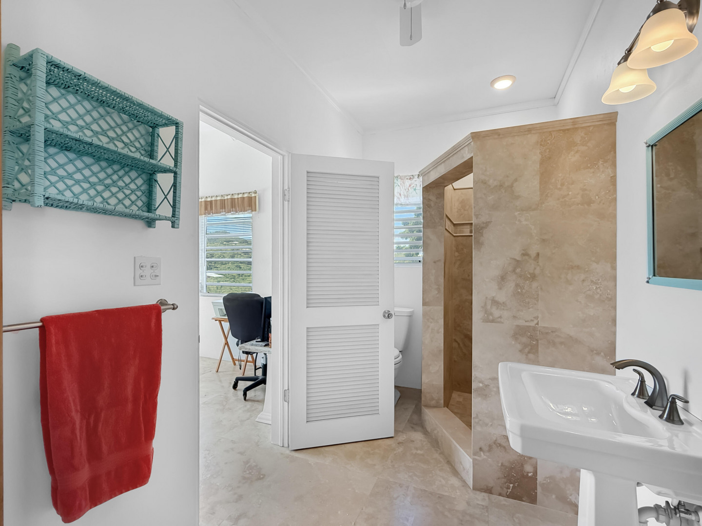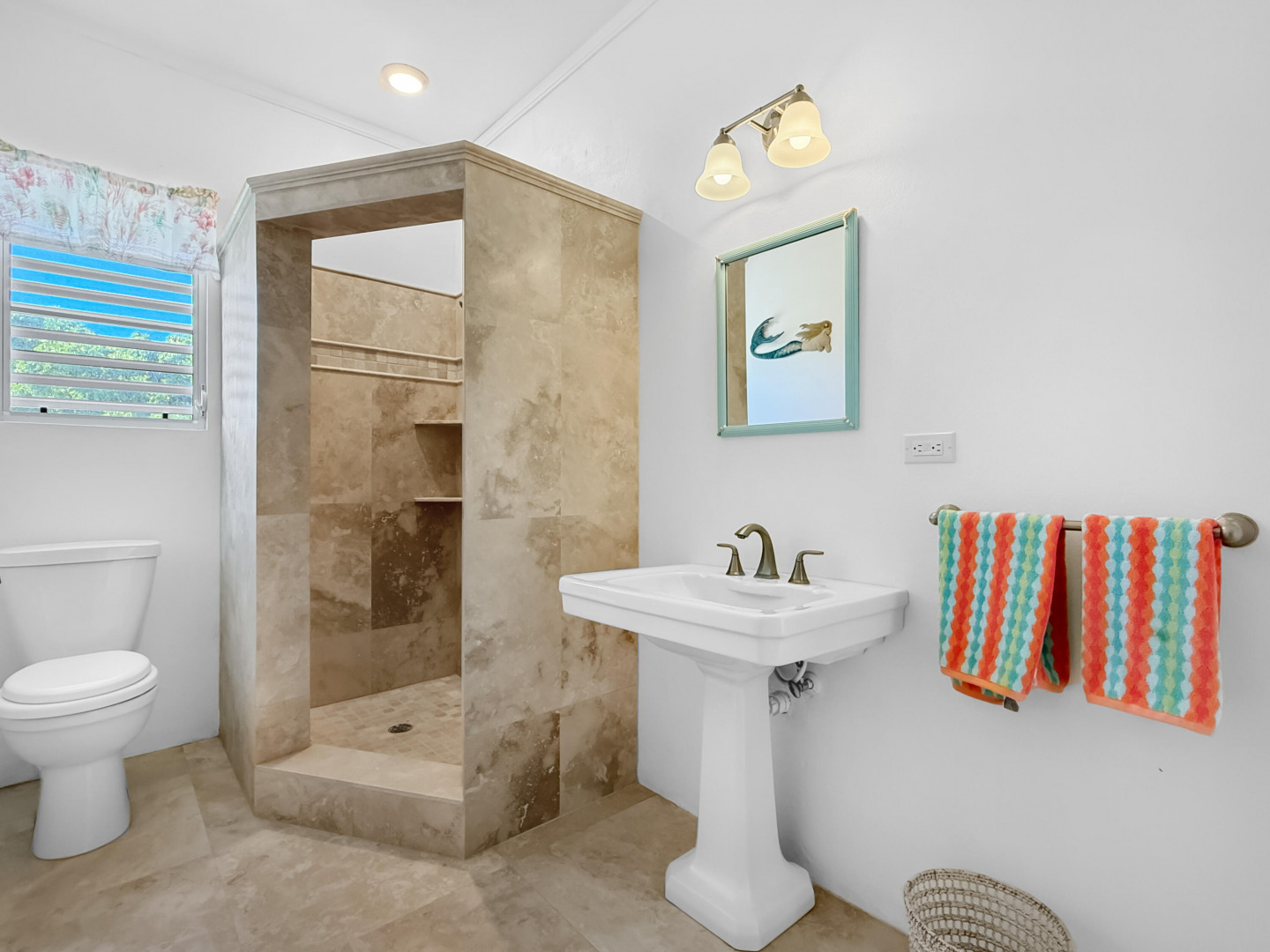 Situated to capture the breezes, this 3 bedroom 3 bathroom home with a fantastic view of Buck Island and the blue Caribbean Sea is located on the popular east end at the end of a road. This wonderful home on a double lot offers a peaceful setting for your island living. It has been meticulously maintained. There's Travertine tile throughout the house, even in the showers! The beautiful kitchen has granite countertops, stainless steel appliances, solid wood cabinets, lots of storage, and a moveable island to place where ever you'd like. With soaring vaulted ceilings, custom made floating shelves in the large great room, expansive shady gallery plus sunny patio, and storage everywhere (even a big storage room downstairs), this house is just waiting for you to make it your home! No HOA.