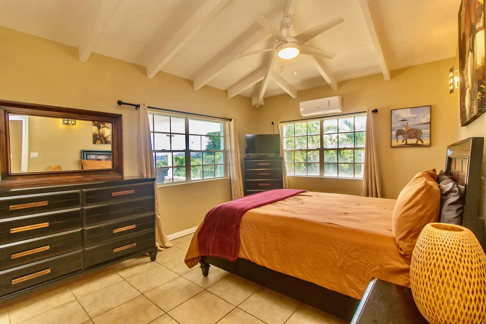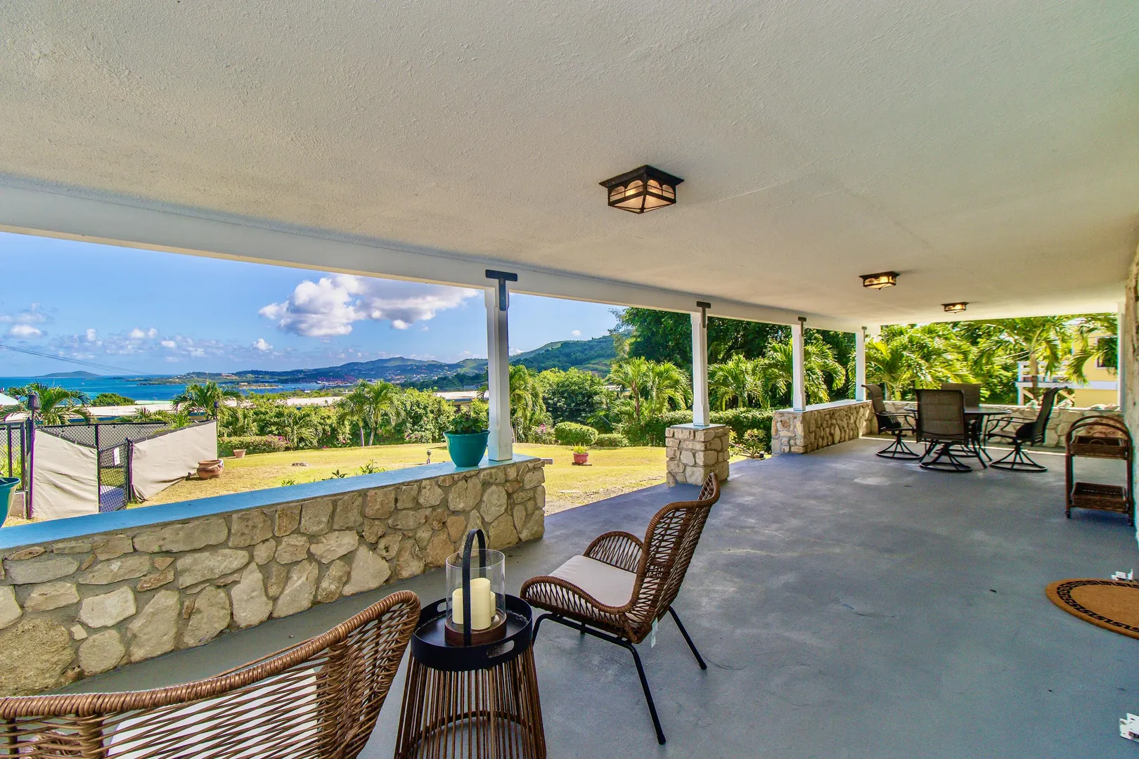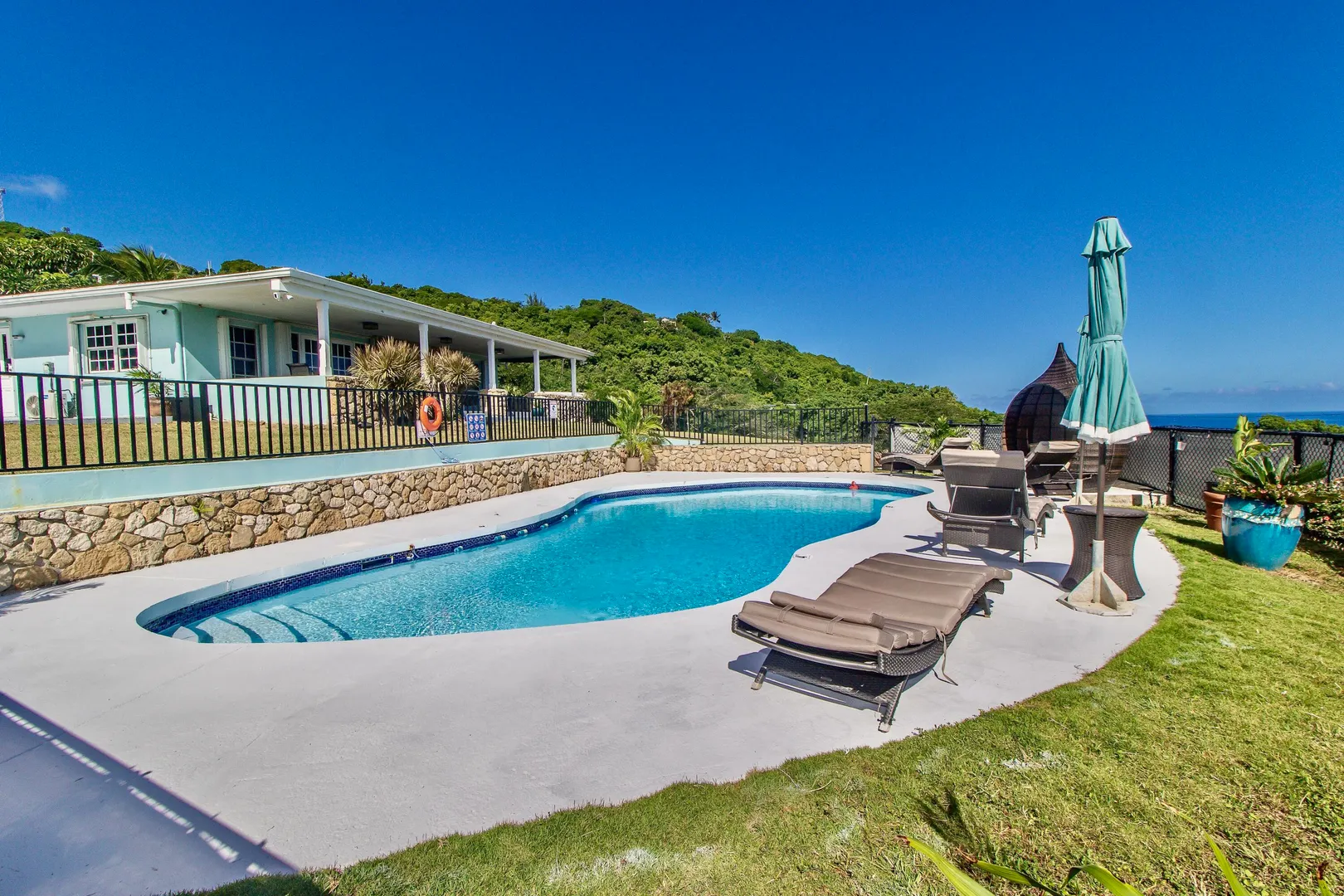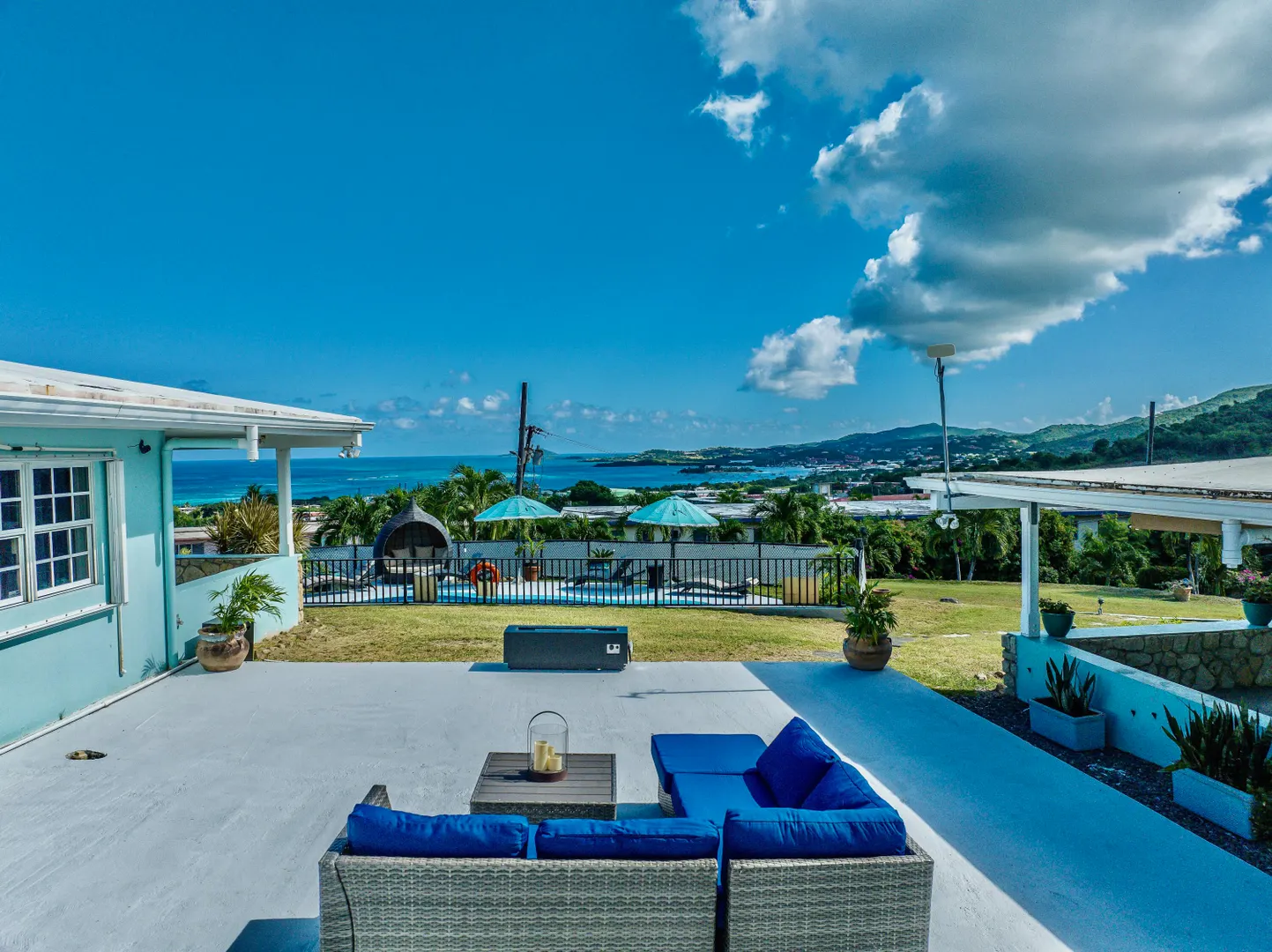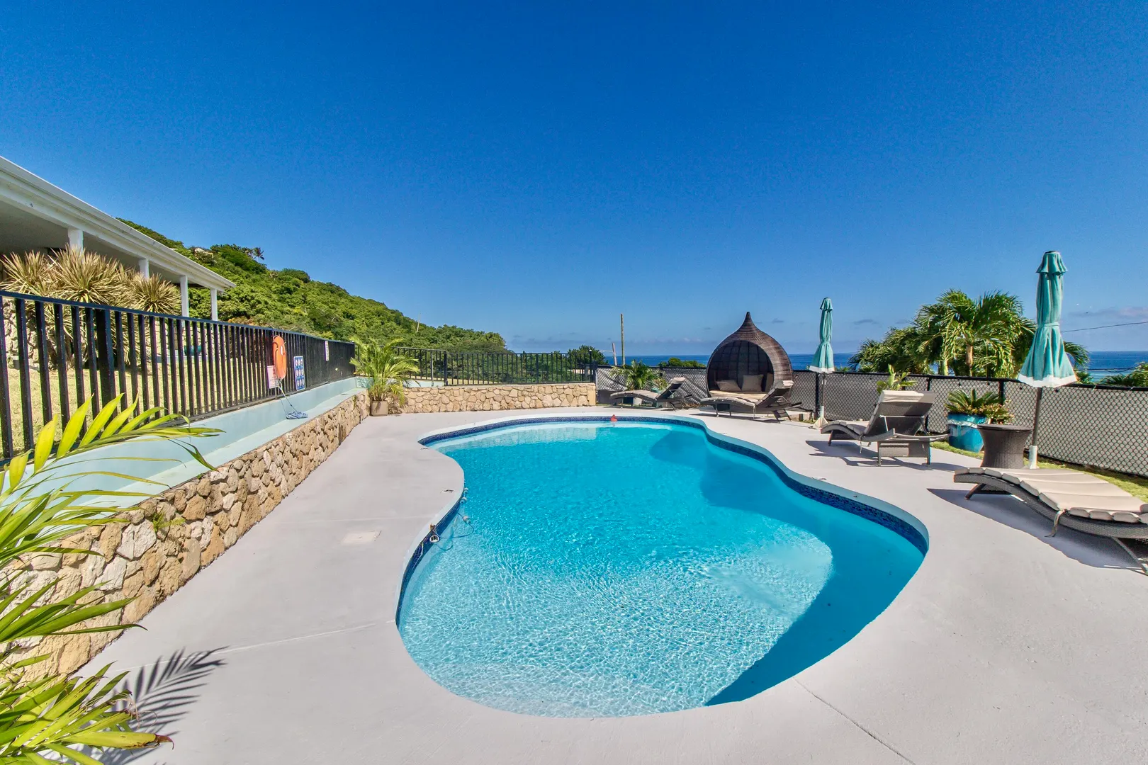 Luxurious, conveniently located 2 bedroom/2 bath free-standing villa comes w/ views of Christiansted Harbour, Buck Island, Hotel on the Cay, and neighboring islands to the north. The classic free-form pool & large deck offer complete relaxation or exercise. You decide. A wonderful east-facing covered patio is perfect for dining or lounging. The lovely breezes & views calm the senses. Inside, the villa's modern interior is fully air-conditioned & furnished. The primary bedroom features an en suite bathroom. Other interior amenities include a washer/dryer, gas range, ring security option, and stainless appliances. Rent includes wifi, back-up auto transfer generator, pool & professional lawn care.