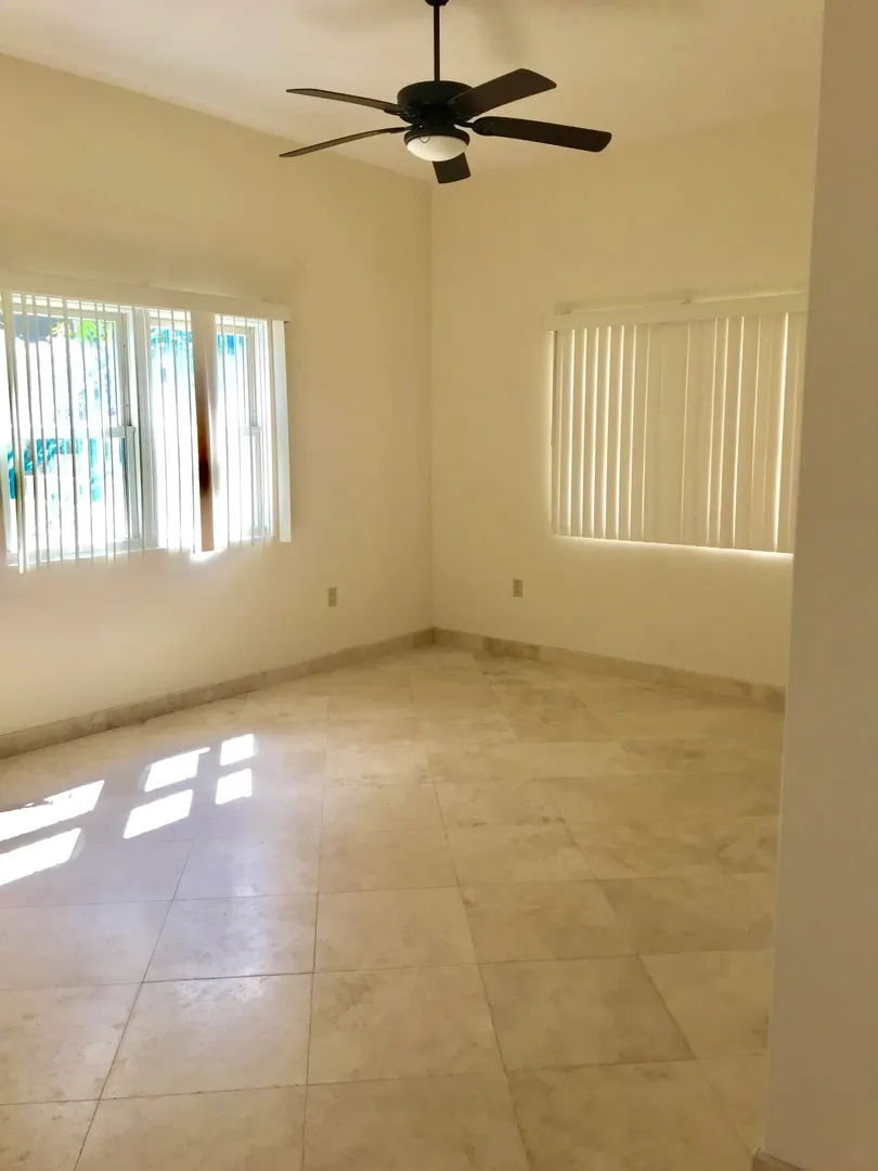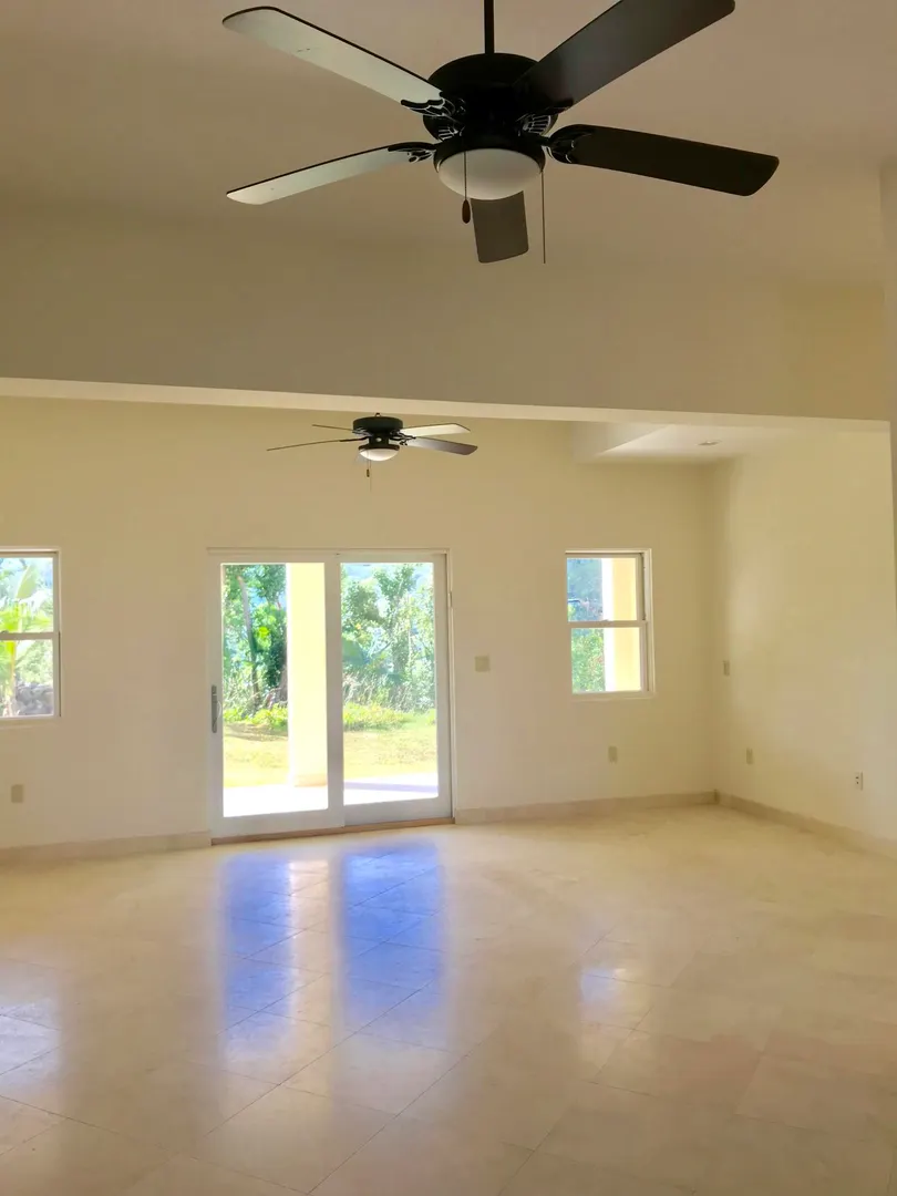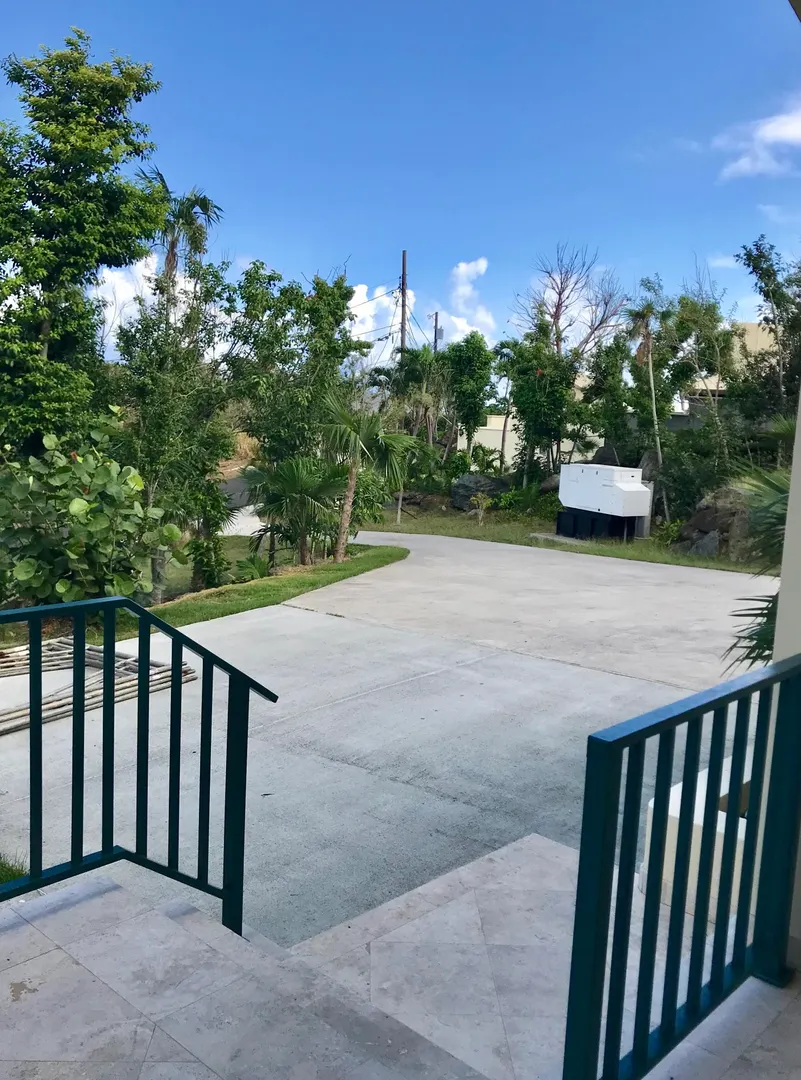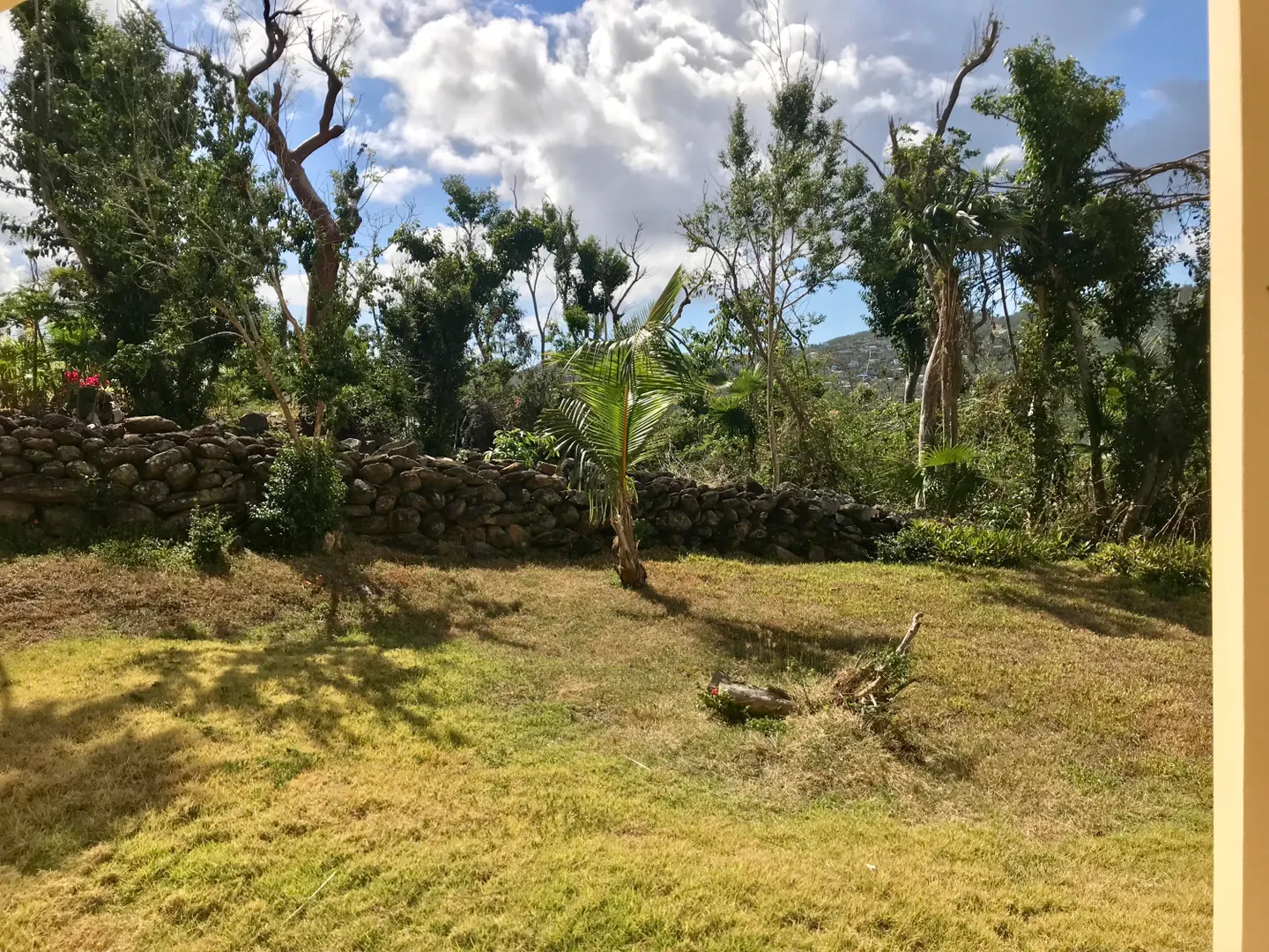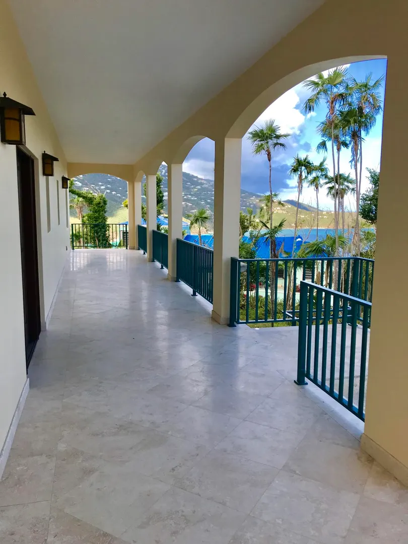Very large (approx 2,000 sf) with covered porch running the length of the Apt. High ceilings, cool, views of outer Magens Bay and nice green space - Large laundry room, sep dining area - both bedrooms have AC. Lots of storage. Generator. This is the downstairs Apt. w 2 designated parking spots. House is on a cul de sac w gate at the entrance to subdivision. Very cool and private. No pets please. Landlord bills for WAPA- Gas hot water heater and stove. Generator is shared w upstairs.