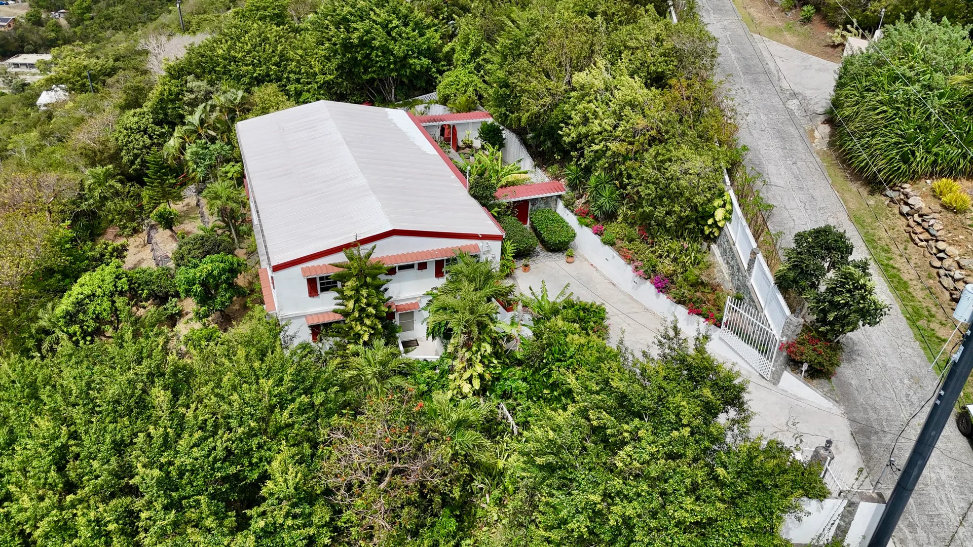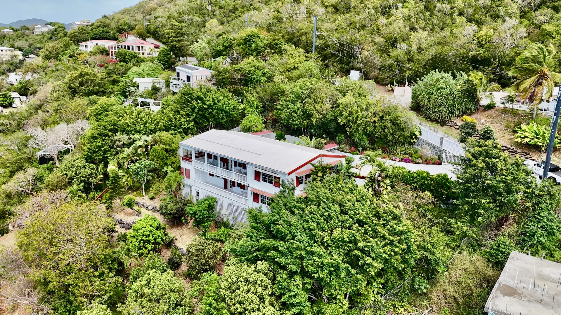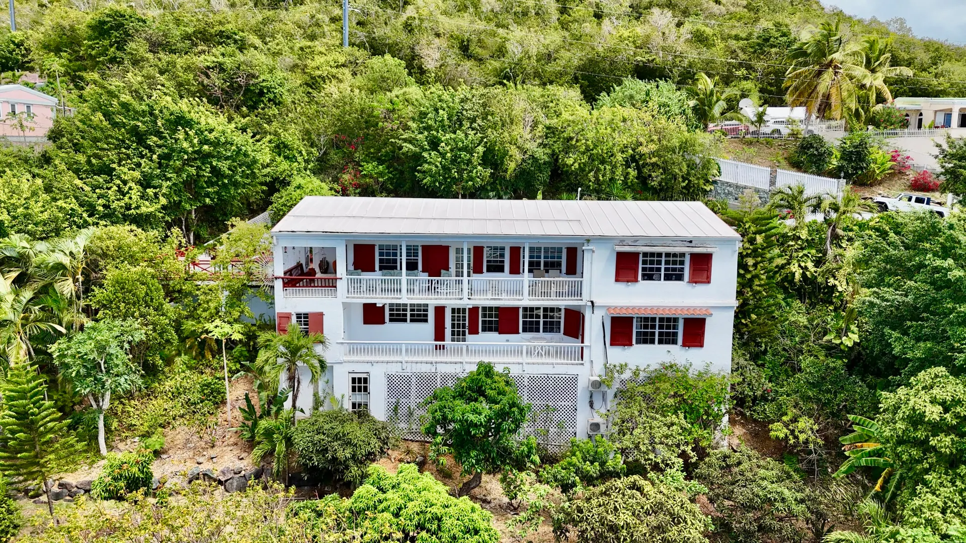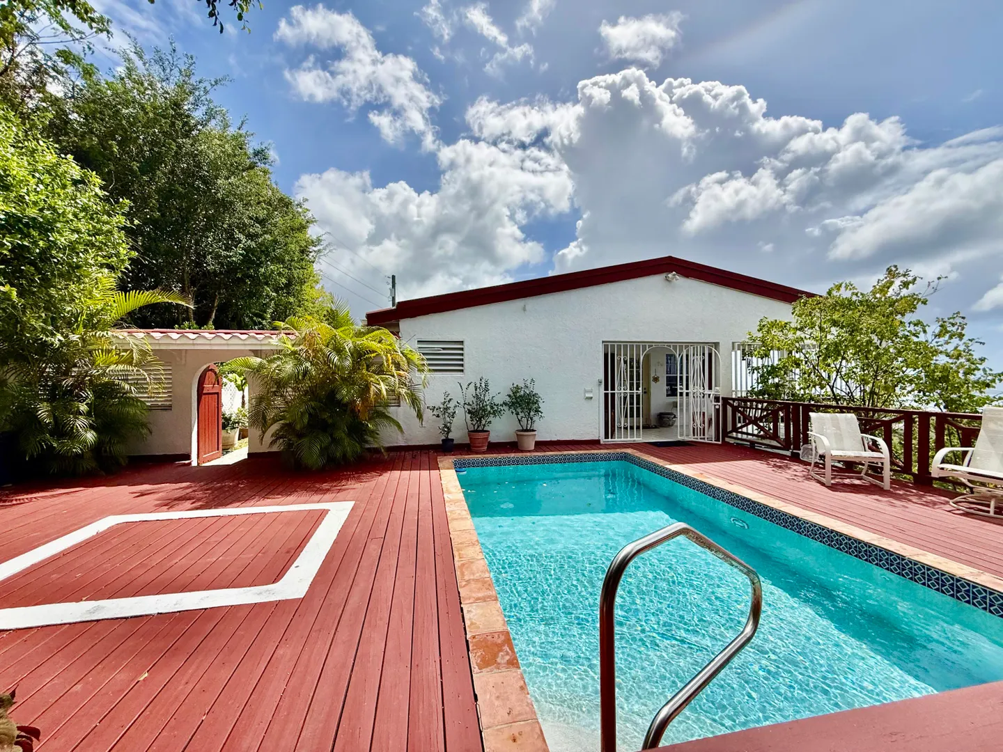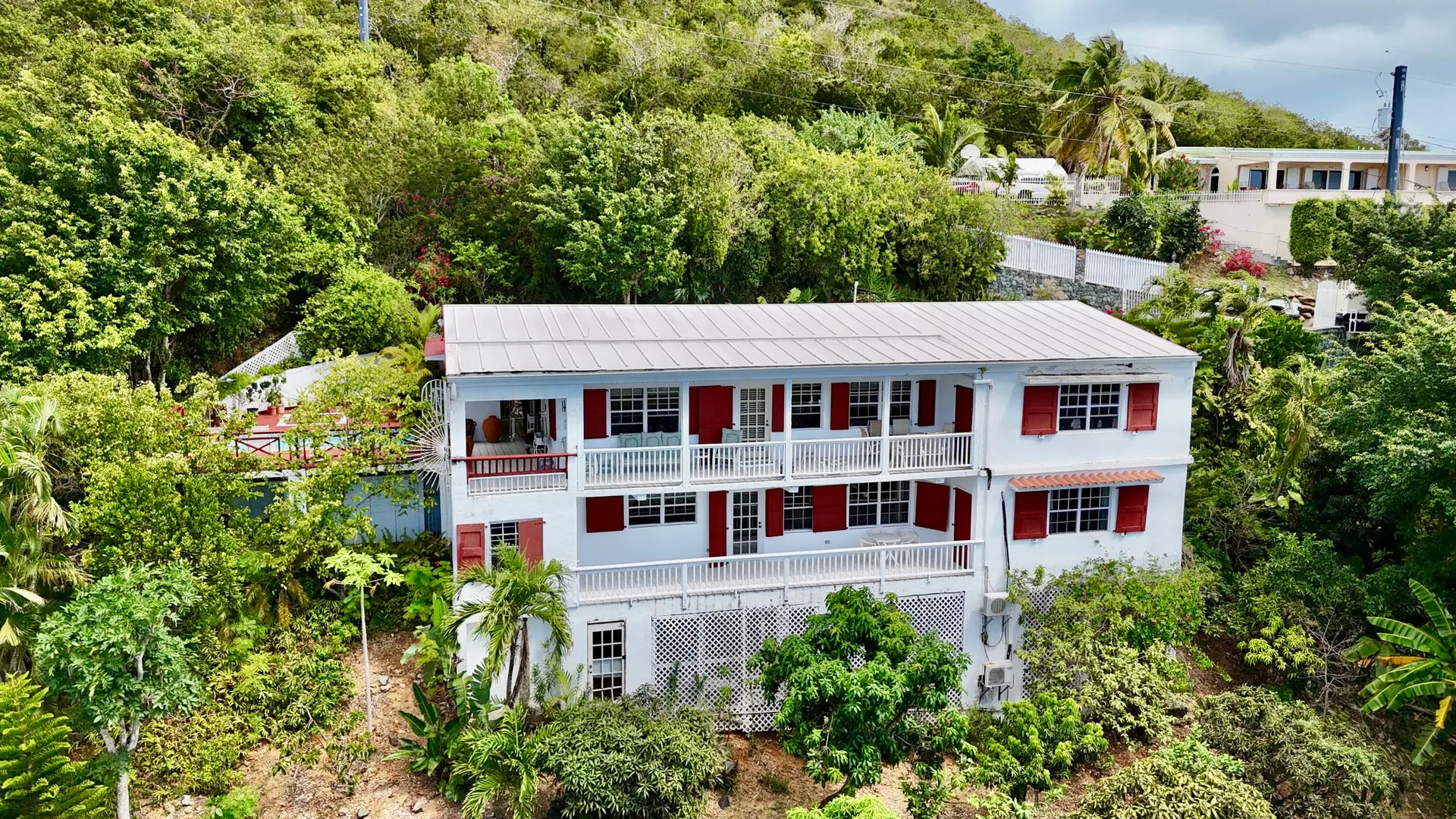 Beautiful Frenchman's Bay pool home with gated driveway, formal stone path garden entrance, spacious deck around the pool for entertaining, den/office, wrap around covered gallery, large apartment, generator, 5000 gal grey water cistern, lovely southwest to west water views, plenty of flex space below for storage or any usage, fruit trees galore including guava, avocado, mango, lemon, bay leaf, sugar apple, soursop and more.