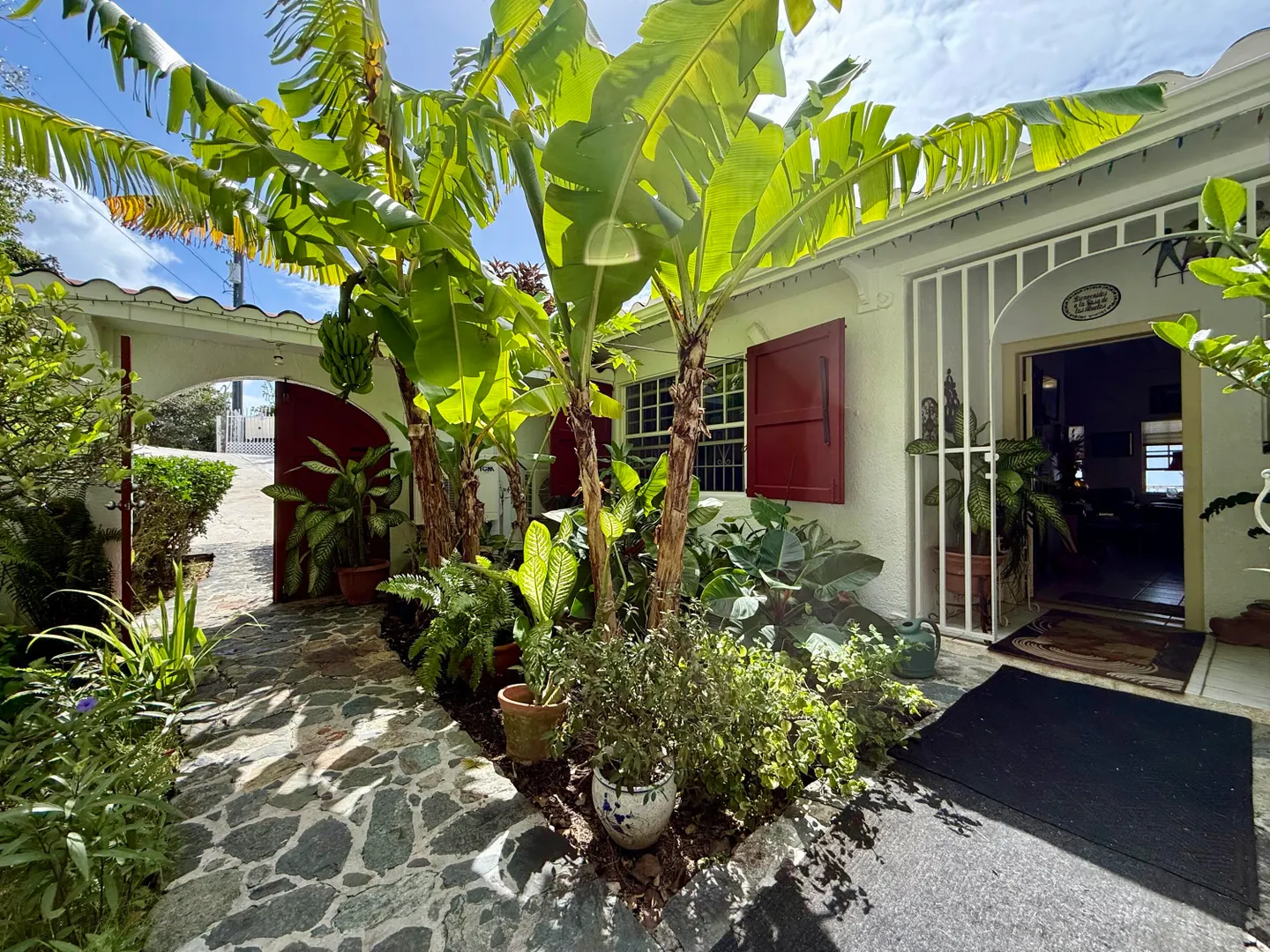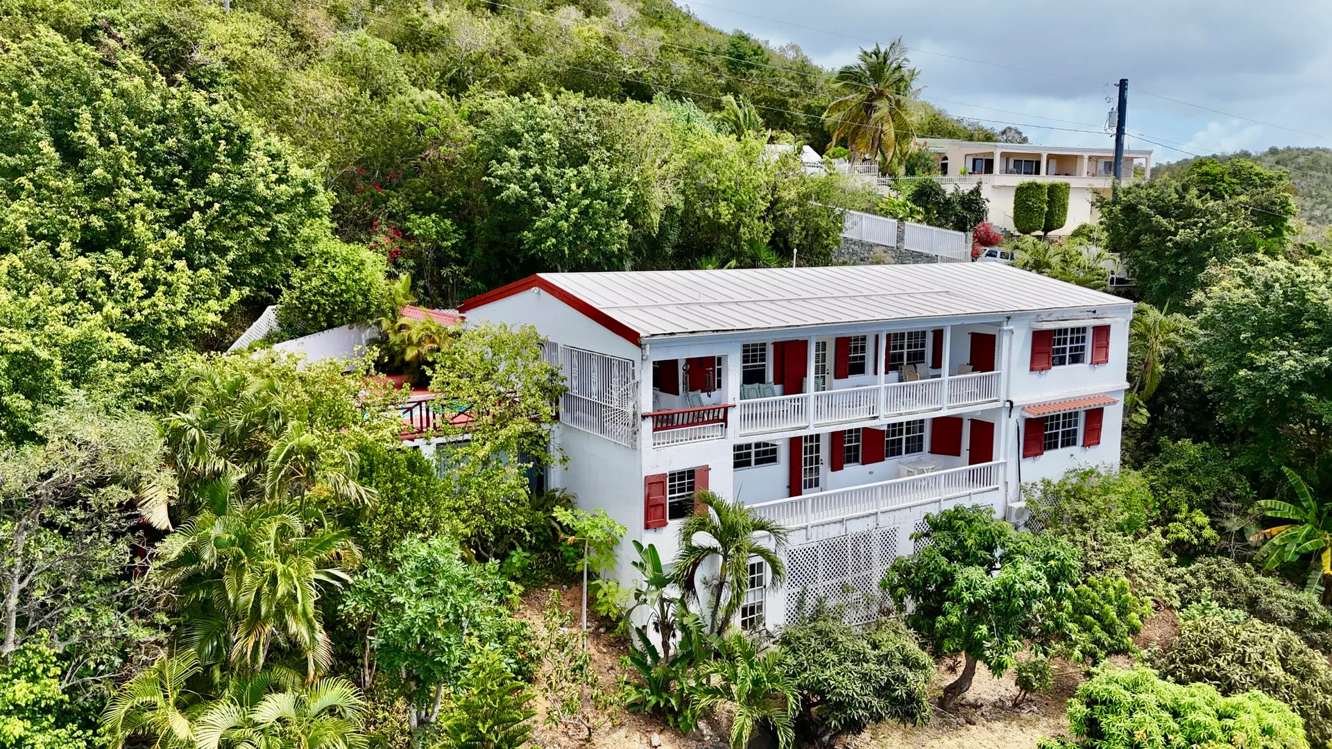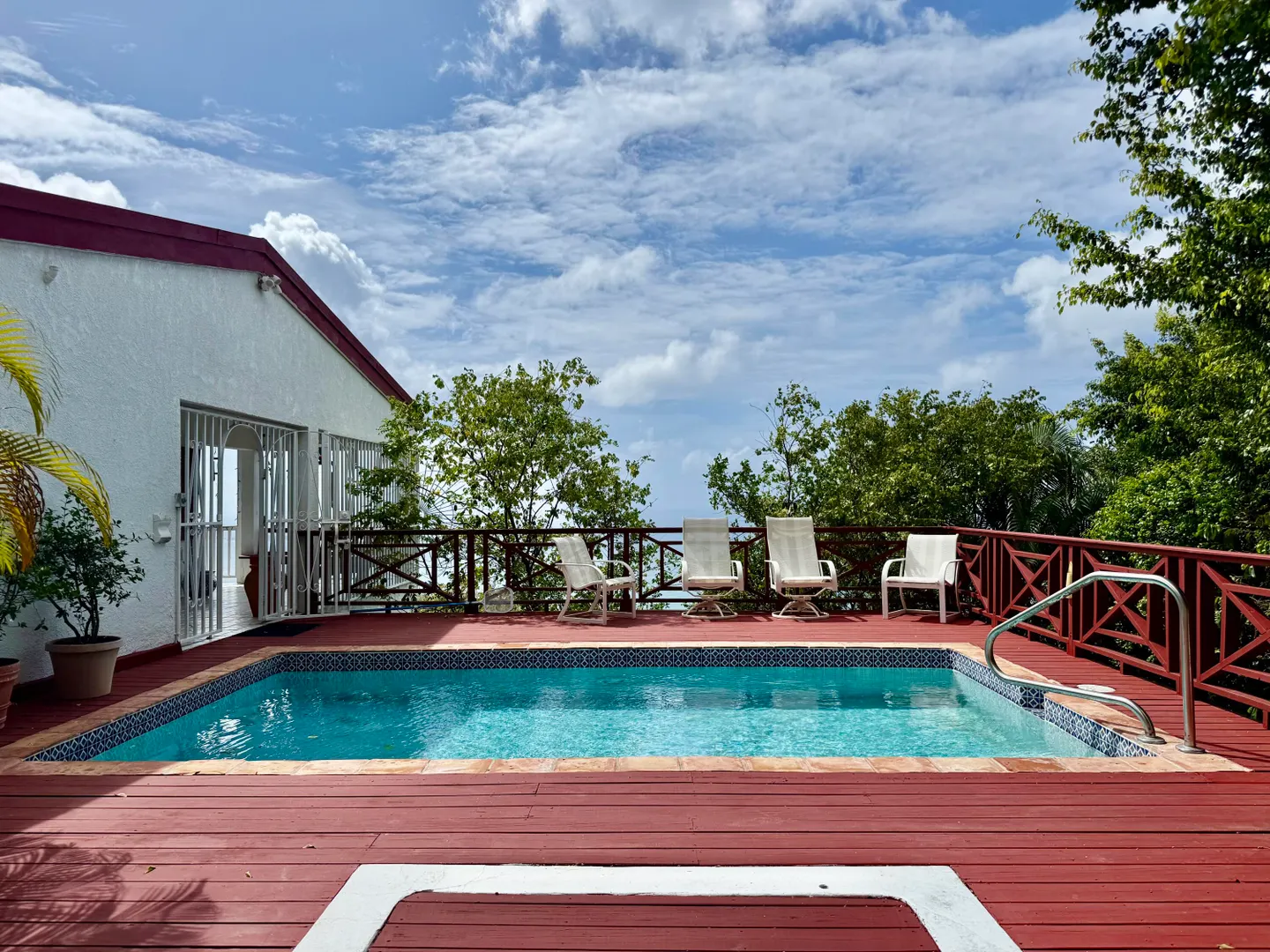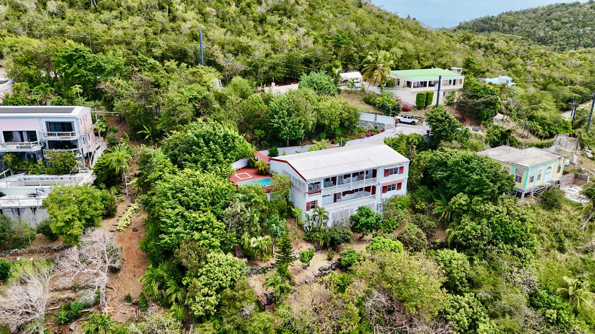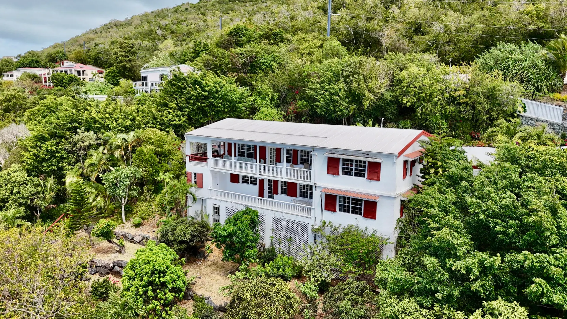 Beautiful Frenchman's Bay pool home with gated driveway, formal stone path garden entrance, spacious deck around the pool for entertaining, den/office, wrap around covered gallery, large apartment, generator, 5000 gal grey water cistern, lovely southwest to west water views, plenty of flex space below for storage or any usage, fruit trees galore including guava, avocado, mango, lemon, bay leaf, sugar apple, soursop and more.
