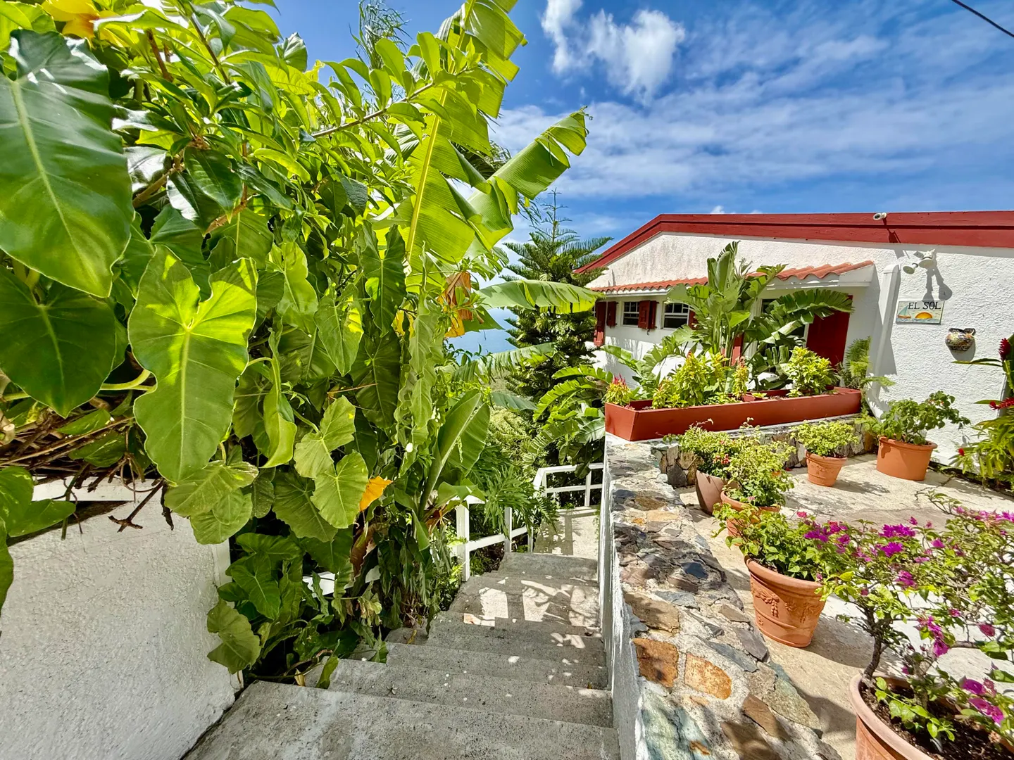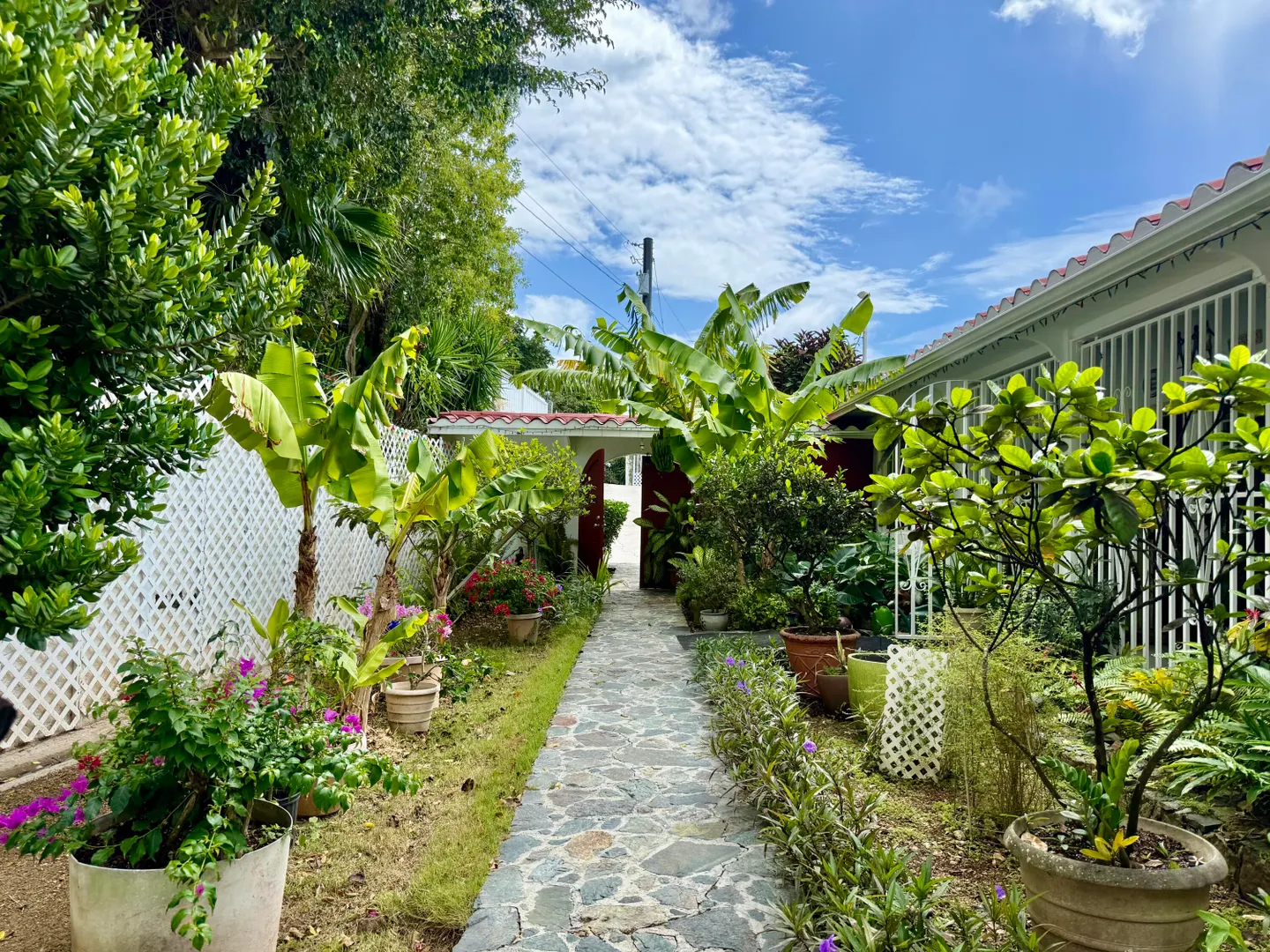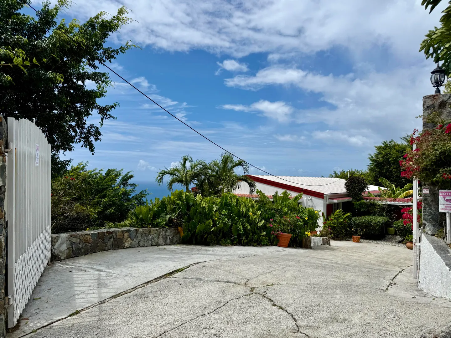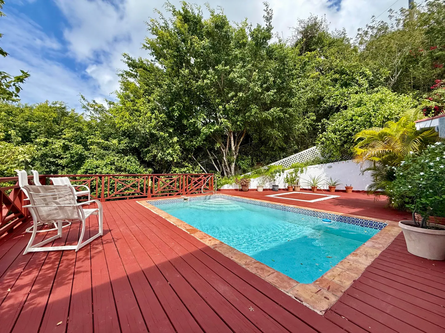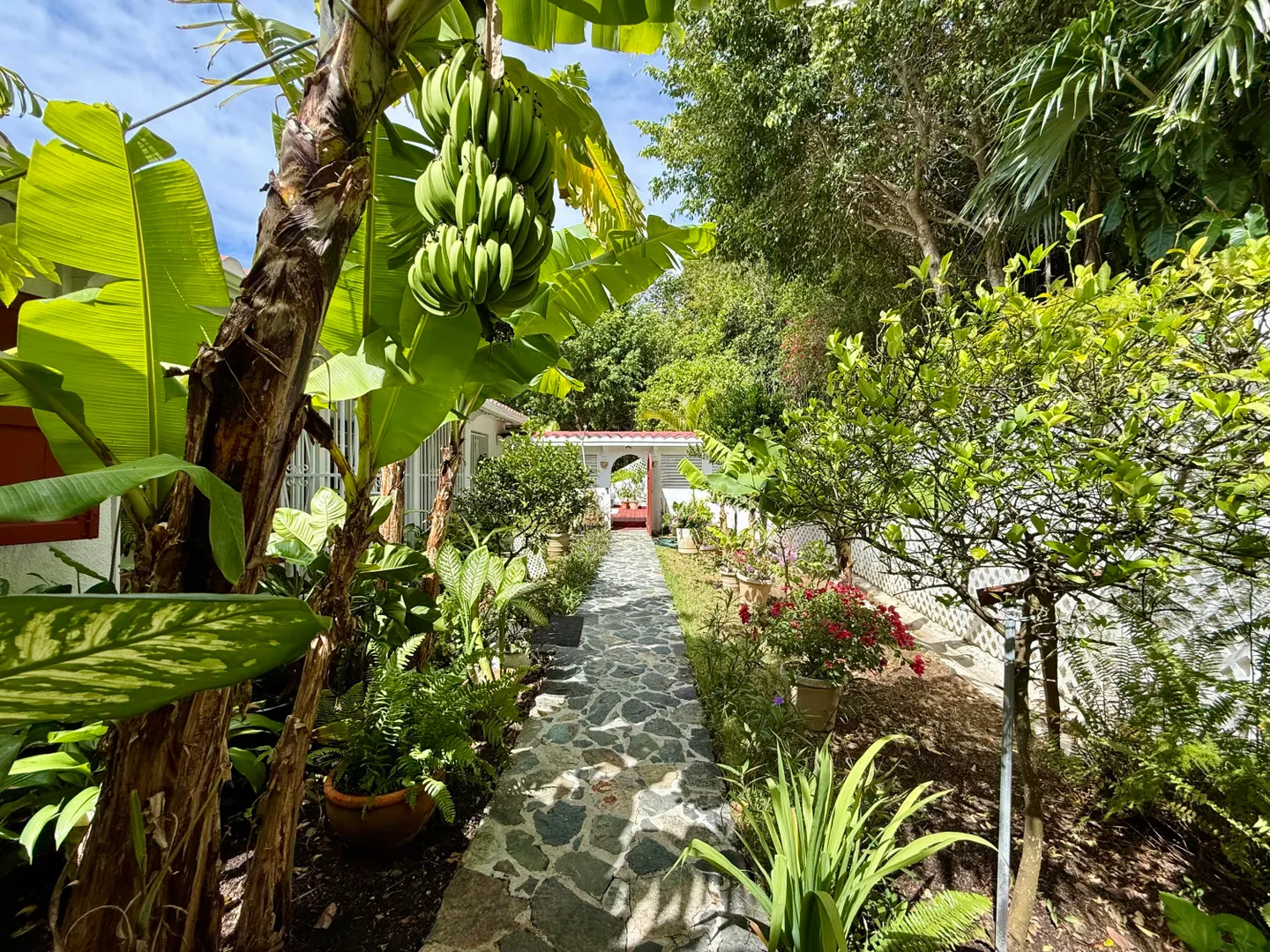 Beautiful Frenchman's Bay pool home with gated driveway, formal stone path garden entrance, spacious deck around the pool for entertaining, den/office, wrap around covered gallery, large apartment, generator, 5000 gal grey water cistern, lovely southwest to west water views, plenty of flex space below for storage or any usage, fruit trees galore including guava, avocado, mango, lemon, bay leaf, sugar apple, soursop and more.