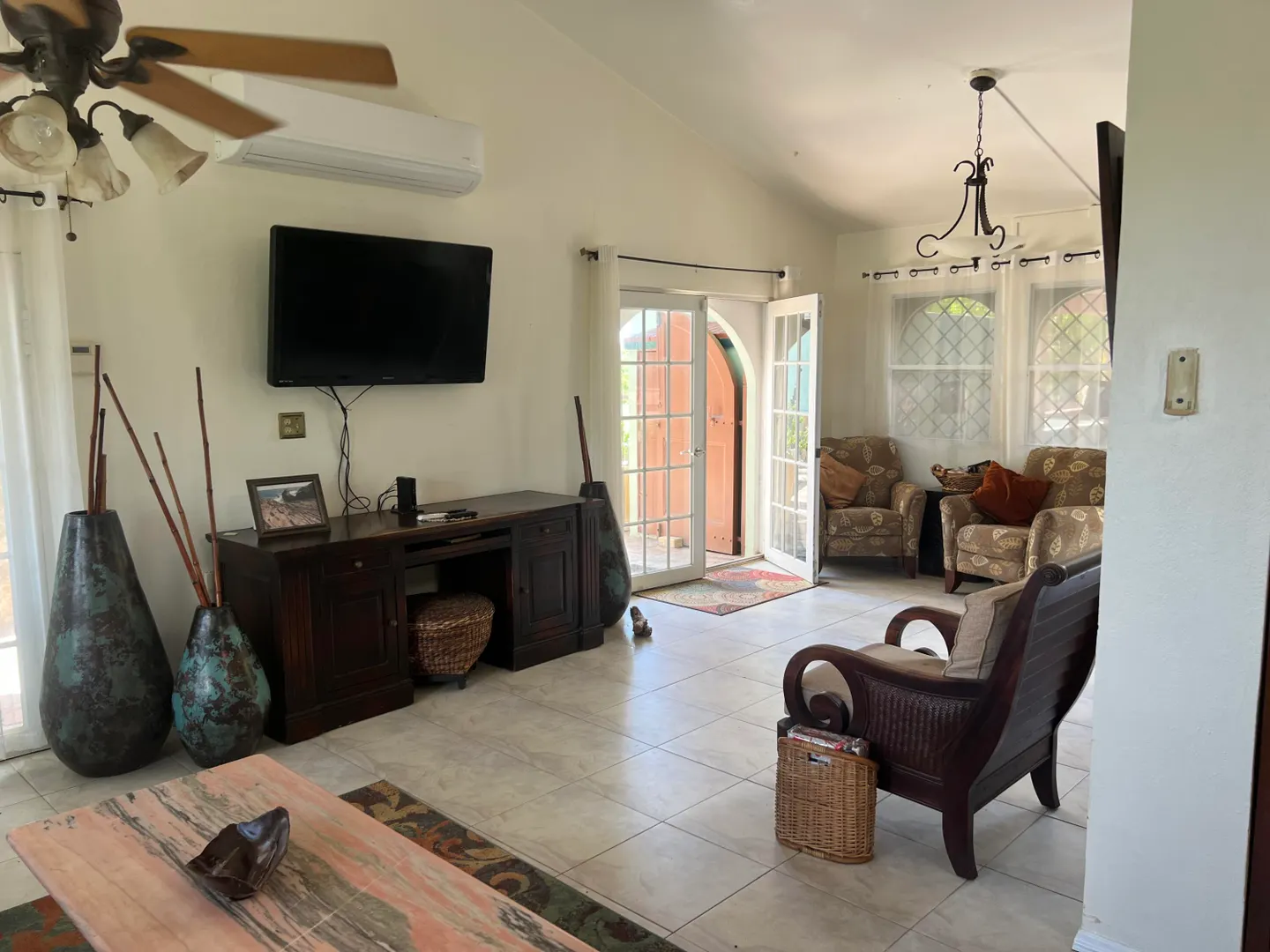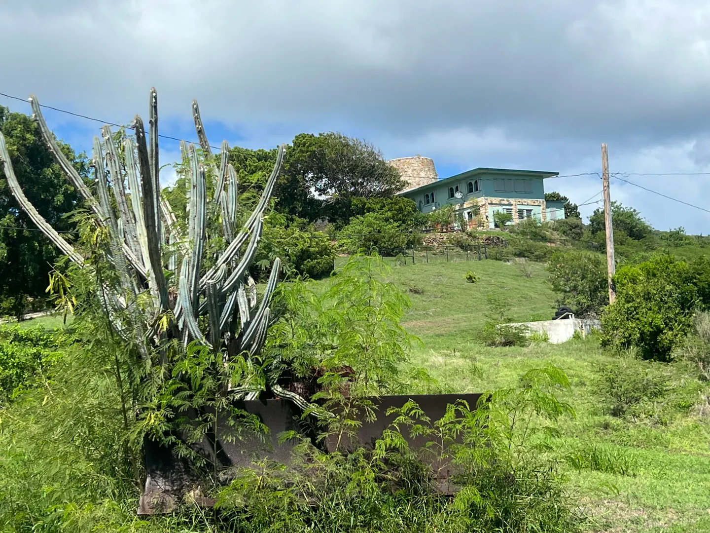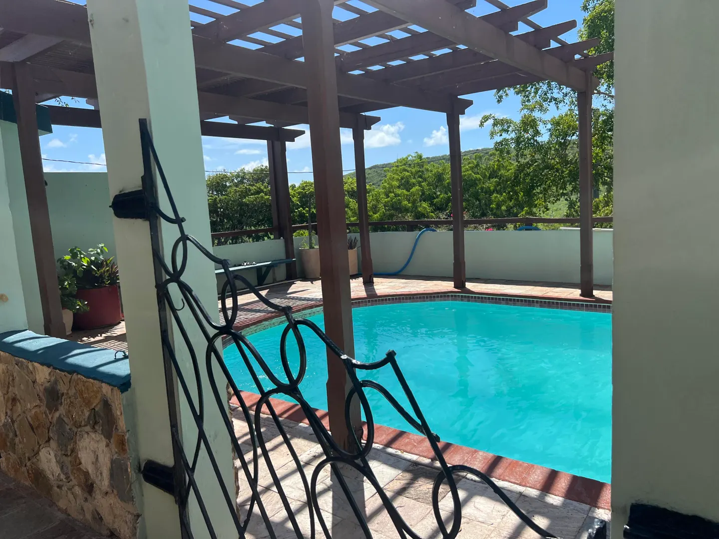 A Historic Sugar Mill is the stunning focal point of this unique 4 bedroom 3 1/2 bath residence located in a private gated enclave of homes just off of South Shore Road, a few minutes East of the East End Marine Park.Adjacent to the inviting freshwater swimming pool, the Mill's interior space is a cool, comfy spot for relaxing out of the hot sun after a dip or completing your laps. Living Area is divided into two sections on either side...Kitchen, living, dining, two bedrooms, full bath plus half bath are on the main side where the front entrance is; three bedrooms, two full baths and a family room are on the Seaside (second side). Property is pet-friendly with two fenced acres, there's a huge automatic diesel generator, residence is offered furnished. Available now!