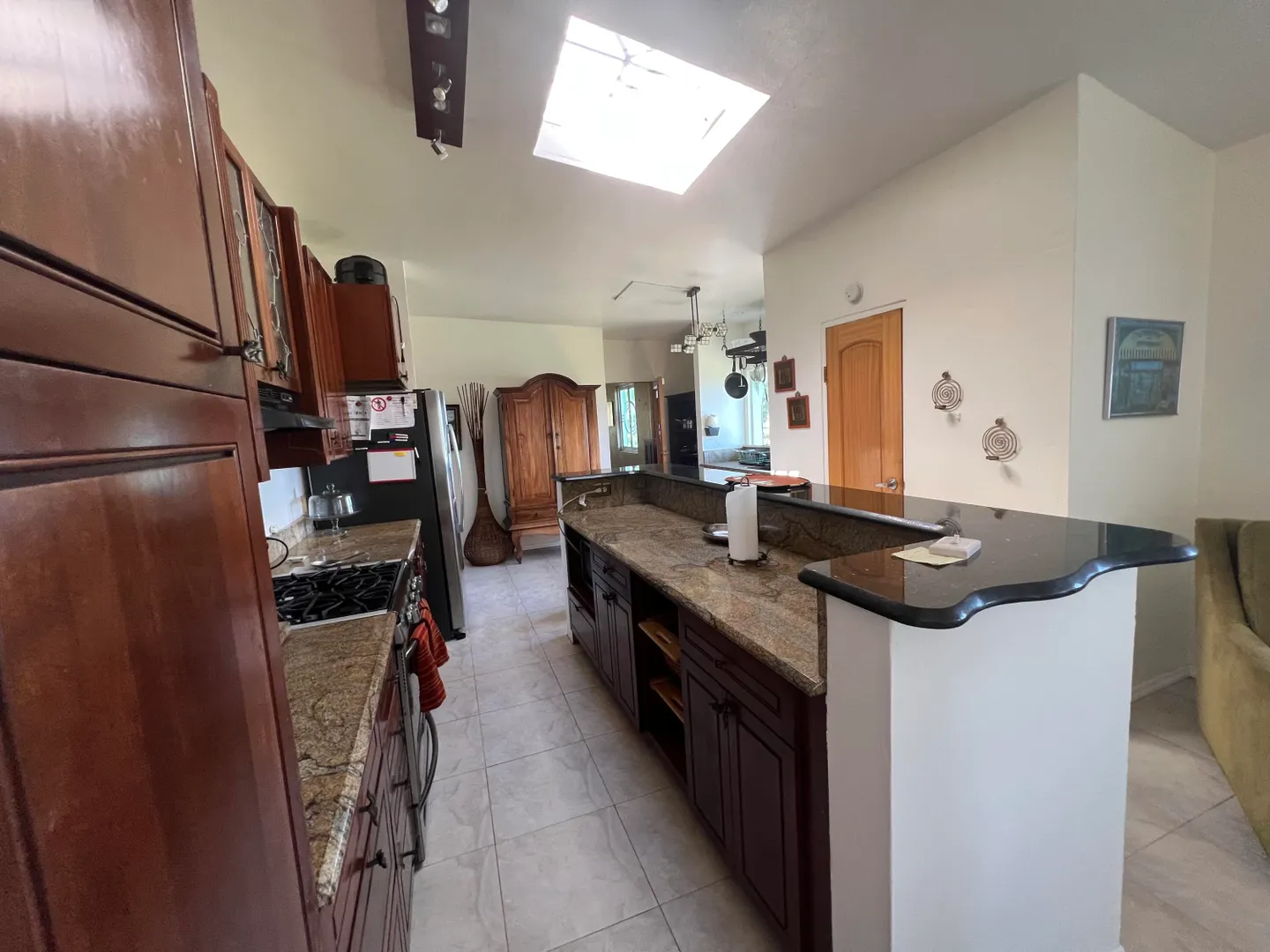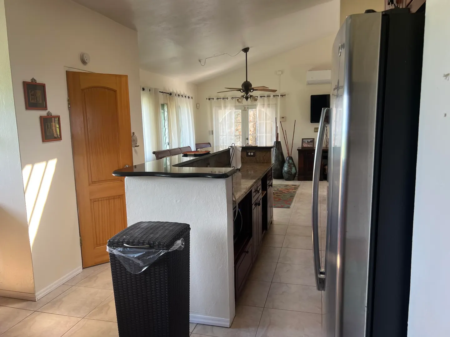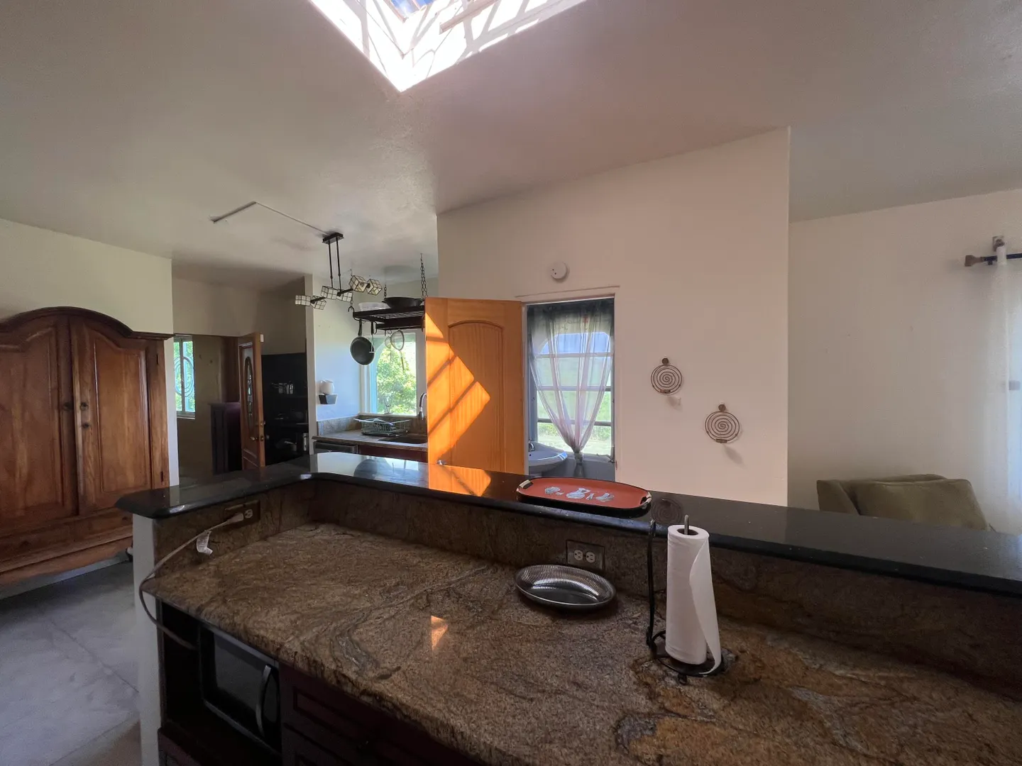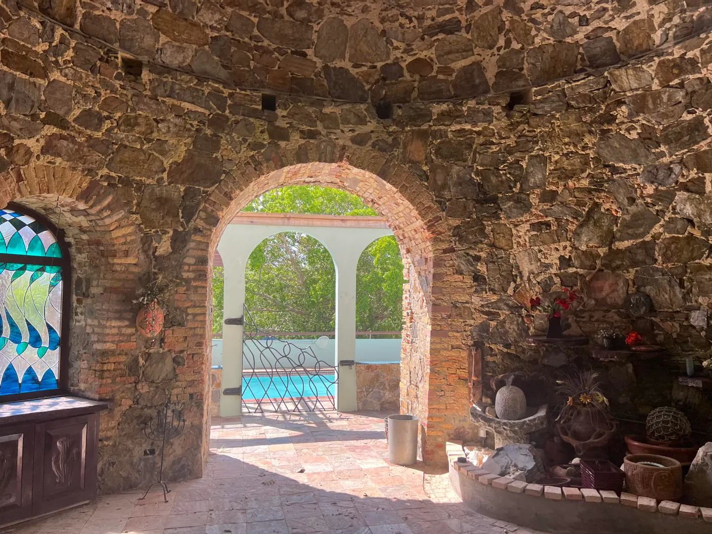 A Historic Sugar Mill is the stunning focal point of this unique 4 bedroom 3 1/2 bath residence located in a private gated enclave of homes just off of South Shore Road, a few minutes East of the East End Marine Park.Adjacent to the inviting freshwater swimming pool, the Mill's interior space is a cool, comfy spot for relaxing out of the hot sun after a dip or completing your laps. Living Area is divided into two sections on either side...Kitchen, living, dining, two bedrooms, full bath plus half bath are on the main side where the front entrance is; three bedrooms, two full baths and a family room are on the Seaside (second side). Property is pet-friendly with two fenced acres, there's a huge automatic diesel generator, residence is offered furnished. Available now!