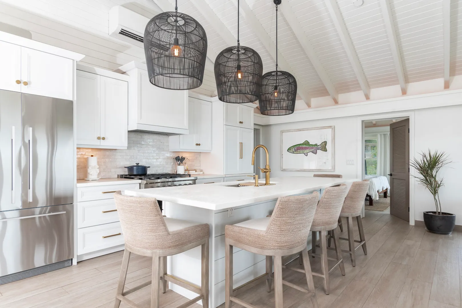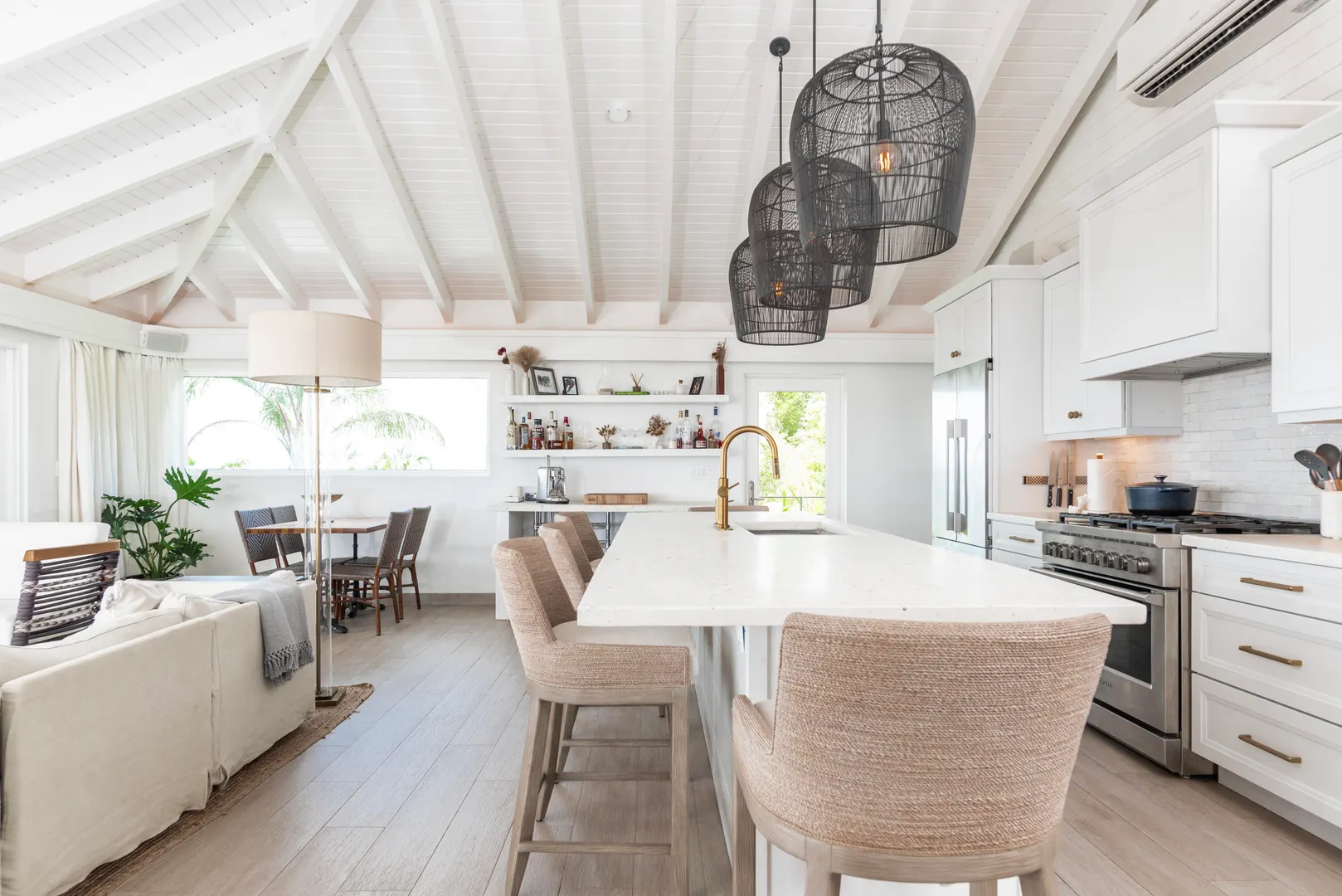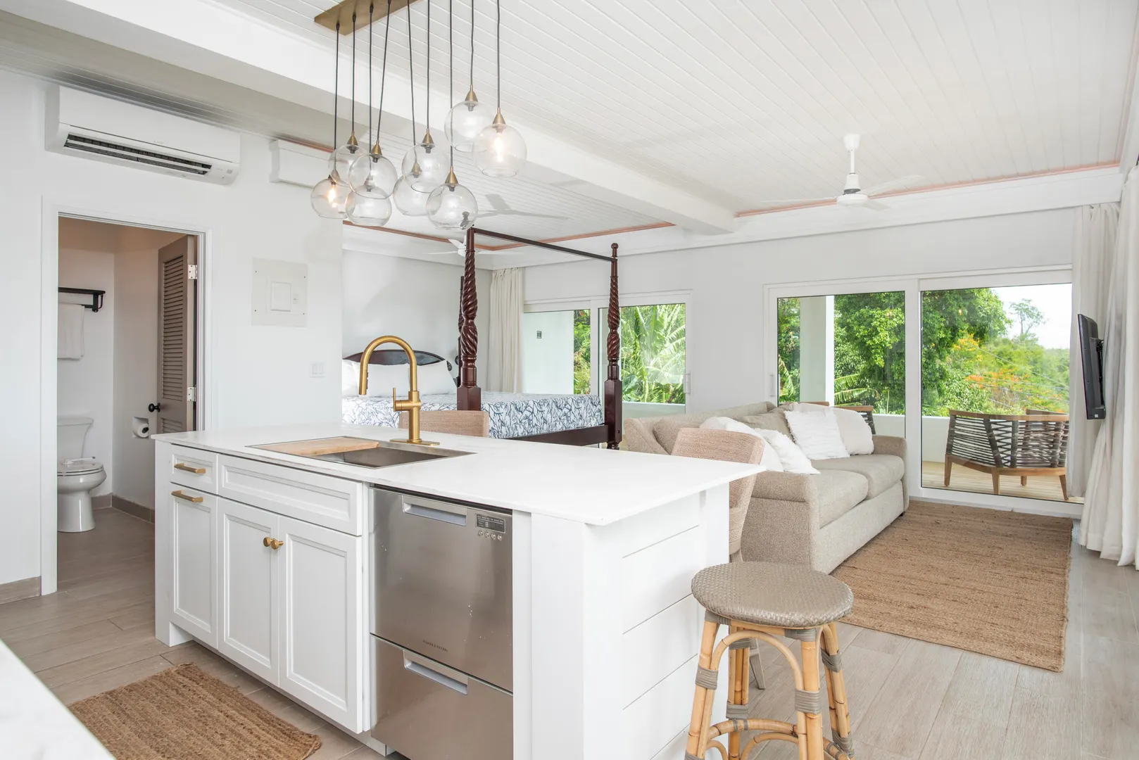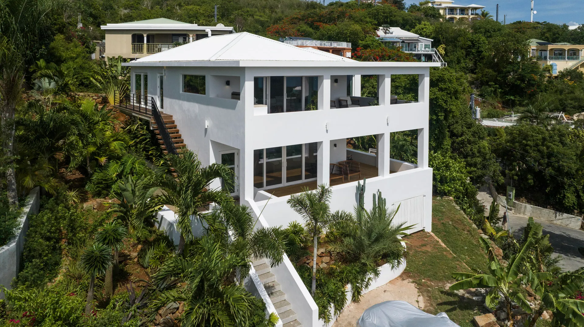 Escape to your refuge overlooking Cruz Bay with this newly reimagined villa offering an unparalleled blend of comfort, beauty, and location - making it the perfect retreat for those seeking a convenient yet tranquil Caribbean getaway. Boasting a flexible two-level design, the open plan two bedroom/two bath main floor can be enjoyed in tandem with or separate from the self-sufficient lower-level studio unit. Both levels offer classic wrap around porches framing panoramic western views featuring nightly sunsets over Pillsbury Sound, St. Thomas and numerous outlying cays.