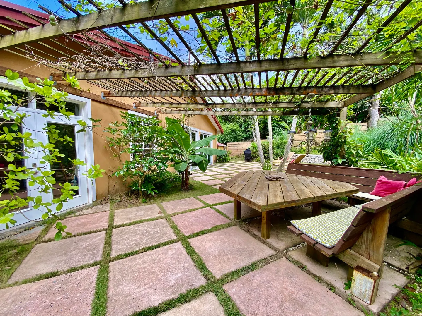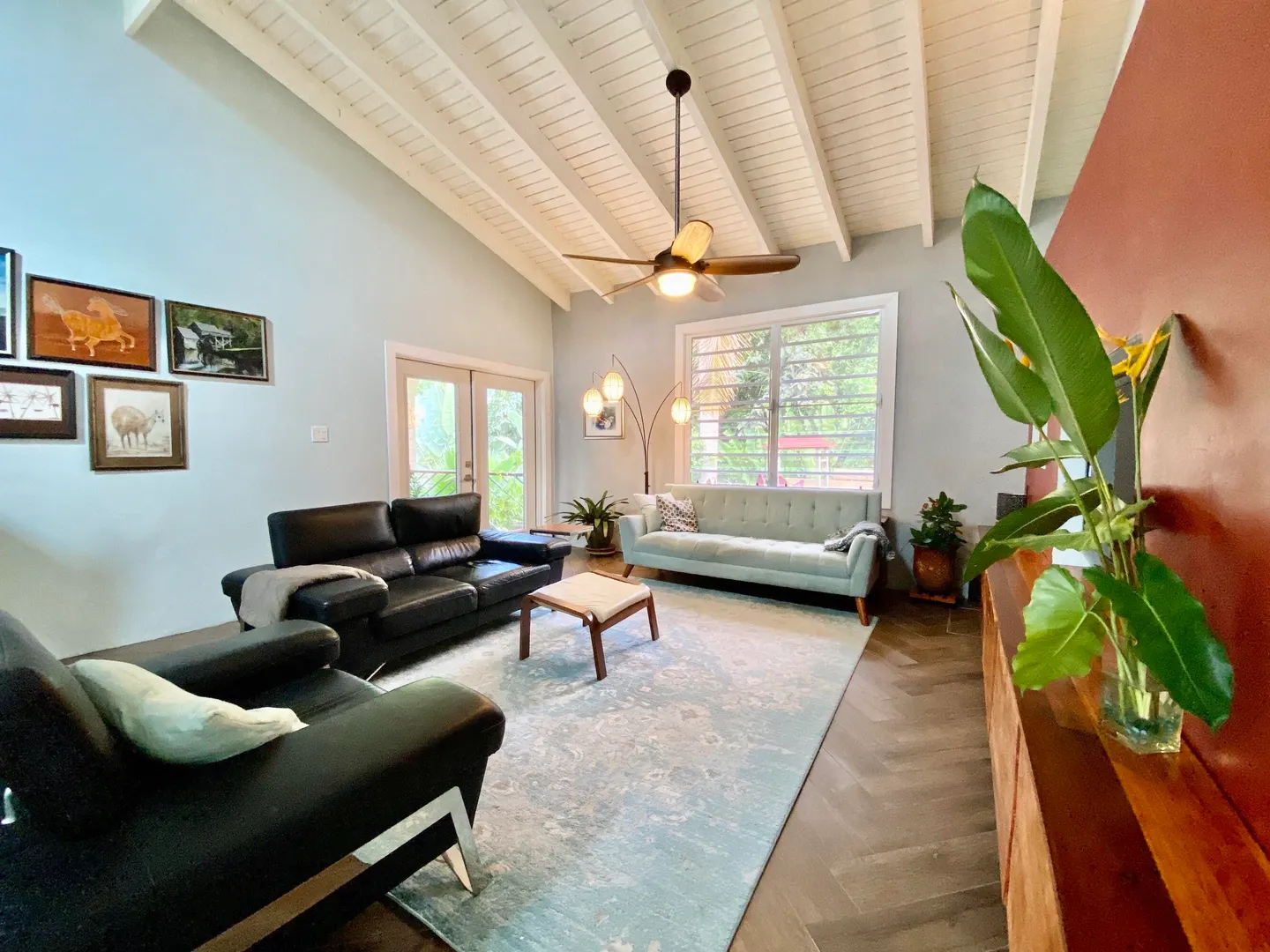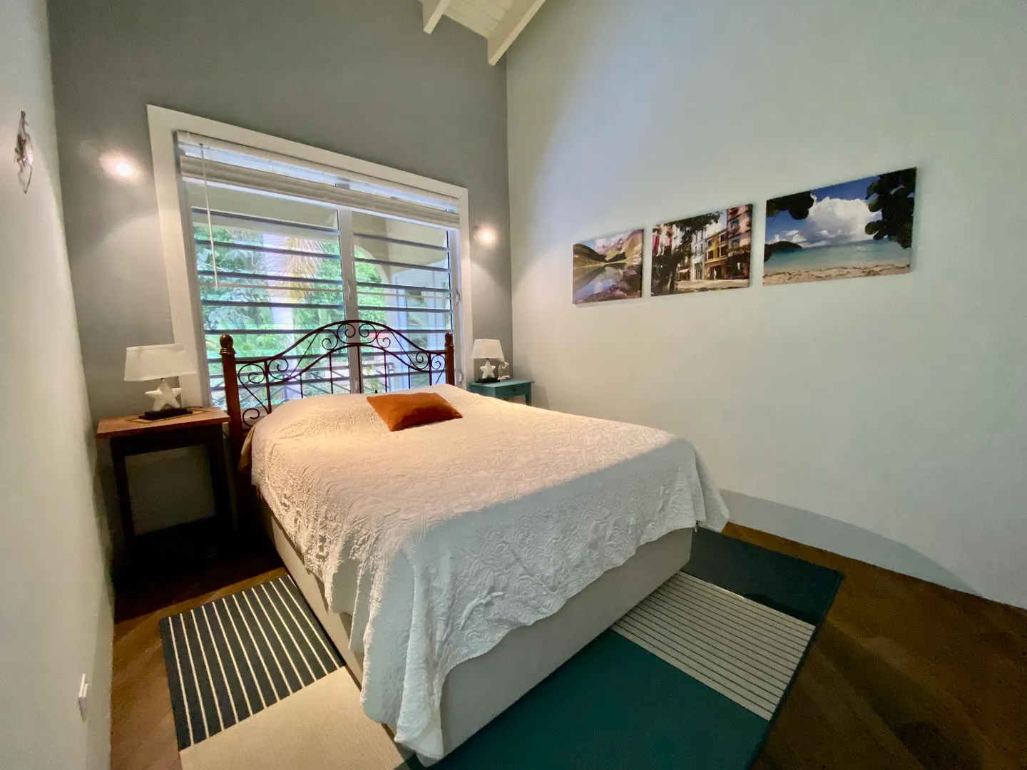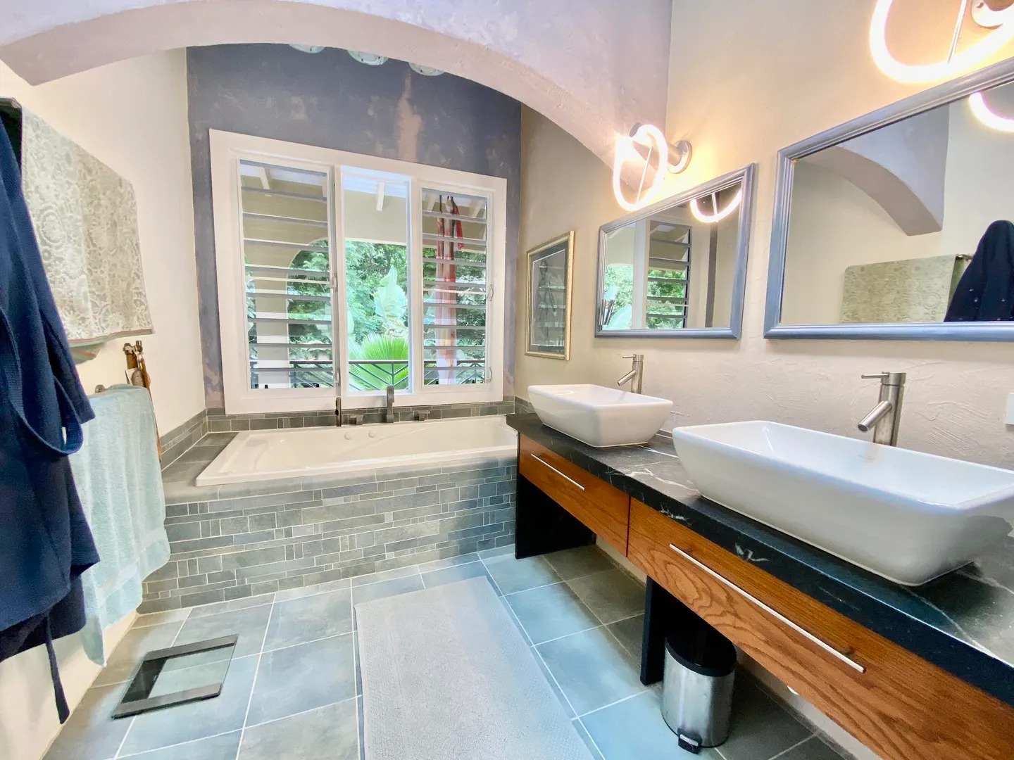 This house is located on the tropical, lush north side of St. Thomas surrounded by various fruit trees, flat green yard space and a serene outdoor dining area. This well-built concrete house offers 4 bedrooms and 3 bathrooms with an office upstairs and a mother-in-law suite below. There is also a 2 bedroom/1.5 bathroom apartment below for rental income or guests. The main house and the mother-in-law suite are connected to solar and has net metering. The house is set up to add more panels so you can include the apartment. Two 30K gallon cisterns hold more than enough water for a full house!