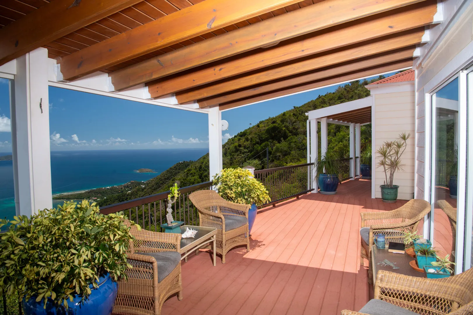 First time on the market! This private villa featuring famous amazing 50-mile views.High above Coral Bay on Bordeaux Mountain on over an acre of land, sits strongly constructed Skyflower named after the beautiful blue Plumbago which grows in profusion on the property. 2 BR/3 BA home is in the West Indian style with Great House and bedrooms in separate buildings. The panoramic views from all rooms are spectacular, overlooking the British Virgins, St Johns East End, and Coral Bay. The Great House provides dining and entertainment space and a separate, two story building houses two equal size bedrooms and baths.1500 square feet of deck unites the buildings into one indoor/outdoor living space.