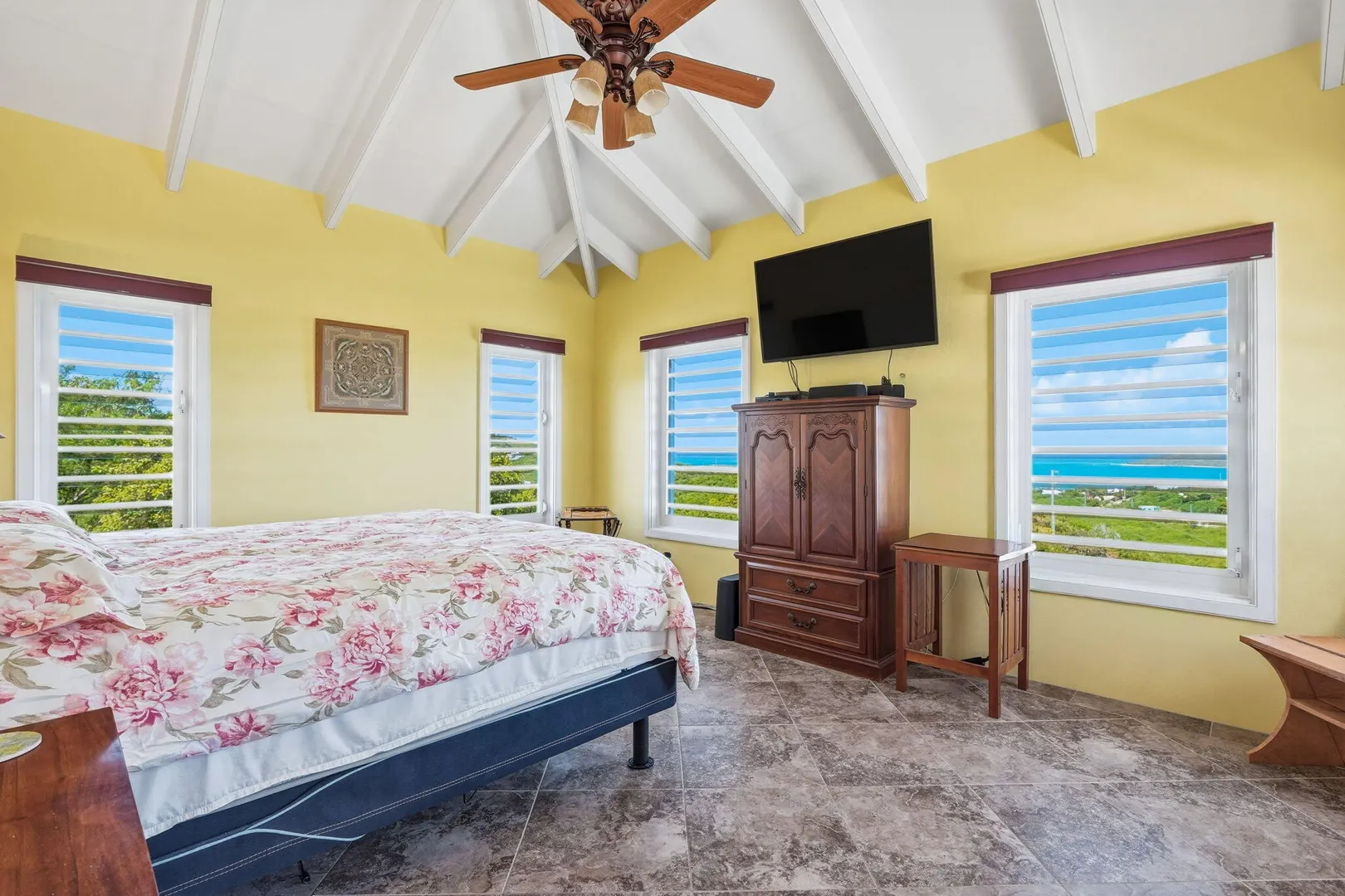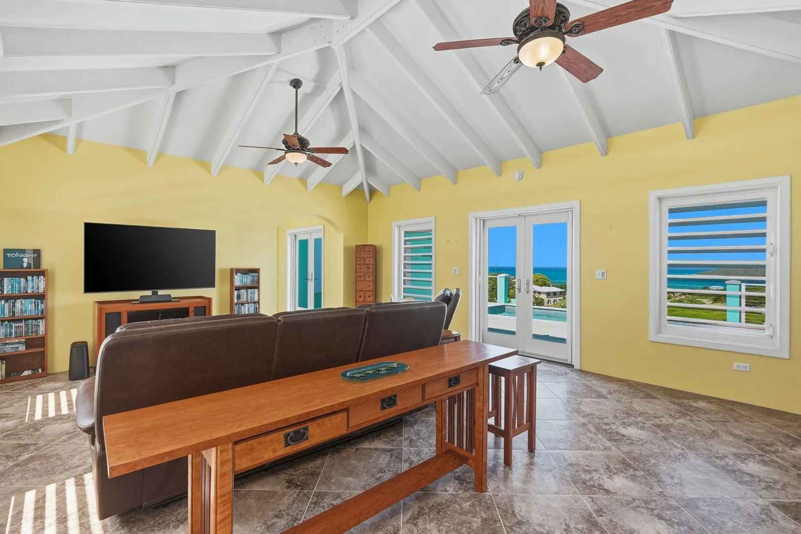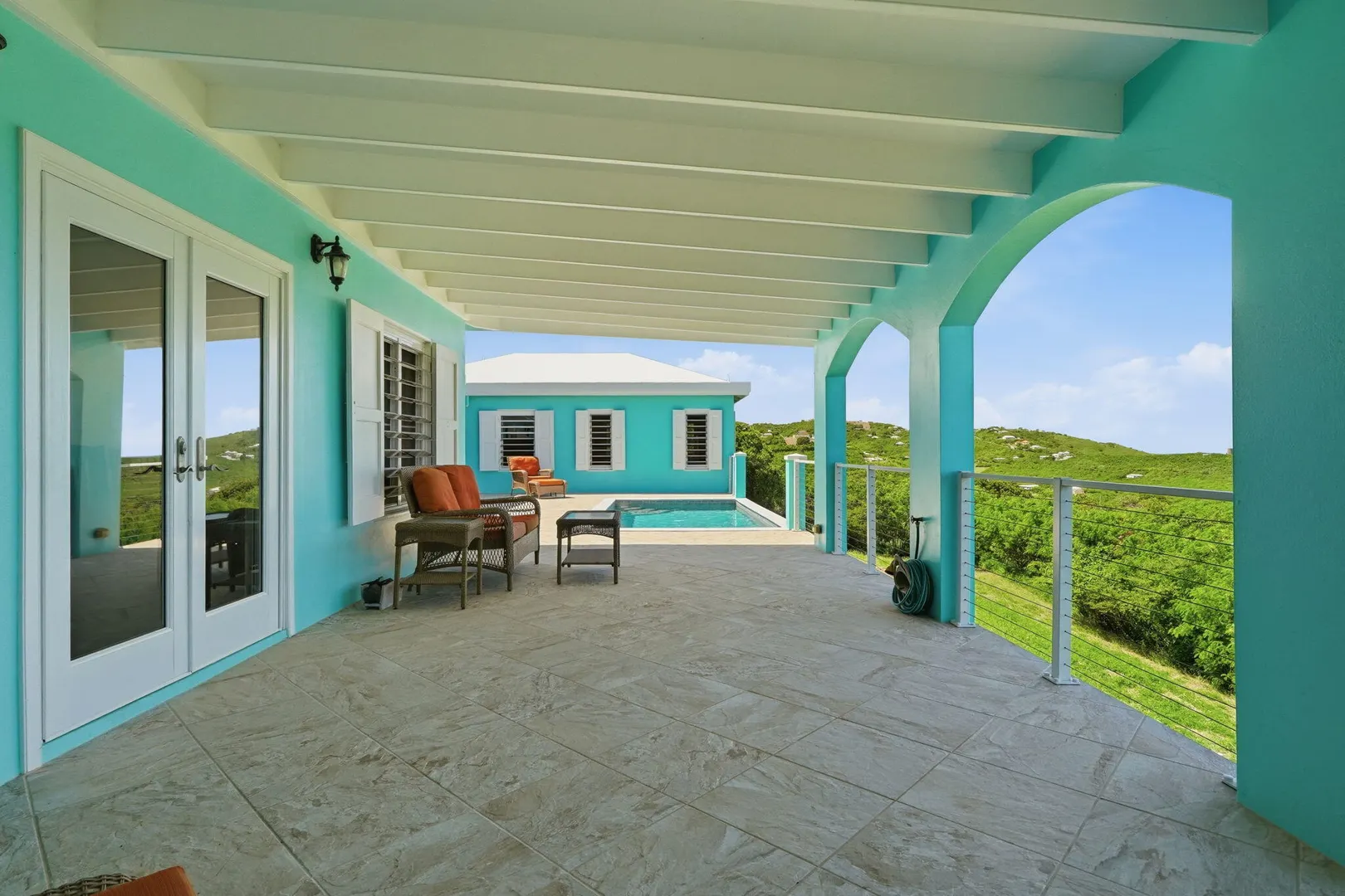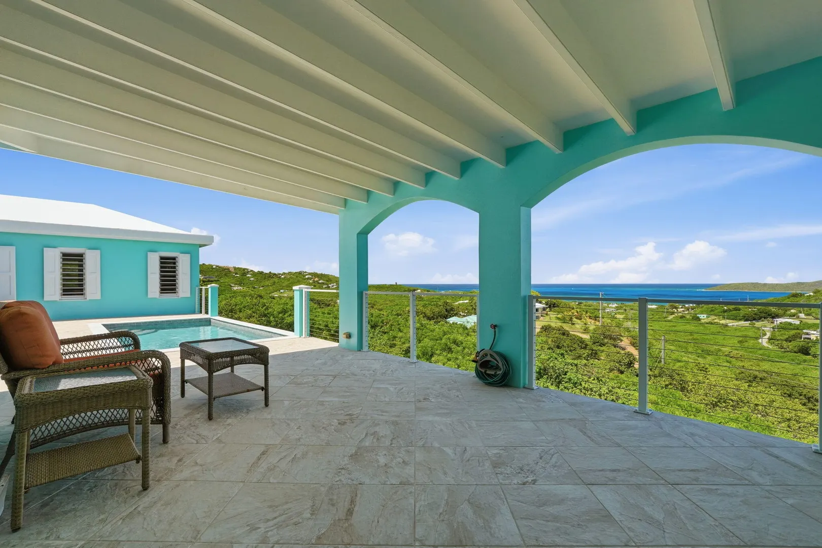 This East End villa has it all -- four bedrooms, four and a half baths, BIG Caribbean Sea views including Buck Island, the Reef Golf Course and St. Croix Yacht Club (The Teague Bay view). The sea view spans 330 degrees north-west to 90 degrees east. The villa has a sea-facing swimming pool, solar with net metering, expansive covered outdoor living space, an ideal layout for easy living and entertaining the Caribbean way, beautiful finishes throughout, a rare two-car garage, granite countertops and custom made solid mahogany cabinets in kitchen and primary bathroom. A sweeping deck spans the entire seaside elevation of the home, with one half shaded by a generous covered gallery for dining and lounging, and the other half sun-drenched for poolside enjoyment.High-impact, hurricane glass French doors with pocket screens open seamlessly from the main living areas to the covered patio and pool deck. Cathedral ceilings enhance the sense of volume and light, while Caribbean-style storm shutters add both charm and function.