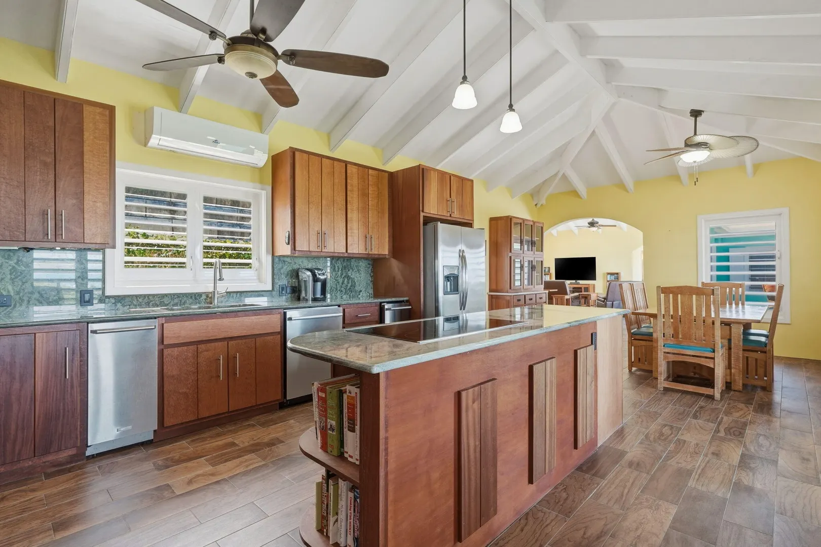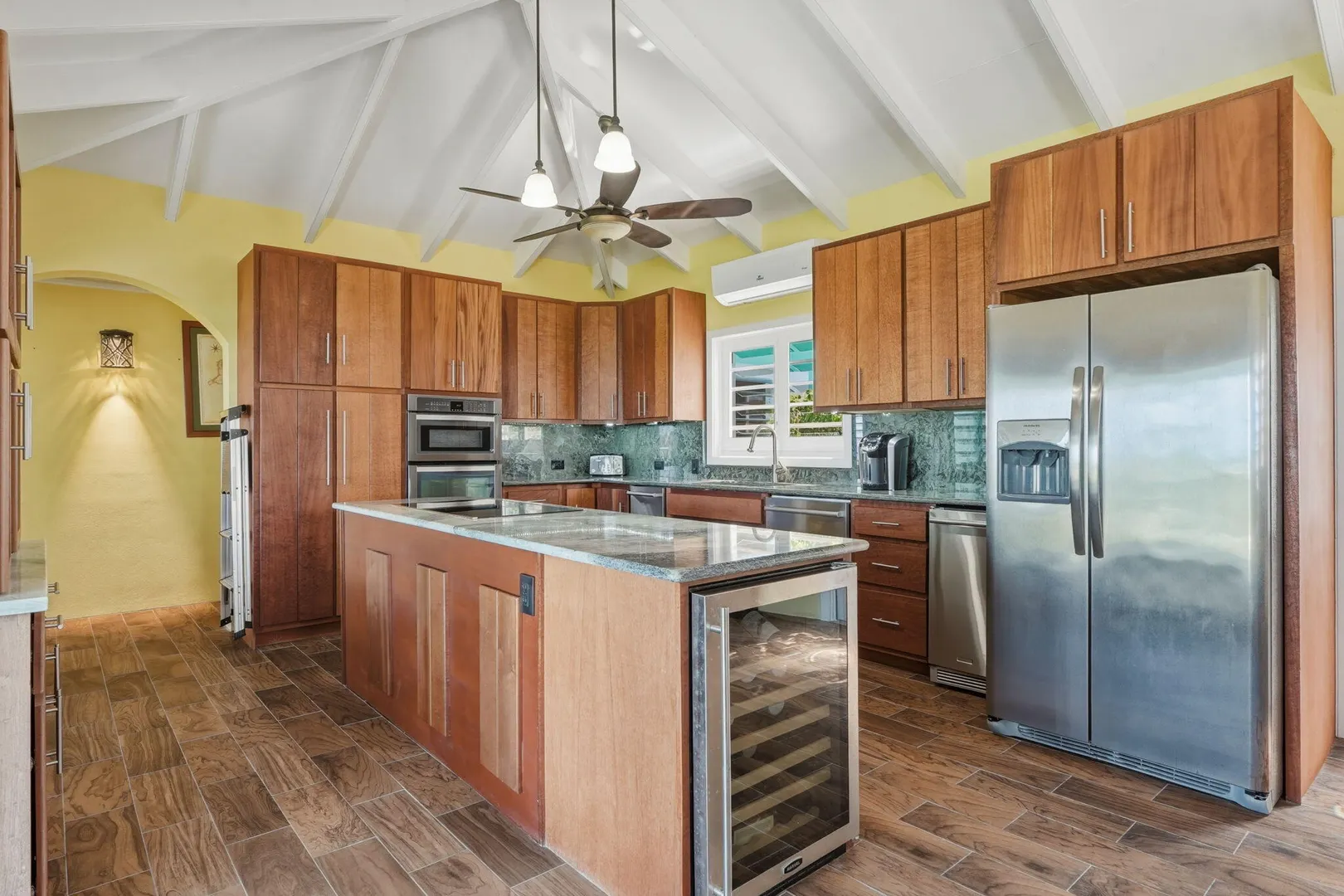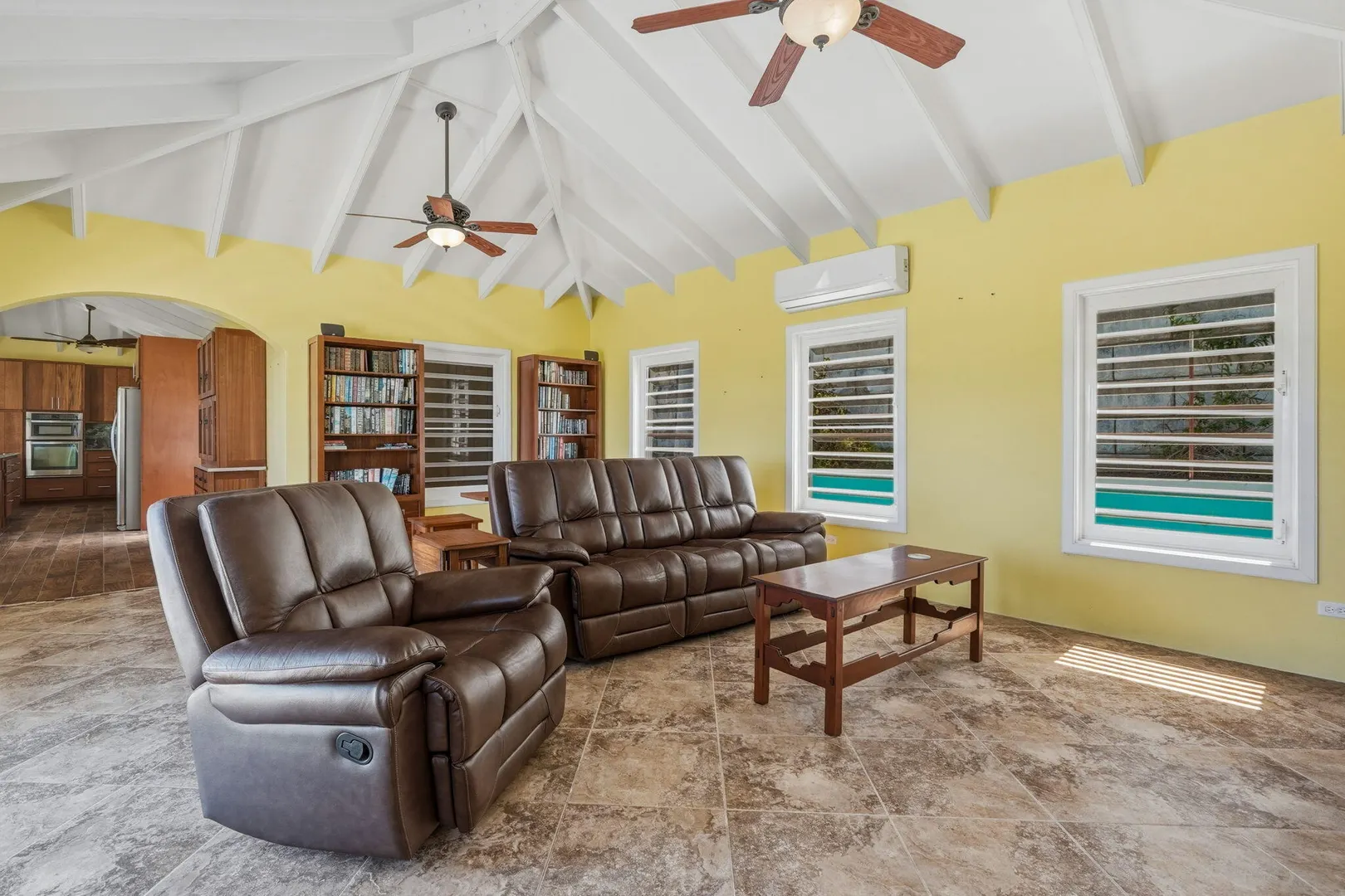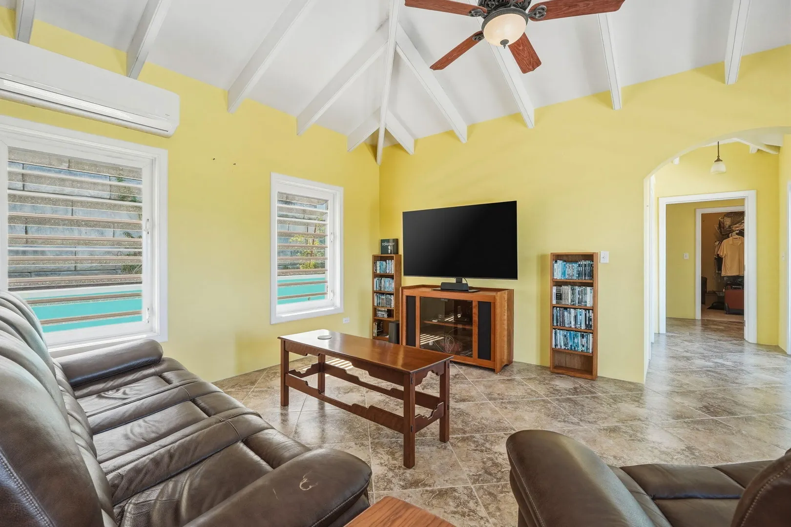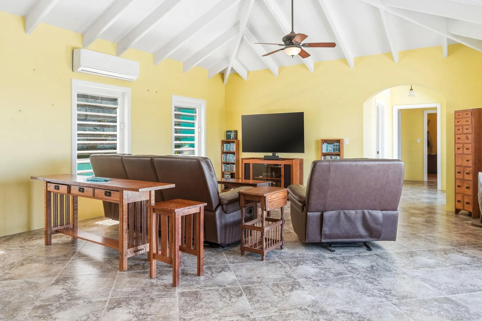 This East End villa has it all -- four bedrooms, four and a half baths, BIG Caribbean Sea views including Buck Island, the Reef Golf Course and St. Croix Yacht Club (The Teague Bay view). The sea view spans 330 degrees north-west to 90 degrees east. The villa has a sea-facing swimming pool, solar with net metering, expansive covered outdoor living space, an ideal layout for easy living and entertaining the Caribbean way, beautiful finishes throughout, a rare two-car garage, granite countertops and custom made solid mahogany cabinets in kitchen and primary bathroom. A sweeping deck spans the entire seaside elevation of the home, with one half shaded by a generous covered gallery for dining and lounging, and the other half sun-drenched for poolside enjoyment.High-impact, hurricane glass French doors with pocket screens open seamlessly from the main living areas to the covered patio and pool deck. Cathedral ceilings enhance the sense of volume and light, while Caribbean-style storm shutters add both charm and function.