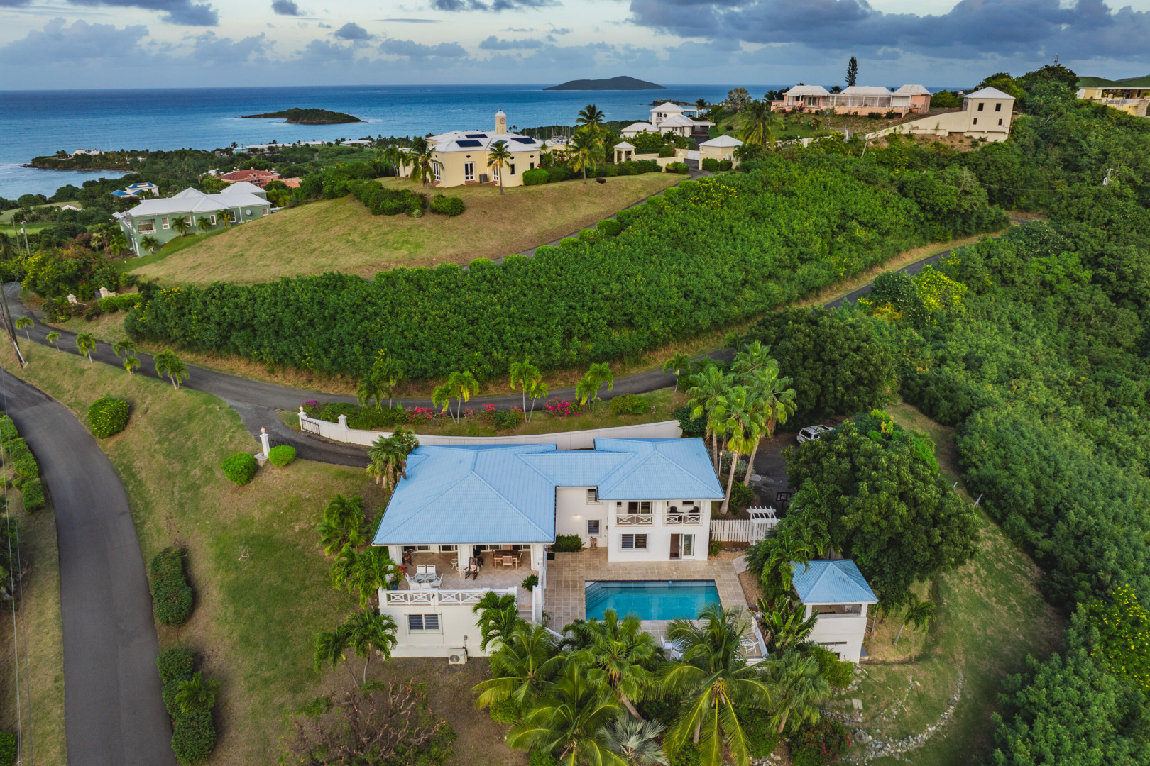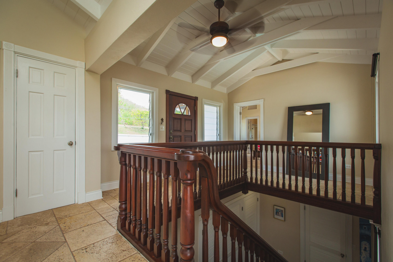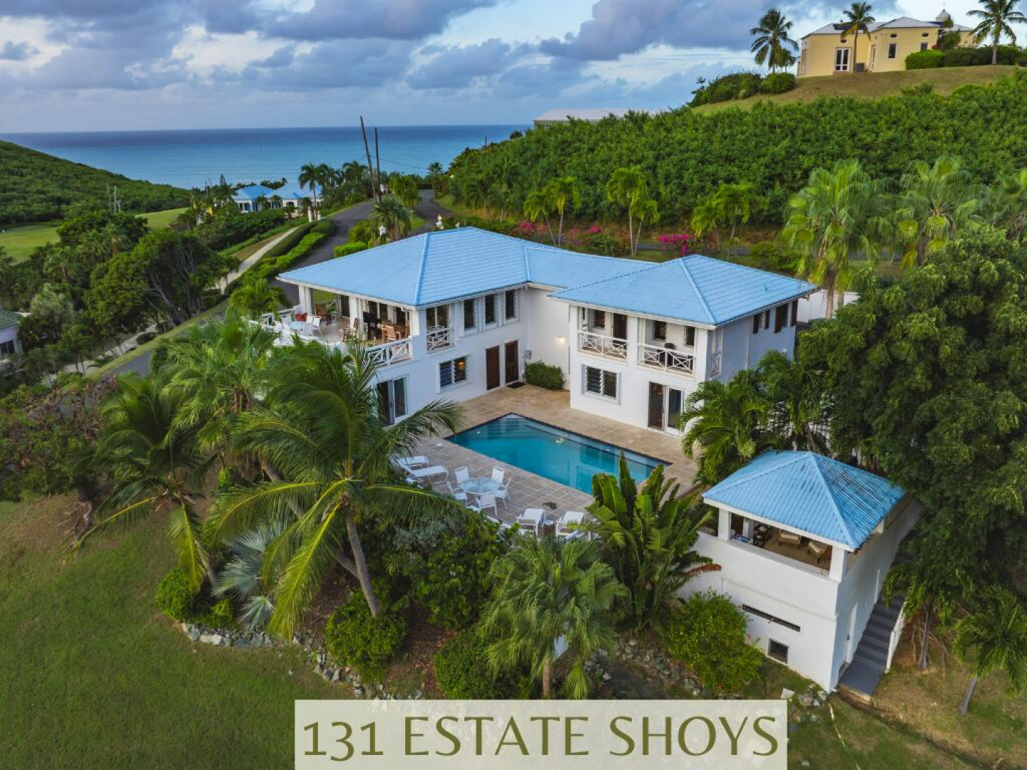 Welcome to 131 Estate Shoys, an extraordinary 4-bedroom, 3.5-bathroom villa with a private pool and cabana, nestled in a premier neighborhood on St. Croix's East End. Adjacent to the prestigious Buccaneer Golf & Beach Resort, this stunning hilltop retreat offers breathtaking dual views of the Caribbean Sea, stretching north to St. Thomas, St. John, and Tortola, and west to the picturesque Christiansted Harbor.Spanning a meticulously maintained 0.78-acre property, this villa showcases exceptional local mahogany woodwork, soaring beamed cathedral ceilings, and imported European tile floors. Designed with elegance and comfort in mind, the home features expansive entertaining spaces and luxurious finishes throughout. As you step through the front doorand into the foyer, you're greeted by a grand mahogany staircase that sets the tone for the home's timeless charm. The main level boasts a spacious living area, including a chef's kitchen with granite countertops, high-end appliances, and an open-concept layout that seamlessly connects to the dining and living spaces. The primary suite, also on the main level, features an ensuite bathroom with marble vanities and a private balcony for enjoying serene sea views. The lower level offers a versatile lounge with a wet bar, perfect for entertaining or serving as a guest suite with a full bathroom and direct access to the pool patio. Two additional guest bedrooms share a full bathroom and are complemented by a bonus living room or playroom with separate pool access. This home is equipped with air conditioning throughout, mahogany window shutters, accordion storm shutters and impact-resistant glass for added security and comfort. The property also includes a whole-house generator with a large diesel tank, 40,000-gallon cistern with a triple water filtration system, ample parking spaces and areas for sitting rooms, workspaces, art studios, and more. Whether hosting a gathering or enjoying tranquil island life, this villa is the perfect sanctuary with its large entertaining areas, custom finishes, and panoramic views which create the ideal setting for relaxation and celebration. Don't miss your chance to own this remarkable hilltop retreat and experience the vibrant culture and natural beauty that is St. Croix!