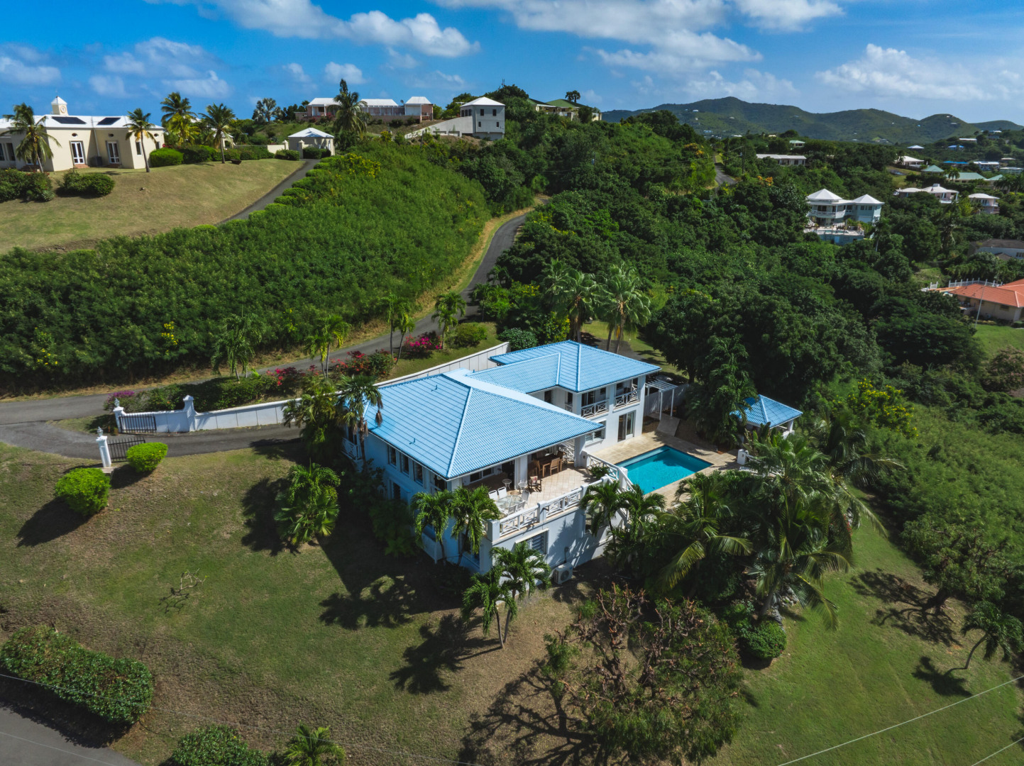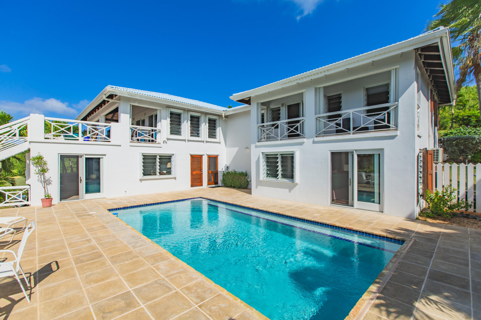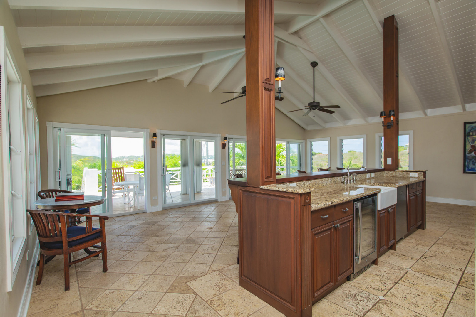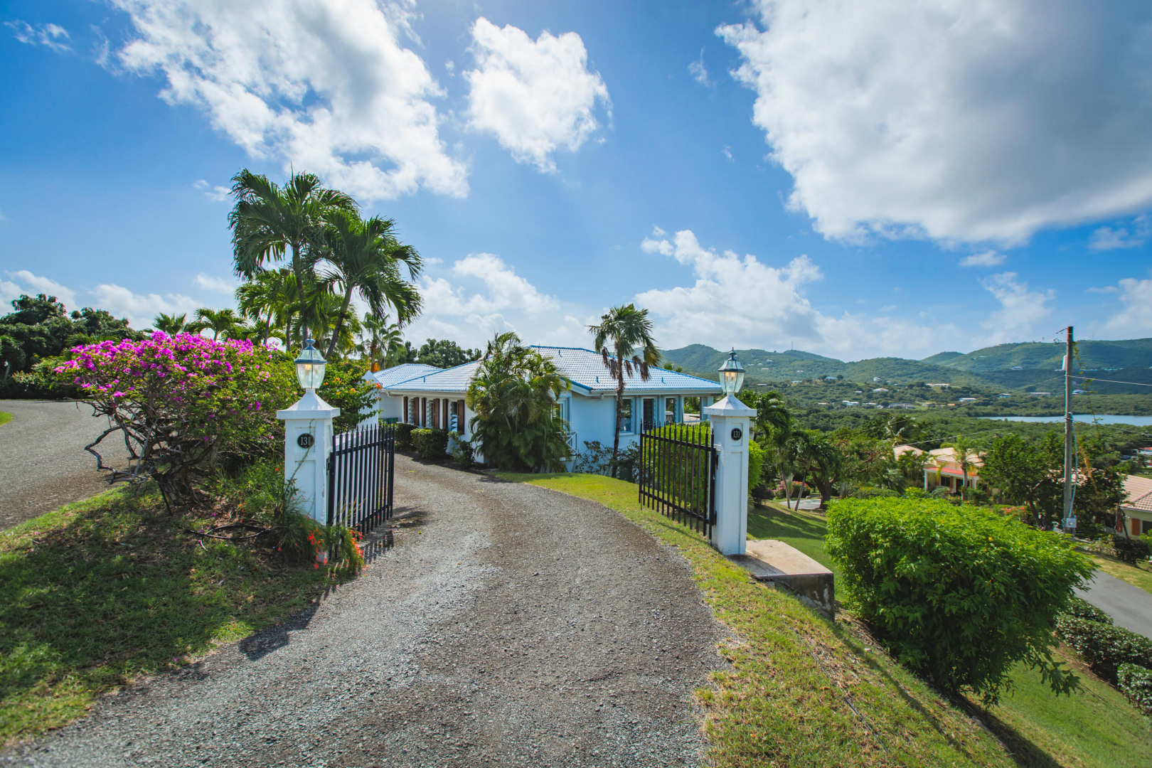 Welcome to 131 Estate Shoys, an extraordinary 4-bedroom, 3.5-bathroom villa with a private pool and cabana, nestled in a premier neighborhood on St. Croix's East End. Adjacent to the prestigious Buccaneer Golf & Beach Resort, this stunning hilltop retreat offers breathtaking dual views of the Caribbean Sea, stretching north to St. Thomas, St. John, and Tortola, and west to the picturesque Christiansted Harbor.Spanning a meticulously maintained 0.78-acre property, this villa showcases exceptional local mahogany woodwork, soaring beamed cathedral ceilings, and imported European tile floors. Designed with elegance and comfort in mind, the home features expansive entertaining spaces and luxurious finishes throughout. As you step through the front doorand into the foyer, you're greeted by a grand mahogany staircase that sets the tone for the home's timeless charm. The main level boasts a spacious living area, including a chef's kitchen with granite countertops, high-end appliances, and an open-concept layout that seamlessly connects to the dining and living spaces. The primary suite, also on the main level, features an ensuite bathroom with marble vanities and a private balcony for enjoying serene sea views. The lower level offers a versatile lounge with a wet bar, perfect for entertaining or serving as a guest suite with a full bathroom and direct access to the pool patio. Two additional guest bedrooms share a full bathroom and are complemented by a bonus living room or playroom with separate pool access. This home is equipped with air conditioning throughout, mahogany window shutters, accordion storm shutters and impact-resistant glass for added security and comfort. The property also includes a whole-house generator with a large diesel tank, 40,000-gallon cistern with a triple water filtration system, ample parking spaces and areas for sitting rooms, workspaces, art studios, and more. Whether hosting a gathering or enjoying tranquil island life, this villa is the perfect sanctuary with its large entertaining areas, custom finishes, and panoramic views which create the ideal setting for relaxation and celebration. Don't miss your chance to own this remarkable hilltop retreat and experience the vibrant culture and natural beauty that is St. Croix!