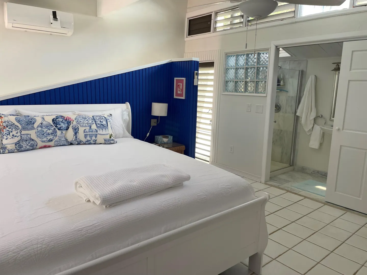Picture perfect location - a knockout view of Buck Island surrounded by the hues of the Caribbean and framed with a palm tree! Appointed with soothing shades of blue and crisp white this beautiful stand-alone one-bedroom, one and a half bath condo on the golf course is a true island retreat, The open kitchen has a bonus gas stove and new refrigerator. There is a large retractable awning over the sea view patio nearly doubling the living space. Ceramic tile floors throughout, with a sunlit skylight and upgraded bathrooms. Amenities include large pool, golf course, a frisbee golf, tennis & pickle ball courts, a pro-shop, a sandy beach, Ollie's cafe, on-site office, & a gated entrance. Popular Duggan's Reef Restaurant is across the road, one of many eateries close by. See private remarks.