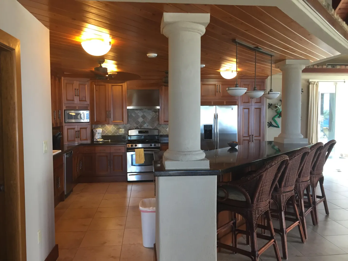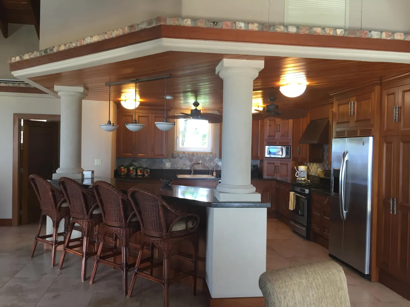 This spectacular and spacious villa with panoramic water views overlooking the South Shore offers Privacy, Architectural Style and a Home that is not just another Rental Villa. With a private entrance and courtyard this villa has three separate pods, all on the same level, including separate entrances to the two bedroom pods. A pool and patio surround the three pods with plenty of outdoor lounge and dining space. The attention to detail is reflected in the layout of this home including custom cabinets throughout, high wood-beam ceilings, three large stone showers each reflecting the shape of a sugar mill and a private master suite with adjoining office/entertainment room. The garage/laundry area could easily be converted to another bedroom or separate caretakers cottage.