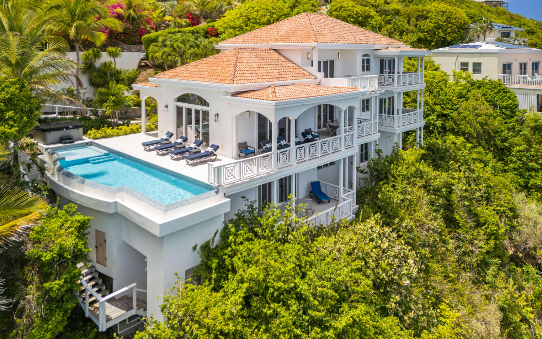 Cliffside villa in Peterborg East with big down-island ocean views. Immaculately kept masonry home with a tile roof, pool, and generous outdoor spaces that make everyday living easy. Six bedrooms, 6.5 baths. Updates include impact windows and doors, split A/Cs, a new professional-grade induction range, three cisterns, and a hot tub. Gated neighborhood with concrete roads and low annual HOA fees. A gracious, comfortable Caribbean home designed for simple island living.