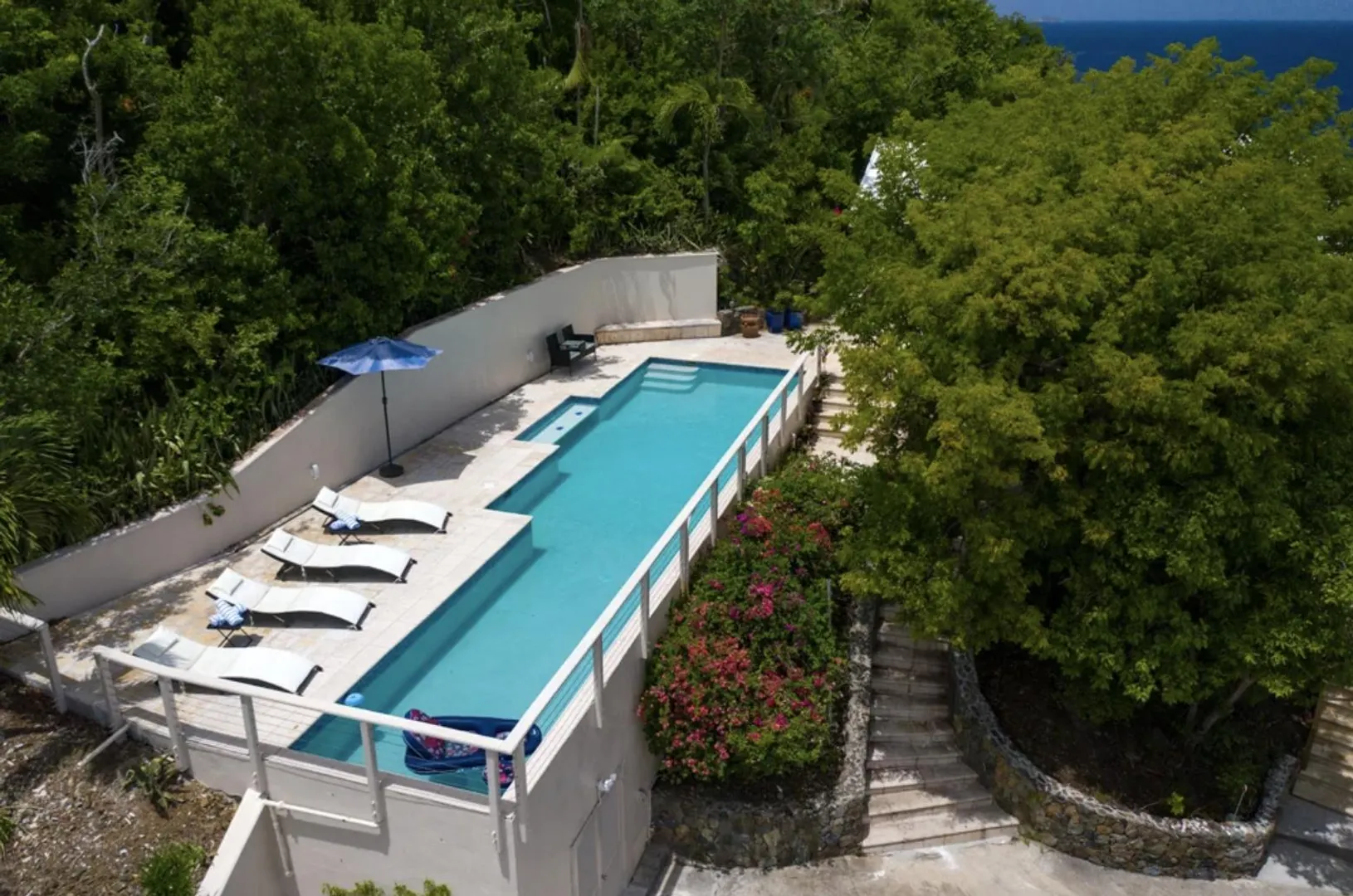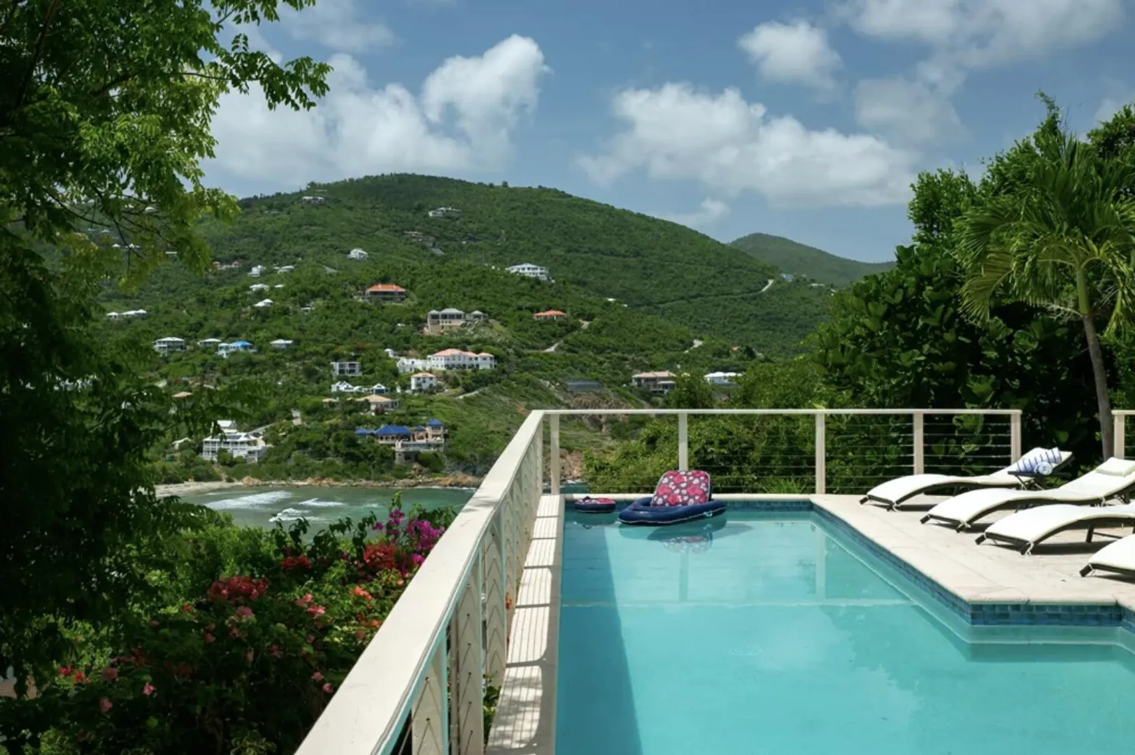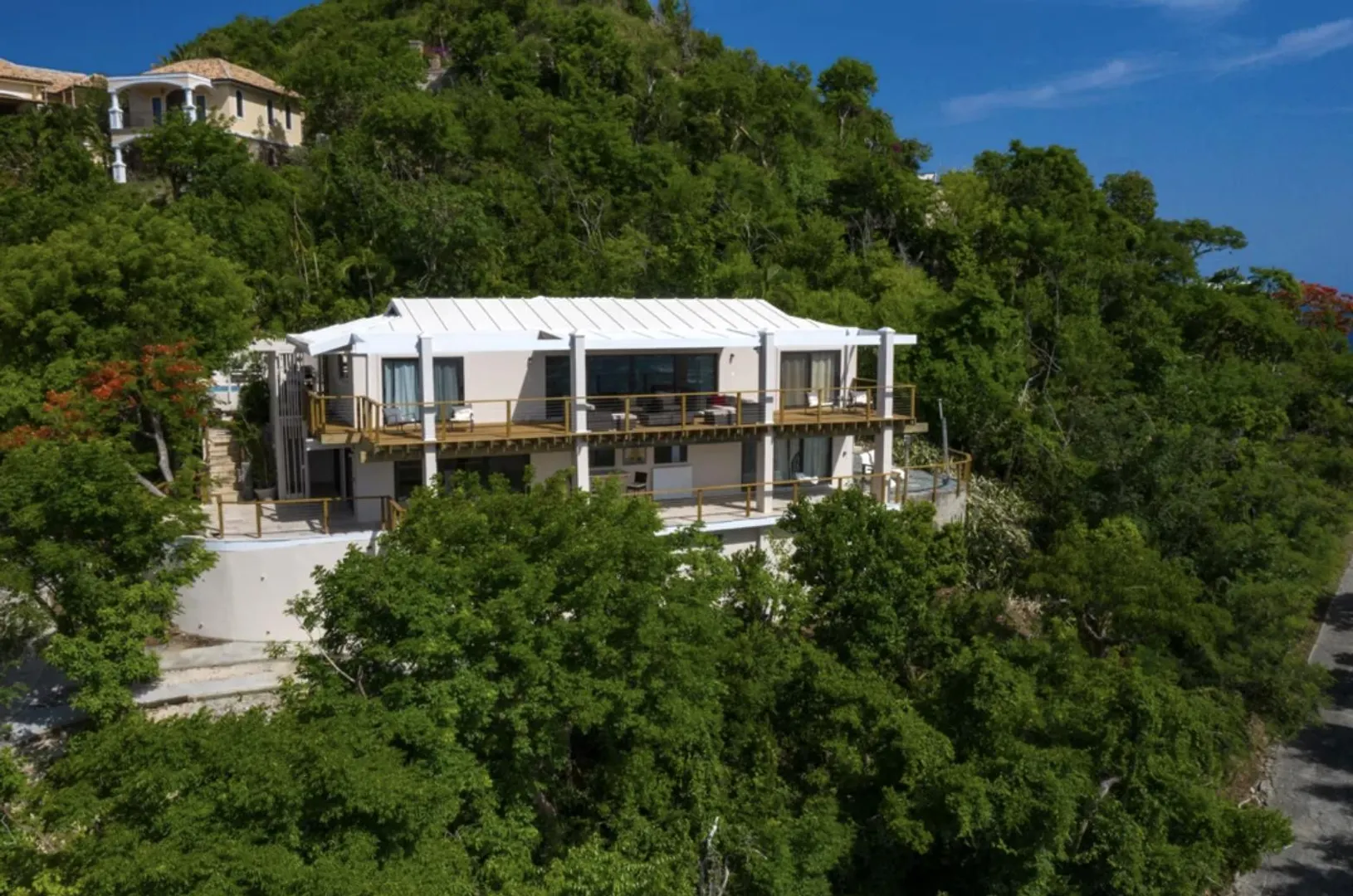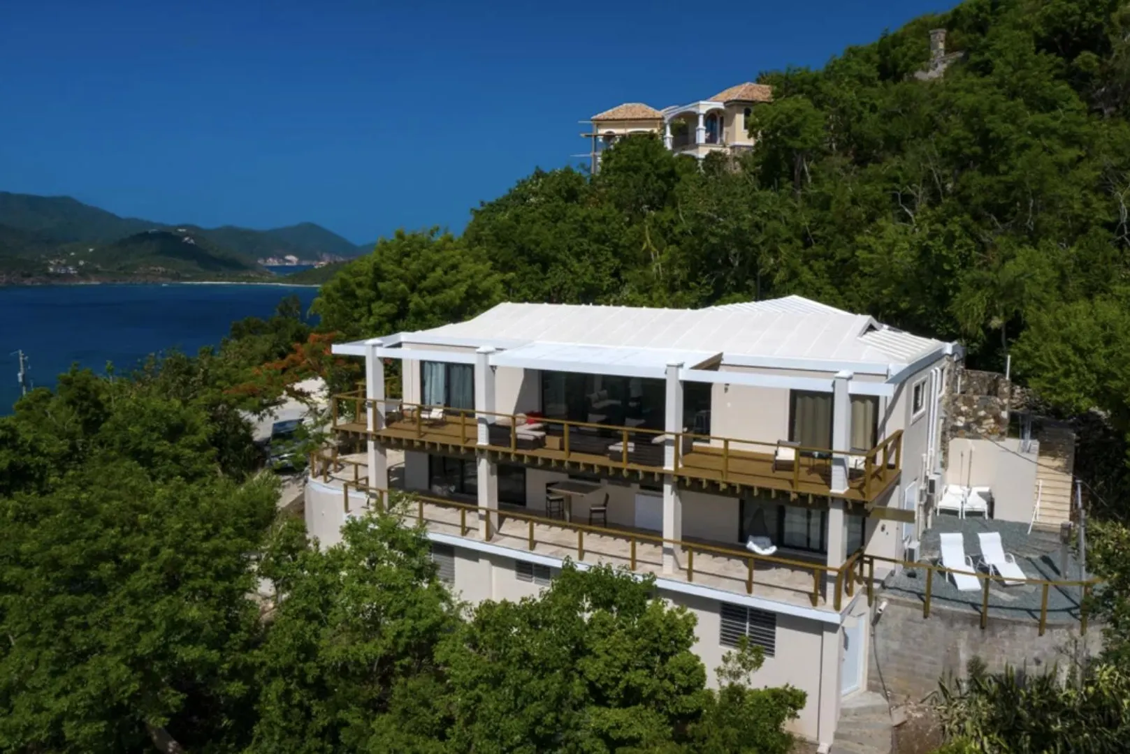 As seen on HGTV's House Hunters International, AVONTUUR VILLA is a perfect escape into the paradise that is St. John with dual water views! This extremely successful vacation rental offers a flexible layout with opportunity for multiple units. Resting high on the hilltop on a full acre of land in desirable Chocolate Hole, this breathtaking villa is just minutes from Cruz Bay's beaches, shopping, and the ferry to St Thomas & BVI. Completely renovated in 2019, with over 3,000 sq. ft. of interior living space and over 5,000 sq. ft. of outdoor space, unparalleled panoramic views of Hart Bay, Dever's Bay and Chocolate Hole, Avontuur Villa brings together true island decor with modern amenities to offer the full experience of St John.
