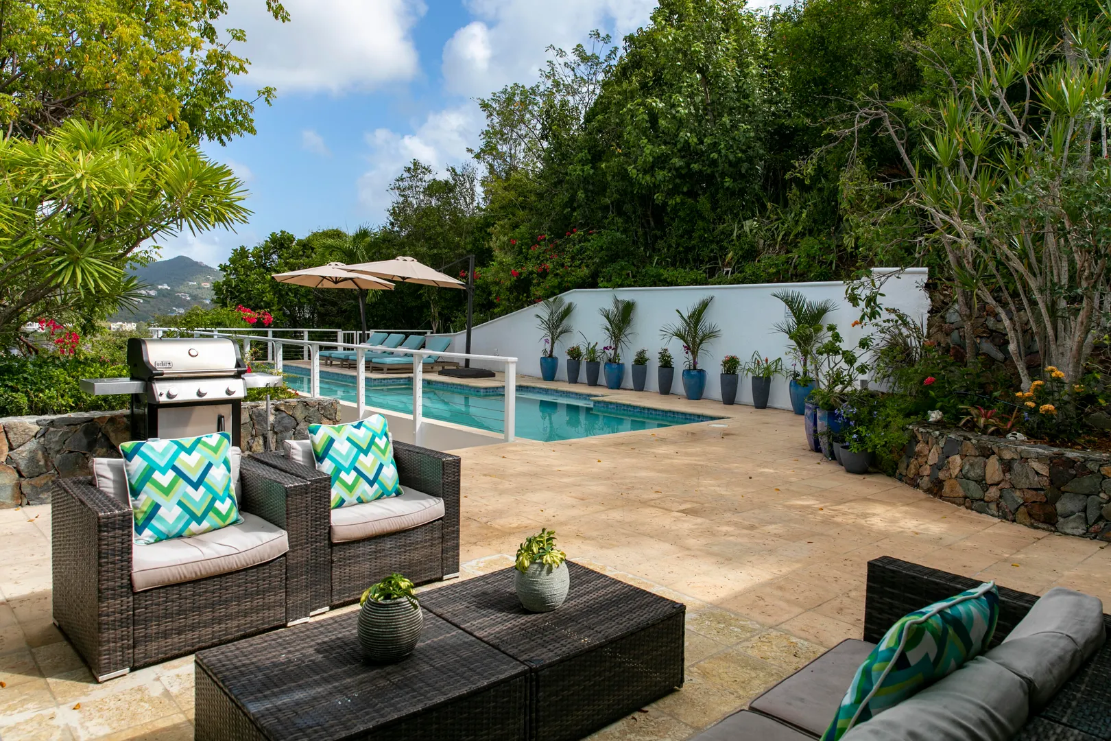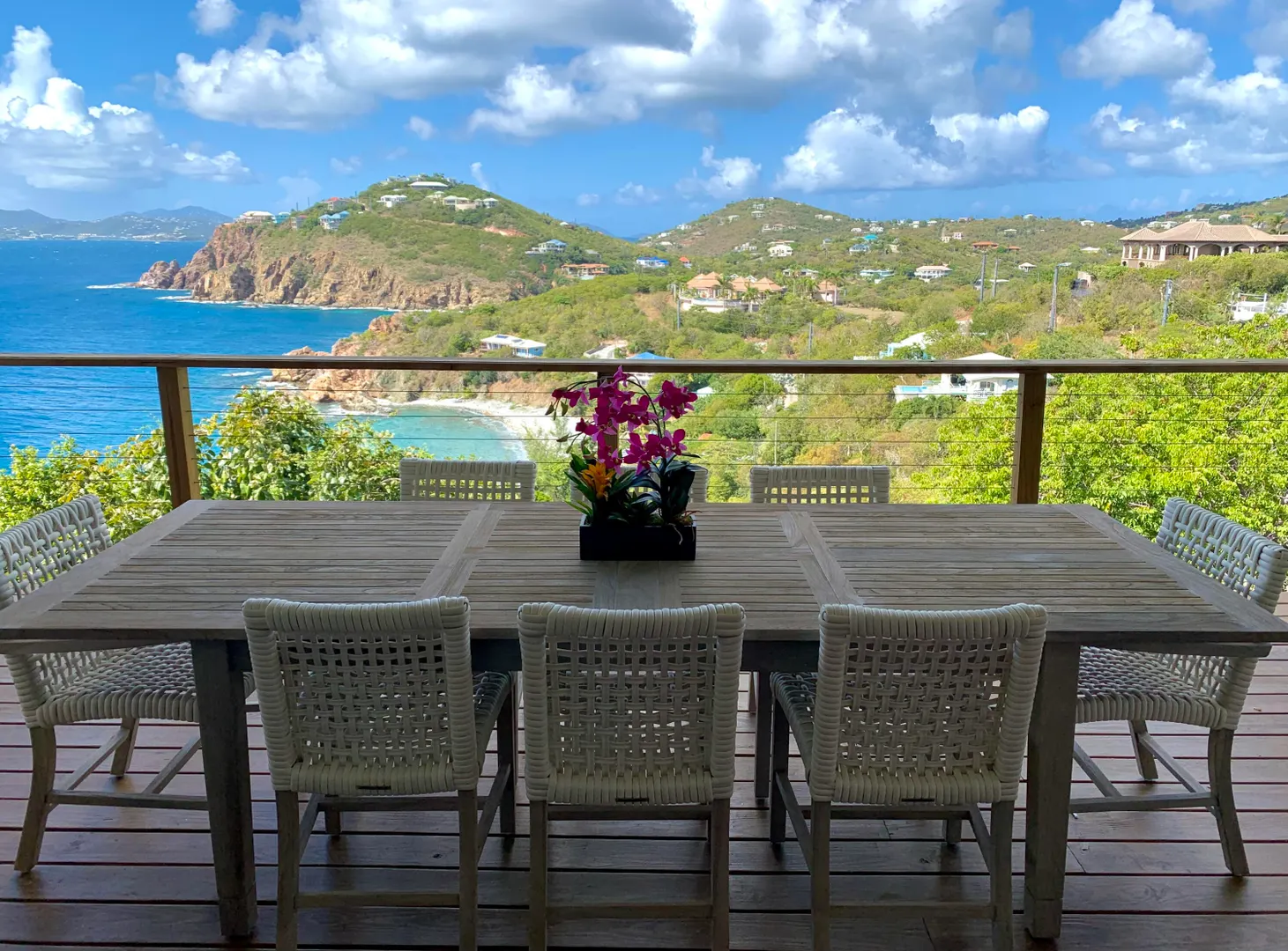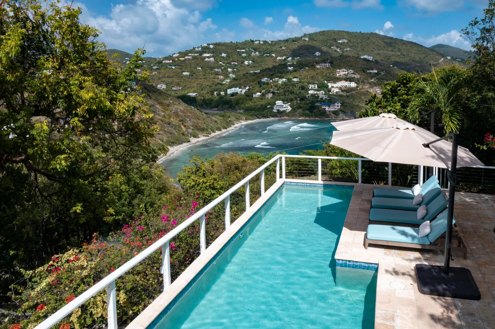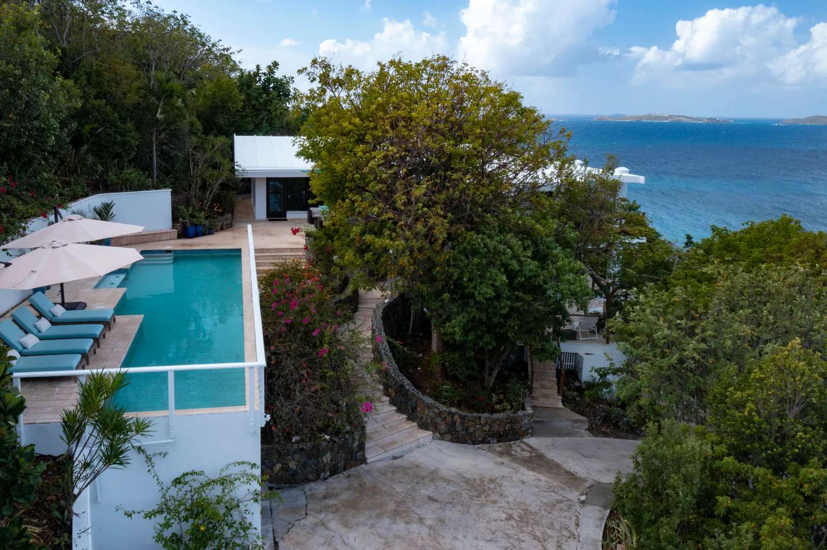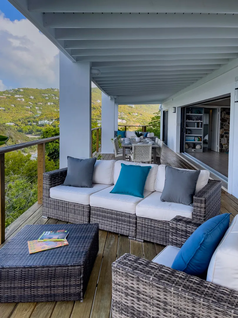 Enjoy spectacular year round sunsets and watch the boats pass by from your private decks surrounded by lush tropical greenery at Moondance Villa. This popular and successful rental villa rented over 32 weeks in 2021 and is on track to rent even more in 2022. Located in desirable Chocolate Hole with unparalleled panoramic views, Moondance Villa brings together stylish island decor with modern amenities, privacy, and a 50' pool featuring brand new Restoration Hardware pool lounges, umbrellas and more. Currently rented as a 4 bedroom with 4 Master ensuite bedrooms and an open floor plan, there is space for everyone to relax in privacy and gather in luxury.