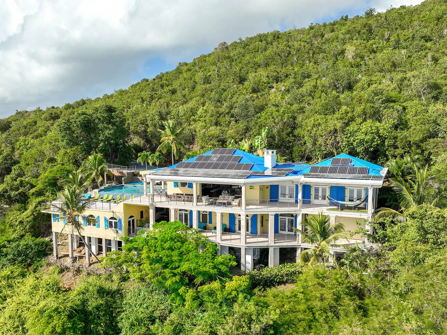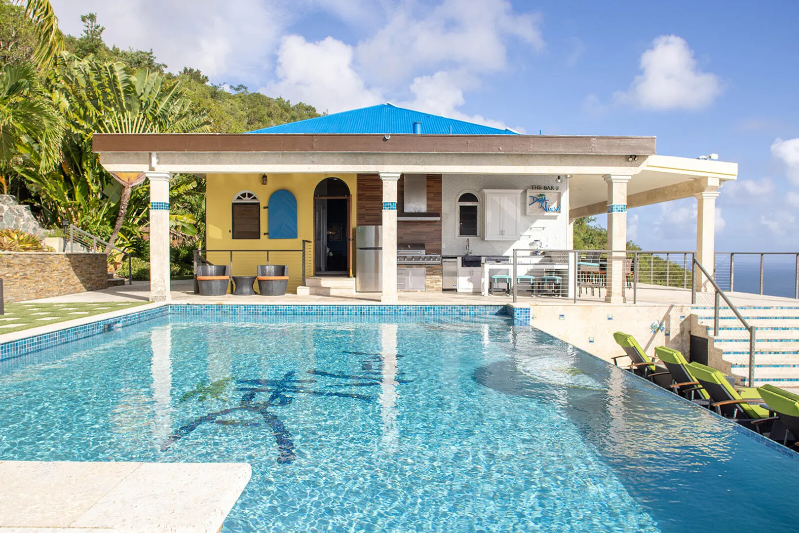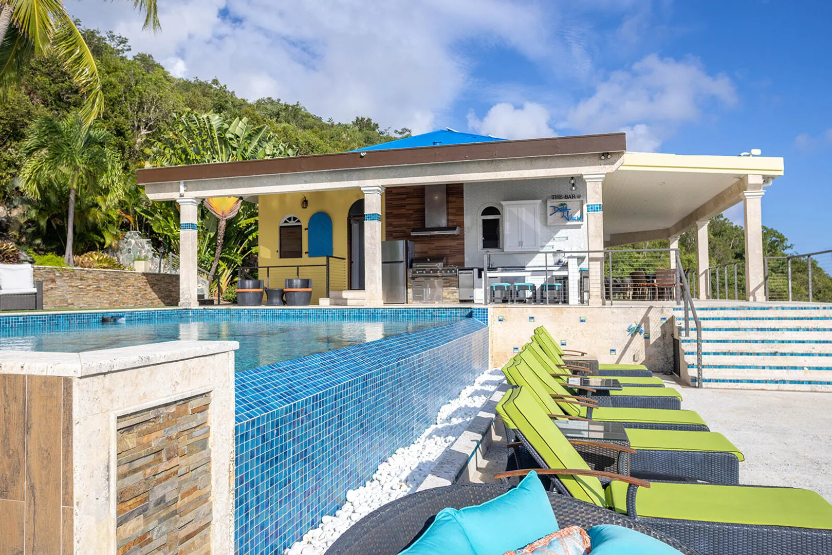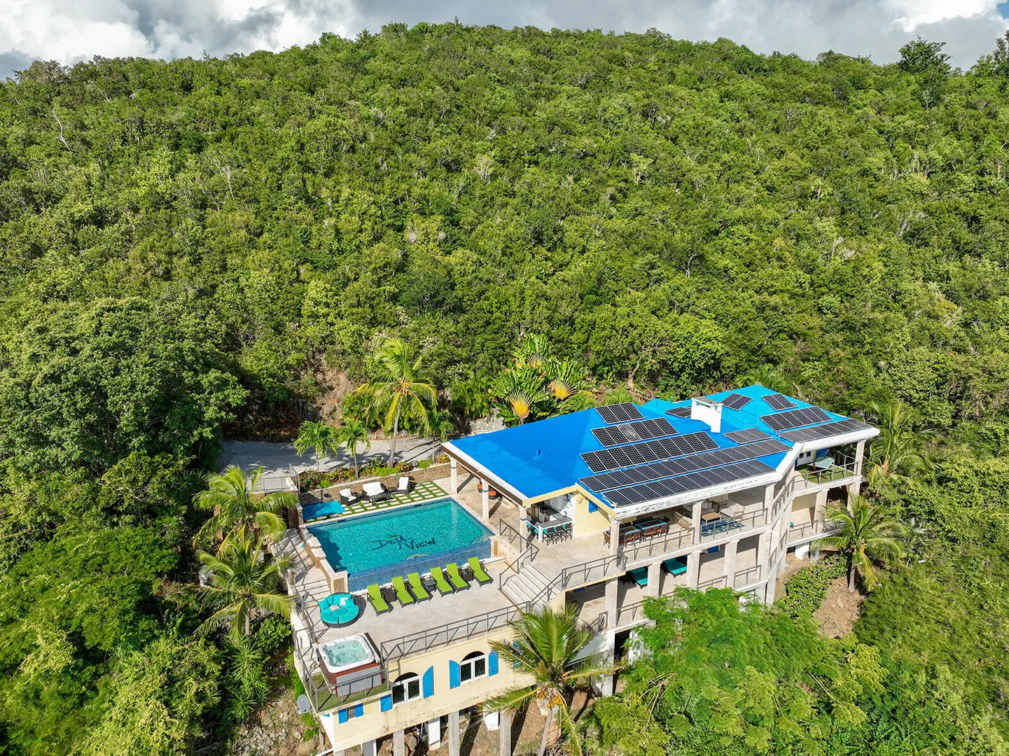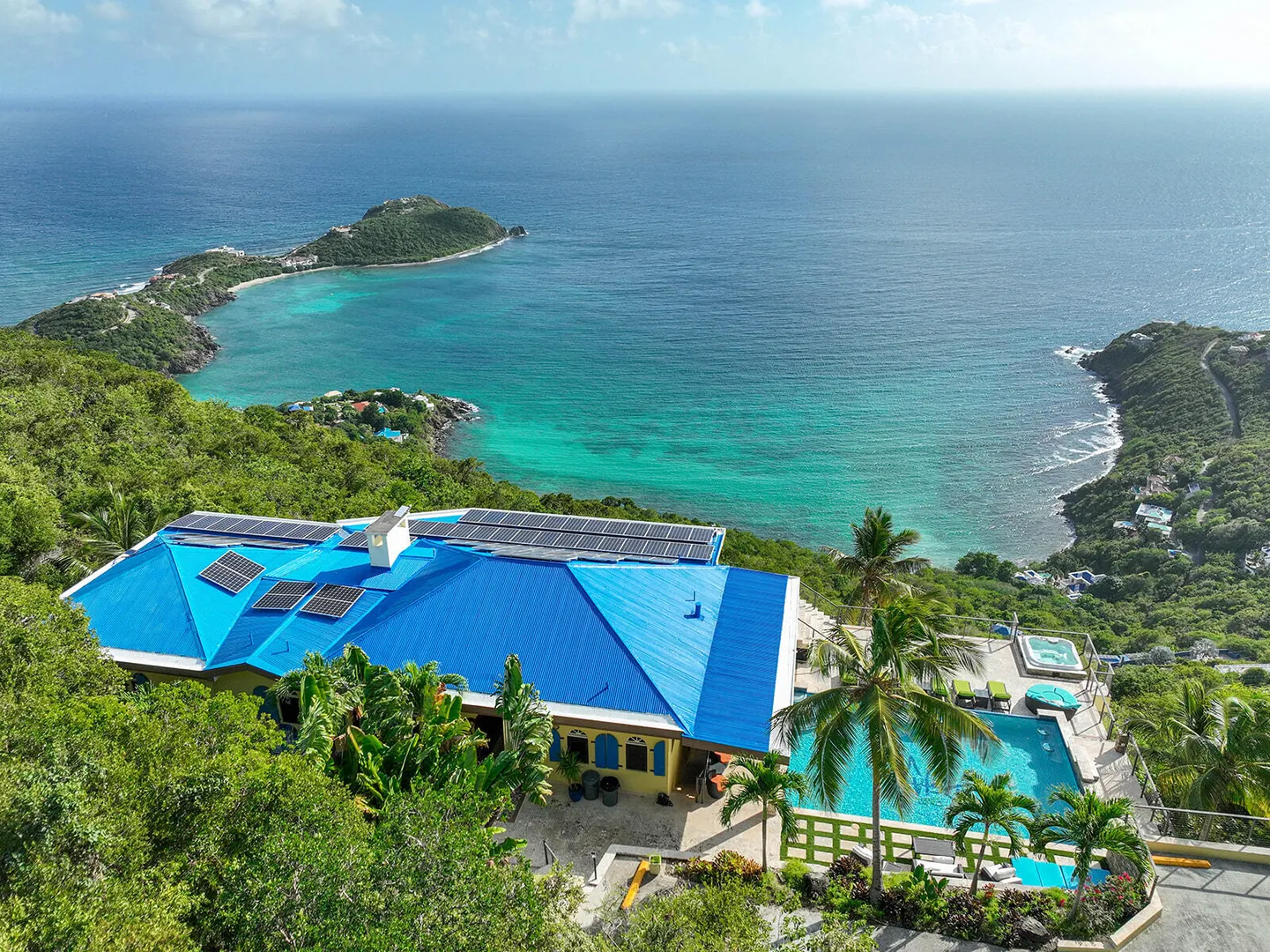 DEJA VIEW, the villa of your dreams. Resting on the hilltop above Rendezvous Bay, this incredible 6 bedroom luxury home is unlike anything on St John. At the end of a private road, the extremely successful rental boasts 5,000 sq. feet outdoor living area with resort style ambiance, an oversized infinity pool + 3 waterfalls. The amenities are endless - renovations and new furniture in 2025, 72 solar panels, coral stone decks, full house auto generator, indoor & outdoor kitchen, + a Jacuzzi crow's nest overlooking the turquoise waters below. With an 800 sq ft Bunk/Game room, the villa comfortably sleeps 21 people, providing the perfect location for an array of vacationers. Deja offers everything one could dream of in the perfect residence or investment property, with impressive income.