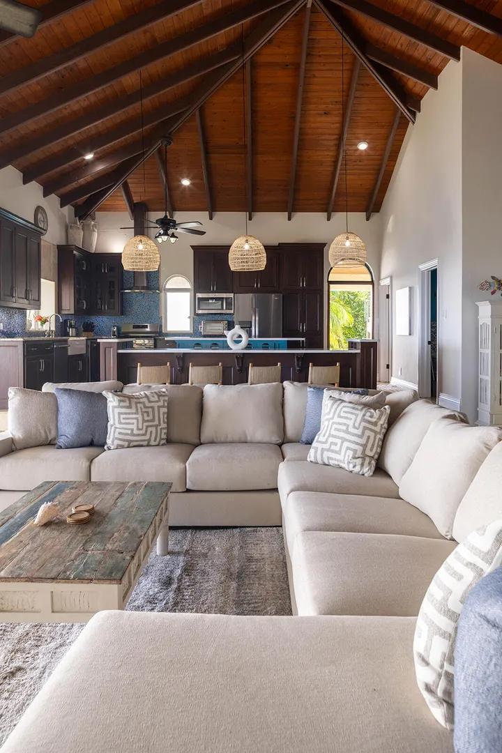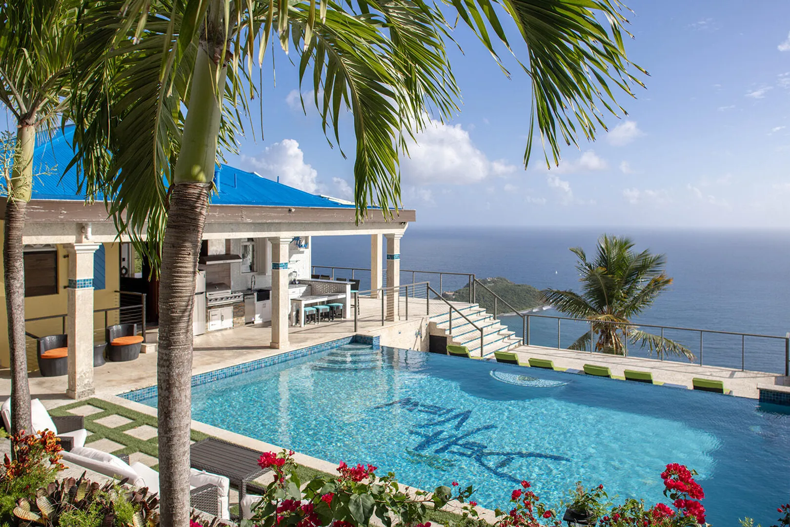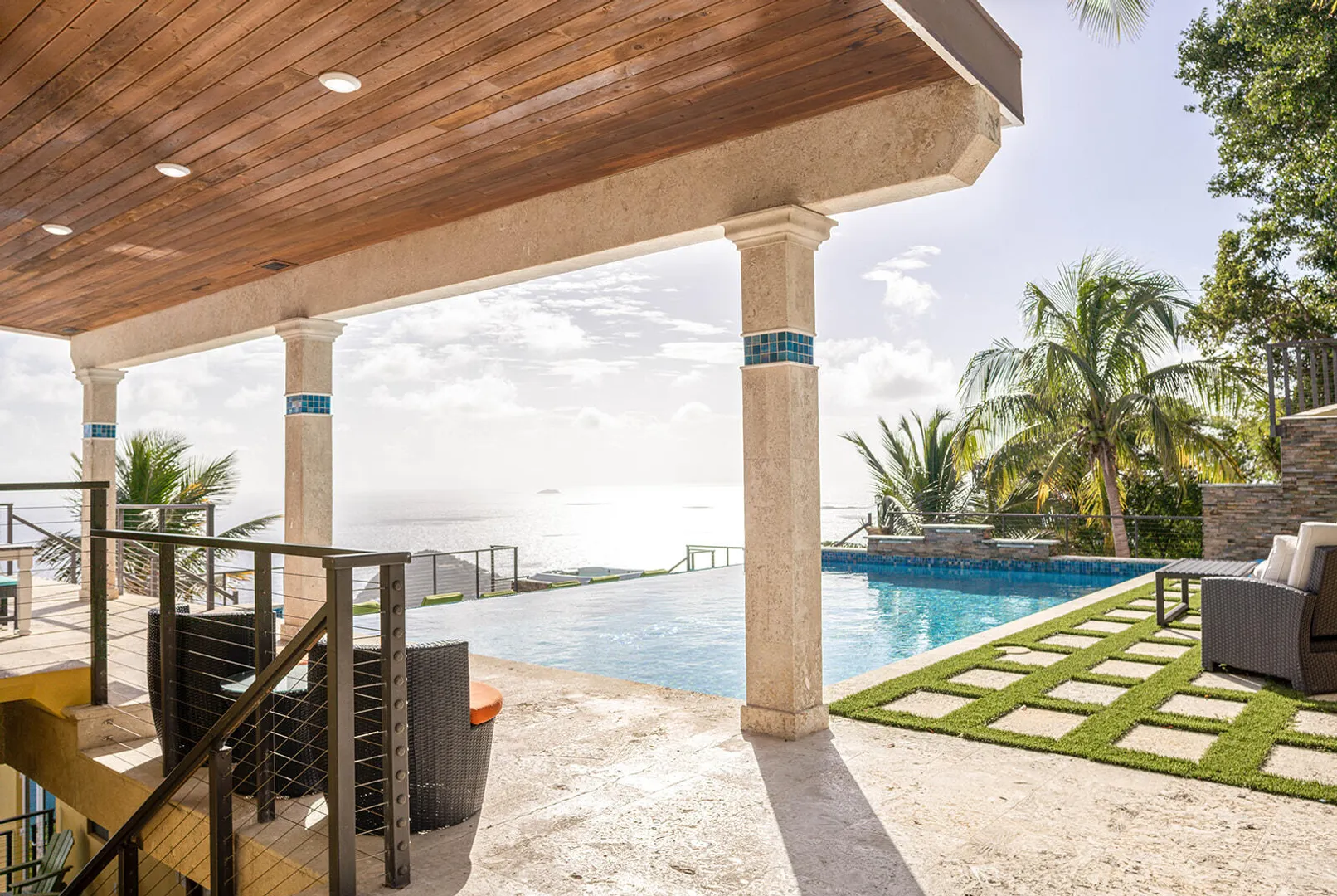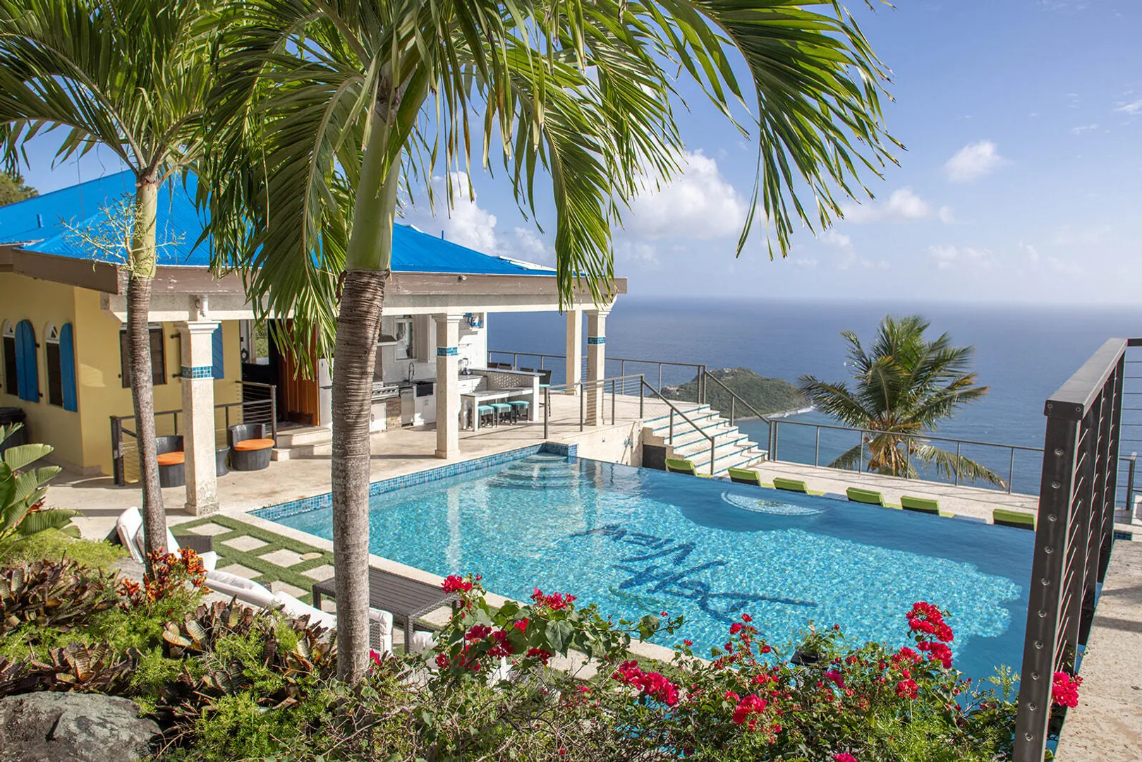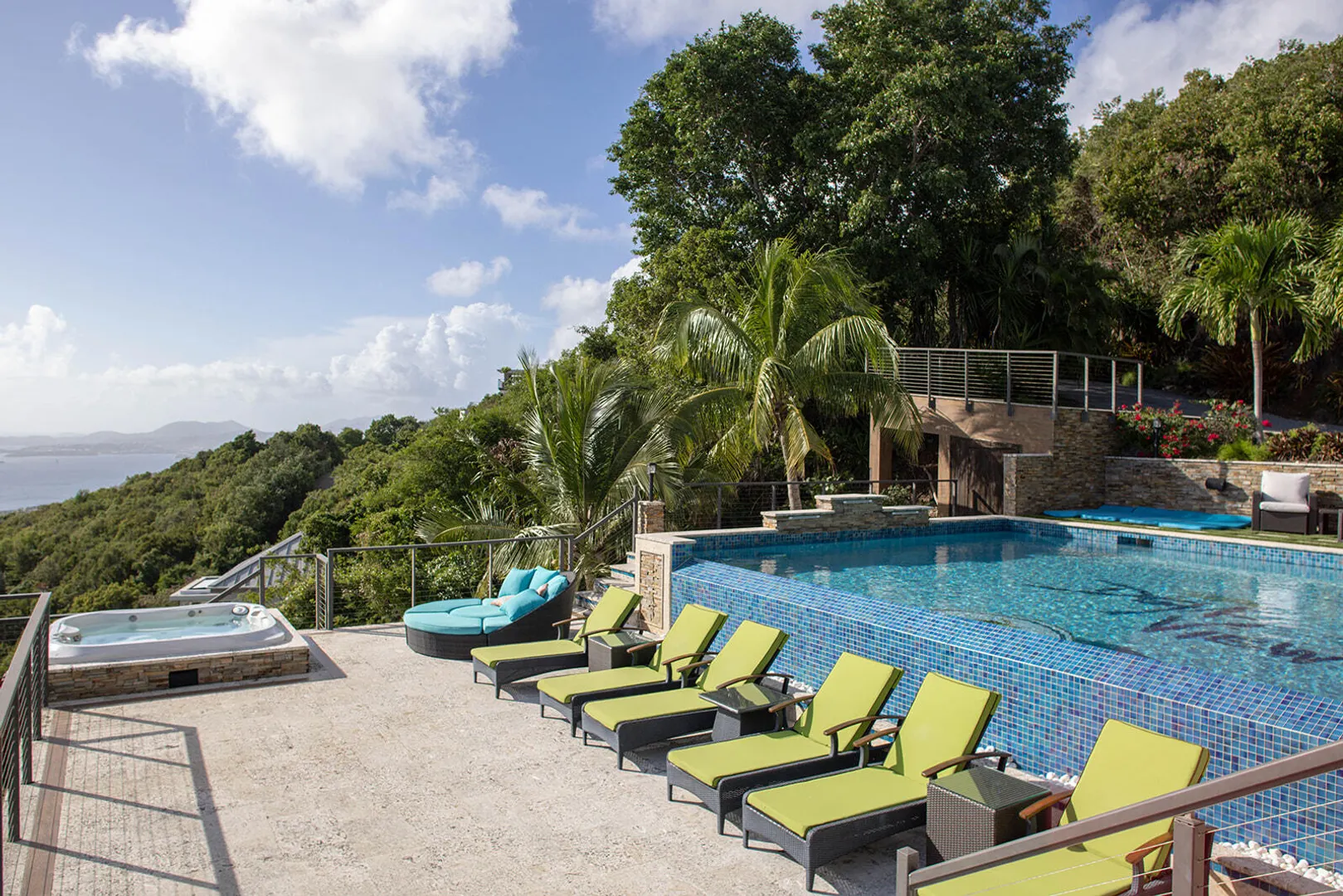 DEJA VIEW, the villa of your dreams. Resting on the hilltop above Rendezvous Bay, this incredible 6 bedroom luxury home is unlike anything on St John. At the end of a private road, the extremely successful rental boasts 5,000 sq. feet outdoor living area with resort style ambiance, an oversized infinity pool + 3 waterfalls. The amenities are endless - renovations and new furniture in 2025, 72 solar panels, coral stone decks, full house auto generator, indoor & outdoor kitchen, + a Jacuzzi crow's nest overlooking the turquoise waters below. With an 800 sq ft Bunk/Game room, the villa comfortably sleeps 21 people, providing the perfect location for an array of vacationers. Deja offers everything one could dream of in the perfect residence or investment property, with impressive income.