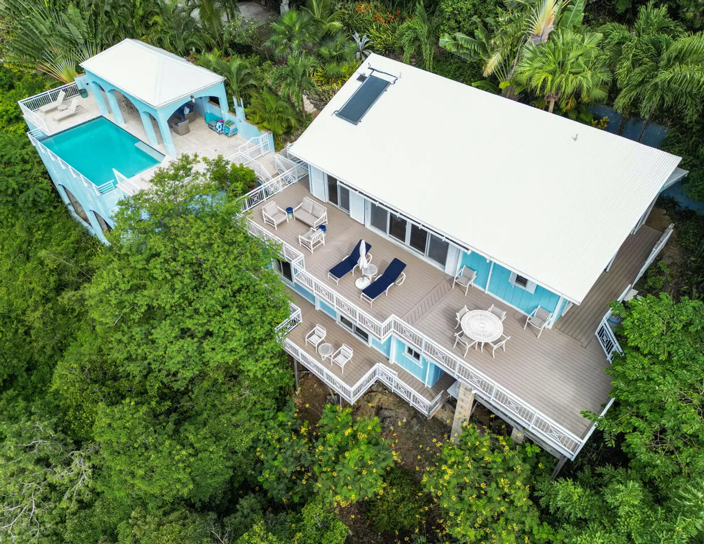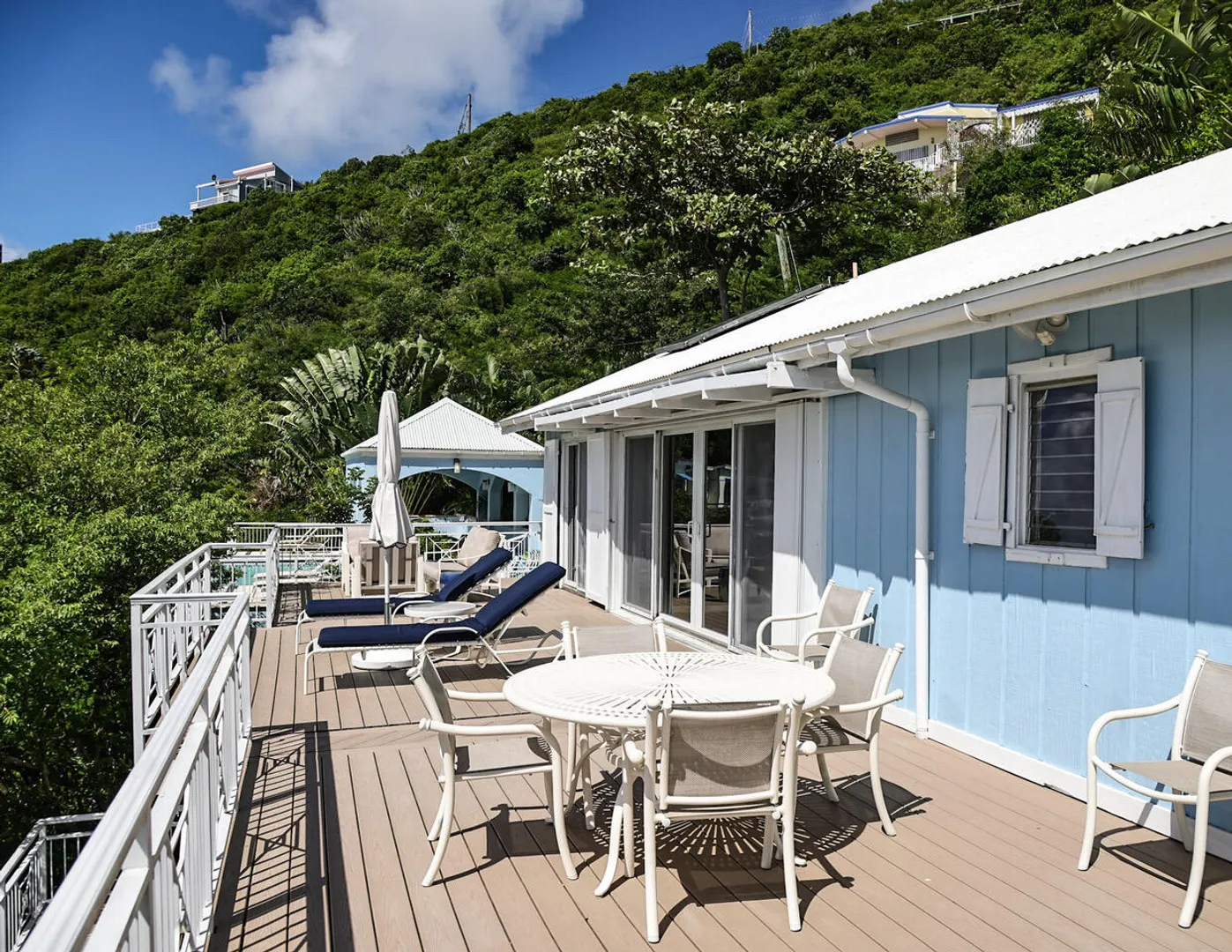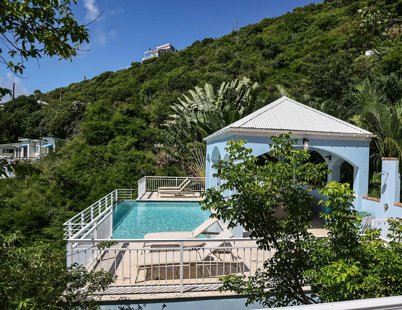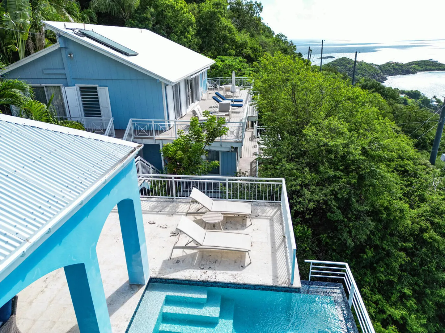 Ballena Blue is a beautiful 3-bedroom, 3-bath villa featuring a new pool surrounded by a spacious sun deck & a shaded cabana area perfect for lounging, dining, & grilling. From both the villa & the pool-conveniently situated side by side-you'll enjoy sweeping panoramic views of Rendezvous Bay & beyond to St. Croix.Fully air-conditioned and thoughtfully designed for comfort, Ballena Blue offers a warm & inviting atmosphere. Both main-level bedrooms are accessible from the great room, w) the primary suite offering extra space and privacy. The wraparound deck provides ample seating to relax & take in the breathtaking vistas.A short set of stairs leads down to the third bedroom & bath on the lower level. The villa features an all-paved drive from town with generous parking &turnaround.Improvements List