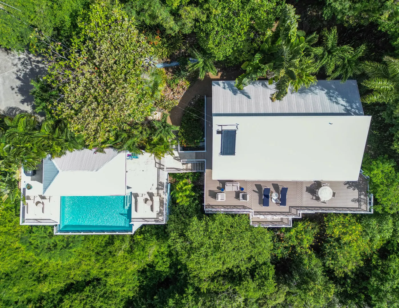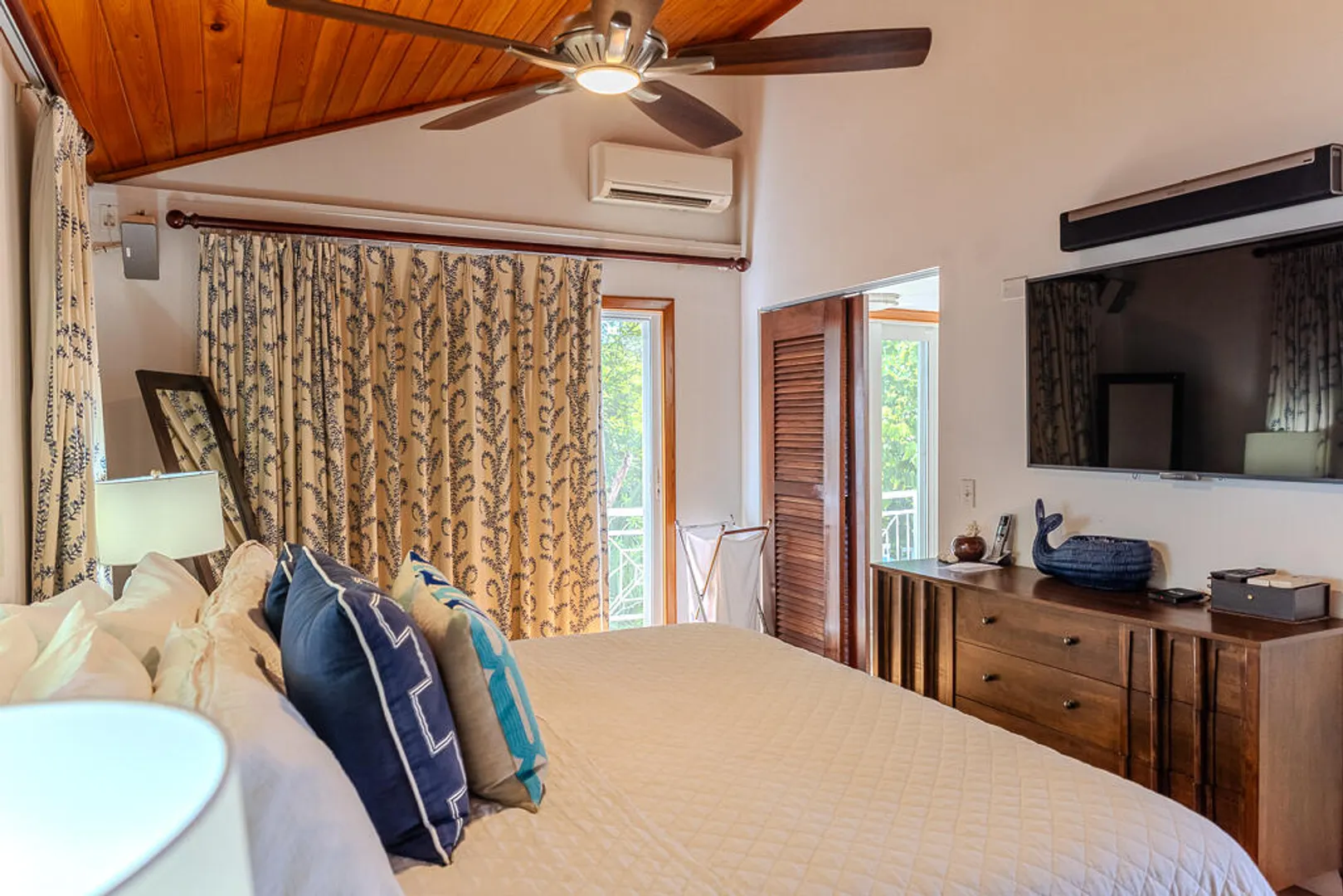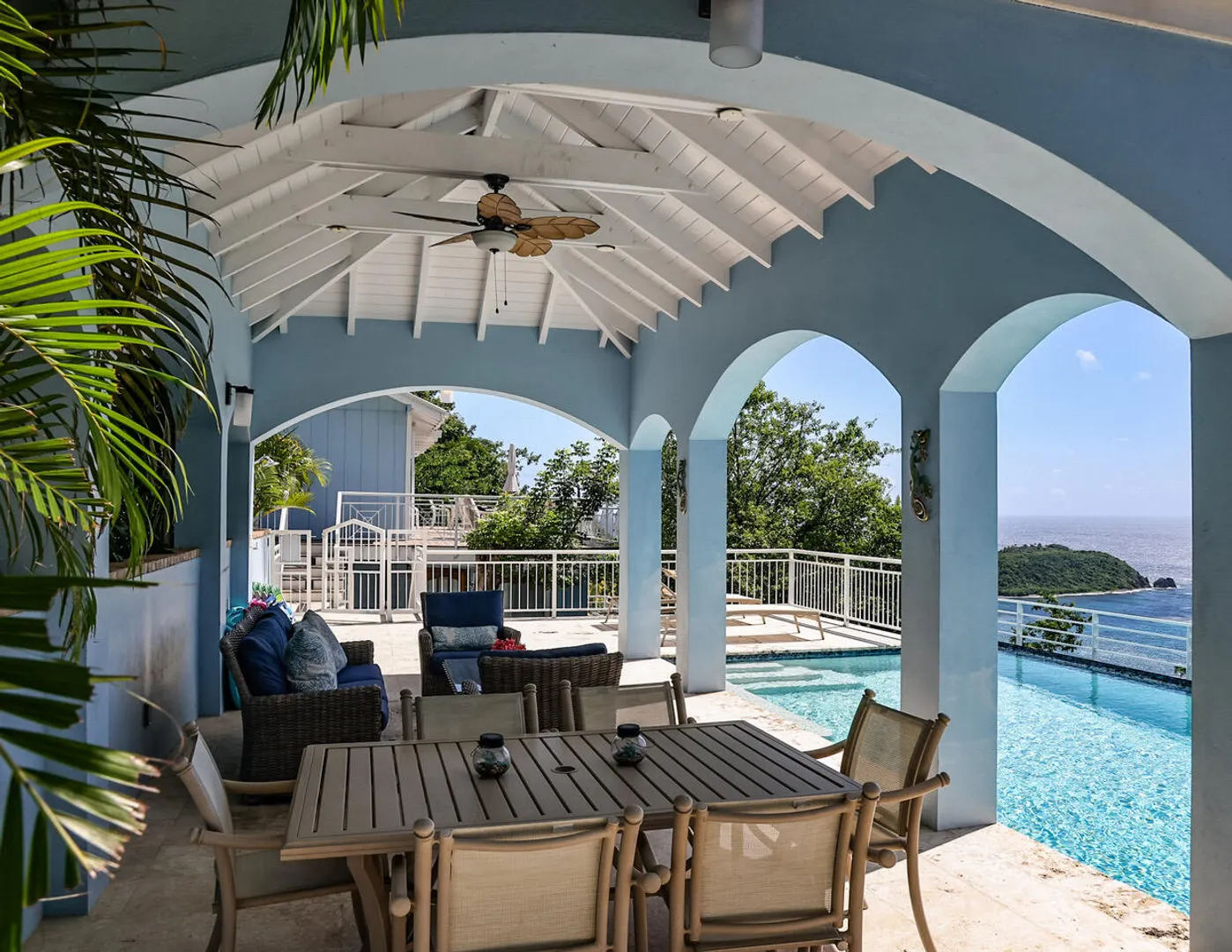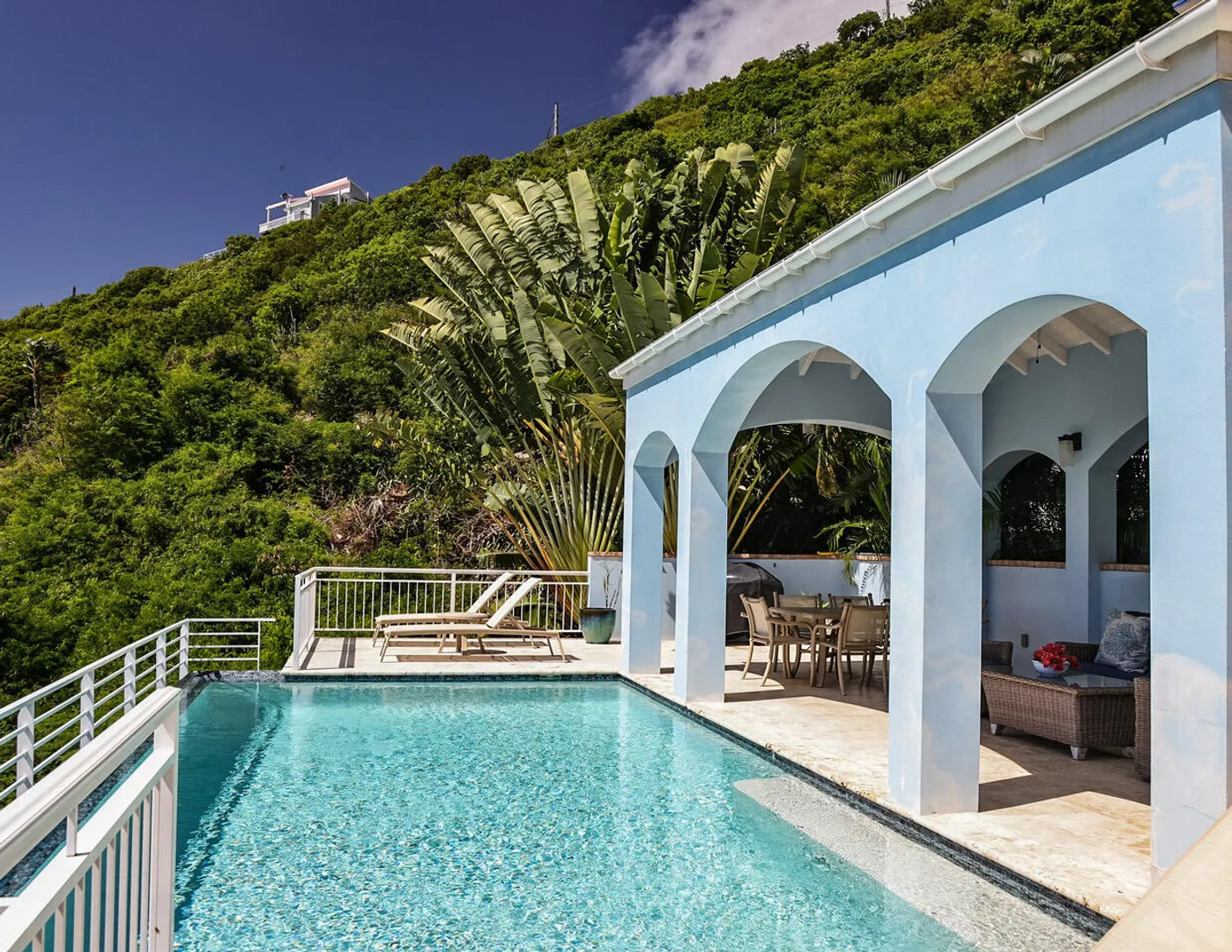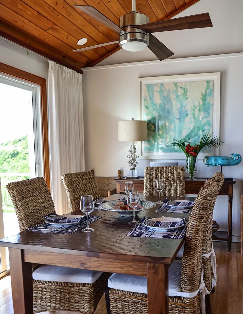 Ballena Blue is a beautiful 3-bedroom, 3-bath villa featuring a new pool surrounded by a spacious sun deck & a shaded cabana area perfect for lounging, dining, & grilling. From both the villa & the pool-conveniently situated side by side-you'll enjoy sweeping panoramic views of Rendezvous Bay & beyond to St. Croix.Fully air-conditioned and thoughtfully designed for comfort, Ballena Blue offers a warm & inviting atmosphere. Both main-level bedrooms are accessible from the great room, w) the primary suite offering extra space and privacy. The wraparound deck provides ample seating to relax & take in the breathtaking vistas.A short set of stairs leads down to the third bedroom & bath on the lower level. The villa features an all-paved drive from town with generous parking &turnaround.Improvements List