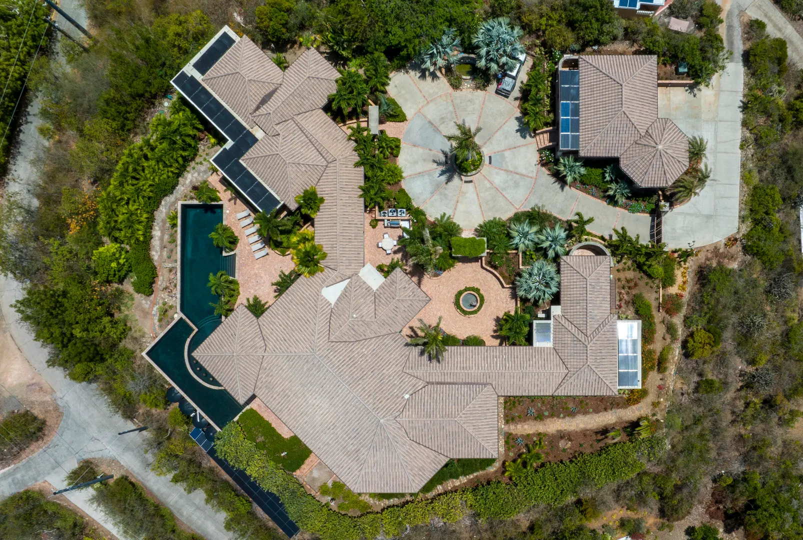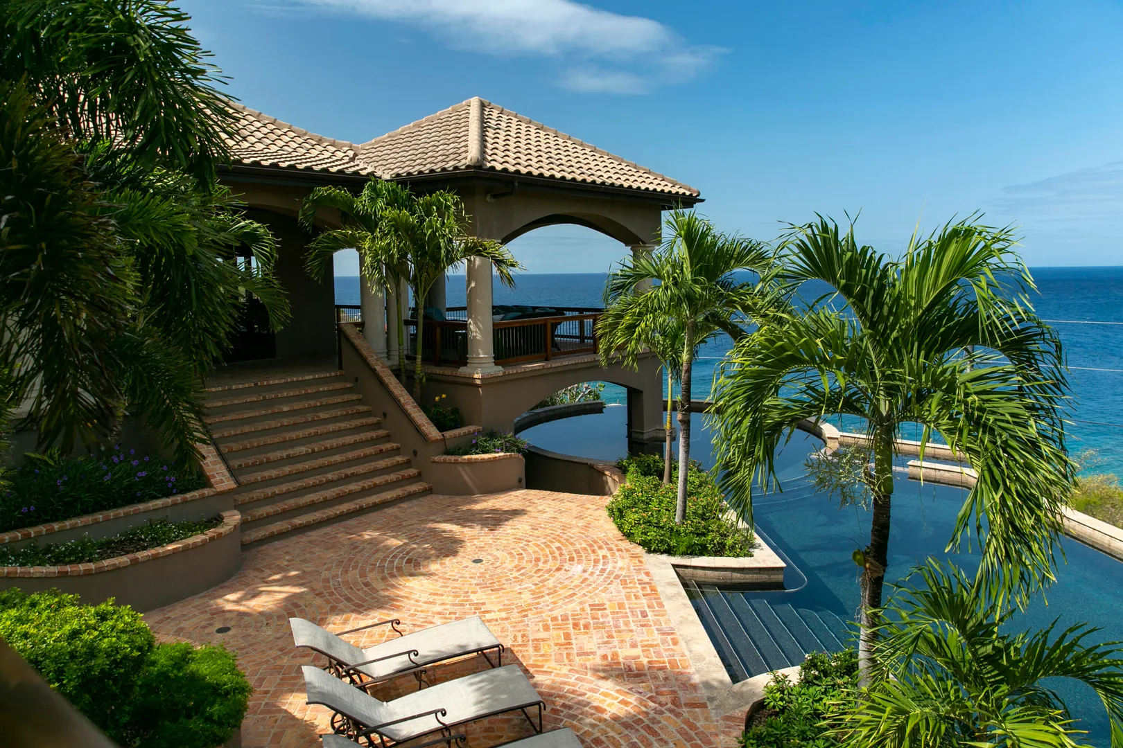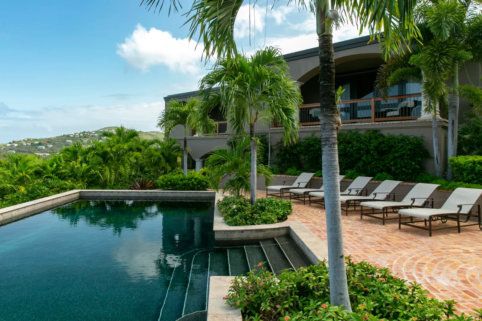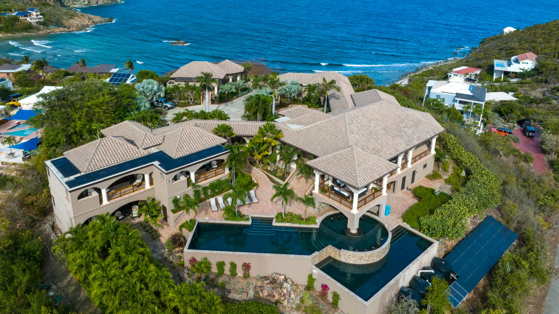 Introducing an unprecedented masterpiece of opulence in the heart of Chocolate Hole, this once private estate has been transformed into a breathtaking ultra-luxury resort style compound. This St. John icon has hosted galas and community events since its creation. The property welcomes you with a gated circular driveway, ensuring ample parking for residents and guests, complemented by an oversized garage for your convenience. Located on a knoll top, this property boasts 5 king suites, each with private balconies that offer panoramic views of the Caribbean Sea. A newly added generously-sized bunk room, complete with pool table and lounge area, is perfect for entertaining guests of all ages. Enjoy the serenity of not one but two stunning swimming pools and relish every sunset
