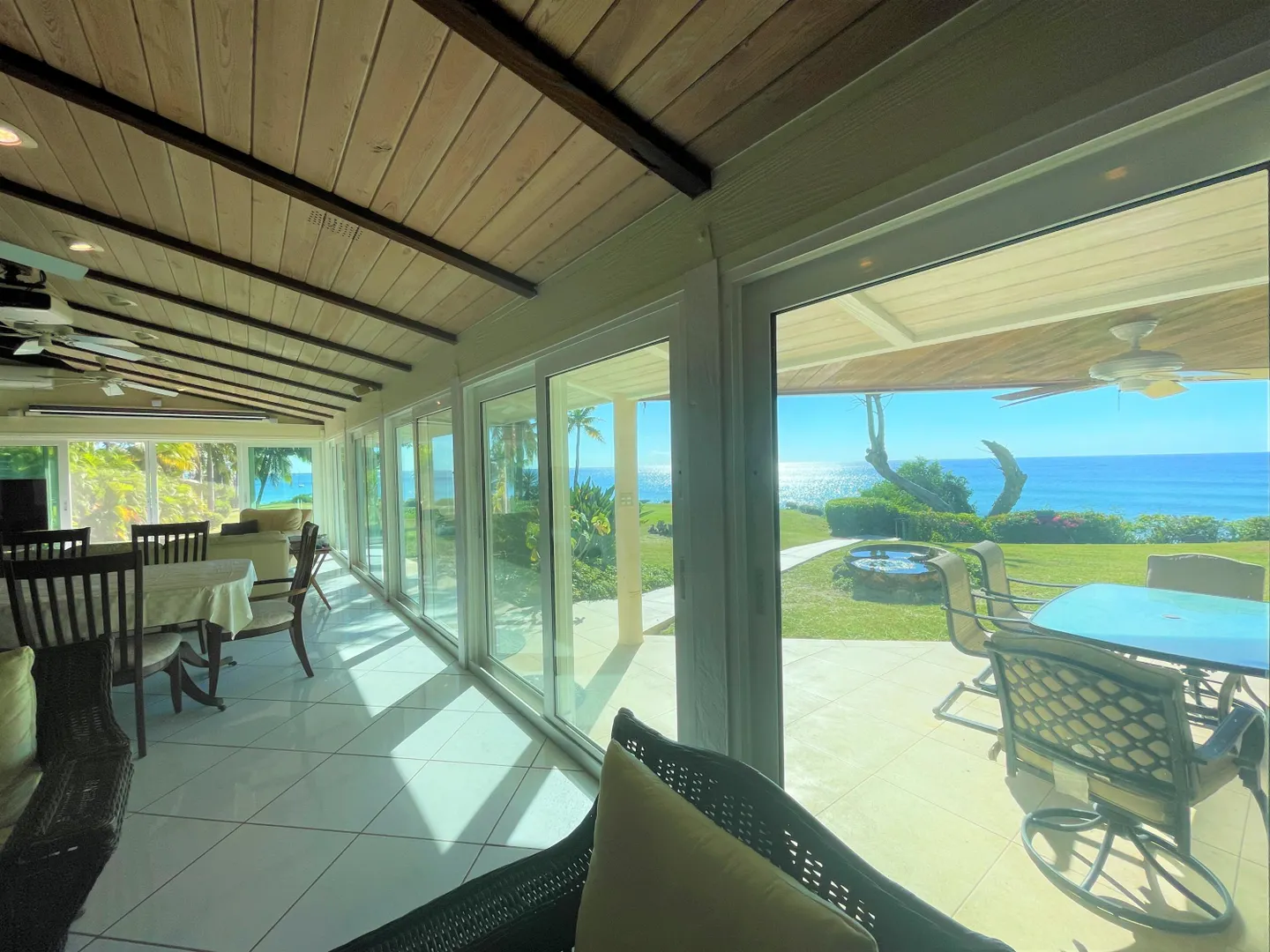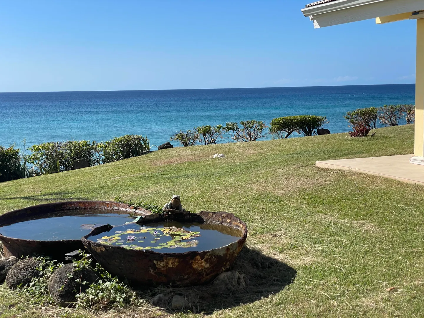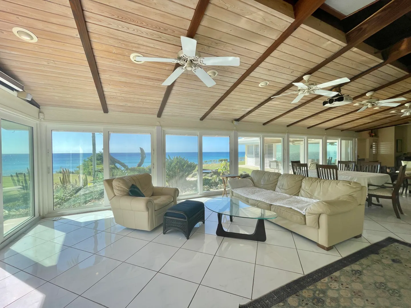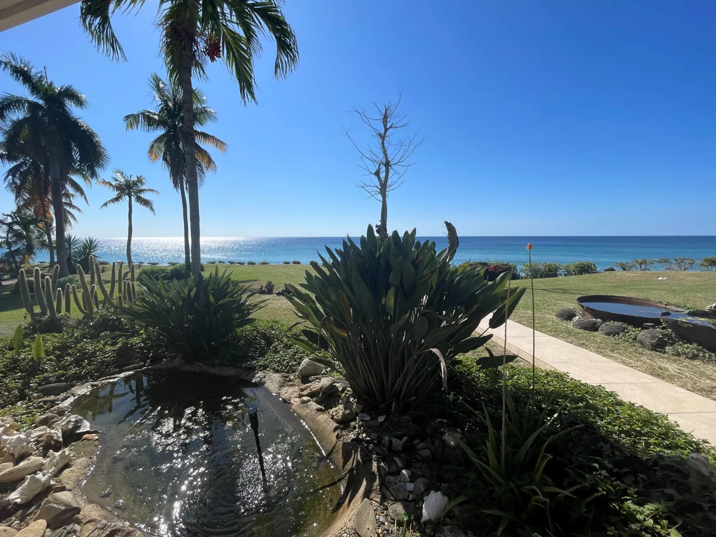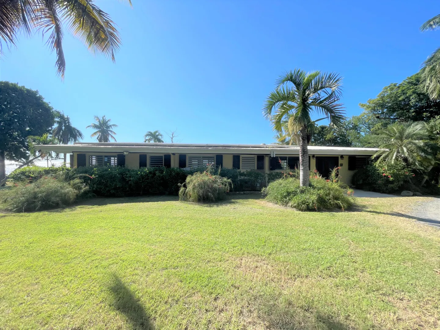 Enjoy panoramic unobstructed views from this beautiful waterfront home on 3.4 acres. A wall of impact rated glass doors offer sea views and complement the huge open floor plan. Two offices and 4 master bedrooms with sea views, each with bathrooms ensuite, make this home a spectacular experience. Over 40 mature Royal palms and coconut palms, lush landscaping, a lilly pond and water features invite you to stroll the grounds, take in the soft breezes and calm Caribbean waters of the West End. This quiet sanctuary near the rainforest is like a private retreat. Home is built over 20 ft above sea level for extra peace of mind. Gated with dense foliage along the road and motion lights for privacy and security. Solar power with 105KW diesel generator backup. 3 lots with development potential.