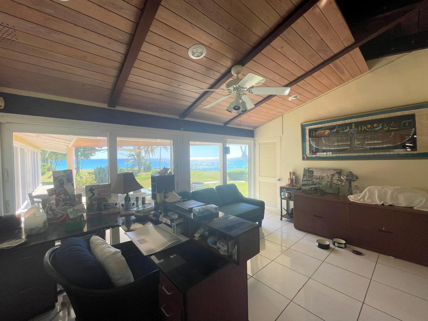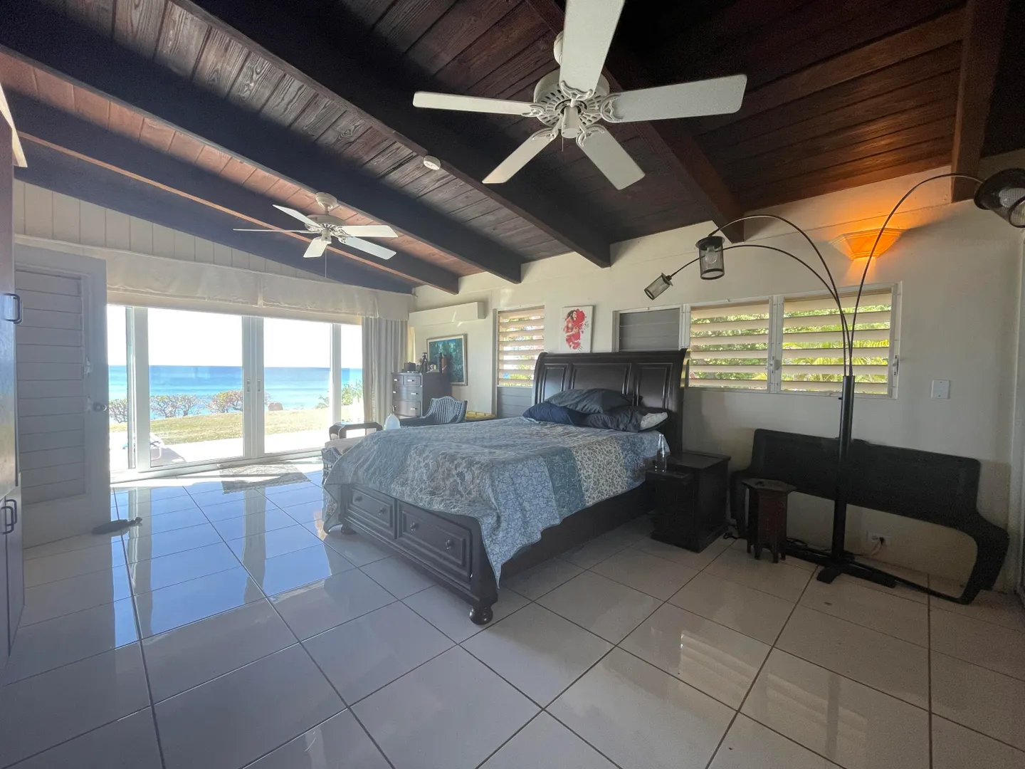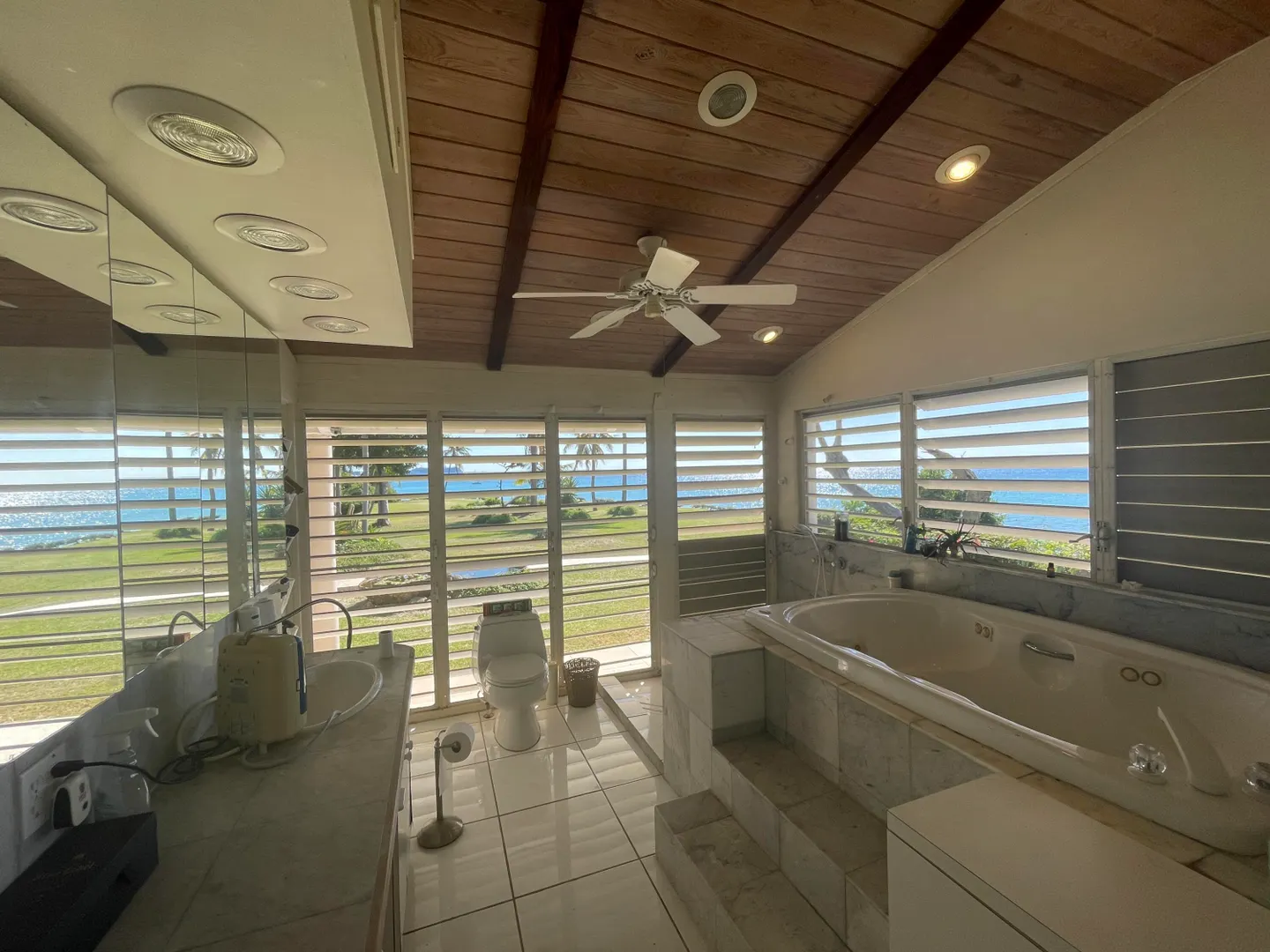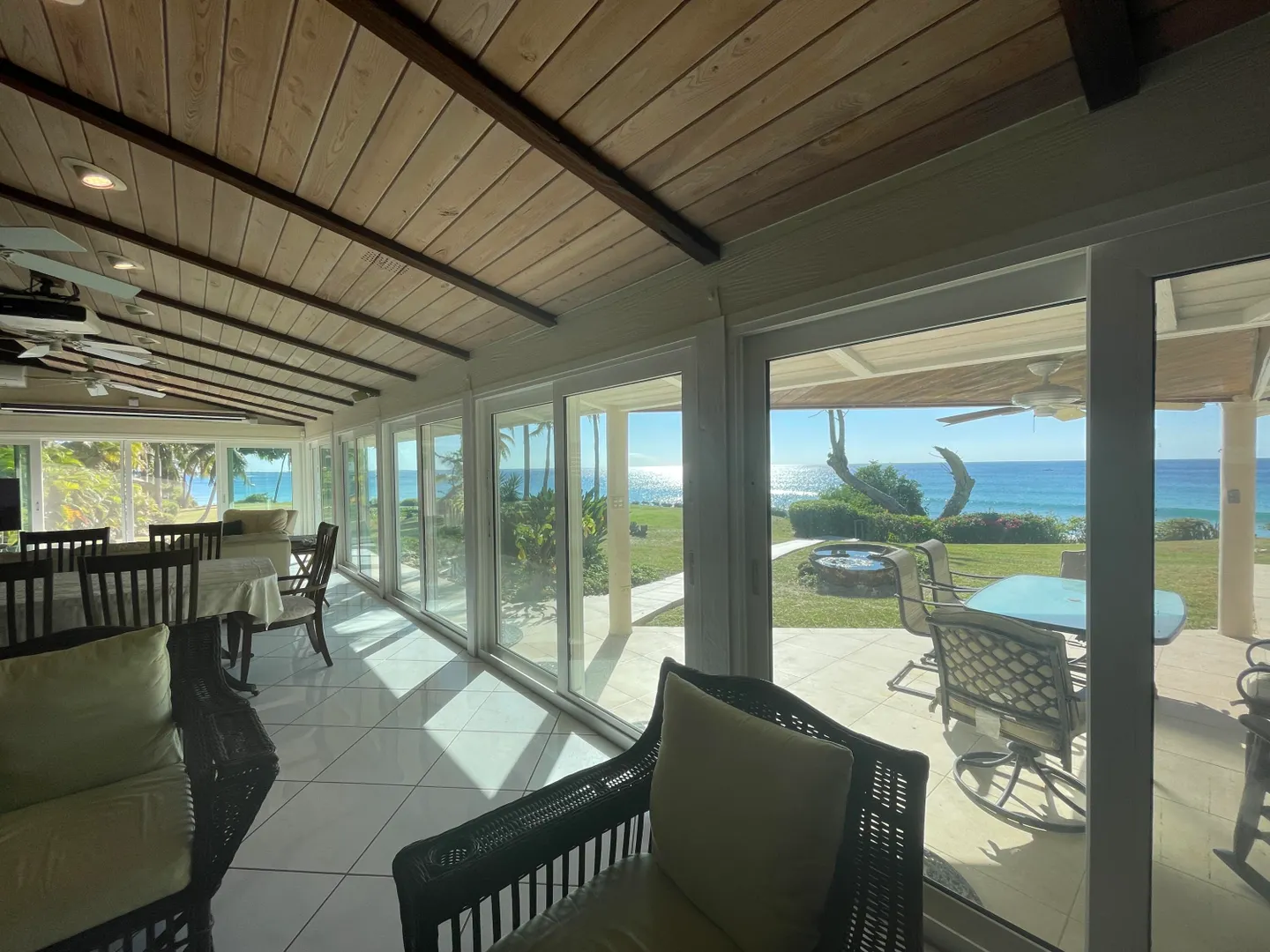 Enjoy panoramic unobstructed views from this beautiful waterfront home on 3.4 acres. A wall of impact rated glass doors offer sea views and complement the huge open floor plan. Two offices and 4 master bedrooms with sea views, each with bathrooms ensuite, make this home a spectacular experience. Over 40 mature Royal palms and coconut palms, lush landscaping, a lilly pond and water features invite you to stroll the grounds, take in the soft breezes and calm Caribbean waters of the West End. This quiet sanctuary near the rainforest is like a private retreat. Home is built over 20 ft above sea level for extra peace of mind. Gated with dense foliage along the road and motion lights for privacy and security. Solar power with 105KW diesel generator backup. 3 lots with development potential.