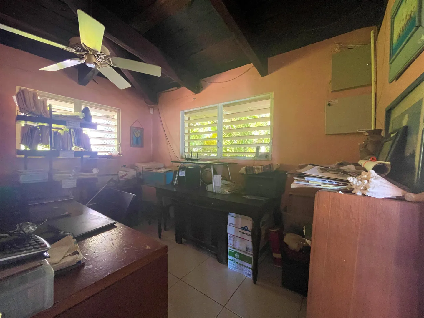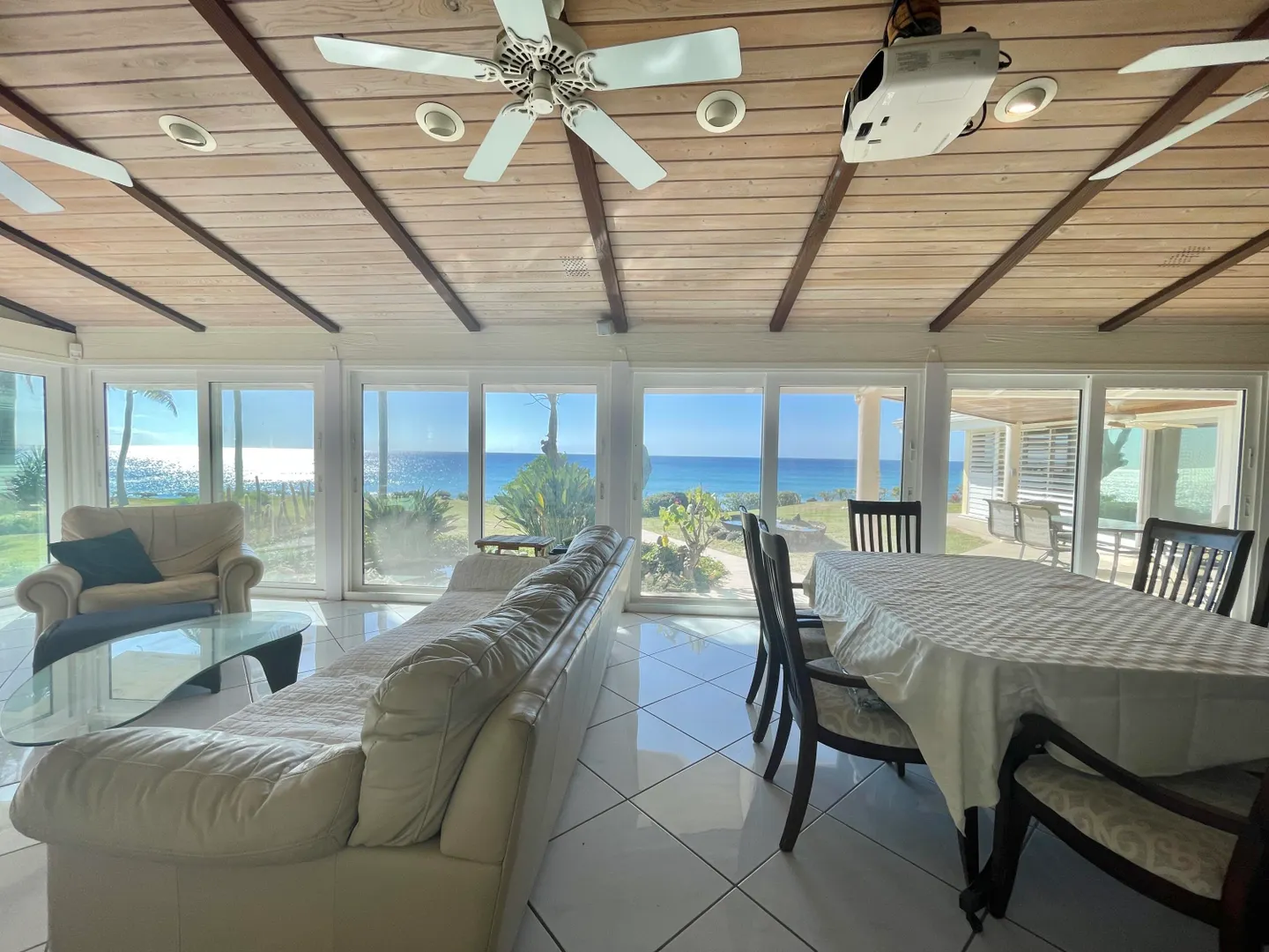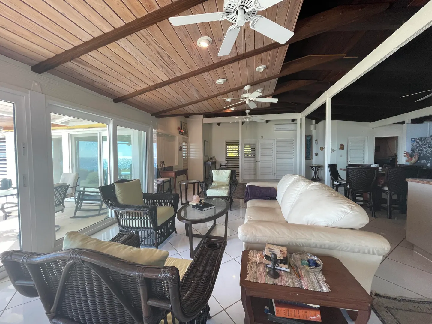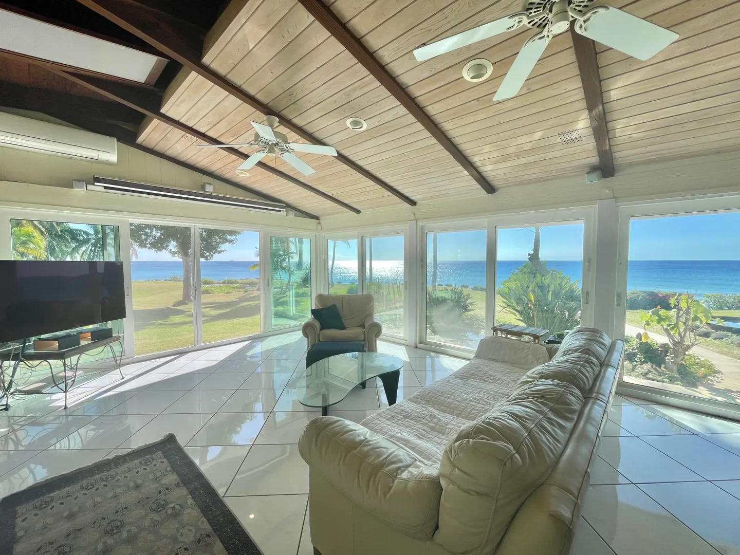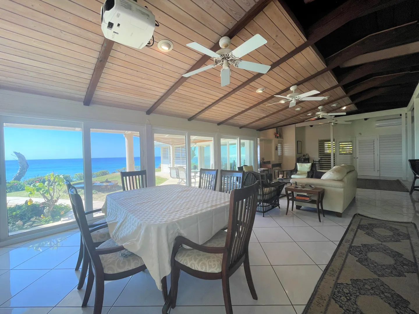 Enjoy panoramic unobstructed views from this beautiful waterfront home on 3.4 acres. A wall of impact rated glass doors offer sea views and complement the huge open floor plan. Two offices and 4 master bedrooms with sea views, each with bathrooms ensuite, make this home a spectacular experience. Over 40 mature Royal palms and coconut palms, lush landscaping, a lilly pond and water features invite you to stroll the grounds, take in the soft breezes and calm Caribbean waters of the West End. This quiet sanctuary near the rainforest is like a private retreat. Home is built over 20 ft above sea level for extra peace of mind. Gated with dense foliage along the road and motion lights for privacy and security. Solar power with 105KW diesel generator backup. 3 lots with development potential.