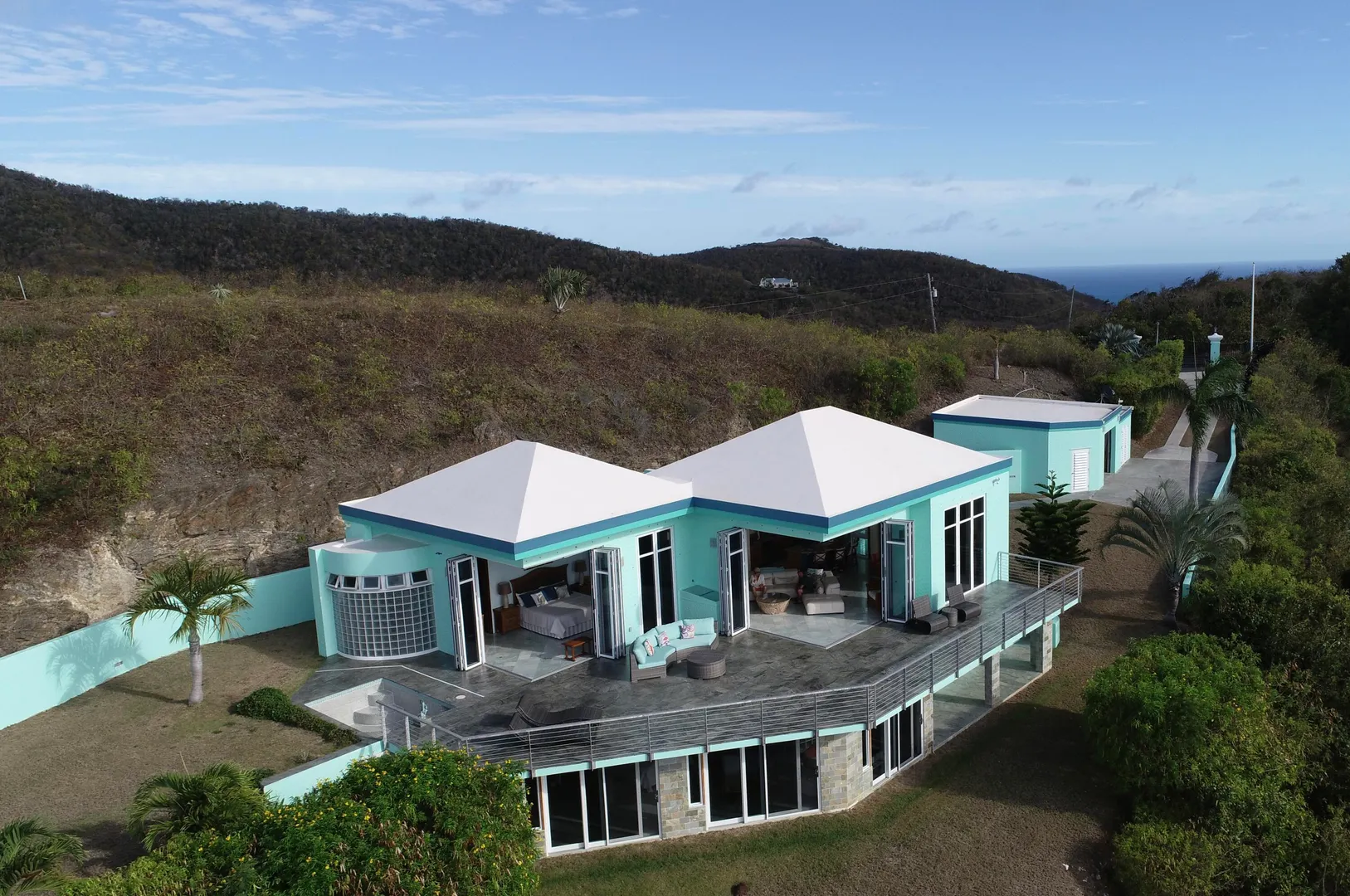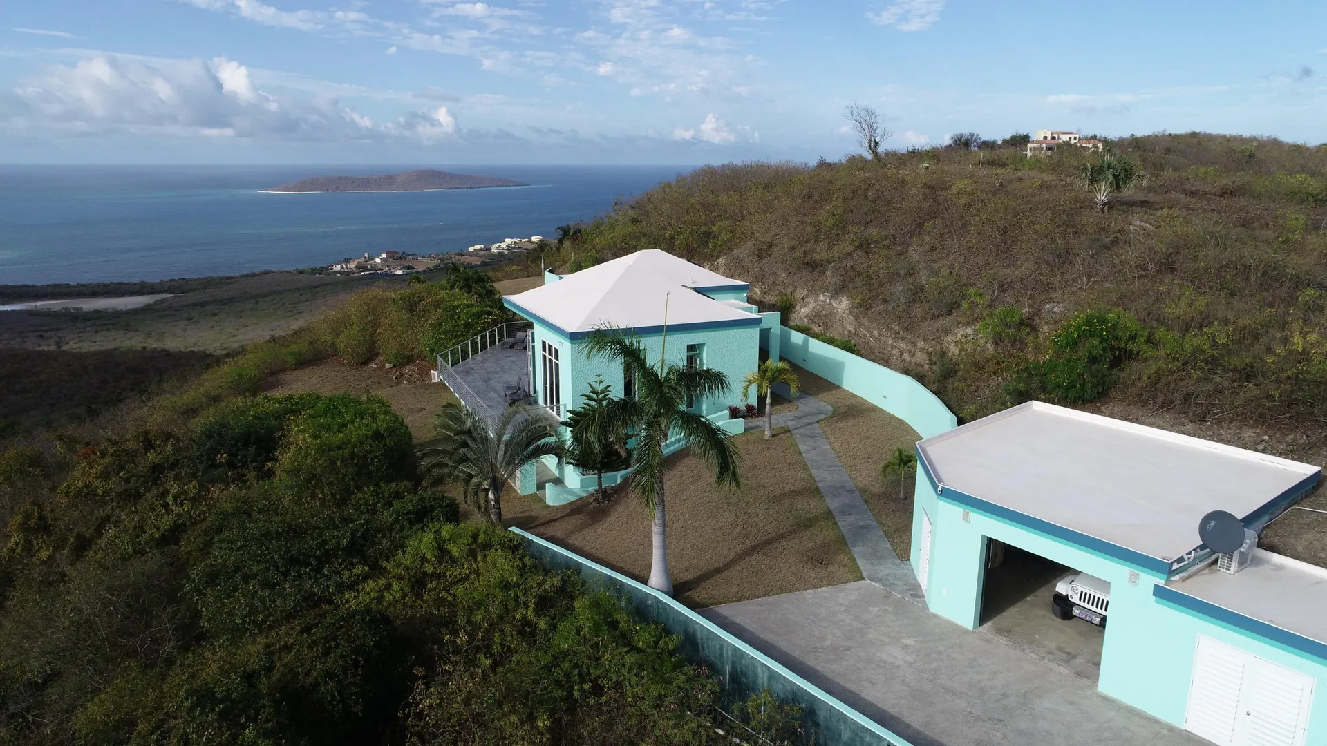 Welcome to Villa Aventine, named after the southernmost mountain in the Seven Hills of Rome! Superbly custom-built 2 bedroom 2.5 bath home sits high in Seven Hills with spectacular views from Buck Island to the East to Christiansted Harbor and beyond to the West. Notable features include onyx countertops, marble & granite flooring and finishes throughout, mahogany oversized interior doors/trim, 18' ceilings and yes, an a/c'd detached garage!! German-made Nana Wall glass doors open from the living area and primary bedroom to the 1000 square foot open gallery with breathtaking sea views and cooling breezes. The total square footage includes the garage and pool pump & generator rooms. CAC cools mail level; split in BR #2!Adjacent plots #17 above subject & #14 below are available to Buy