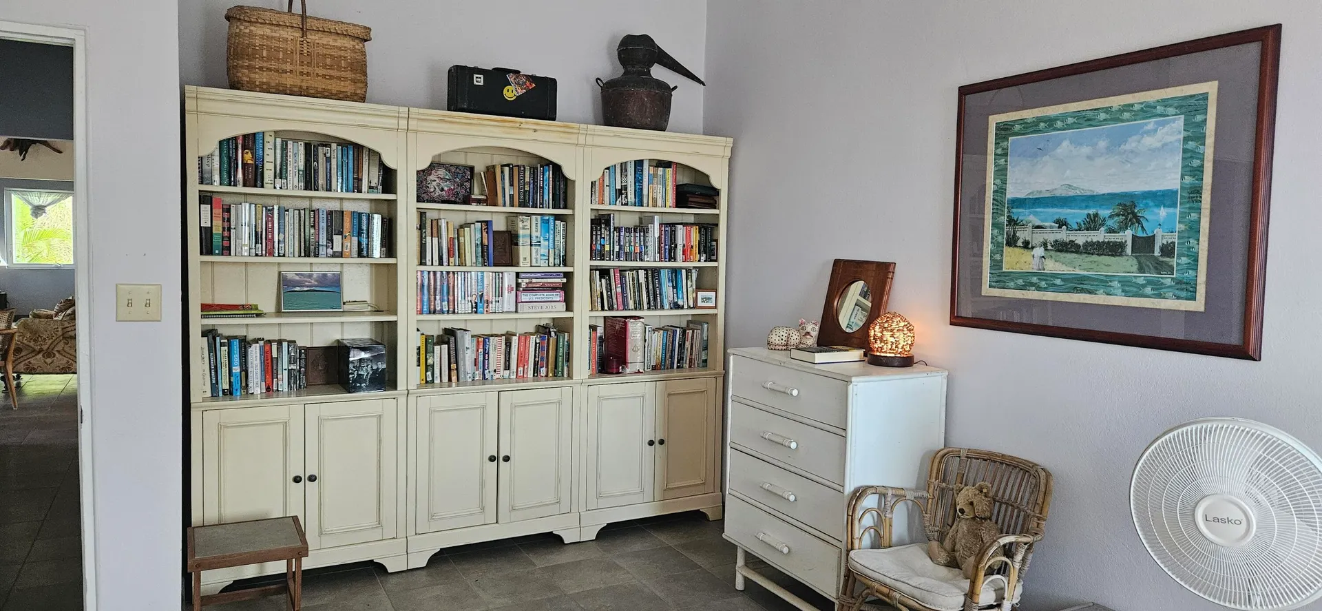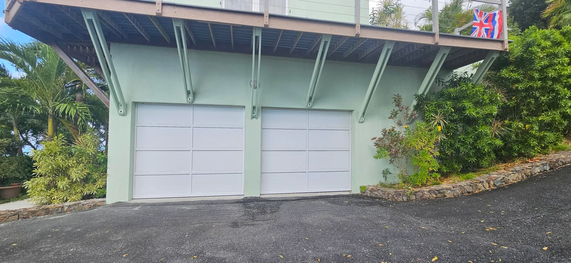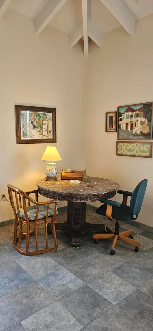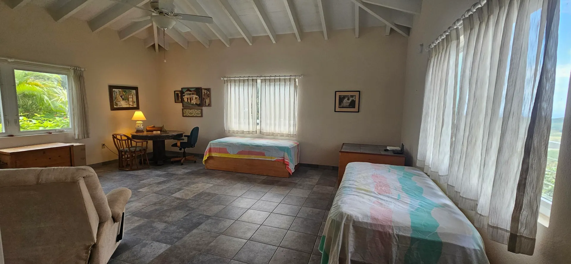 High up in the hills of Union and Mt. Washington, this gated house has expansive views encompassing Green Cay to the north and Great Salt Pond to the south. A generously sized living room leads to a massive deck from which you can enjoy cocktails in a scenic peaceful setting. Cute kitchen with view. The primary bedroom has access to the deck and an ensuite bathroom with large shower. The guest bedroom is comfortable and has a library wall. Close by is the second bathroom that also has a large shower. The third bedroom is enormous and could function as an artist studio, playroom, entertainment area, or family room. Beneath the house is a two-car garage connected to a spacious workshop and a fully automated generator. Exterior landscaping in mature and lush. Tenant pays all utilities