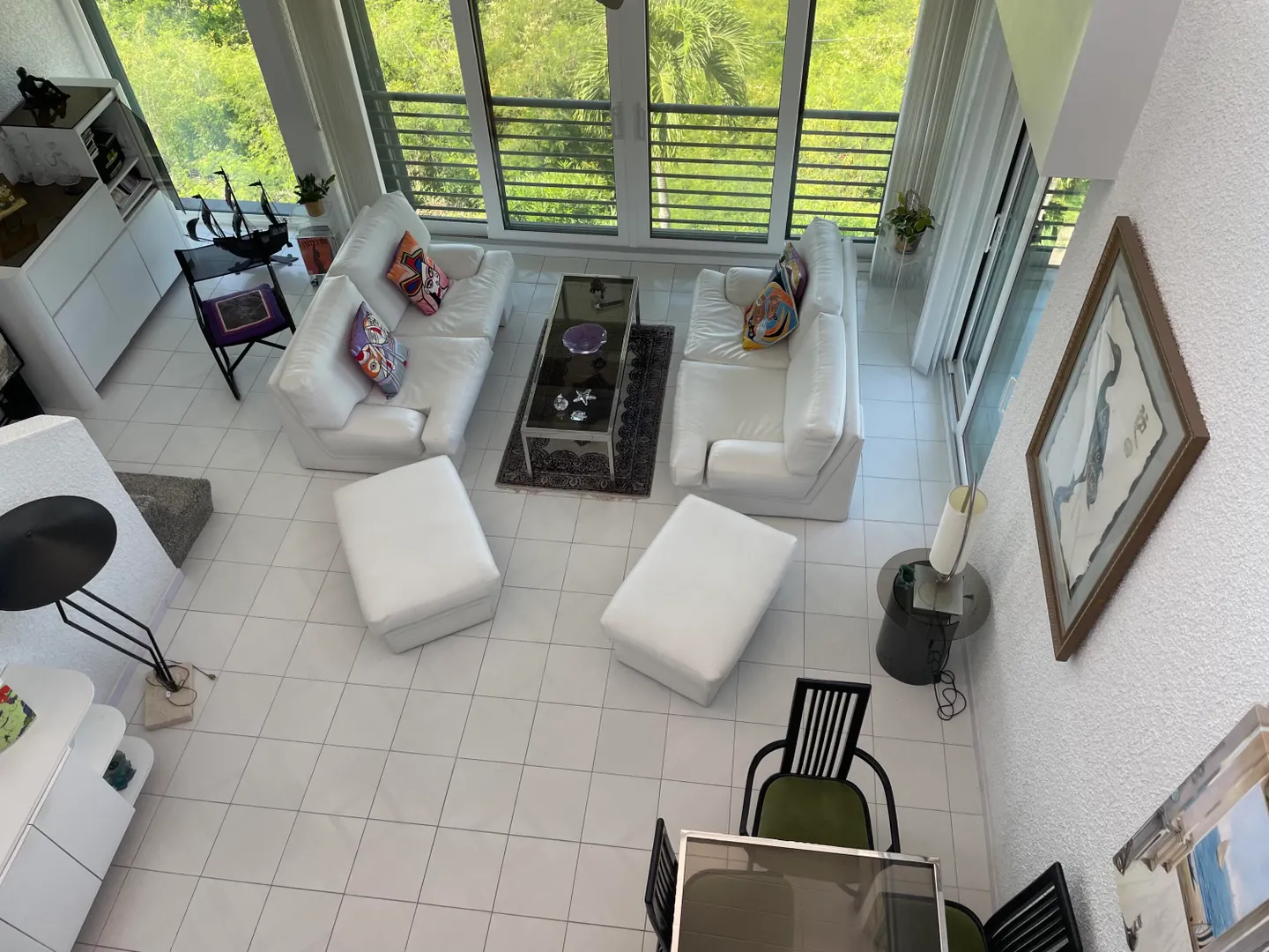 STUNNING VIEWS of lush green hills & the Caribbean Sea! Watch yachts go by as you enjoy the lovely sunset from this executive 2 BR-2 Bath 2 story condominium. High ceilings & abundant natural light make for a lovely modern LR-DR combination with ample space for entertaining. Fully furnished (except for personal items) with Central A/C. The well equipped kitchen has granite countertops & seating bar. Tile throughout and carpet runner on stairs. Upstairs leads to 2 spacious Brs & Baths. Large walk in closet. The 2nd BR has a small deck with awesome ocean views & tropical breezes. Regatta Point is a gated community - private mailboxes, auto generator, on site manager, full time maintenance & landscape staff. Within close walking distance are 3 swimming pools & tennis court