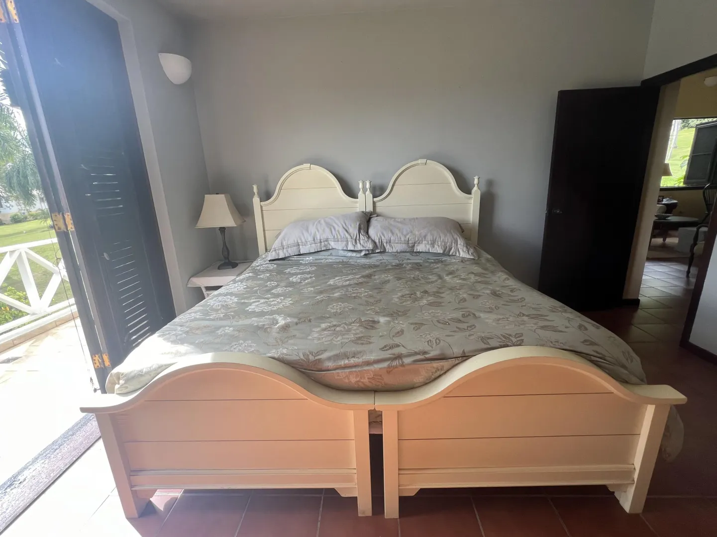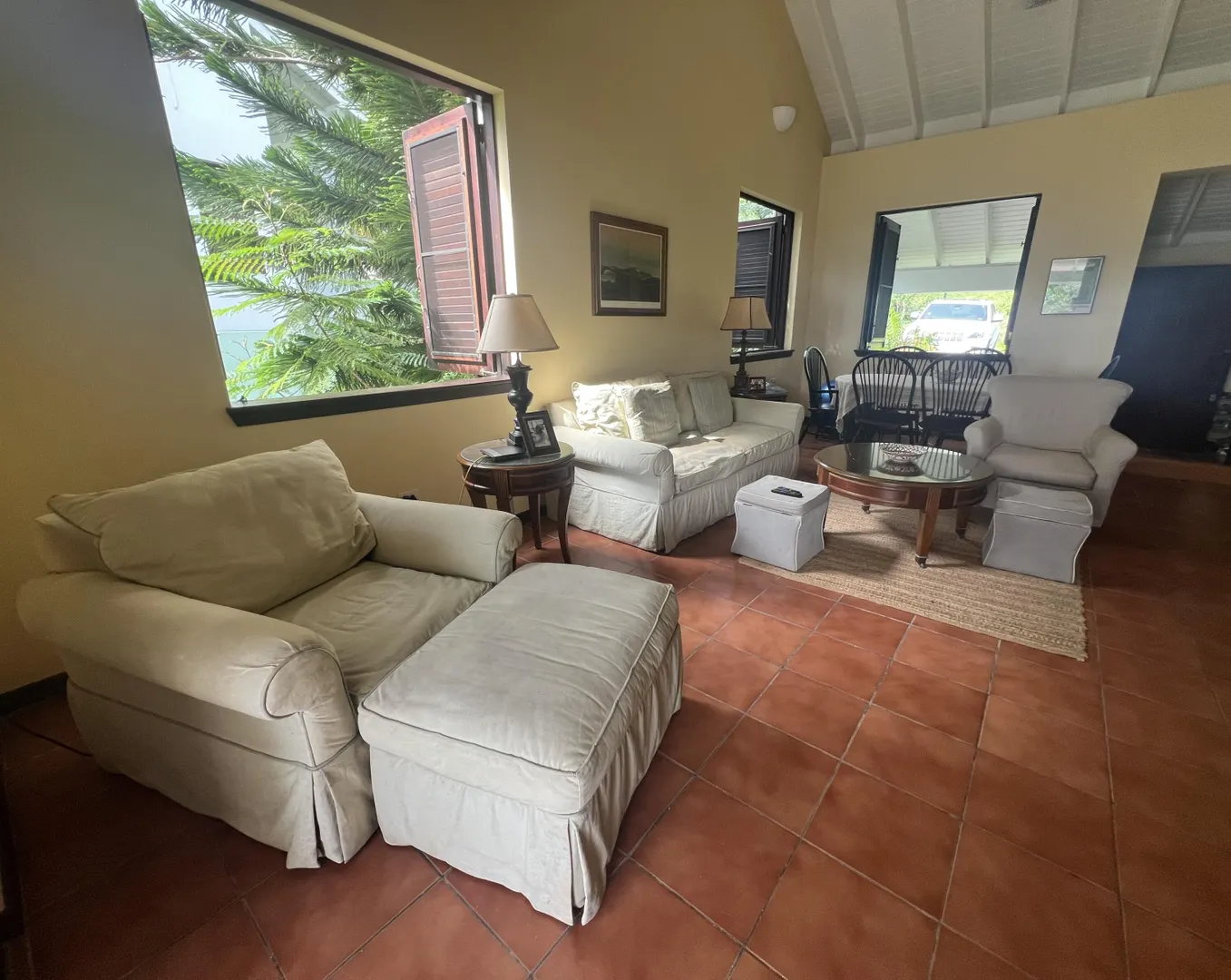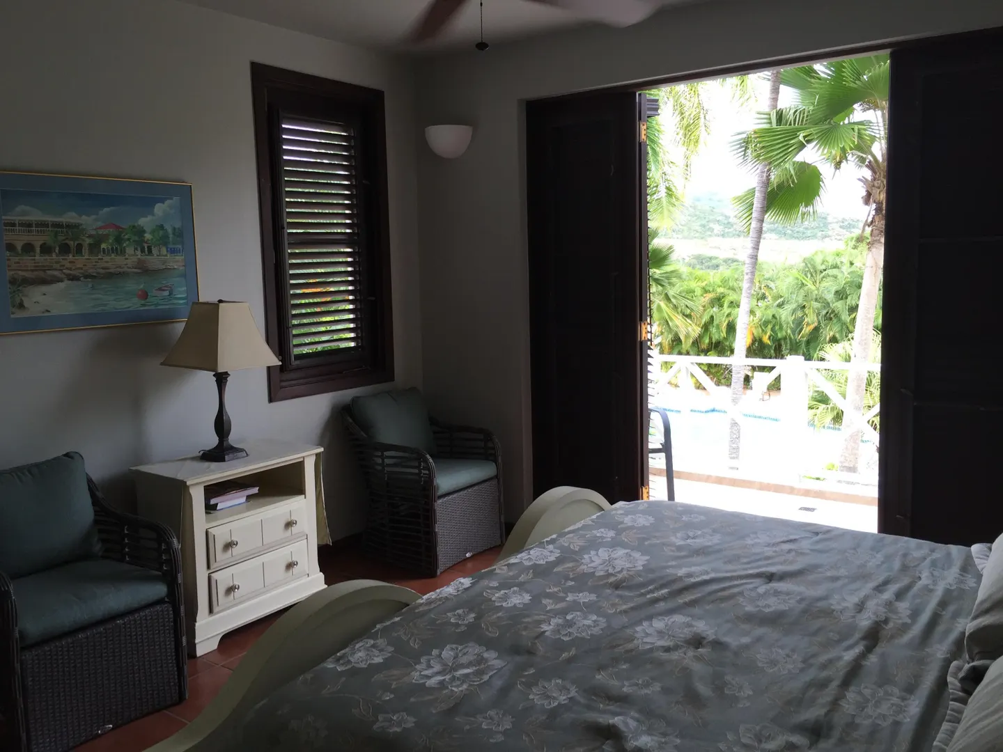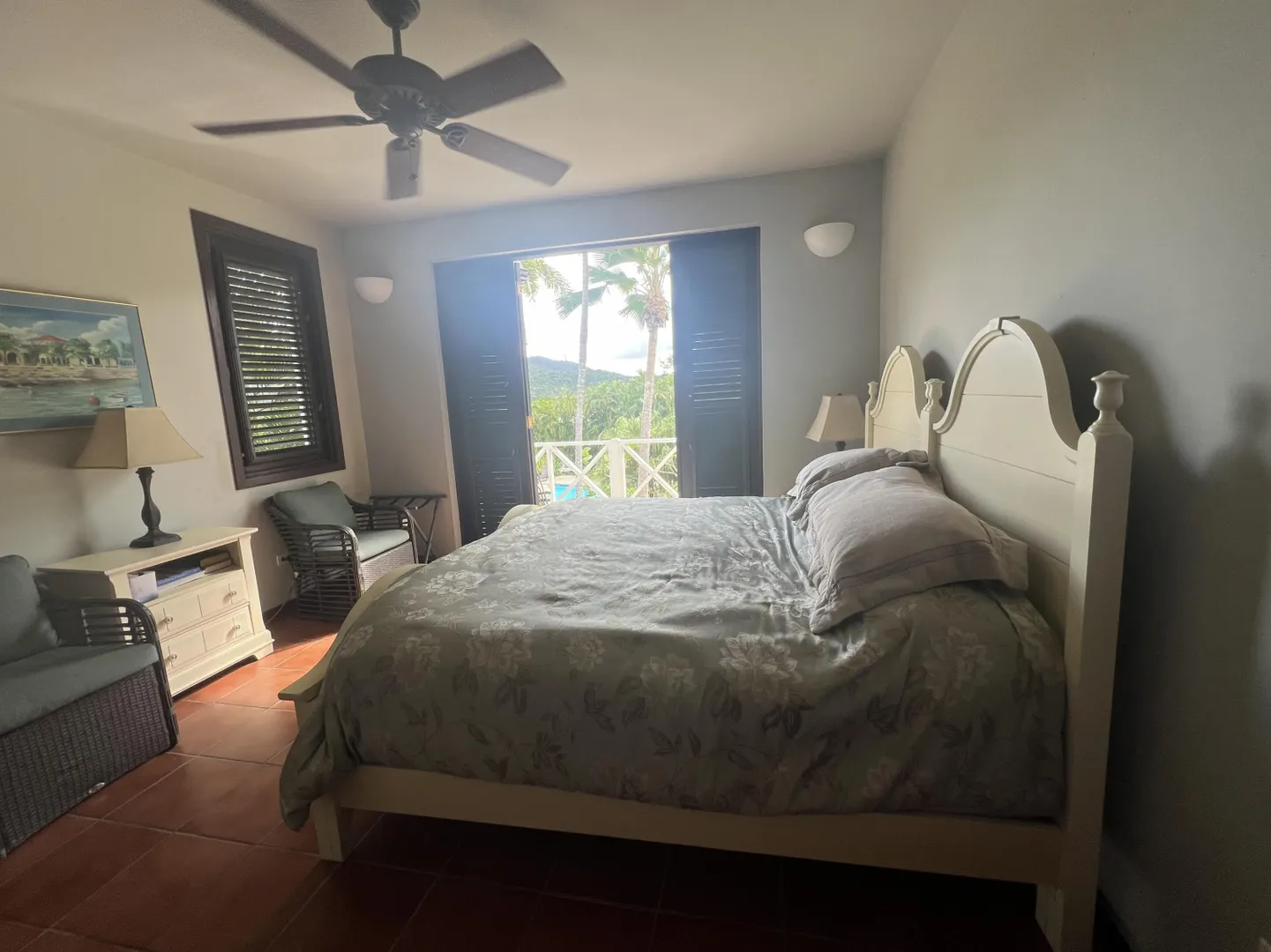 This beautiful 2bd to 2ba freestanding villa is located in Carambola, a gated golf course community. The split level home features a primary suite on the upper level and a large bedroom on the main level. Both bedrooms have AC. Enjoy Caribbean breezes throughout the villa. Make yourself at home in the spacious living room. Step out onto the large gallery and enjoy the golf course, pool and hillside views. The neighborhood pool is located just outside the villa. No need to stress when the WAPA goes out because this villa has an automatic generator. Monthly housekeeping, water and internet is included in the rent. Also included is access to multiple community pools, tennis courts, and pickle ball courts. Available until Dec 10,2025
