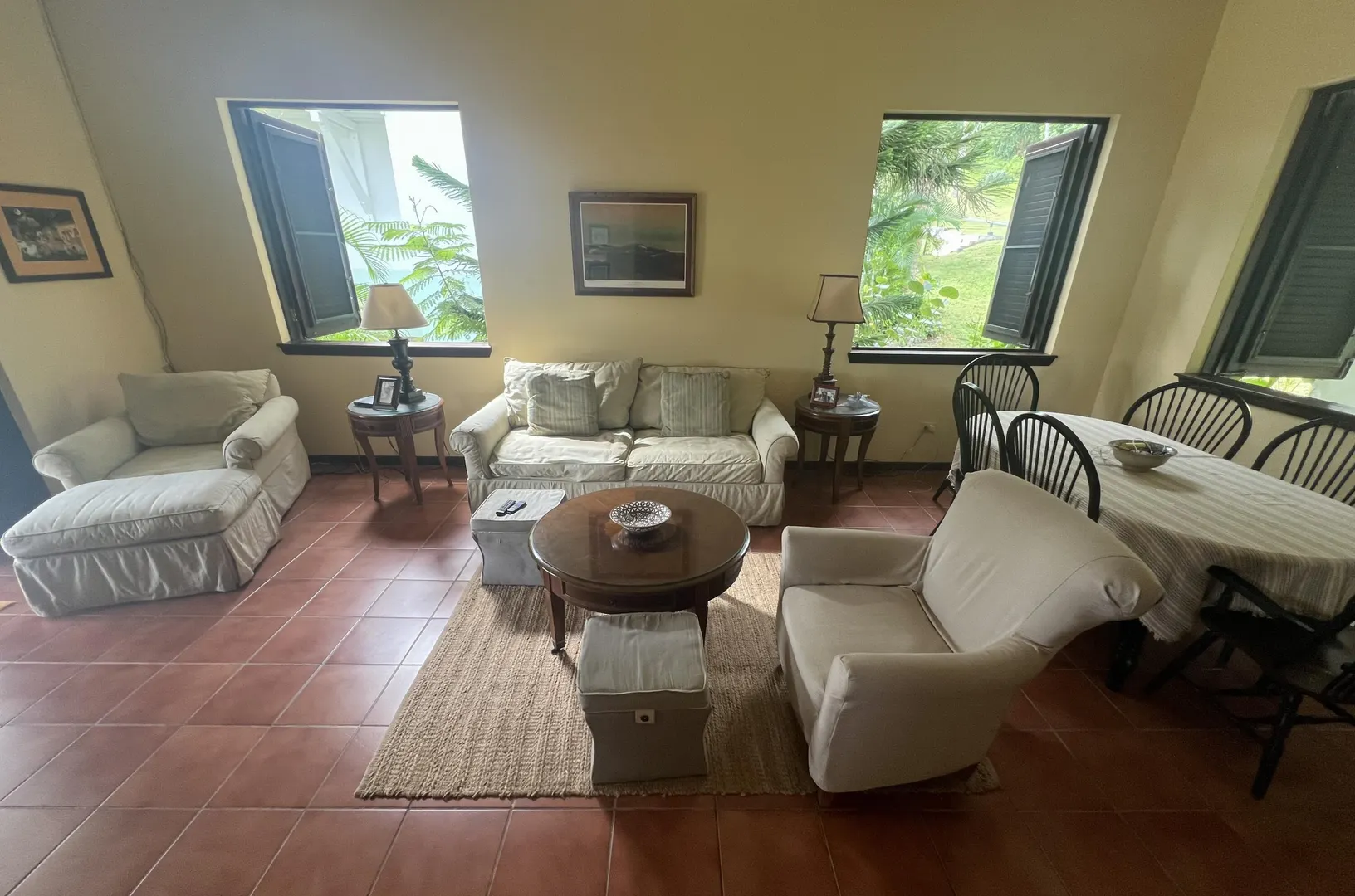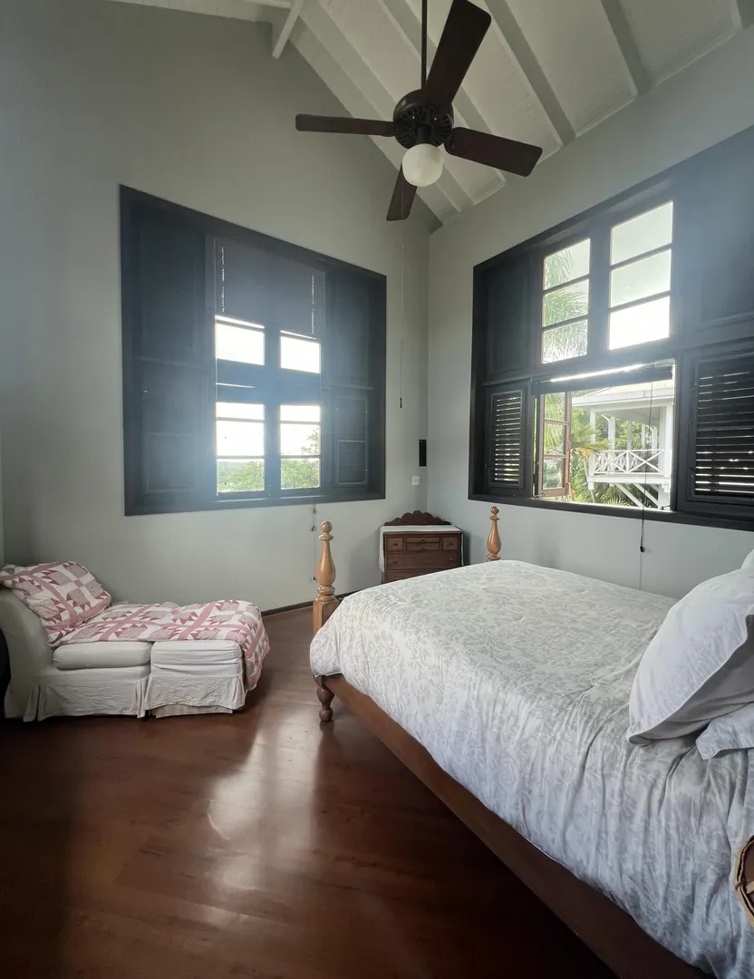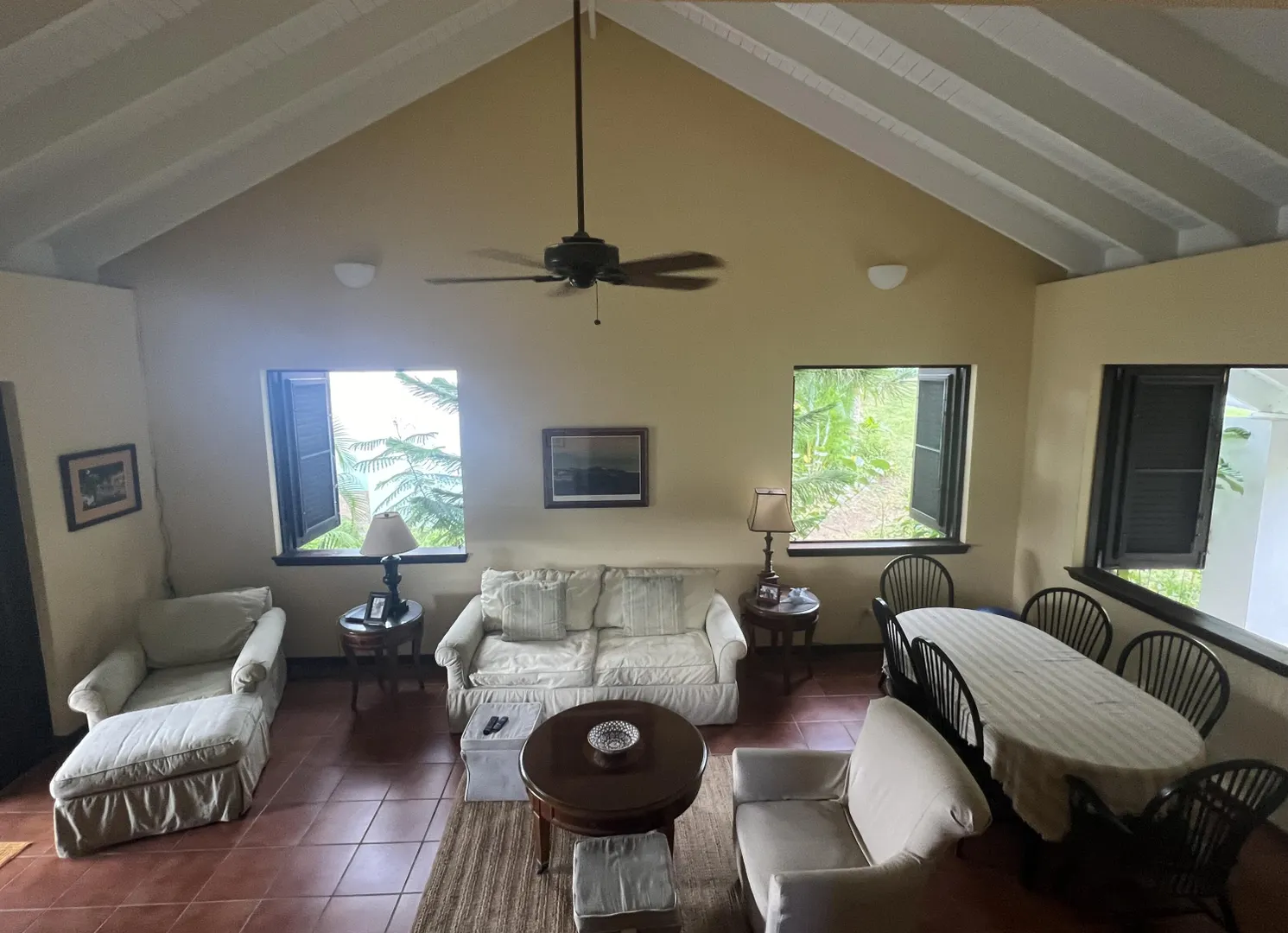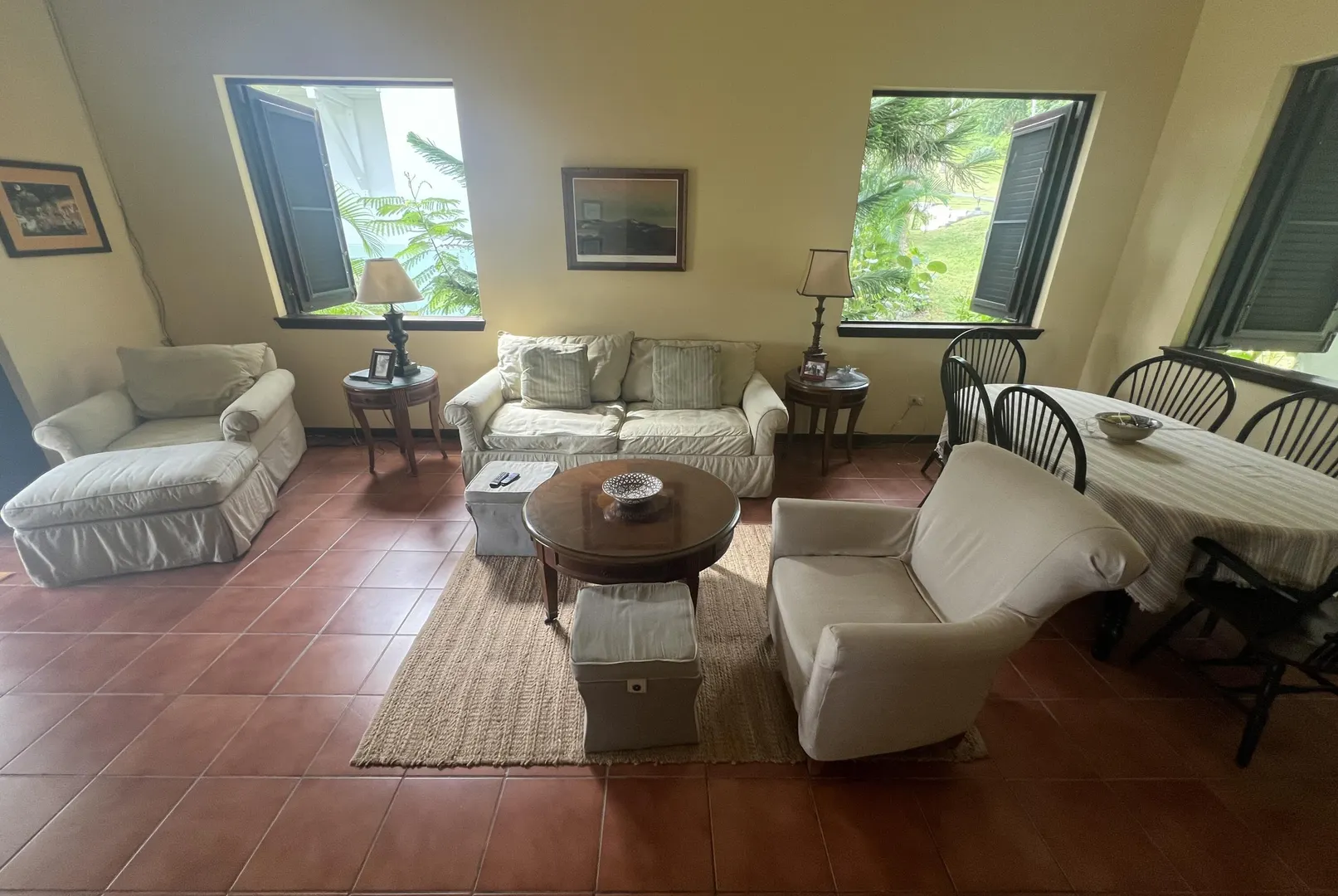 This beautiful 2bd to 2ba freestanding villa is located in Carambola, a gated golf course community. The split level home features a primary suite on the upper level and a large bedroom on the main level. Both bedrooms have AC. Enjoy Caribbean breezes throughout the villa. Make yourself at home in the spacious living room. Step out onto the large gallery and enjoy the golf course, pool and hillside views. The neighborhood pool is located just outside the villa. No need to stress when the WAPA goes out because this villa has an automatic generator. Monthly housekeeping, water and internet is included in the rent. Also included is access to multiple community pools, tennis courts, and pickle ball courts. Available until Dec 10,2025