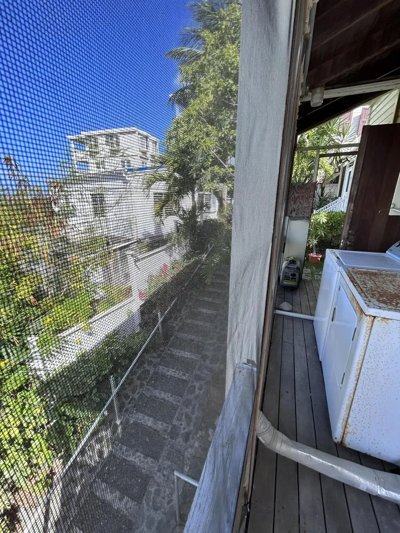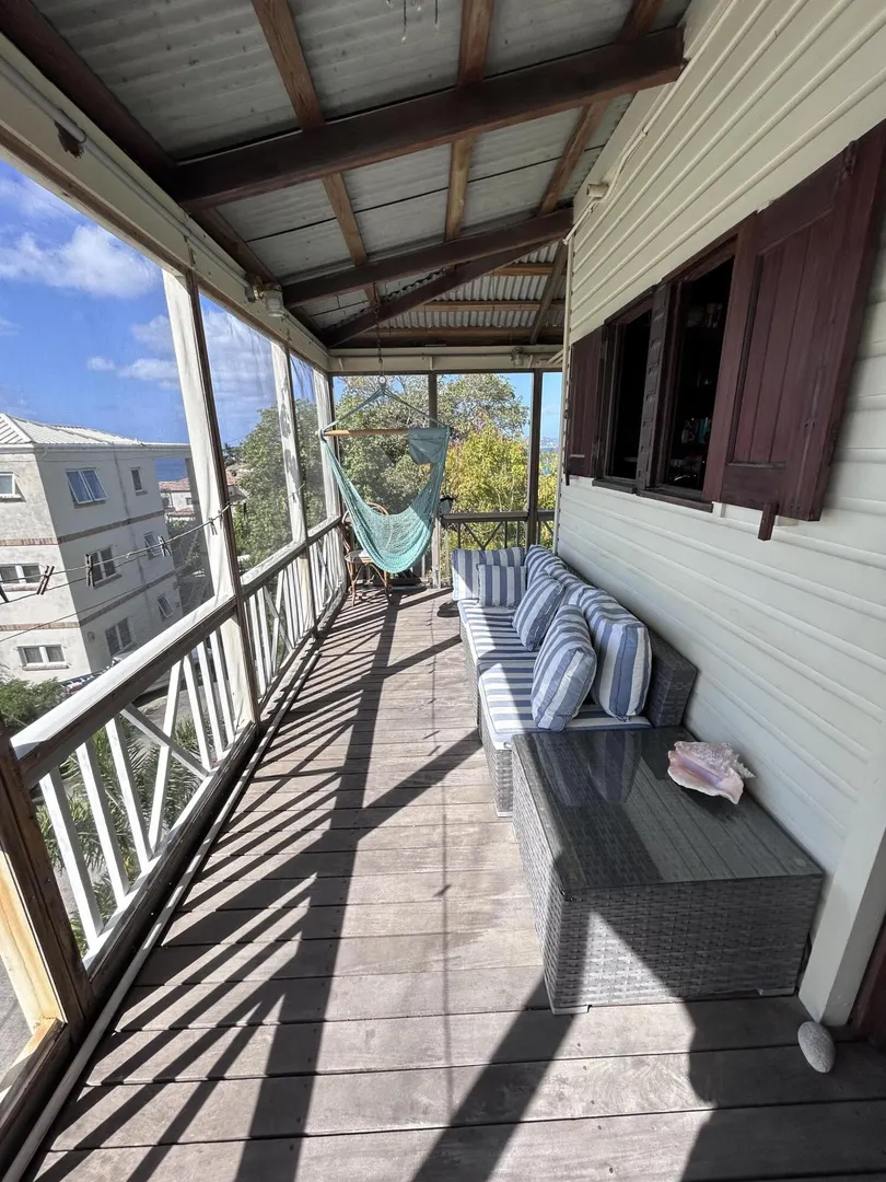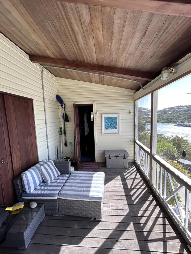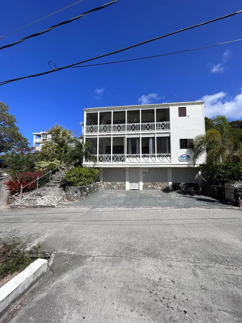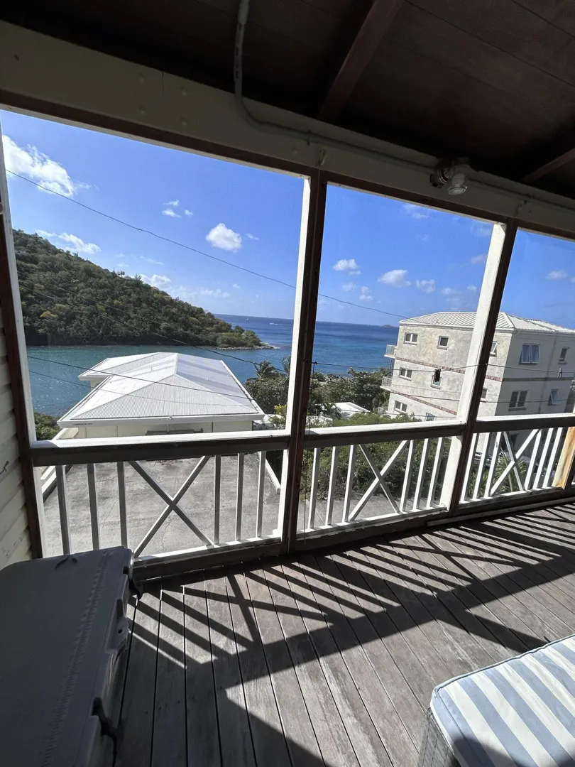 Conch Villas Condo 1x1. This quaint condo is the perfect fit for first time owners or for someone wanting a enjoyable in-town space when they visit St. John. This quiet, adorable, durable Brazilian hardwood condo is located at the front of the property, on the top floor. High vaulted ceilings, full kitchen, screened in wrap around porch, washer and dryer in unit. This condo has views of harbor and Caribbean ocean. It comes with a designated parking space and is easy walking distance to town.