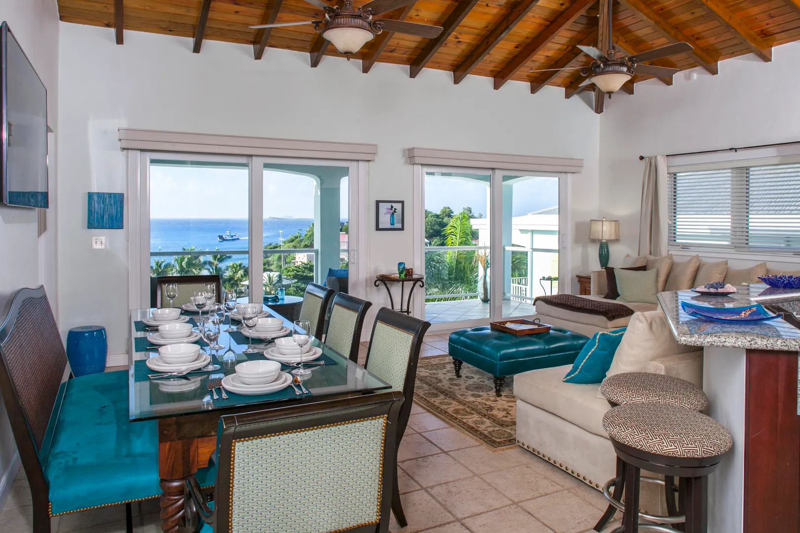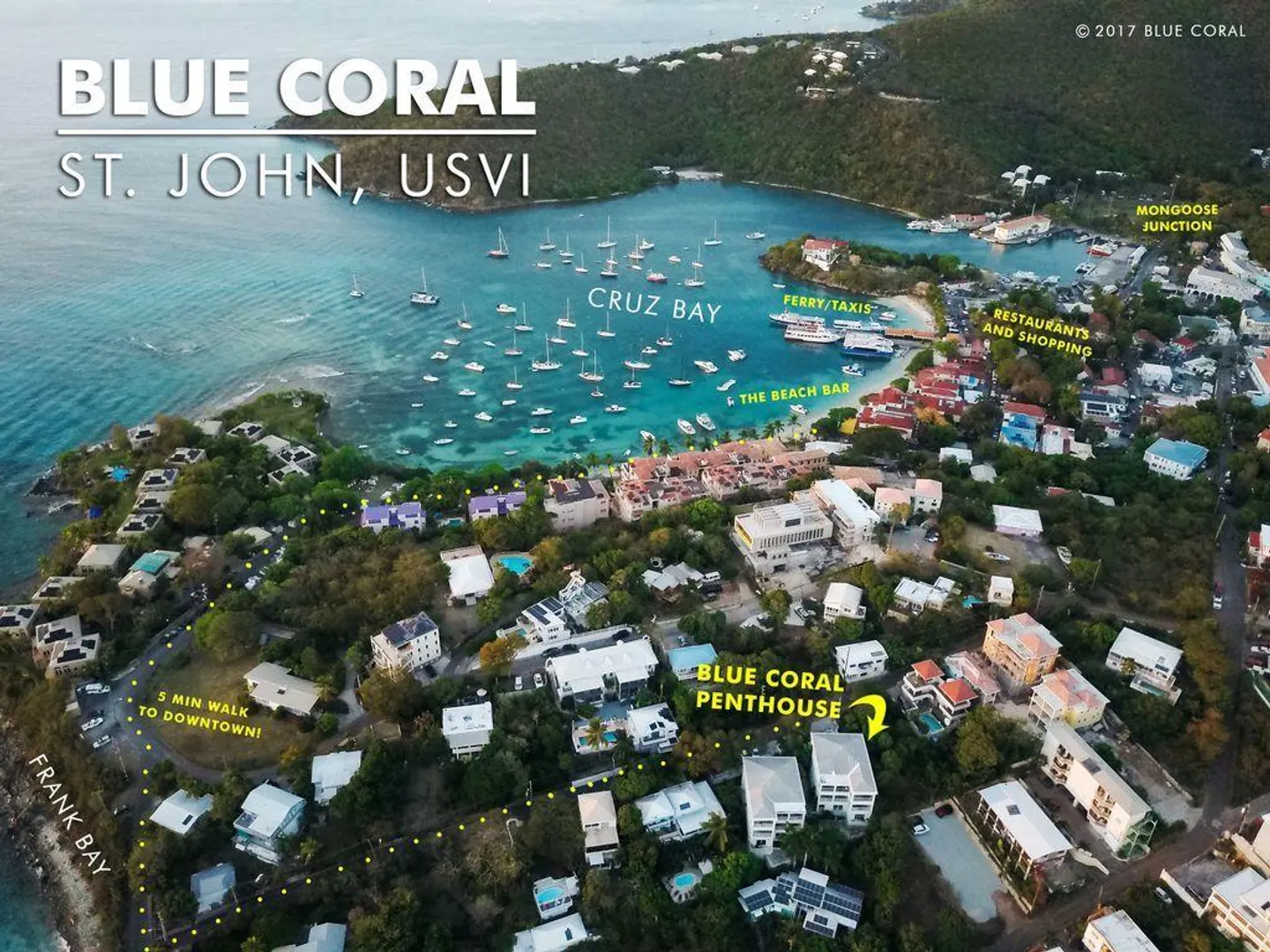 ''Blue Coral'' is a spacious, well maintained 3 bdrm x 3 bath penthouse unit in Palm Terrace Villas located in a quiet neighborhood just a short walk to Frank bay beach, restaurants, shops, ferry dock, etc., yet far enough away not to hear the noise from town. Enjoy spectacular views of the Caribbean waters and surrounding islands from this successful short-term rental. Buyer shall honor all confirmed reservations. Buyer & Seller shall equally split the transfer stamp tax.