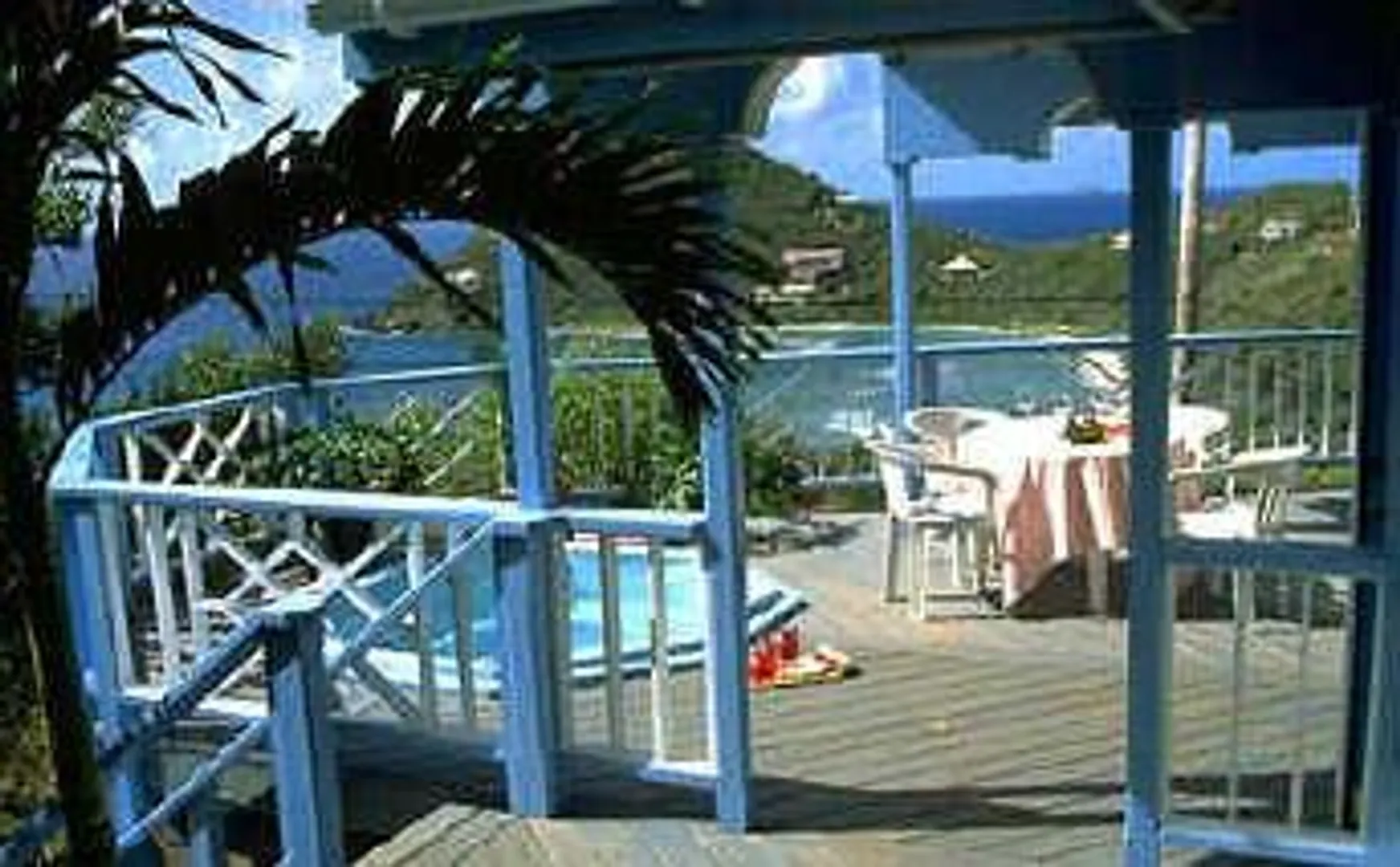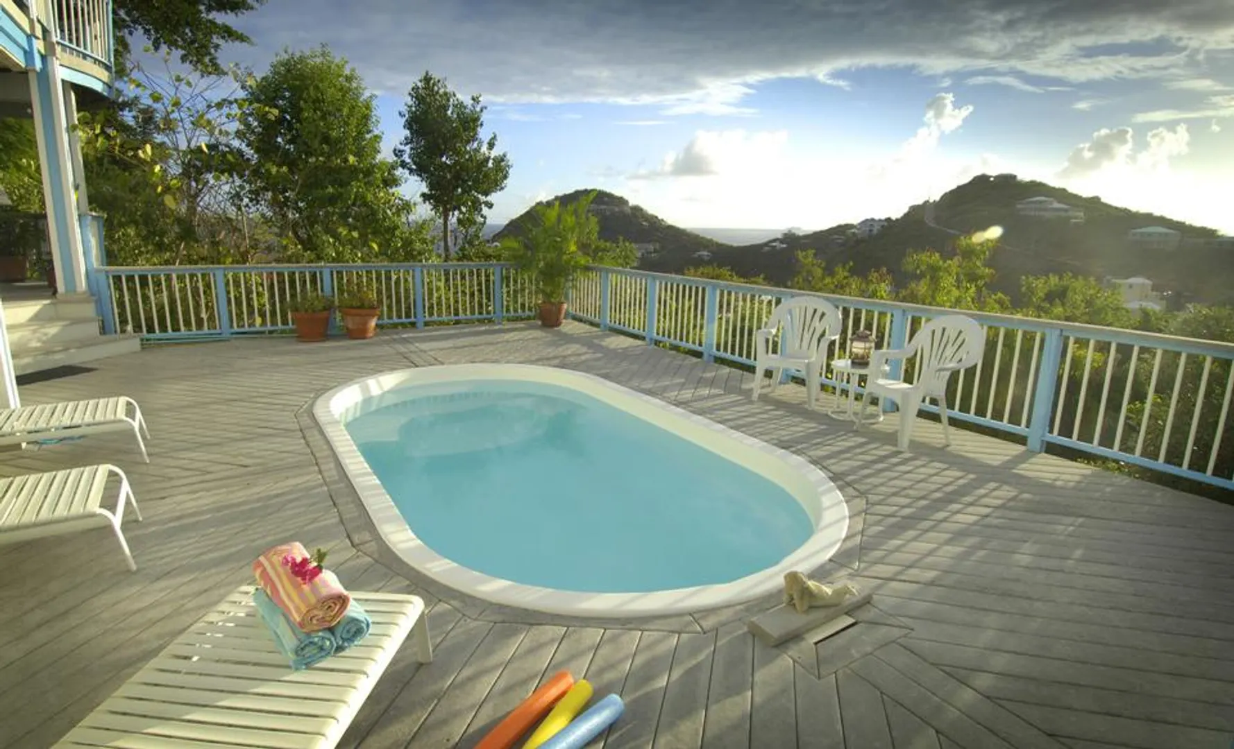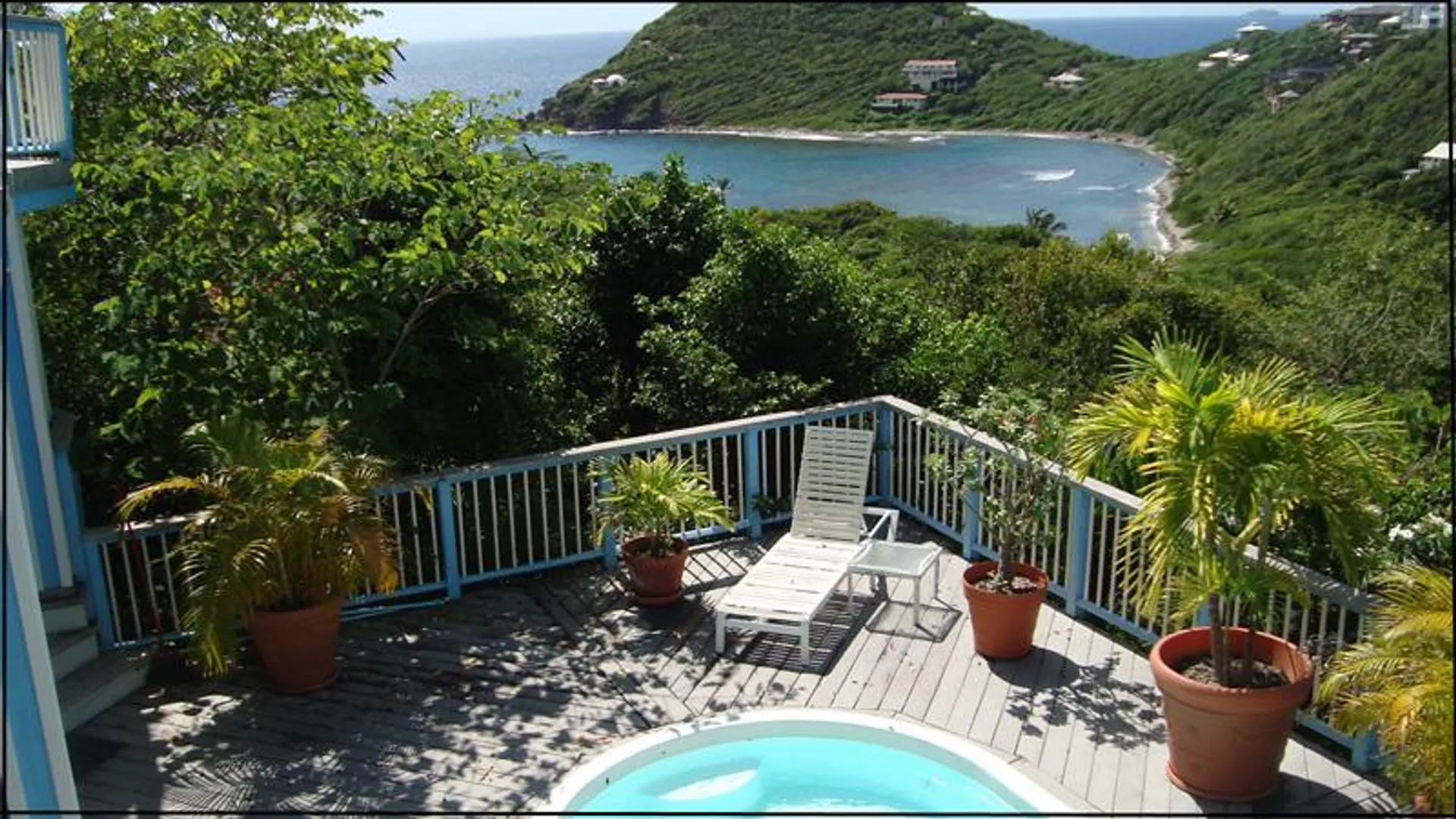 Two houses for the price of one! These two charming villas have an impressive short term rental history with a high repeat clientele. Both are nestled on a verdant hillside with a panoramic view of Hart Bay, Chocolate Hole & St.Thomas with stunning sunset views, a short walk to the beach and the soothing sounds of the surf. Sundance, rebuilt in 1999, is a spacious 3BR/3Bath home with, pool, spa, and gazebo dining area. Moonsong, built in 1990, is a charming 2BR/2Bath home with spa and covered decks, popular with honeymooners. Though sharing one lot, each home has excellent privacy. Easy paved access, 1.5 miles from Cruz Bay, wheel chair accessible. Solar water heaters and net metering solar power.Deeded access to 2 beaches. Seller will consider 60% financing for qualified buyer