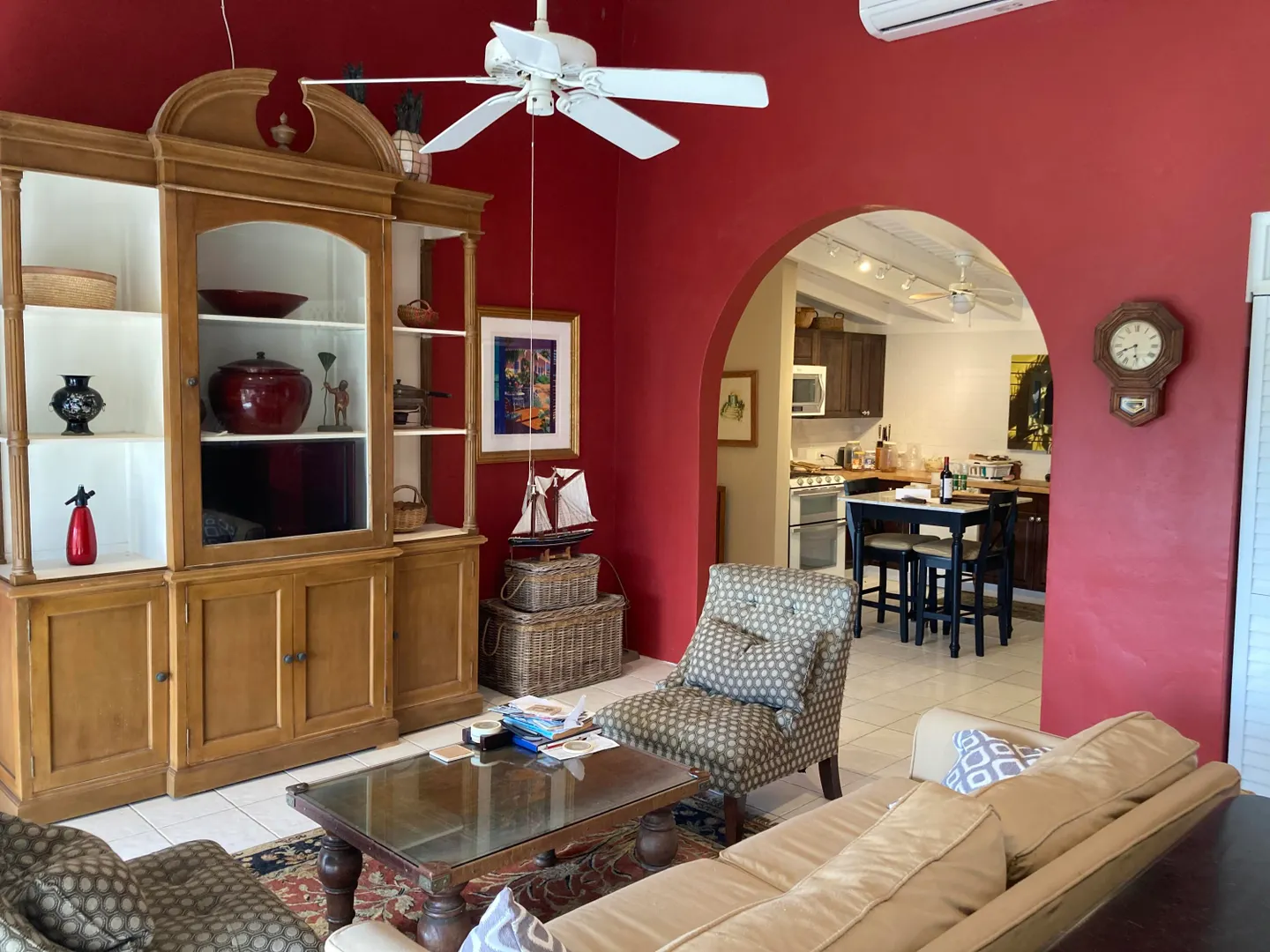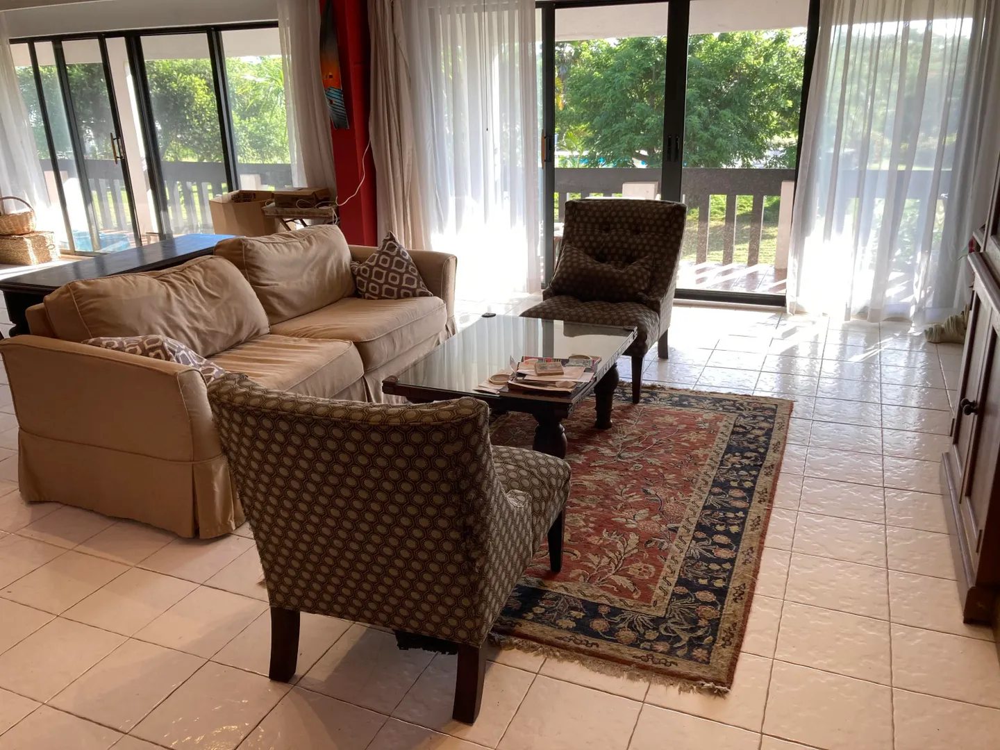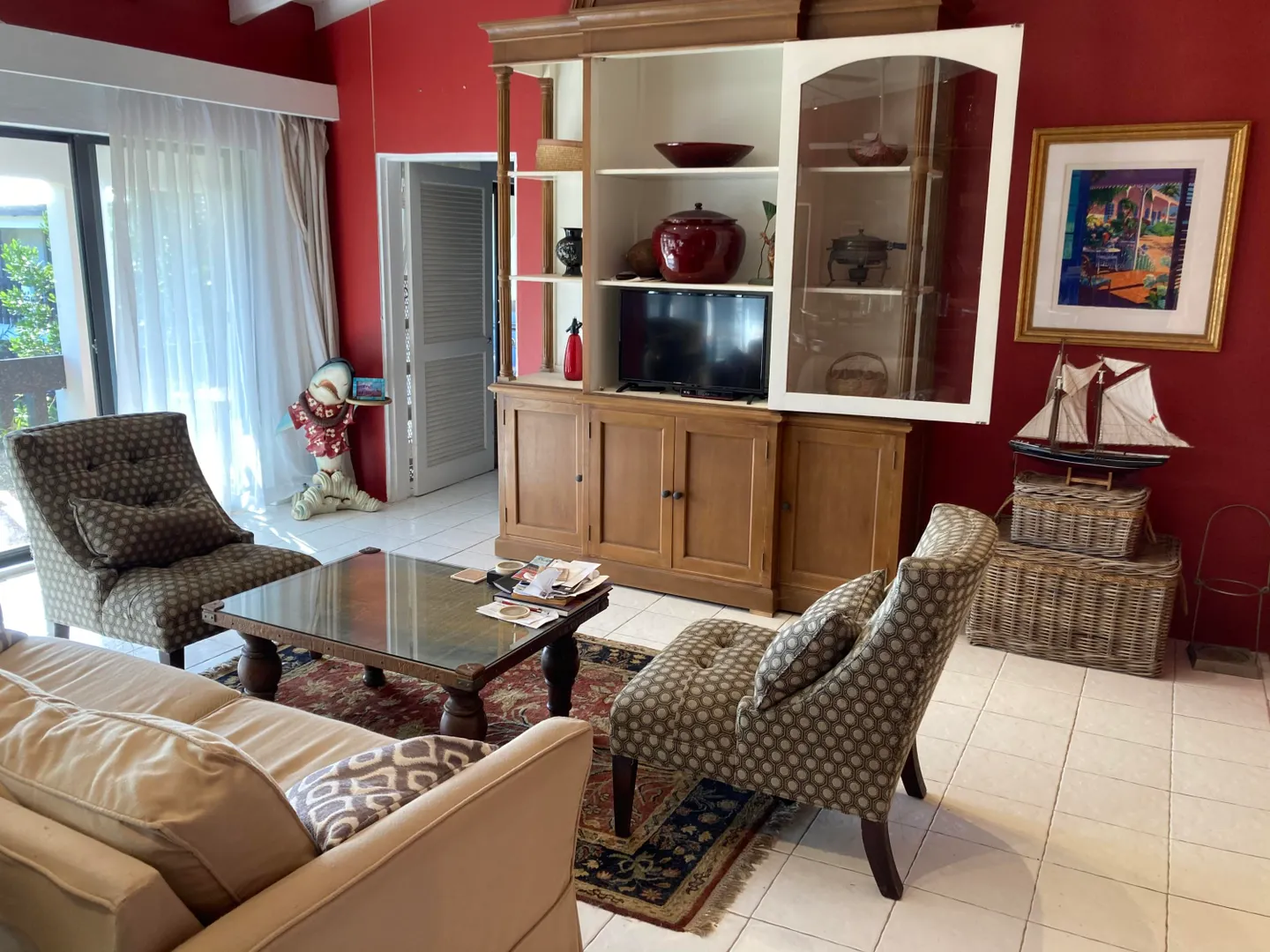 This is two units combined into one, yielding a very spacious and elegant 2 bedroom 3 bath condo. Exquisitely furnished and very private. End unit, high ceilings, large 400 sq. ft gallery overlooking the pool and grounds, and very breezy and comfortable, although 4 split units (brand new) will keep you cool if you prefer AC. Accordian hurricane shutters recently installed on all the sliders, and grillwork removed from sliders to create a more open, inviting space.